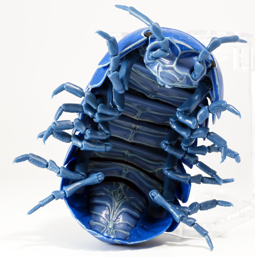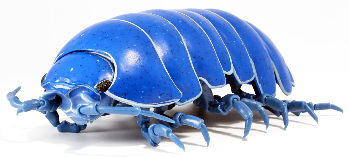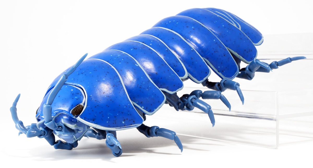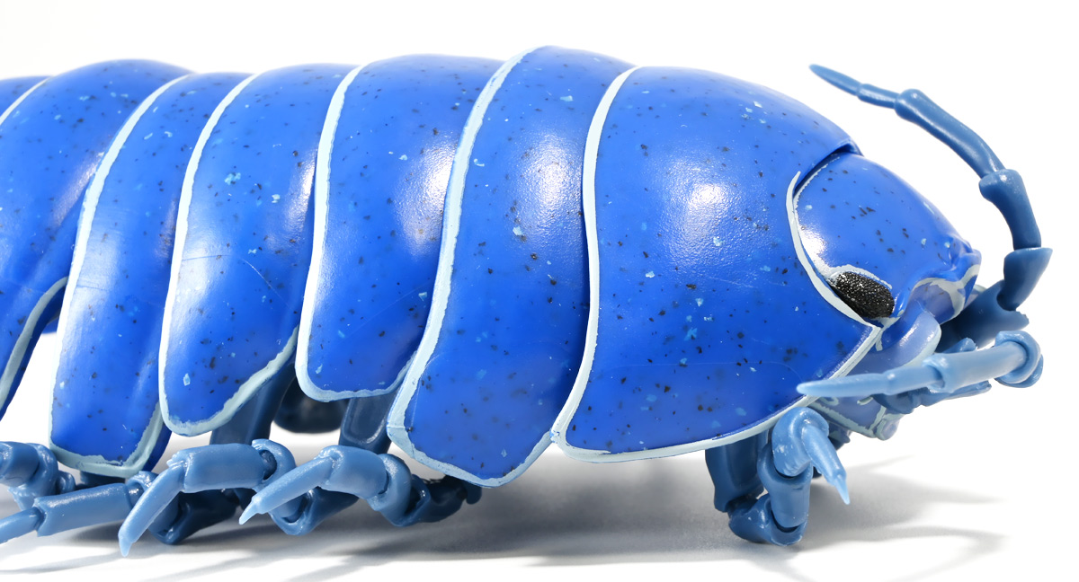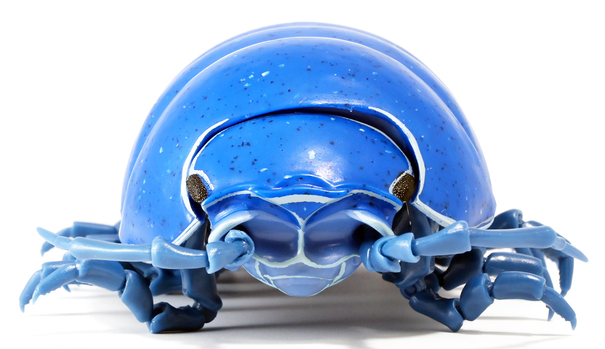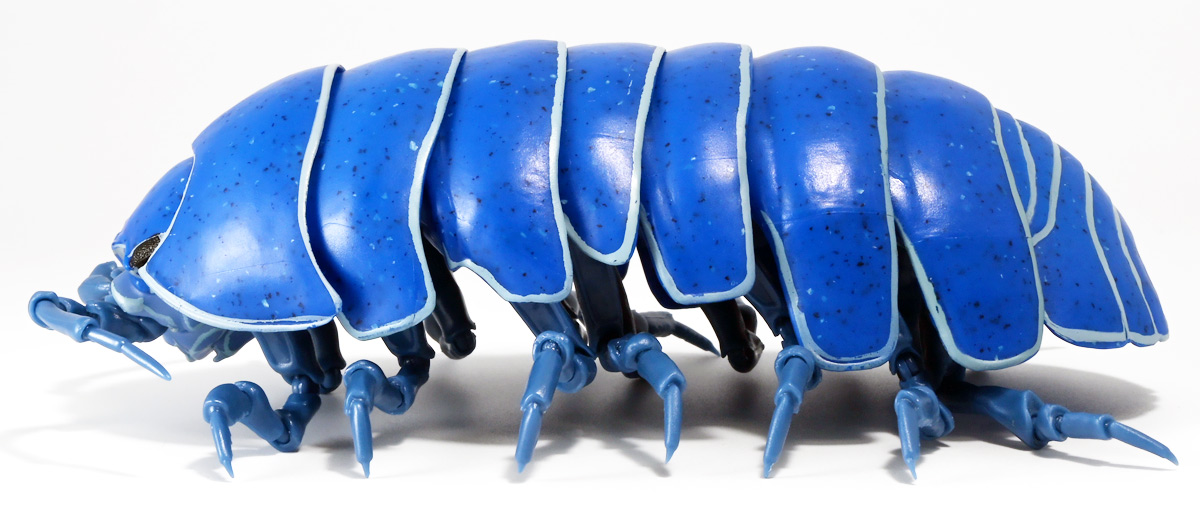 ■バンダイ いきもの大図鑑アドバンス ダンゴムシ イリドダンゴムシ ![]() バンダイより、2025年12月第4週発売の一回1500円ガチャ。 「いきもの大図鑑」の始祖「ダンゴムシ」が遂にアドバンスバージョンとなって降臨ッ! 全てがグレードアップしたフル可動ダンゴムシの決定版ぞよ! ![]() 自販機筐体版ではカプセルレスで丸まったダンゴムシがゴトンと落ちてきます! フィルムを剥がし、こんな風に広げると・・・、 ![]() 中には「だんごむし新聞」が挟まっている! そうそう、初期の「いきもの大図鑑」ってこういう新聞がリーフレット代わりに入っていたぞよね〜。 今回はダンゴムシ超絶パワーアップ復刻弾と言う事で初期の仕様を踏襲しているのだ。 ラインナップは「ダンゴムシ」、「イリドダンゴムシ」、「ゼブラダンゴムシ」の全3種。 このうちダンゴムシが当選率40%、残りが30%でプチレアとなっており、 ゼブラダンゴムシが自販機筐体限定のレアカラーと言う位置づけ。 ガシャポンオンラインでは「いきもの大図鑑アドバンス ダンゴムシ(重塗装版)」というタイトルで、 文字通り重塗装が施された豪華版として1800円で販売。 「ダンゴムシ」、「イリドダンゴムシ」に加えて、「アルビノダンゴムシ」がオンライン限定カラーとして封入されたぞよ。 ![]() という事で自販機筐体版のダンゴムシとイリドダンゴムシカラーは オンラインの重塗装版の完全なる下位互換と言う事になるのだが・・・ おっと・・・見ての通りわたくしが引いたのは真っ青のイリドダンゴムシ! は、ハズレぞよ〜っ! ![]() とは申せ、そこは流石のアドバンス1500円。 自販機筐体版も成型色にドットチップが混ぜ込んであり表面に柄がついてそこそこ見栄えがするぞよ。 オンライン版ではここが彩色仕上げになっているという訳ぞよね。 ![]() せっかくなのでまずは丸まった状態で見ていこう! ダンゴムシはムシ・・・とつくが、昆虫ではない。 ご覧の通り身体構造が全く異なっているぞよ。 その正体は等脚目に分類される陸上に進出した甲殻類で、 本商品のモチーフとなっているのは中でも最もポピュラーなオカダンゴムシ(Armadillidium vulgare)であるぞよ。 ![]() 多様な等脚類には水棲のものが多く、有名なダイオウグソクムシなどがその代表格。 その中にあってオカダンゴムシは世界中で見られる最もポピュラーな陸生等脚類であるぞよ。 元々はヨーロッパ全土を住処としていたが、おろかなにんげんどもの行動範囲が広がると共に、 それに便乗して分布を広げてきた種であるぞよ。 この日本には元々コシビロダンゴムシという、より丸まるのが上手な在来ダンゴムシが暮らしていたが、 これは乾燥に弱く、森林から出られないと言う弱点があった。 明治時代に船の積み荷に紛れ込んでオカダンゴムシが侵入してくると、 おろかなにんげんどもを利用して瞬く間に生息域を拡大。 オカダンゴムシは乾燥に強く、人家周辺で暮らす事が出来たのだ。 という事で、今でも日本の森には在来のダンゴムシが見られるが、 我々のより身近で普通に見られるダンゴムシは殆ど外来種である。 こう言う事が言えるぞよね! ![]() 従って国内ではオカダンゴムシ科、コシビロダンゴムシ科に加えて、 ハマダンゴムシ科と言う海岸に生息するダンゴムシを含む、3科5属が見られるぞよ。 最も、身近な存在である一方でまだまだ分類学上は謎の多い存在であり、 シノニムや未記載種と思われるものが多数報告されている為、正確な種数は不明とされている。 ![]() オカダンゴムシは石灰質の土壌を好み、主に腐敗した植物を食べて暮らしている。 時にはカルシウムを補給する為にコンクリートを舐める事もあるぞよ。 基本的には夜行性だが、極端に低い温度や高い温度が苦手で、気温が低い時は日光浴をしに現れ、 逆に高い時は日陰に隠れ、体温調節をする。 一方でエビやカニの仲間らしく、じめじめした環境を好み、雨が降ると活発に動き出すぞよ。 こうした習性から時にまとまった場所にうじゃっといておろかなにんげんどもに不気味がられるが、 その実全くの人畜無害。 それどころか、腐った落ち葉や動物の死骸などを食って分解してくれる土壌の掃除屋さんであるからして、 ありがたい存在なのだ! ![]() そんなダンゴムシ最大の特技が、この丸まった防御姿勢! 外から刺激を受ける事でピンチを察したダンゴムシは、身体を内側に丸め、 ほぼ完全な球形へと変形する事が出来るのだ! これこそが「ダンゴムシ」の名前の由来であるぞよ! ダンゴムシの場合、外皮表面の油分が多い為、昆虫類より蜘蛛の巣に引っかかりにくいという特性も見られる。 体を丸めた防御姿勢を取る広義のムシには多足類のタマヤスデや、 昆虫類ではヒメマルゴキブリなども知られている。 これらはキチン化した硬い外皮を持ち、上から見るとダンゴムシそっくりで、 まるまるギミックも共通しているが、全く別の分類群にある生き物であるぞよ。 みんなそれぞれ別のルートを辿りなが
