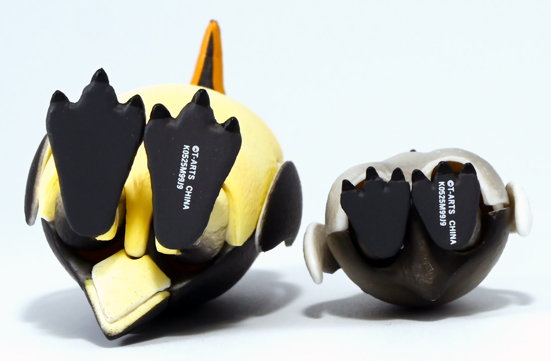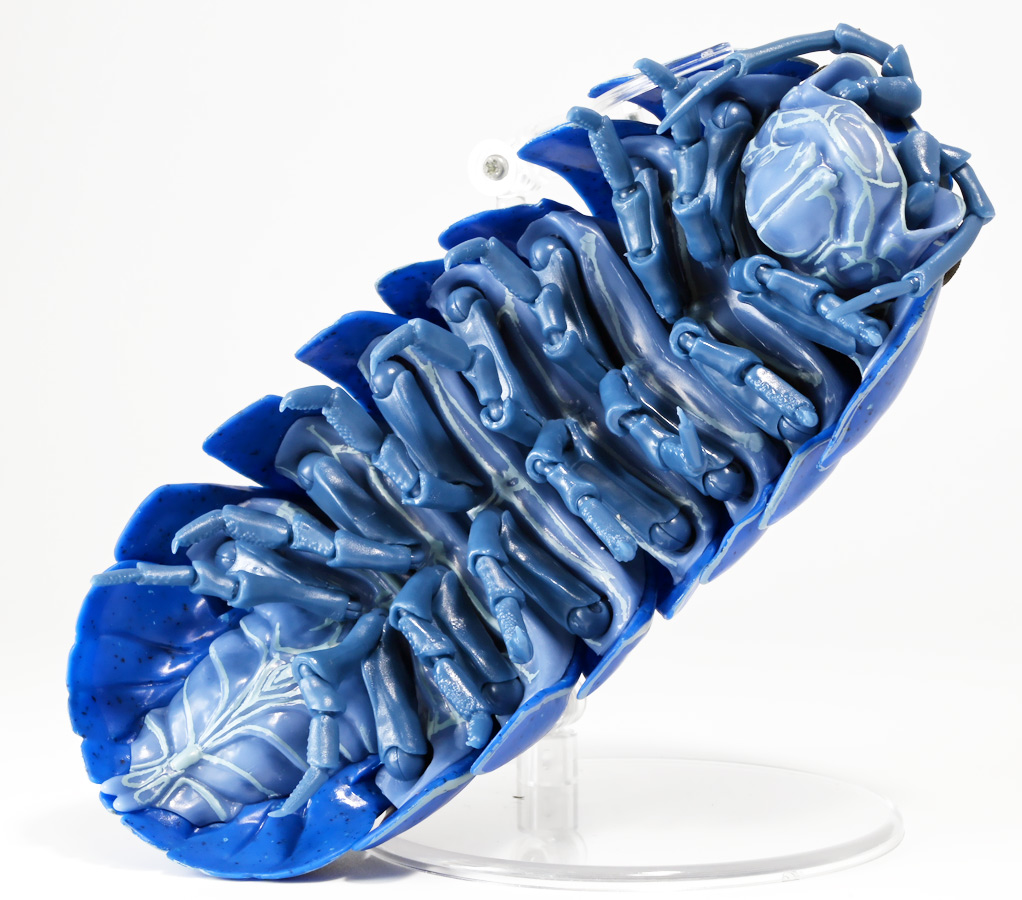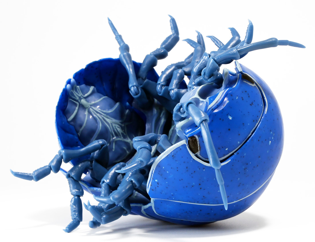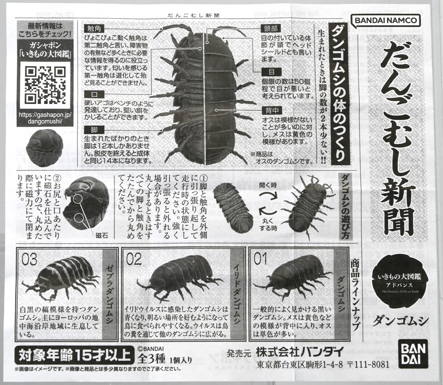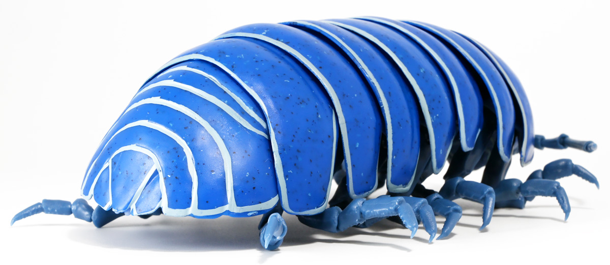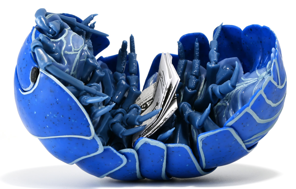 ■バンダイ いきもの大図鑑アドバンス ダンゴムシ イリドダンゴムシ ![]() バンダイより、2025年12月第4週発売の一回1500円ガチャ。 「いきもの大図鑑」の始祖「ダンゴムシ」が遂にアドバンスバージョンとなって降臨ッ! 全てがグレードアップしたフル可動ダンゴムシの決定版ぞよ! ![]() 自販機筐体版ではカプセルレスで丸まったダンゴムシがゴトンと落ちてきます! フィルムを剥がし、こんな風に広げると・・・、 ![]() 中には「だんごむし新聞」が挟まっている! そうそう、初期の「いきもの大図鑑」ってこういう新聞がリーフレット代わりに入っていたぞよね〜。 今回はダンゴムシ超絶パワーアップ復刻弾と言う事で初期の仕様を踏襲しているのだ。 ラインナップは「ダンゴムシ」、「イリドダンゴムシ」、「ゼブラダンゴムシ」の全3種。 このうちダンゴムシが当選率40%、残りが30%でプチレアとなっており、 ゼブラダンゴムシが自販機筐体限定のレアカラーと言う位置づけ。 ガシャポンオンラインでは「いきもの大図鑑アドバンス ダンゴムシ(重塗装版)」というタイトルで、 文字通り重塗装が施された豪華版として1800円で販売。 「ダンゴムシ」、「イリドダンゴムシ」に加えて、「アルビノダンゴムシ」がオンライン限定カラーとして封入されたぞよ。 ![]() という事で自販機筐体版のダンゴムシとイリドダンゴムシカラーは オンラインの重塗装版の完全なる下位互換と言う事になるのだが・・・ おっと・・・見ての通りわたくしが引いたのは真っ青のイリドダンゴムシ! は、ハズレぞよ〜っ! ![]() とは申せ、そこは流石のアドバンス1500円。 自販機筐体版も成型色にドットチップが混ぜ込んであり表面に柄がついてそこそこ見栄えがするぞよ。 オンライン版ではここが彩色仕上げになっているという訳ぞよね。 ![]() せっかくなのでまずは丸まった状態で見ていこう! ダンゴムシはムシ・・・とつくが、昆虫ではない。 ご覧の通り身体構造が全く異なっているぞよ。 その正体は等脚目に分類される陸上に進出した甲殻類で、 本商品のモチーフとなっているのは中でも最もポピュラーなオカダンゴムシ(Armadillidium vulgare)であるぞよ。 ![]() 多様な等脚類には水棲のものが多く、有名なダイオウグソクムシなどがその代表格。 その中にあってオカダンゴムシは世界中で見られる最もポピュラーな陸生等脚類であるぞよ。 元々はヨーロッパ全土を住処としていたが、おろかなにんげんどもの行動範囲が広がると共に、 それに便乗して分布を広げてきた種であるぞよ。 この日本には元々コシビロダンゴムシという、より丸まるのが上手な在来ダンゴムシが暮らしていたが、 これは乾燥に弱く、森林から出られないと言う弱点があった。 明治時代に船の積み荷に紛れ込んでオカダンゴムシが侵入してくると、 おろかなにんげんどもを利用して瞬く間に生息域を拡大。 オカダンゴムシは乾燥に強く、人家周辺で暮らす事が出来たのだ。 という事で、今でも日本の森には在来のダンゴムシが見られるが、 我々のより身近で普通に見られるダンゴムシは殆ど外来種である。 こう言う事が言えるぞよね! ![]() 従って国内ではオカダンゴムシ科、コシビロダンゴムシ科に加えて、 ハマダンゴムシ科と言う海岸に生息するダンゴムシを含む、3科5属が見られるぞよ。 最も、身近な存在である一方でまだまだ分類学上は謎の多い存在であり、 シノニムや未記載種と思われるものが多数報告されている為、正確な種数は不明とされている。 ![]() オカダンゴムシは石灰質の土壌を好み、主に腐敗した植物を食べて暮らしている。 時にはカルシウムを補給する為にコンクリートを舐める事もあるぞよ。 基本的には夜行性だが、極端に低い温度や高い温度が苦手で、気温が低い時は日光浴をしに現れ、 逆に高い時は日陰に隠れ、体温調節をする。 一方でエビやカニの仲間らしく、じめじめした環境を好み、雨が降ると活発に動き出すぞよ。 こうした習性から時にまとまった場所にうじゃっといておろかなにんげんどもに不気味がられるが、 その実全くの人畜無害。 それどころか、腐った落ち葉や動物の死骸などを食って分解してくれる土壌の掃除屋さんであるからして、 ありがたい存在なのだ! ![]() そんなダンゴムシ最大の特技が、この丸まった防御姿勢! 外から刺激を受ける事でピンチを察したダンゴムシは、身体を内側に丸め、 ほぼ完全な球形へと変形する事が出来るのだ! これこそが「ダンゴムシ」の名前の由来であるぞよ! ダンゴムシの場合、外皮表面の油分が多い為、昆虫類より蜘蛛の巣に引っかかりにくいという特性も見られる。 体を丸めた防御姿勢を取る広義のムシには多足類のタマヤスデや、 昆虫類ではヒメマルゴキブリなども知られている。 これらはキチン化した硬い外皮を持ち、上から見るとダンゴムシそっくりで、 まるまるギミックも共通しているが、全く別の分類群にある生き物であるぞよ。 みんなそれぞれ別のルートを辿りなが
