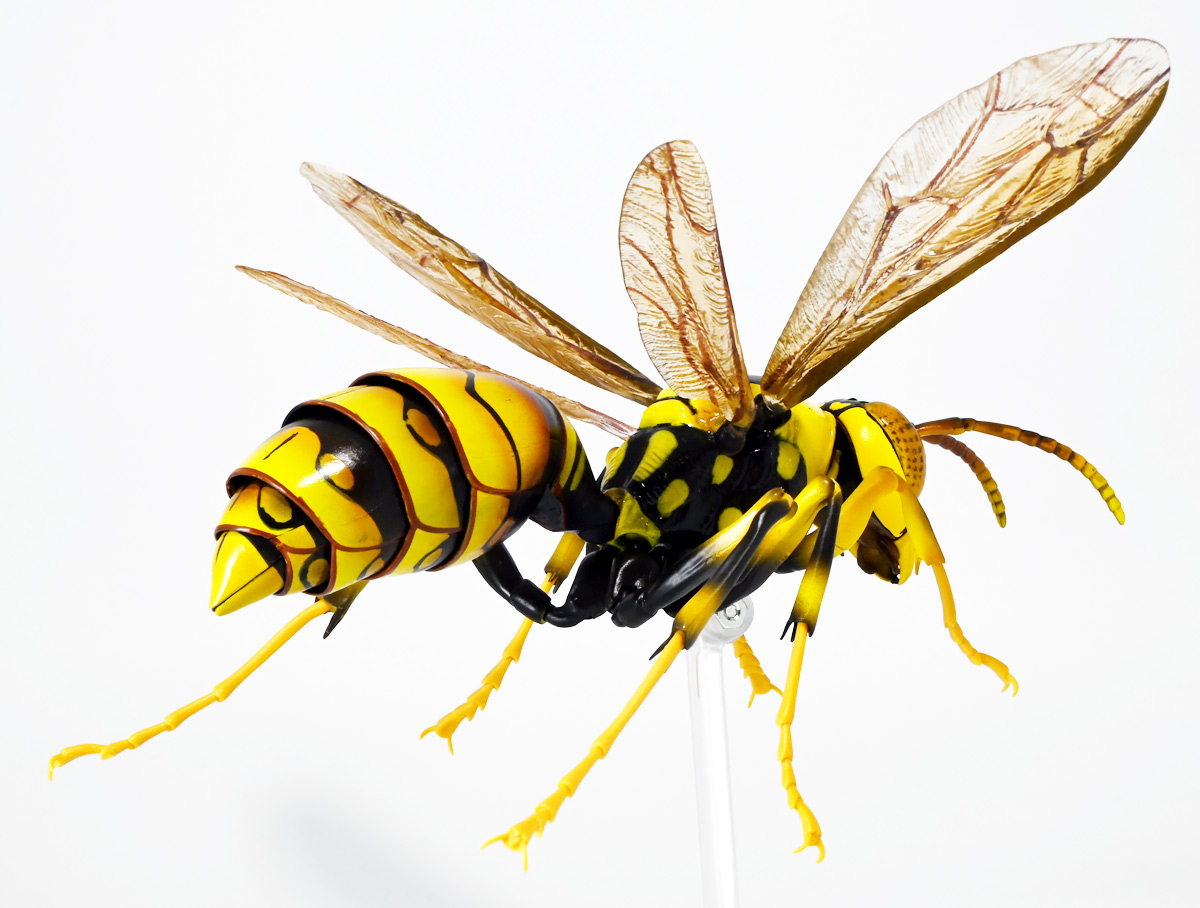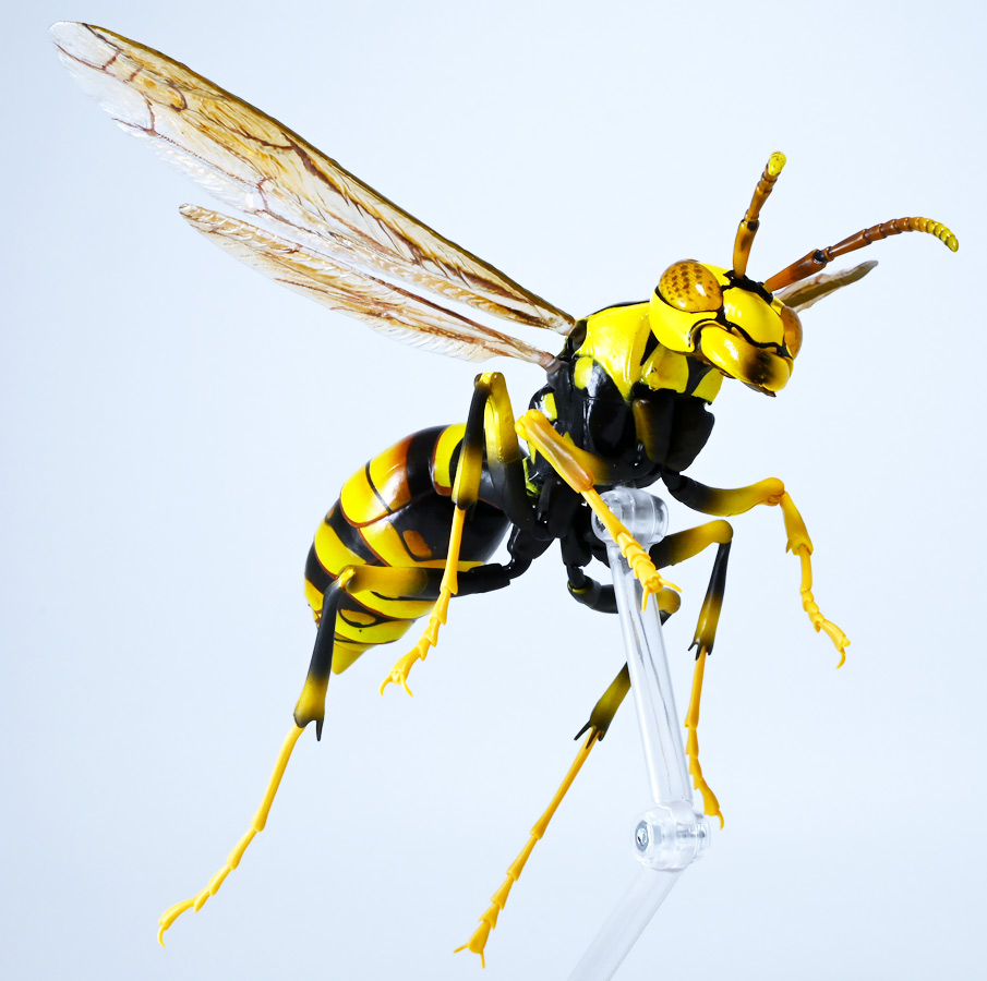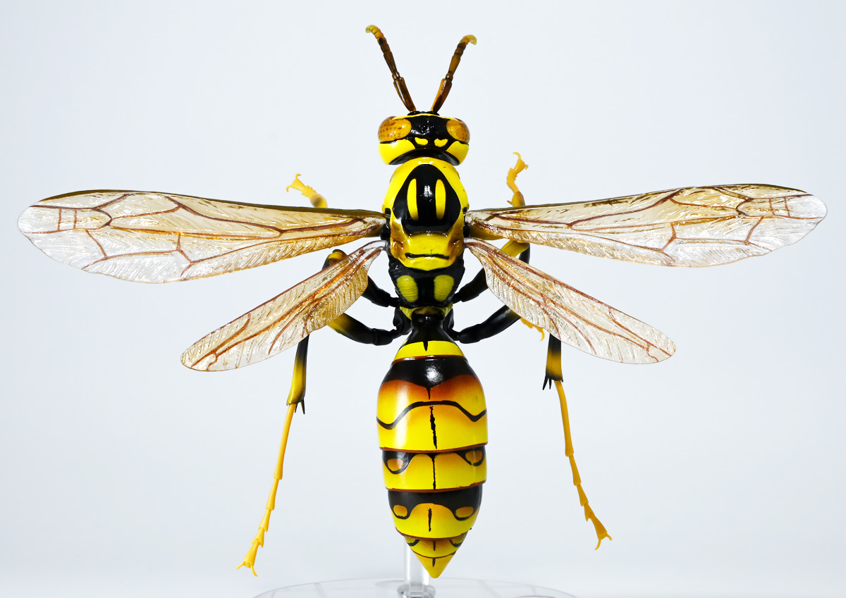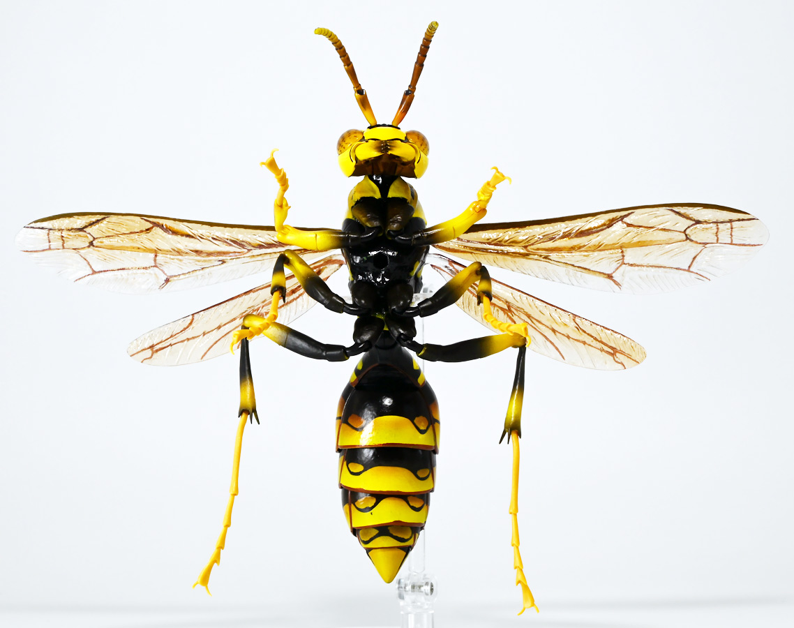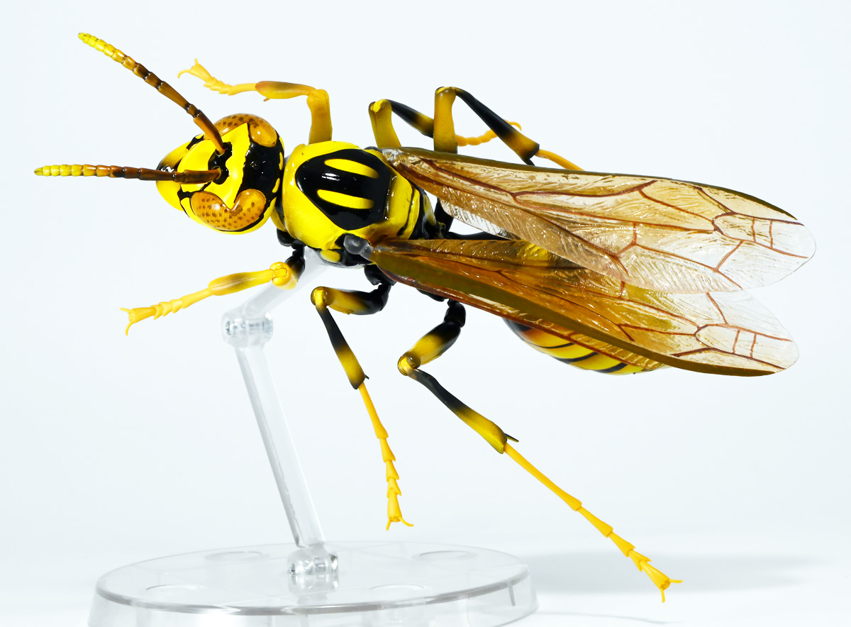 ■バンダイ いきもの大図鑑アドバンス アシナガバチ ディスプレイスタンドセット キアシナガバチ ![]() バンダイより、ガシャポンオンライン限定で発売された一回1800円(+送料)ガチャ。 2025年10月10日〜11月6日まで受注、着弾は2026年1月30日。 カプセル入りでなくこんな風に袋詰めで届くぞよ。 ![]() ラインナップは「キアシナガバチ」、「セグロアシナガバチ」、「キボシアシナガバチ」の全3種。 このうち、キボシアシナガバチのみオンライン限定であるぞよ。 オンライン限定仕様として、全てのラインナップに汎用ディスプレイ台座セットが付属。 更に前翅が分割無しの豪華版となっている。 一方、カプセル版のタイトルは「いきもの大図鑑アドバンス アシナガバチとブルドックアリ」となっており、 「キアシナガバチ」、「セグロアシナガバチ」、「ブルドッグアリ」のブラックとレッドの4種混在ラインナップで、 価格は1500円。 そう、この弾の実機版は膜翅目特集の混在ラインナップだが、 オンラインではハチとアリ、どちらか選ぶ事が出来るのだ・・・! 必ず送料がかかるので割高だが、おまけは豪華だし、 ハチとアリ一個ずつならダブり無しで選択できるのは嬉しい形態ぞよね! 毎回こうしてくれぞよ〜っ!! ![]() という事でオンライン版は「キボシアシナガバチ」を引けると大当たりなのだが・・・ おっと、わたくしは最もポピュラーな「キアシナガバチ」が当たったぞよ! 前述の通り、オンライン版は前翅に分割の無い豪華版。 筐体版ではカプセルに収める都合、翅が2パーツに分割されているぞよ。 ![]() 世界に26属1000種以上知られるスズメバチ科アシナガバチ亜科の昆虫のうち、 この日本では3属12種が知られるアシナガバチ。 今回ラインナップのキアシナガバチ、セグロアシナガバチ、キボシアシナガバチは アシナガバチ属に分類される代表的な種で、 市街地でも普通に見られるおろかなにんげんどもに身近な蜂であるぞよ。 中でもキアシナガバチは最も普通に見かける種であり、 大きさは1.5〜2.6センチ程度で、セグロアシナガバチと共に国内のアシナガバチでは最大種として知られている。 ![]() 形態はセグロアシナガバチらと似ているが、キアシナガバチは胸部から腹部を黄色の斑紋が占め、 特にくびれの辺りの背に黄色の二本線が浮かぶ事が特徴であるぞよ。 また、その名の通り長い脚が全体に黄色っぽいのも目印である。 アシナガバチはスズメバチと比べると性質は基本的には穏やかで、 こちらから手を出さない限り攻撃性は低いとされているが、 巣に近づいたりうっかり虐めたりするとその報復は激しく、ミツバチに比べると毒性も強い為に危険である。 特にキアシナガバチは本能的に巣を守る意識が高く、あんまり近づくと激しく威嚇してくるので油断ならんぞよ!! ![]() 人に身近な昆虫と言う事で、家屋の軒下や壁、お庭の樹など至る所に巣を作るキアシナガバチ。 巣の大きさは10〜20センチ程度で、質感は紙っぽく、グレーから茶色っぽい色味をしているぞよ。 これは木の皮を齧って薄く剥がし、唾液や草などと混ぜ合わせた素材で、 極めて頑丈だが、スズメバチの様に外側のカバーを持たず、 巣穴が下側に向けて剥き出しとなっている点が特徴的。 形状としては蓮の花をぶら下げたような形で雅な趣であるぞよ。 毎年4〜6月頃になると巣柄と呼ばれる支柱から放射状に広がるように巣の建造が始まり、 はじめ女王一人で5センチ大の小さな巣を作った後、卵を産み付ける。 赤ちゃんが産まれると女王は獲物を手ずから肉団子にして巣に運び、幼虫に与えるぞよ。 幼虫はやがて立派な働きバチとなり、巣作りや獲物を求めて働くようになる。 この頃には女王は産卵に専念できると言う訳ぞ。 そして夏も終わる頃、女王は次の女王となる卵を産み付け死んでゆく。 一方働きバチは交尾せず、単為生殖によってオスの生まれる卵を産み、役割を終える。 蜂は受精卵からメスが、無精卵からオスが産まれてくるのだ。 卵から孵った新女王とオス達は交尾をして、オスは役目を終えて絶命。 秋になると新女王は一人、木の洞や落ち葉の下など暖かい場所を見つけて越冬し、 次の季節を待って自分の巣を作るのだ。 従って、巣はシーズン中のみの利用。 一度使い終わった巣にハチが戻ってくる事は二度と無いぞよ。 アシナガバチは女王をリーダーに、 働きバチやオスがそれぞれ役割を持って巣の為に働き続け、役目を終えると死んでゆく。 このような暮らしぶりを「真社会性」と呼ぶぞよ。 ![]() アシナガバチは人に身近な昆虫である。 従っておろかなにんげんどもと共に分布を広げてきた昆虫を利用する。 例えばモンシロチョウの芋虫はアブラナ科植物を齧るので、農家さんには嫌われているが、 アシナガバチはこの幼虫を襲い、肉団子にして巣に持って帰る。 野菜を齧る芋虫を退治してくれるのだ! この事から、アシナガバチは益虫とされる事もあるぞよ。 一方で、軒下や手すりなんかに巣を作る