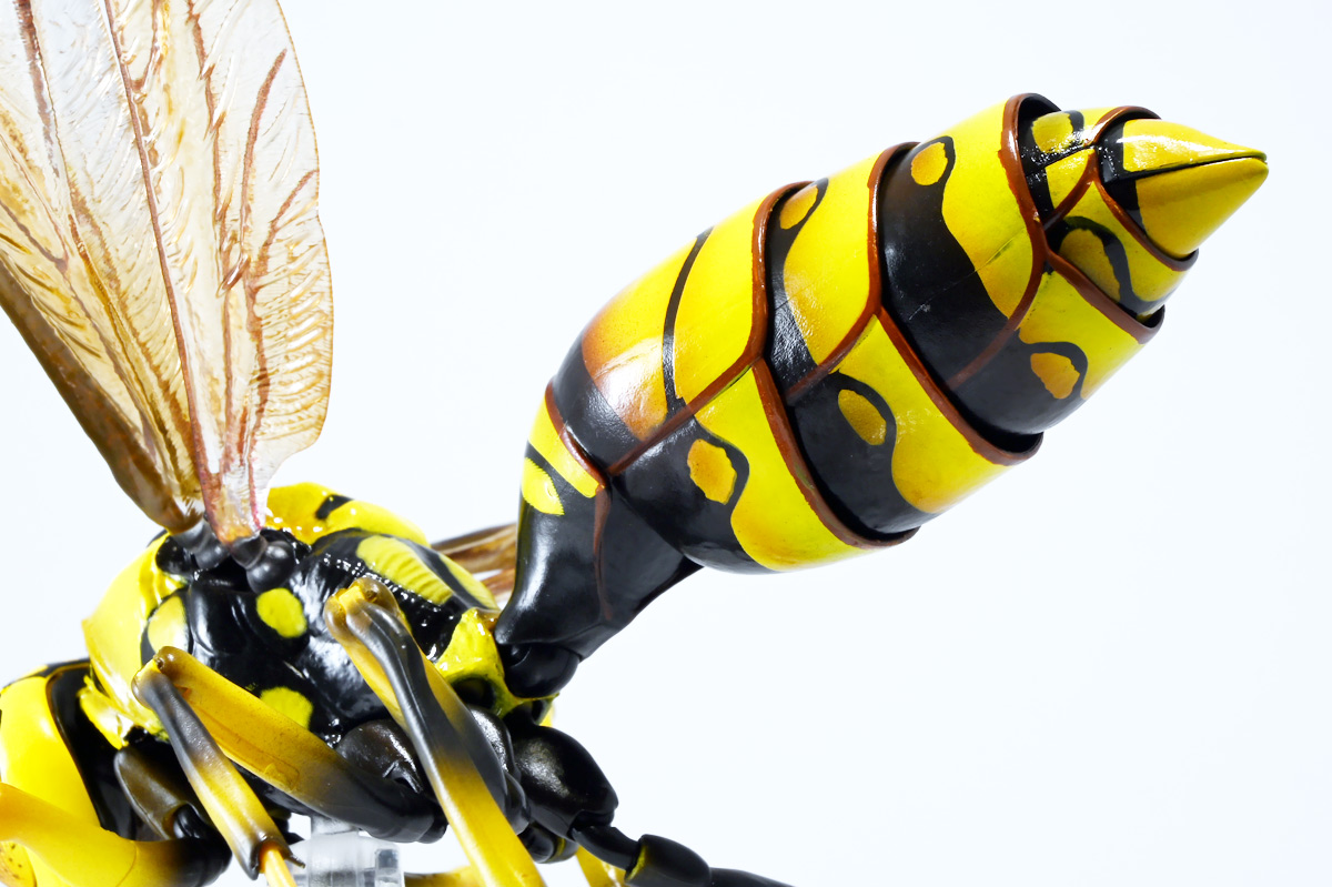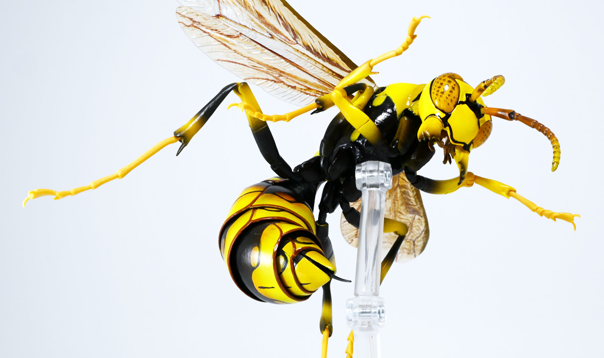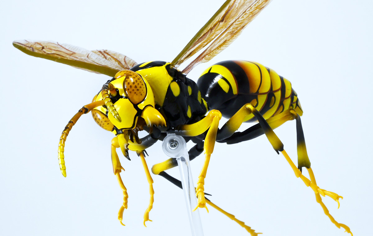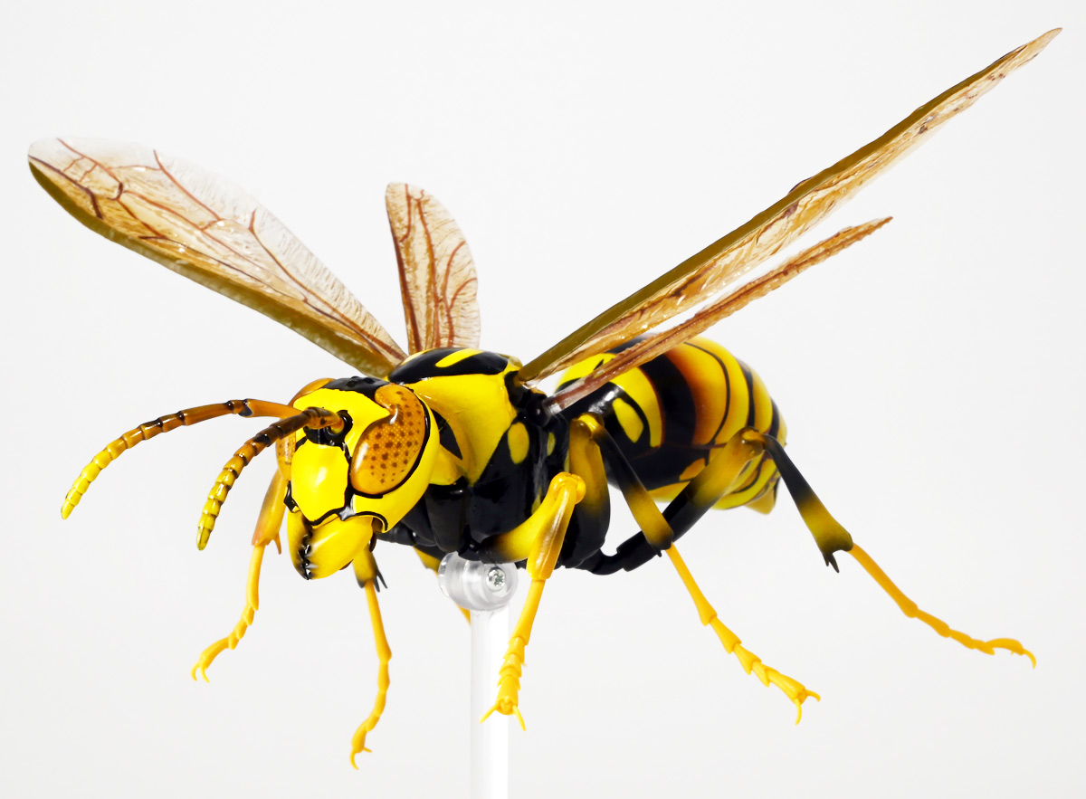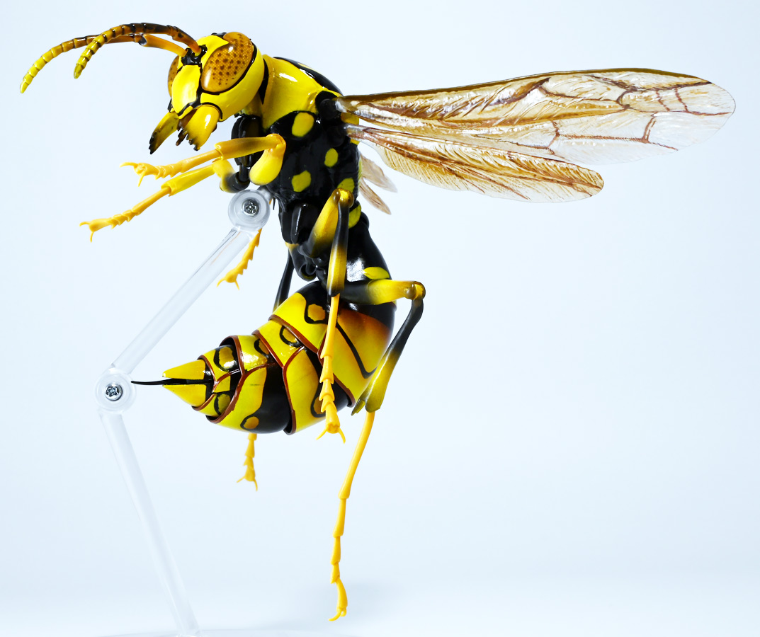 ■バンダイ いきもの大図鑑アドバンス アシナガバチ ディスプレイスタンドセット キアシナガバチ ![]() バンダイより、ガシャポンオンライン限定で発売された一回1800円(+送料)ガチャ。 2025年10月10日〜11月6日まで受注、着弾は2026年1月30日。 カプセル入りでなくこんな風に袋詰めで届くぞよ。 ![]() ラインナップは「キアシナガバチ」、「セグロアシナガバチ」、「キボシアシナガバチ」の全3種。 このうち、キボシアシナガバチのみオンライン限定であるぞよ。 オンライン限定仕様として、全てのラインナップに汎用ディスプレイ台座セットが付属。 更に前翅が分割無しの豪華版となっている。 一方、カプセル版のタイトルは「いきもの大図鑑アドバンス アシナガバチとブルドックアリ」となっており、 「キアシナガバチ」、「セグロアシナガバチ」、「ブルドッグアリ」のブラックとレッドの4種混在ラインナップで、 価格は1500円。 そう、この弾の実機版は膜翅目特集の混在ラインナップだが、 オンラインではハチとアリ、どちらか選ぶ事が出来るのだ・・・! 必ず送料がかかるので割高だが、おまけは豪華だし、 ハチとアリ一個ずつならダブり無しで選択できるのは嬉しい形態ぞよね! 毎回こうしてくれぞよ〜っ!! ![]() という事でオンライン版は「キボシアシナガバチ」を引けると大当たりなのだが・・・ おっと、わたくしは最もポピュラーな「キアシナガバチ」が当たったぞよ! 前述の通り、オンライン版は前翅に分割の無い豪華版。 筐体版ではカプセルに収める都合、翅が2パーツに分割されているぞよ。 ![]() 世界に26属1000種以上知られるスズメバチ科アシナガバチ亜科の昆虫のうち、 この日本では3属12種が知られるアシナガバチ。 今回ラインナップのキアシナガバチ、セグロアシナガバチ、キボシアシナガバチは アシナガバチ属に分類される代表的な種で、 市街地でも普通に見られるおろかなにんげんどもに身近な蜂であるぞよ。 中でもキアシナガバチは最も普通に見かける種であり、 大きさは1.5〜2.6センチ程度で、セグロアシナガバチと共に国内のアシナガバチでは最大種として知られている。 ![]() 形態はセグロアシナガバチらと似ているが、キアシナガバチは胸部から腹部を黄色の斑紋が占め、 特にくびれの辺りの背に黄色の二本線が浮かぶ事が特徴であるぞよ。 また、その名の通り長い脚が全体に黄色っぽいのも目印である。 アシナガバチはスズメバチと比べると性質は基本的には穏やかで、 こちらから手を出さない限り攻撃性は低いとされているが、 巣に近づいたりうっかり虐めたりするとその報復は激しく、ミツバチに比べると毒性も強い為に危険である。 特にキアシナガバチは本能的に巣を守る意識が高く、あんまり近づくと激しく威嚇してくるので油断ならんぞよ!! ![]() 人に身近な昆虫と言う事で、家屋の軒下や壁、お庭の樹など至る所に巣を作るキアシナガバチ。 巣の大きさは10〜20センチ程度で、質感は紙っぽく、グレーから茶色っぽい色味をしているぞよ。 これは木の皮を齧って薄く剥がし、唾液や草などと混ぜ合わせた素材で、 極めて頑丈だが、スズメバチの様に外側のカバーを持たず、 巣穴が下側に向けて剥き出しとなっている点が特徴的。 形状としては蓮の花をぶら下げたような形で雅な趣であるぞよ。 毎年4〜6月頃になると巣柄と呼ばれる支柱から放射状に広がるように巣の建造が始まり、 はじめ女王一人で5センチ大の小さな巣を作った後、卵を産み付ける。 赤ちゃんが産まれると女王は獲物を手ずから肉団子にして巣に運び、幼虫に与えるぞよ。 幼虫はやがて立派な働きバチとなり、巣作りや獲物を求めて働くようになる。 この頃には女王は産卵に専念できると言う訳ぞ。 そして夏も終わる頃、女王は次の女王となる卵を産み付け死んでゆく。 一方働きバチは交尾せず、単為生殖によってオスの生まれる卵を産み、役割を終える。 蜂は受精卵からメスが、無精卵からオスが産まれてくるのだ。 卵から孵った新女王とオス達は交尾をして、オスは役目を終えて絶命。 秋になると新女王は一人、木の洞や落ち葉の下など暖かい場所を見つけて越冬し、 次の季節を待って自分の巣を作るのだ。 従って、巣はシーズン中のみの利用。 一度使い終わった巣にハチが戻ってくる事は二度と無いぞよ。 アシナガバチは女王をリーダーに、 働きバチやオスがそれぞれ役割を持って巣の為に働き続け、役目を終えると死んでゆく。 このような暮らしぶりを「真社会性」と呼ぶぞよ。 ![]() アシナガバチは人に身近な昆虫である。 従っておろかなにんげんどもと共に分布を広げてきた昆虫を利用する。 例えばモンシロチョウの芋虫はアブラナ科植物を齧るので、農家さんには嫌われているが、 アシナガバチはこの幼虫を襲い、肉団子にして巣に持って帰る。 野菜を齧る芋虫を退治してくれるのだ! この事から、アシナガバチは益虫とされる事もあるぞよ。 一方で、軒下や手すりなんかに巣を作る