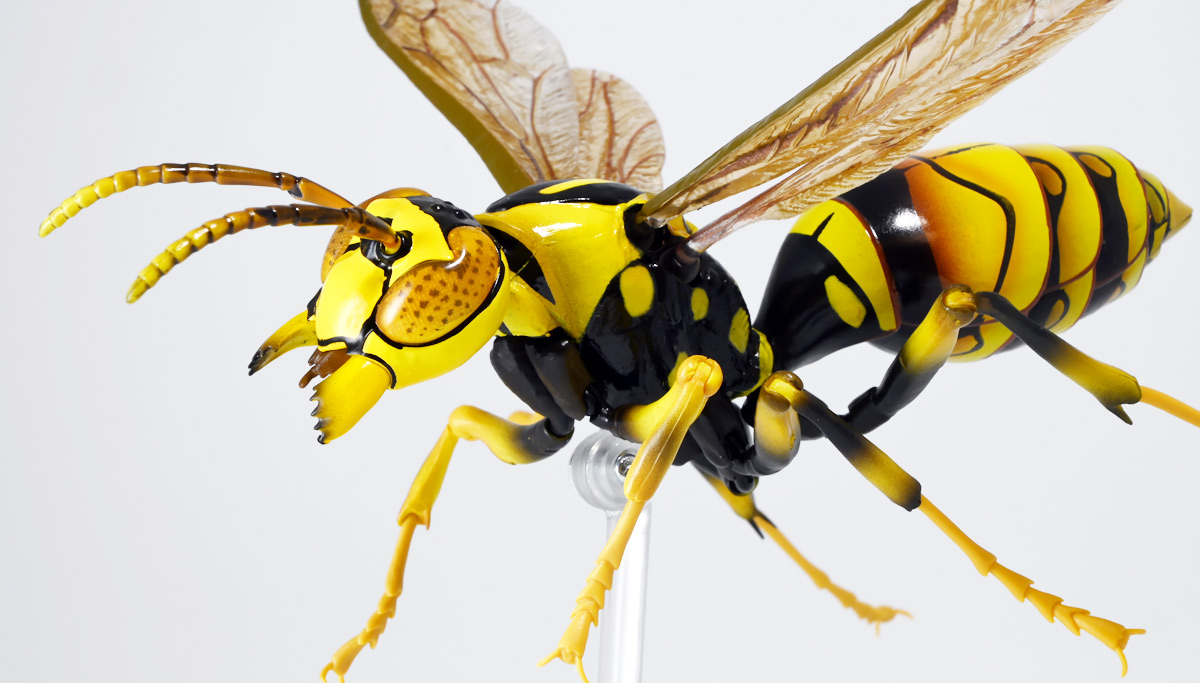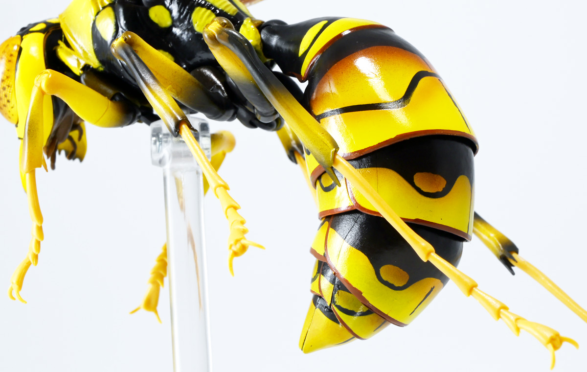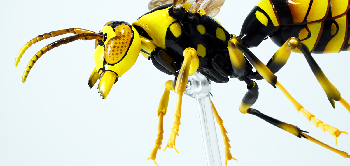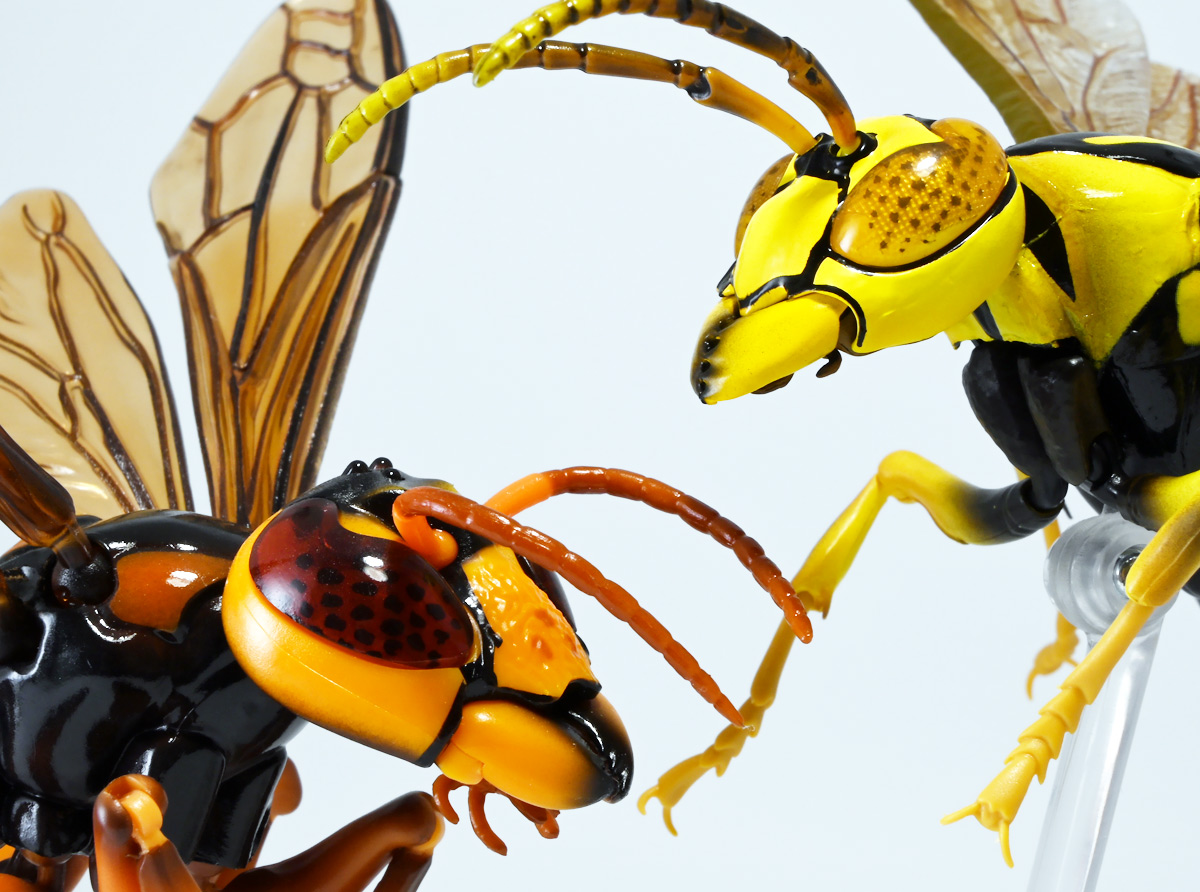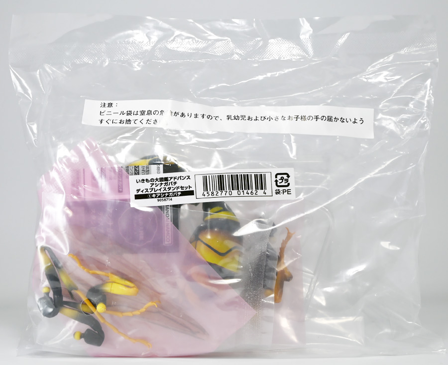 ■バンダイ いきもの大図鑑アドバンス アシナガバチ ディスプレイスタンドセット キアシナガバチ ![]() バンダイより、ガシャポンオンライン限定で発売された一回1800円(+送料)ガチャ。 2025年10月10日〜11月6日まで受注、着弾は2026年1月30日。 カプセル入りでなくこんな風に袋詰めで届くぞよ。 ![]() ラインナップは「キアシナガバチ」、「セグロアシナガバチ」、「キボシアシナガバチ」の全3種。 このうち、キボシアシナガバチのみオンライン限定であるぞよ。 オンライン限定仕様として、全てのラインナップに汎用ディスプレイ台座セットが付属。 更に前翅が分割無しの豪華版となっている。 一方、カプセル版のタイトルは「いきもの大図鑑アドバンス アシナガバチとブルドックアリ」となっており、 「キアシナガバチ」、「セグロアシナガバチ」、「ブルドッグアリ」のブラックとレッドの4種混在ラインナップで、 価格は1500円。 そう、この弾の実機版は膜翅目特集の混在ラインナップだが、 オンラインではハチとアリ、どちらか選ぶ事が出来るのだ・・・! 必ず送料がかかるので割高だが、おまけは豪華だし、 ハチとアリ一個ずつならダブり無しで選択できるのは嬉しい形態ぞよね! 毎回こうしてくれぞよ〜っ!! ![]() という事でオンライン版は「キボシアシナガバチ」を引けると大当たりなのだが・・・ おっと、わたくしは最もポピュラーな「キアシナガバチ」が当たったぞよ! 前述の通り、オンライン版は前翅に分割の無い豪華版。 筐体版ではカプセルに収める都合、翅が2パーツに分割されているぞよ。 ![]() 世界に26属1000種以上知られるスズメバチ科アシナガバチ亜科の昆虫のうち、 この日本では3属12種が知られるアシナガバチ。 今回ラインナップのキアシナガバチ、セグロアシナガバチ、キボシアシナガバチは アシナガバチ属に分類される代表的な種で、 市街地でも普通に見られるおろかなにんげんどもに身近な蜂であるぞよ。 中でもキアシナガバチは最も普通に見かける種であり、 大きさは1.5〜2.6センチ程度で、セグロアシナガバチと共に国内のアシナガバチでは最大種として知られている。 ![]() 形態はセグロアシナガバチらと似ているが、キアシナガバチは胸部から腹部を黄色の斑紋が占め、 特にくびれの辺りの背に黄色の二本線が浮かぶ事が特徴であるぞよ。 また、その名の通り長い脚が全体に黄色っぽいのも目印である。 アシナガバチはスズメバチと比べると性質は基本的には穏やかで、 こちらから手を出さない限り攻撃性は低いとされているが、 巣に近づいたりうっかり虐めたりするとその報復は激しく、ミツバチに比べると毒性も強い為に危険である。 特にキアシナガバチは本能的に巣を守る意識が高く、あんまり近づくと激しく威嚇してくるので油断ならんぞよ!! ![]() 人に身近な昆虫と言う事で、家屋の軒下や壁、お庭の樹など至る所に巣を作るキアシナガバチ。 巣の大きさは10〜20センチ程度で、質感は紙っぽく、グレーから茶色っぽい色味をしているぞよ。 これは木の皮を齧って薄く剥がし、唾液や草などと混ぜ合わせた素材で、 極めて頑丈だが、スズメバチの様に外側のカバーを持たず、 巣穴が下側に向けて剥き出しとなっている点が特徴的。 形状としては蓮の花をぶら下げたような形で雅な趣であるぞよ。 毎年4〜6月頃になると巣柄と呼ばれる支柱から放射状に広がるように巣の建造が始まり、 はじめ女王一人で5センチ大の小さな巣を作った後、卵を産み付ける。 赤ちゃんが産まれると女王は獲物を手ずから肉団子にして巣に運び、幼虫に与えるぞよ。 幼虫はやがて立派な働きバチとなり、巣作りや獲物を求めて働くようになる。 この頃には女王は産卵に専念できると言う訳ぞ。 そして夏も終わる頃、女王は次の女王となる卵を産み付け死んでゆく。 一方働きバチは交尾せず、単為生殖によってオスの生まれる卵を産み、役割を終える。 蜂は受精卵からメスが、無精卵からオスが産まれてくるのだ。 卵から孵った新女王とオス達は交尾をして、オスは役目を終えて絶命。 秋になると新女王は一人、木の洞や落ち葉の下など暖かい場所を見つけて越冬し、 次の季節を待って自分の巣を作るのだ。 従って、巣はシーズン中のみの利用。 一度使い終わった巣にハチが戻ってくる事は二度と無いぞよ。 アシナガバチは女王をリーダーに、 働きバチやオスがそれぞれ役割を持って巣の為に働き続け、役目を終えると死んでゆく。 このような暮らしぶりを「真社会性」と呼ぶぞよ。 ![]() アシナガバチは人に身近な昆虫である。 従っておろかなにんげんどもと共に分布を広げてきた昆虫を利用する。 例えばモンシロチョウの芋虫はアブラナ科植物を齧るので、農家さんには嫌われているが、 アシナガバチはこの幼虫を襲い、肉団子にして巣に持って帰る。 野菜を齧る芋虫を退治してくれるのだ! この事から、アシナガバチは益虫とされる事もあるぞよ。 一方で、軒下や手すりなんかに巣を作る