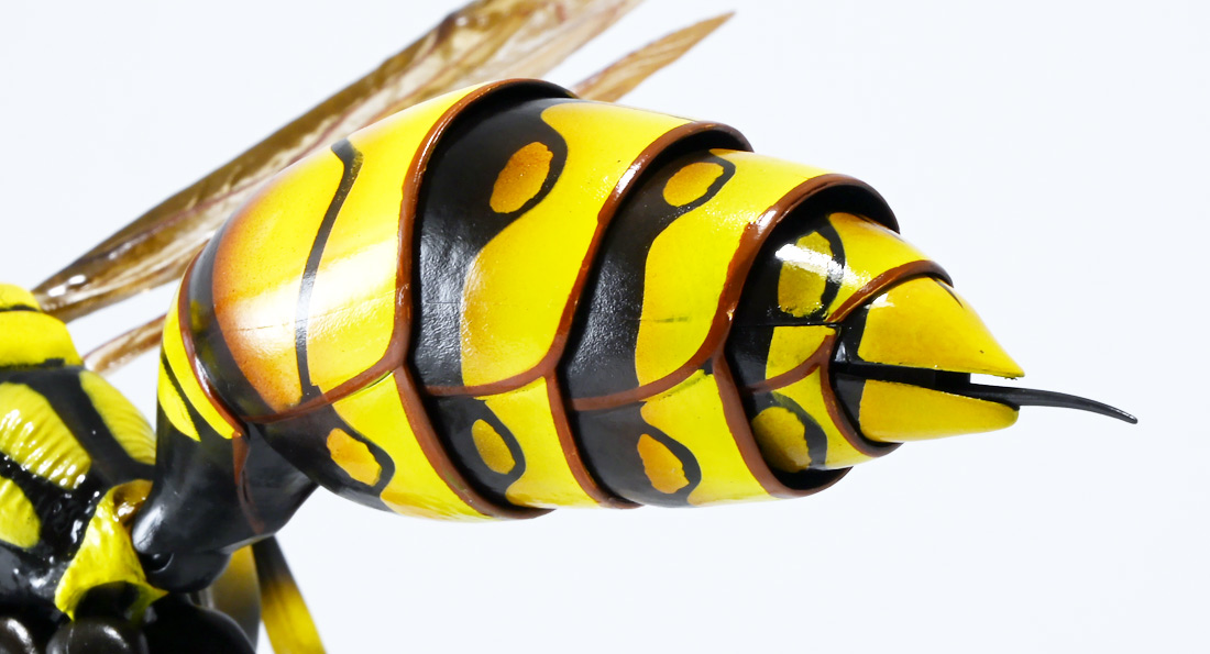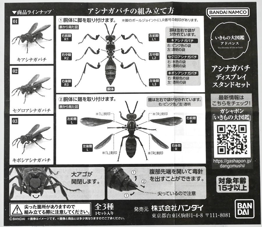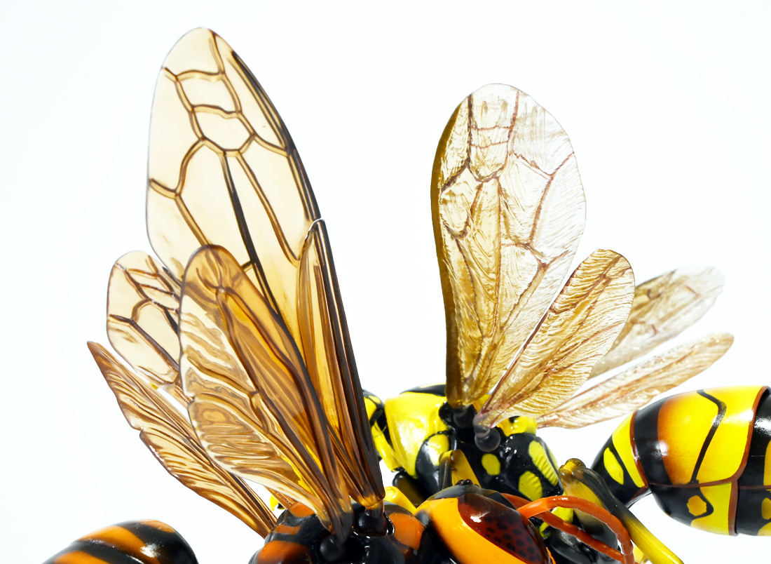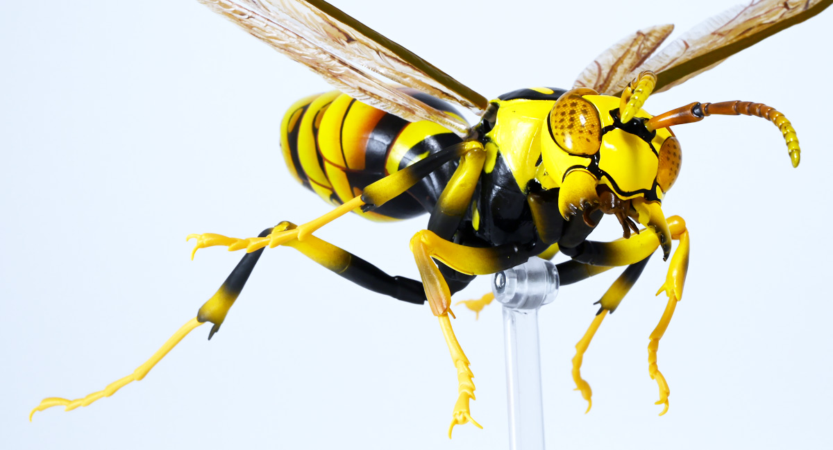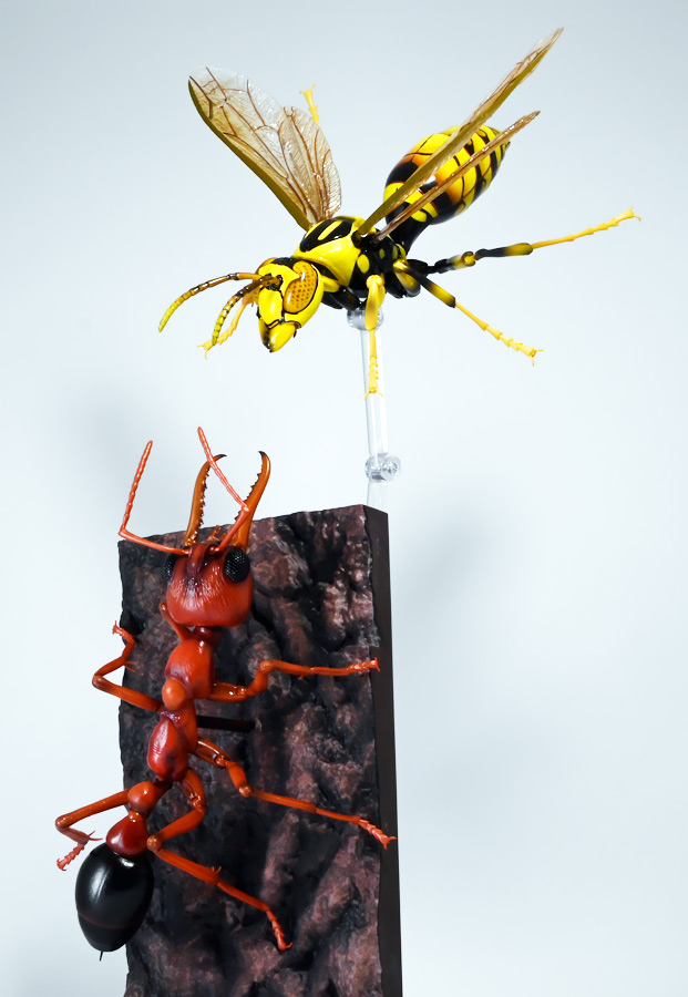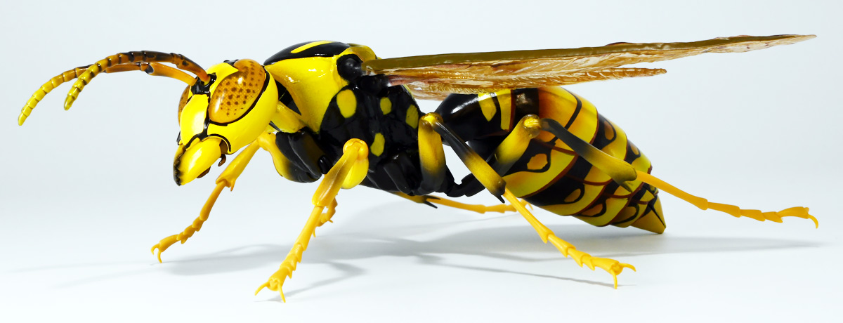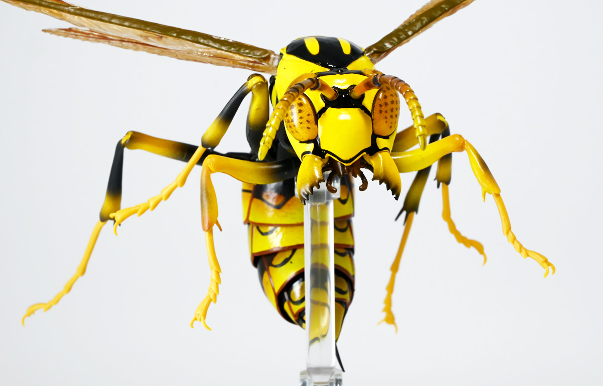 ■バンダイ いきもの大図鑑アドバンス アシナガバチ ディスプレイスタンドセット キアシナガバチ ![]() バンダイより、ガシャポンオンライン限定で発売された一回1800円(+送料)ガチャ。 2025年10月10日〜11月6日まで受注、着弾は2026年1月30日。 カプセル入りでなくこんな風に袋詰めで届くぞよ。 ![]() ラインナップは「キアシナガバチ」、「セグロアシナガバチ」、「キボシアシナガバチ」の全3種。 このうち、キボシアシナガバチのみオンライン限定であるぞよ。 オンライン限定仕様として、全てのラインナップに汎用ディスプレイ台座セットが付属。 更に前翅が分割無しの豪華版となっている。 一方、カプセル版のタイトルは「いきもの大図鑑アドバンス アシナガバチとブルドックアリ」となっており、 「キアシナガバチ」、「セグロアシナガバチ」、「ブルドッグアリ」のブラックとレッドの4種混在ラインナップで、 価格は1500円。 そう、この弾の実機版は膜翅目特集の混在ラインナップだが、 オンラインではハチとアリ、どちらか選ぶ事が出来るのだ・・・! 必ず送料がかかるので割高だが、おまけは豪華だし、 ハチとアリ一個ずつならダブり無しで選択できるのは嬉しい形態ぞよね! 毎回こうしてくれぞよ〜っ!! ![]() という事でオンライン版は「キボシアシナガバチ」を引けると大当たりなのだが・・・ おっと、わたくしは最もポピュラーな「キアシナガバチ」が当たったぞよ! 前述の通り、オンライン版は前翅に分割の無い豪華版。 筐体版ではカプセルに収める都合、翅が2パーツに分割されているぞよ。 ![]() 世界に26属1000種以上知られるスズメバチ科アシナガバチ亜科の昆虫のうち、 この日本では3属12種が知られるアシナガバチ。 今回ラインナップのキアシナガバチ、セグロアシナガバチ、キボシアシナガバチは アシナガバチ属に分類される代表的な種で、 市街地でも普通に見られるおろかなにんげんどもに身近な蜂であるぞよ。 中でもキアシナガバチは最も普通に見かける種であり、 大きさは1.5〜2.6センチ程度で、セグロアシナガバチと共に国内のアシナガバチでは最大種として知られている。 ![]() 形態はセグロアシナガバチらと似ているが、キアシナガバチは胸部から腹部を黄色の斑紋が占め、 特にくびれの辺りの背に黄色の二本線が浮かぶ事が特徴であるぞよ。 また、その名の通り長い脚が全体に黄色っぽいのも目印である。 アシナガバチはスズメバチと比べると性質は基本的には穏やかで、 こちらから手を出さない限り攻撃性は低いとされているが、 巣に近づいたりうっかり虐めたりするとその報復は激しく、ミツバチに比べると毒性も強い為に危険である。 特にキアシナガバチは本能的に巣を守る意識が高く、あんまり近づくと激しく威嚇してくるので油断ならんぞよ!! ![]() 人に身近な昆虫と言う事で、家屋の軒下や壁、お庭の樹など至る所に巣を作るキアシナガバチ。 巣の大きさは10〜20センチ程度で、質感は紙っぽく、グレーから茶色っぽい色味をしているぞよ。 これは木の皮を齧って薄く剥がし、唾液や草などと混ぜ合わせた素材で、 極めて頑丈だが、スズメバチの様に外側のカバーを持たず、 巣穴が下側に向けて剥き出しとなっている点が特徴的。 形状としては蓮の花をぶら下げたような形で雅な趣であるぞよ。 毎年4〜6月頃になると巣柄と呼ばれる支柱から放射状に広がるように巣の建造が始まり、 はじめ女王一人で5センチ大の小さな巣を作った後、卵を産み付ける。 赤ちゃんが産まれると女王は獲物を手ずから肉団子にして巣に運び、幼虫に与えるぞよ。 幼虫はやがて立派な働きバチとなり、巣作りや獲物を求めて働くようになる。 この頃には女王は産卵に専念できると言う訳ぞ。 そして夏も終わる頃、女王は次の女王となる卵を産み付け死んでゆく。 一方働きバチは交尾せず、単為生殖によってオスの生まれる卵を産み、役割を終える。 蜂は受精卵からメスが、無精卵からオスが産まれてくるのだ。 卵から孵った新女王とオス達は交尾をして、オスは役目を終えて絶命。 秋になると新女王は一人、木の洞や落ち葉の下など暖かい場所を見つけて越冬し、 次の季節を待って自分の巣を作るのだ。 従って、巣はシーズン中のみの利用。 一度使い終わった巣にハチが戻ってくる事は二度と無いぞよ。 アシナガバチは女王をリーダーに、 働きバチやオスがそれぞれ役割を持って巣の為に働き続け、役目を終えると死んでゆく。 このような暮らしぶりを「真社会性」と呼ぶぞよ。 ![]() アシナガバチは人に身近な昆虫である。 従っておろかなにんげんどもと共に分布を広げてきた昆虫を利用する。 例えばモンシロチョウの芋虫はアブラナ科植物を齧るので、農家さんには嫌われているが、 アシナガバチはこの幼虫を襲い、肉団子にして巣に持って帰る。 野菜を齧る芋虫を退治してくれるのだ! この事から、アシナガバチは益虫とされる事もあるぞよ。 一方で、軒下や手すりなんかに巣を作る