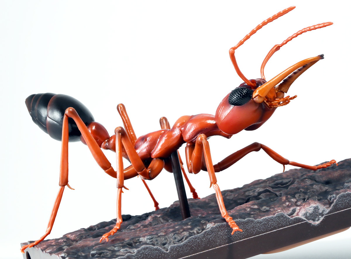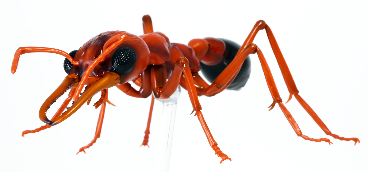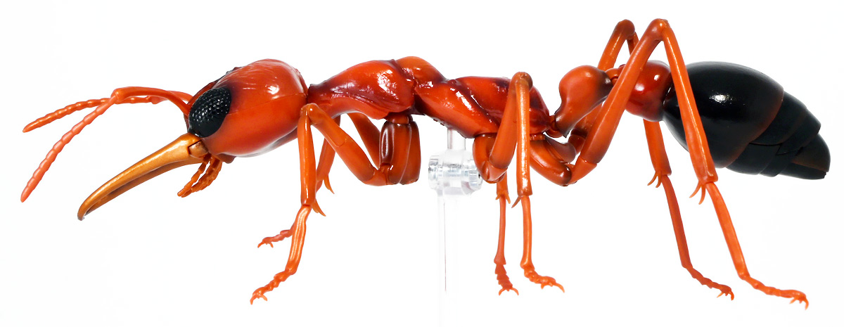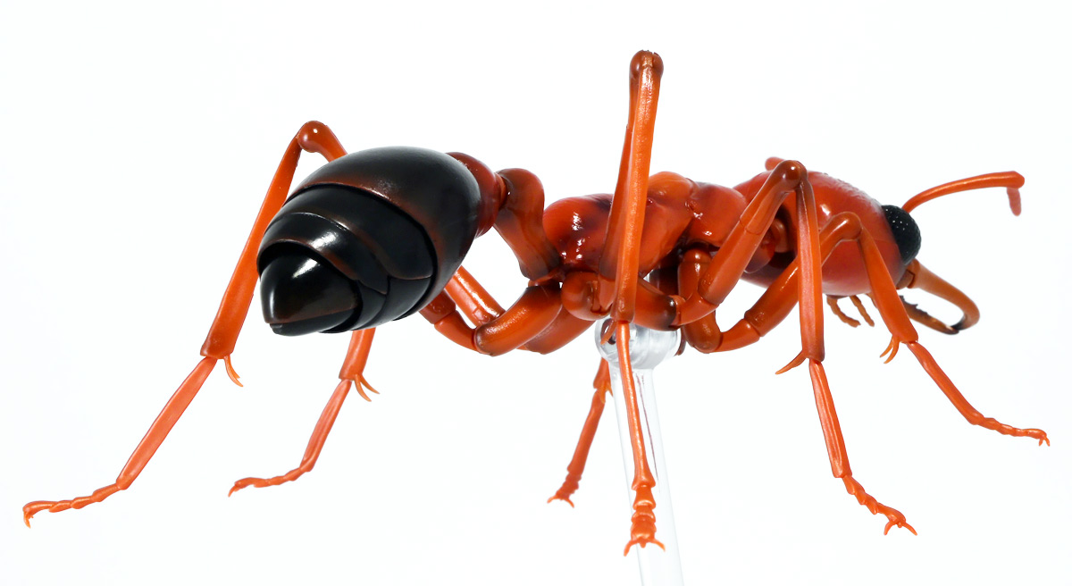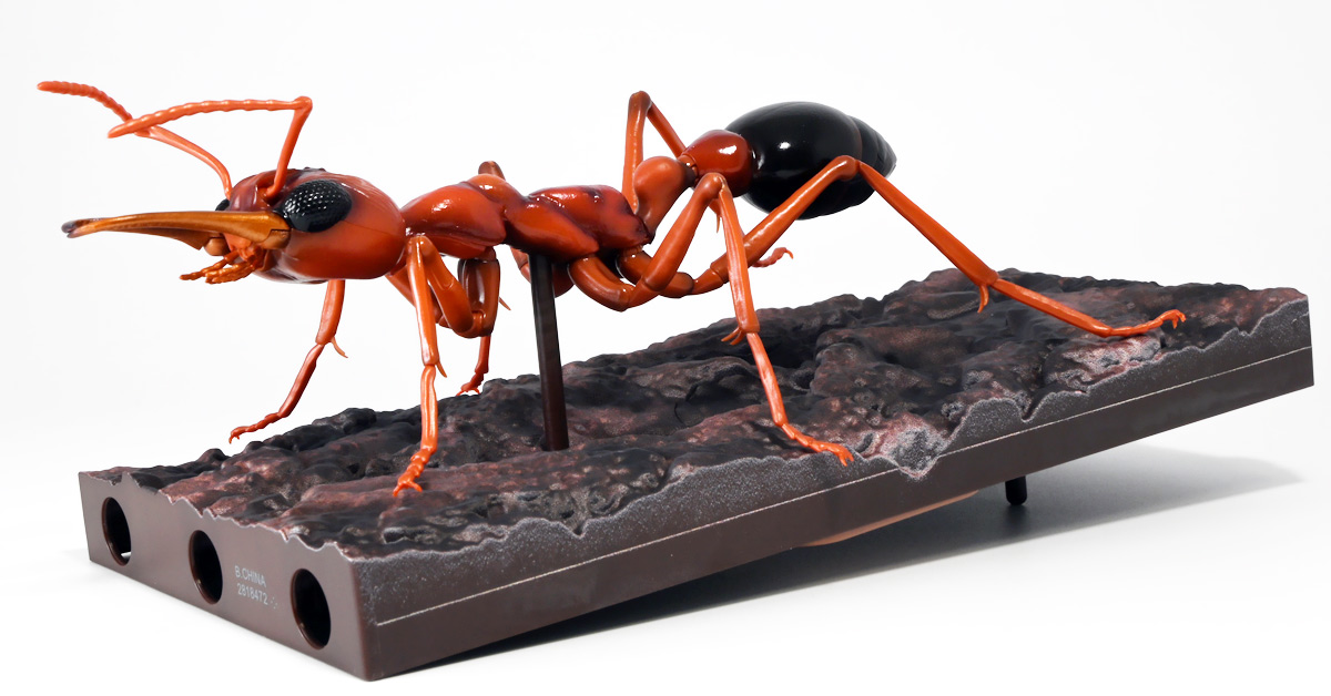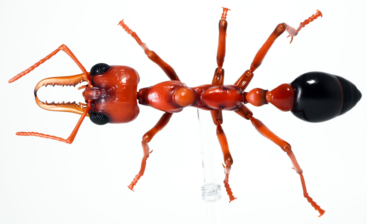 ■バンダイ いきもの大図鑑アドバンス ブルドッグアリ 樹皮台座(中)セット ブルドックアリ(レッド) ![]() バンダイより、ガシャポンオンラインで限定販売された一回1800円ガチャ(+送料) 2025年9月26日〜10月30日まで受注、 2026年1月30日着弾でした。 ![]() ラインナップは全てブルドッグアリ! オンライン版は「ブラック」、「レッド」、そして黒赤カラーの「ミックス」、3種のカラバリがラインナップ。 このうち「ミックス」のみオンライン限定カラーとなっているぞよ。 また、オンラインだけのおまけとして「樹皮台座(中)」が付属する。 ガチャ筐体向けの一般販売版は一回1500円で「アシナガバチ」と混在ラインナップの膜翅目特集となっており、 「キアシナガバチ」、「セグロアシナガバチ」、ブルドッグアリ「ブラック」、「レッド」の全4種となっていました。 つまり、オンライン版では+300円する代わりにハチとアリが選べるうえに限定カラーあり。 更に豪華台座も付属したと言う事だ! ![]() 何が出てもブルドッグアリなので気軽に回せるぞよね! って事で今回は「レッド」カラーが当たりました。 大当たりは頭とお腹が黒く、胸が赤黒のオンライン限定カラー「ミックス」なのだが・・・ わたくしとしては今回黒よりは赤いアリが欲しかったのでまぁ良いだろう・・・!! ![]() おろかなにんげんどもにも身近な昆虫、蟻。 黒くて小さなアリさんと言えばそこら中をちょろちょろしているぞよね! この日本には8亜科56属273種くらいのアリが棲んでいると言われているぞよ! 中でもポピュラーな国内最大種のクロオオアリはオオアリ属、クロヤマアリはヤマアリ属といった具合だが、 本商品のモチーフである「ブルドッグアリ」はキバハリアリ属(ミルメシア)に分類される。 キバハリアリは原始的なハリアリがオーストラリア大陸に隔離され、 古くに分化したものの末裔であるぞよ。 言わば有袋類のアリバージョンってトコぞよね! オーストラリア全土とその沿岸の島々に少なくとも93種が知られており、 全ての種で大きな複眼と細長く立派な大顎、 そして、有剣類の武器である産卵管が変化してできた毒針を持っているぞよ。 ![]() 本弾では全てが「ブルドッグアリ」と呼ばれている。 ブルドッグアリとは英名の「Bulldog ants」を直訳したもので、 ホントの学名は「キバハリアリ(Myrmecia)」であるぞよ。 そして「ブラック」、「レッド」、「ミックス」と言うのは単に玩具のカラーの紹介である。 前述したとおり、キバハリアリは93種くらい知られており、 全ての種でおめめがでっかく立派な大顎を持つという形質は共通しているからして、 シルエットが似ているぞよ。 従って原型を使いまわしてカラバリで複数種を表現すると言う事も出来るワケです。 それではこの「レッド」カラーに合致する、 全体に赤くて腹部が黒い種は果たして何なのかという事であるが、 ま〜わたくしにも詳しい事はよくわからんが・・・ オーストラリア東部クイーンズランド州、ニューサウスウェールズ州、 ビクトリア州、オーストラリア首都特別地域にのみ見られるという 「ブレビノダ(Myrmecia brevinoda)」などはそっくりであるぞよ。 これは女王で4センチ、働きアリでは3.7センチに達する最大種である。 他に西オーストラリア州と南オーストラリア州に分布する「Myrmecia pavida」なども似ている。 体の赤いキバハリアリには「グローサキバハリアリ(Myrmecia gulosa)」もいて都市部でも普通に見られ、 ペットとしても多く出回ると言うが、 これと本商品を比べると、腹部の色分けが少し違っており、やはりブレビノダにより近い。 何れにしても有名なのはオオキバハリアリ亜属に含まれるキバハリアリっぽいぞよ。 ![]() オーストラリアに跳梁するキバハリアリは草原、森林、ヒース荒地、市街地などなど、 至る所の地中に巣を作る。 アリの中ではもっとも原始的な部類で、働きアリは単独で仕事をするぞよ。 つまり、フェロモンで仲間を誘引して餌を探すと言う事をしない。 一方で、縄張りの警戒時にはフェロモンを用いて仲間で一斉に敵を攻撃すると言う事もあるようだ。 多くは昼行性で、暖かい時期に活動し、冬は休眠する。 幼虫は肉食だが、成虫はやはり花や樹液などの蜜を吸う。 働きアリが栄養卵を産む事でも知られており、つまり、働きアリが産んだ卵を女王と幼虫が食べる事で栄養を得るぞよ。 そして、食うものが無いと幼虫同士も共食いをする。 なんと獰猛な性質だが、全てのアリは真社会性昆虫であるからして、 全員が巣の為に役割を持って働いているから、個の事などどうでも良いのだ。 ![]() キバハリアリは昆虫界でも屈指の毒性の高い毒針を持つ。 刺されると鋭い痛みが長く続く強力な武器であるぞよ。 この針には返しが無く、何度も何度も敵を繰り返し刺す事が出来る。 基本的には臆病な性質で、ちょっかいを出しても逃げ出して追いかけてこないくらいであるが、 一度巣を弄られると激怒して軍勢となって襲い掛かって