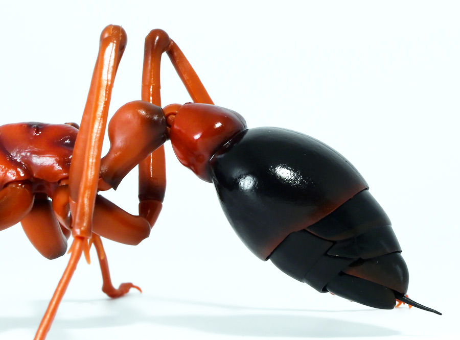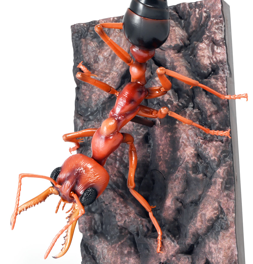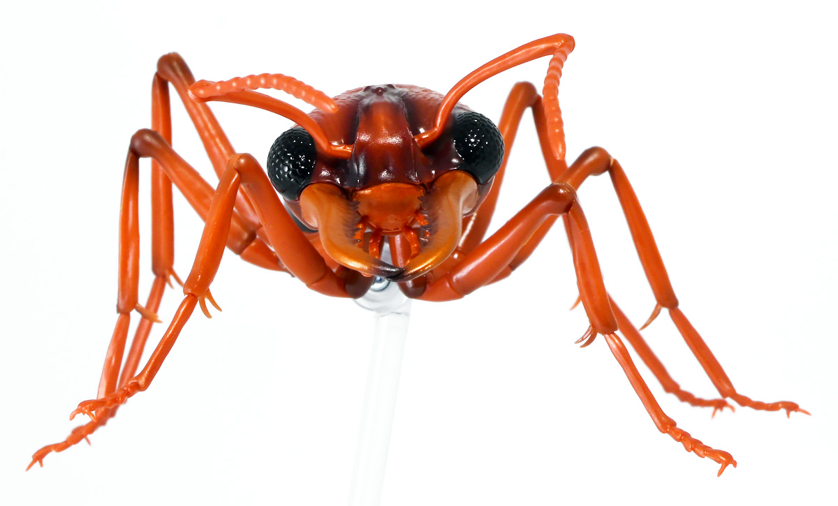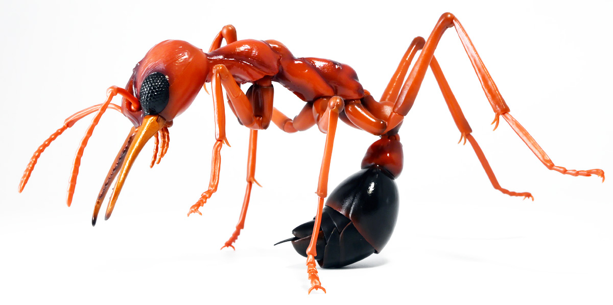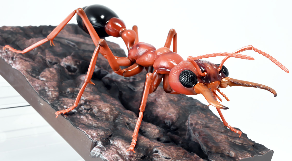 ■バンダイ いきもの大図鑑アドバンス ブルドッグアリ 樹皮台座(中)セット ブルドックアリ(レッド) ![]() バンダイより、ガシャポンオンラインで限定販売された一回1800円ガチャ(+送料) 2025年9月26日〜10月30日まで受注、 2026年1月30日着弾でした。 ![]() ラインナップは全てブルドッグアリ! オンライン版は「ブラック」、「レッド」、そして黒赤カラーの「ミックス」、3種のカラバリがラインナップ。 このうち「ミックス」のみオンライン限定カラーとなっているぞよ。 また、オンラインだけのおまけとして「樹皮台座(中)」が付属する。 ガチャ筐体向けの一般販売版は一回1500円で「アシナガバチ」と混在ラインナップの膜翅目特集となっており、 「キアシナガバチ」、「セグロアシナガバチ」、ブルドッグアリ「ブラック」、「レッド」の全4種となっていました。 つまり、オンライン版では+300円する代わりにハチとアリが選べるうえに限定カラーあり。 更に豪華台座も付属したと言う事だ! ![]() 何が出てもブルドッグアリなので気軽に回せるぞよね! って事で今回は「レッド」カラーが当たりました。 大当たりは頭とお腹が黒く、胸が赤黒のオンライン限定カラー「ミックス」なのだが・・・ わたくしとしては今回黒よりは赤いアリが欲しかったのでまぁ良いだろう・・・!! ![]() おろかなにんげんどもにも身近な昆虫、蟻。 黒くて小さなアリさんと言えばそこら中をちょろちょろしているぞよね! この日本には8亜科56属273種くらいのアリが棲んでいると言われているぞよ! 中でもポピュラーな国内最大種のクロオオアリはオオアリ属、クロヤマアリはヤマアリ属といった具合だが、 本商品のモチーフである「ブルドッグアリ」はキバハリアリ属(ミルメシア)に分類される。 キバハリアリは原始的なハリアリがオーストラリア大陸に隔離され、 古くに分化したものの末裔であるぞよ。 言わば有袋類のアリバージョンってトコぞよね! オーストラリア全土とその沿岸の島々に少なくとも93種が知られており、 全ての種で大きな複眼と細長く立派な大顎、 そして、有剣類の武器である産卵管が変化してできた毒針を持っているぞよ。 ![]() 本弾では全てが「ブルドッグアリ」と呼ばれている。 ブルドッグアリとは英名の「Bulldog ants」を直訳したもので、 ホントの学名は「キバハリアリ(Myrmecia)」であるぞよ。 そして「ブラック」、「レッド」、「ミックス」と言うのは単に玩具のカラーの紹介である。 前述したとおり、キバハリアリは93種くらい知られており、 全ての種でおめめがでっかく立派な大顎を持つという形質は共通しているからして、 シルエットが似ているぞよ。 従って原型を使いまわしてカラバリで複数種を表現すると言う事も出来るワケです。 それではこの「レッド」カラーに合致する、 全体に赤くて腹部が黒い種は果たして何なのかという事であるが、 ま〜わたくしにも詳しい事はよくわからんが・・・ オーストラリア東部クイーンズランド州、ニューサウスウェールズ州、 ビクトリア州、オーストラリア首都特別地域にのみ見られるという 「ブレビノダ(Myrmecia brevinoda)」などはそっくりであるぞよ。 これは女王で4センチ、働きアリでは3.7センチに達する最大種である。 他に西オーストラリア州と南オーストラリア州に分布する「Myrmecia pavida」なども似ている。 体の赤いキバハリアリには「グローサキバハリアリ(Myrmecia gulosa)」もいて都市部でも普通に見られ、 ペットとしても多く出回ると言うが、 これと本商品を比べると、腹部の色分けが少し違っており、やはりブレビノダにより近い。 何れにしても有名なのはオオキバハリアリ亜属に含まれるキバハリアリっぽいぞよ。 ![]() オーストラリアに跳梁するキバハリアリは草原、森林、ヒース荒地、市街地などなど、 至る所の地中に巣を作る。 アリの中ではもっとも原始的な部類で、働きアリは単独で仕事をするぞよ。 つまり、フェロモンで仲間を誘引して餌を探すと言う事をしない。 一方で、縄張りの警戒時にはフェロモンを用いて仲間で一斉に敵を攻撃すると言う事もあるようだ。 多くは昼行性で、暖かい時期に活動し、冬は休眠する。 幼虫は肉食だが、成虫はやはり花や樹液などの蜜を吸う。 働きアリが栄養卵を産む事でも知られており、つまり、働きアリが産んだ卵を女王と幼虫が食べる事で栄養を得るぞよ。 そして、食うものが無いと幼虫同士も共食いをする。 なんと獰猛な性質だが、全てのアリは真社会性昆虫であるからして、 全員が巣の為に役割を持って働いているから、個の事などどうでも良いのだ。 ![]() キバハリアリは昆虫界でも屈指の毒性の高い毒針を持つ。 刺されると鋭い痛みが長く続く強力な武器であるぞよ。 この針には返しが無く、何度も何度も敵を繰り返し刺す事が出来る。 基本的には臆病な性質で、ちょっかいを出しても逃げ出して追いかけてこないくらいであるが、 一度巣を弄られると激怒して軍勢となって襲い掛かって