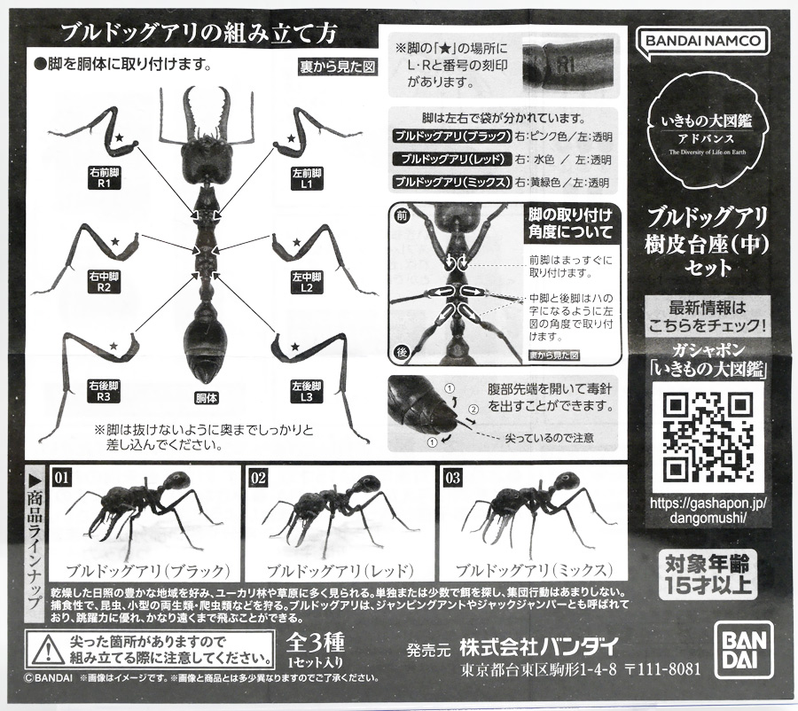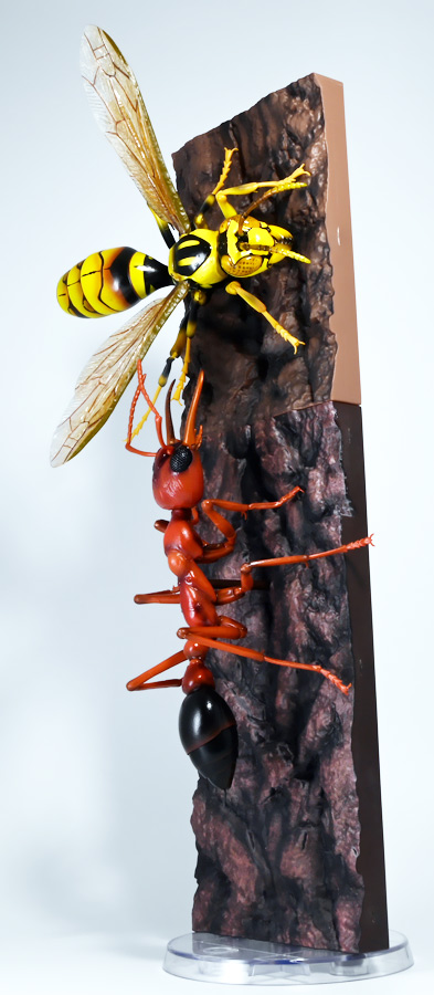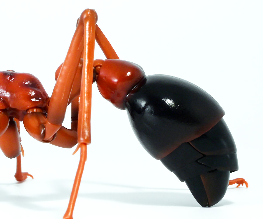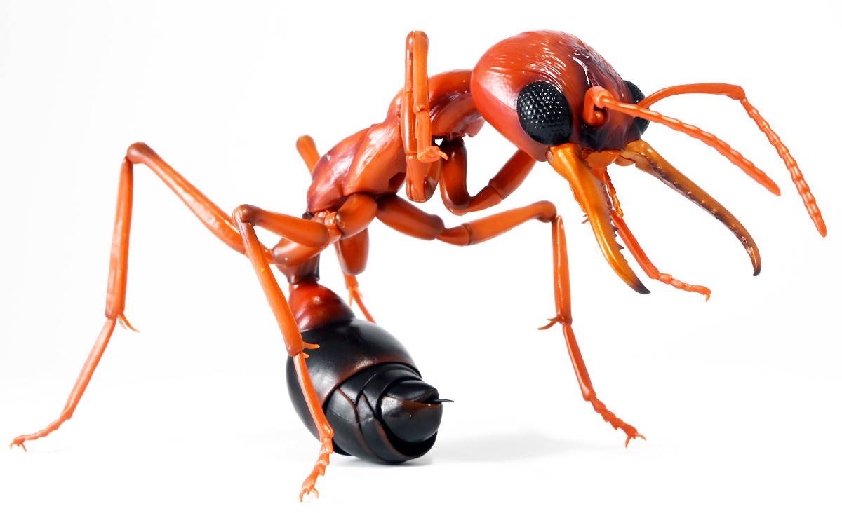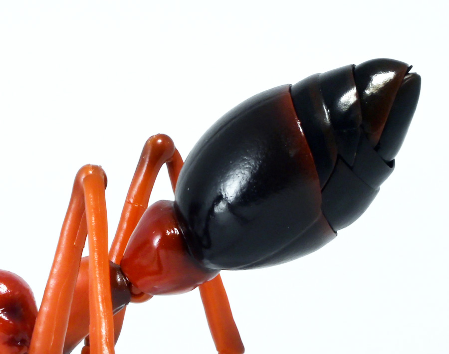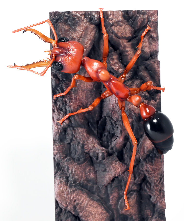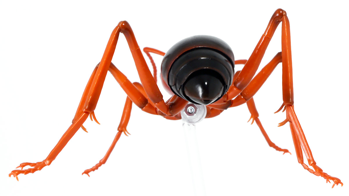 ■バンダイ いきもの大図鑑アドバンス ブルドッグアリ 樹皮台座(中)セット ブルドックアリ(レッド) ![]() バンダイより、ガシャポンオンラインで限定販売された一回1800円ガチャ(+送料) 2025年9月26日〜10月30日まで受注、 2026年1月30日着弾でした。 ![]() ラインナップは全てブルドッグアリ! オンライン版は「ブラック」、「レッド」、そして黒赤カラーの「ミックス」、3種のカラバリがラインナップ。 このうち「ミックス」のみオンライン限定カラーとなっているぞよ。 また、オンラインだけのおまけとして「樹皮台座(中)」が付属する。 ガチャ筐体向けの一般販売版は一回1500円で「アシナガバチ」と混在ラインナップの膜翅目特集となっており、 「キアシナガバチ」、「セグロアシナガバチ」、ブルドッグアリ「ブラック」、「レッド」の全4種となっていました。 つまり、オンライン版では+300円する代わりにハチとアリが選べるうえに限定カラーあり。 更に豪華台座も付属したと言う事だ! ![]() 何が出てもブルドッグアリなので気軽に回せるぞよね! って事で今回は「レッド」カラーが当たりました。 大当たりは頭とお腹が黒く、胸が赤黒のオンライン限定カラー「ミックス」なのだが・・・ わたくしとしては今回黒よりは赤いアリが欲しかったのでまぁ良いだろう・・・!! ![]() おろかなにんげんどもにも身近な昆虫、蟻。 黒くて小さなアリさんと言えばそこら中をちょろちょろしているぞよね! この日本には8亜科56属273種くらいのアリが棲んでいると言われているぞよ! 中でもポピュラーな国内最大種のクロオオアリはオオアリ属、クロヤマアリはヤマアリ属といった具合だが、 本商品のモチーフである「ブルドッグアリ」はキバハリアリ属(ミルメシア)に分類される。 キバハリアリは原始的なハリアリがオーストラリア大陸に隔離され、 古くに分化したものの末裔であるぞよ。 言わば有袋類のアリバージョンってトコぞよね! オーストラリア全土とその沿岸の島々に少なくとも93種が知られており、 全ての種で大きな複眼と細長く立派な大顎、 そして、有剣類の武器である産卵管が変化してできた毒針を持っているぞよ。 ![]() 本弾では全てが「ブルドッグアリ」と呼ばれている。 ブルドッグアリとは英名の「Bulldog ants」を直訳したもので、 ホントの学名は「キバハリアリ(Myrmecia)」であるぞよ。 そして「ブラック」、「レッド」、「ミックス」と言うのは単に玩具のカラーの紹介である。 前述したとおり、キバハリアリは93種くらい知られており、 全ての種でおめめがでっかく立派な大顎を持つという形質は共通しているからして、 シルエットが似ているぞよ。 従って原型を使いまわしてカラバリで複数種を表現すると言う事も出来るワケです。 それではこの「レッド」カラーに合致する、 全体に赤くて腹部が黒い種は果たして何なのかという事であるが、 ま〜わたくしにも詳しい事はよくわからんが・・・ オーストラリア東部クイーンズランド州、ニューサウスウェールズ州、 ビクトリア州、オーストラリア首都特別地域にのみ見られるという 「ブレビノダ(Myrmecia brevinoda)」などはそっくりであるぞよ。 これは女王で4センチ、働きアリでは3.7センチに達する最大種である。 他に西オーストラリア州と南オーストラリア州に分布する「Myrmecia pavida」なども似ている。 体の赤いキバハリアリには「グローサキバハリアリ(Myrmecia gulosa)」もいて都市部でも普通に見られ、 ペットとしても多く出回ると言うが、 これと本商品を比べると、腹部の色分けが少し違っており、やはりブレビノダにより近い。 何れにしても有名なのはオオキバハリアリ亜属に含まれるキバハリアリっぽいぞよ。 ![]() オーストラリアに跳梁するキバハリアリは草原、森林、ヒース荒地、市街地などなど、 至る所の地中に巣を作る。 アリの中ではもっとも原始的な部類で、働きアリは単独で仕事をするぞよ。 つまり、フェロモンで仲間を誘引して餌を探すと言う事をしない。 一方で、縄張りの警戒時にはフェロモンを用いて仲間で一斉に敵を攻撃すると言う事もあるようだ。 多くは昼行性で、暖かい時期に活動し、冬は休眠する。 幼虫は肉食だが、成虫はやはり花や樹液などの蜜を吸う。 働きアリが栄養卵を産む事でも知られており、つまり、働きアリが産んだ卵を女王と幼虫が食べる事で栄養を得るぞよ。 そして、食うものが無いと幼虫同士も共食いをする。 なんと獰猛な性質だが、全てのアリは真社会性昆虫であるからして、 全員が巣の為に役割を持って働いているから、個の事などどうでも良いのだ。 ![]() キバハリアリは昆虫界でも屈指の毒性の高い毒針を持つ。 刺されると鋭い痛みが長く続く強力な武器であるぞよ。 この針には返しが無く、何度も何度も敵を繰り返し刺す事が出来る。 基本的には臆病な性質で、ちょっかいを出しても逃げ出して追いかけてこないくらいであるが、 一度巣を弄られると激怒して軍勢となって襲い掛かって