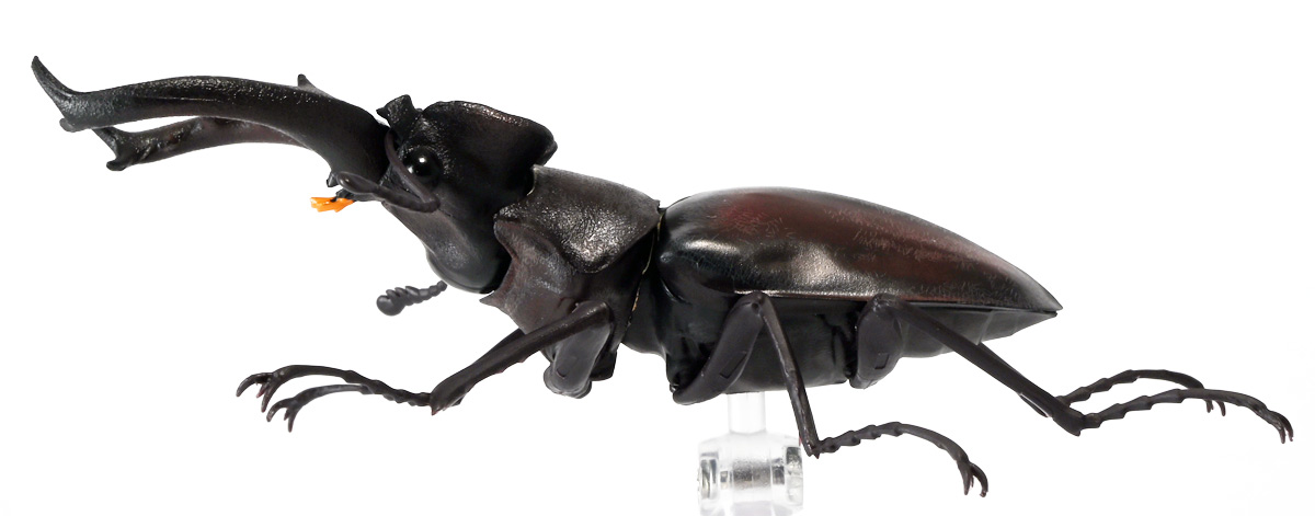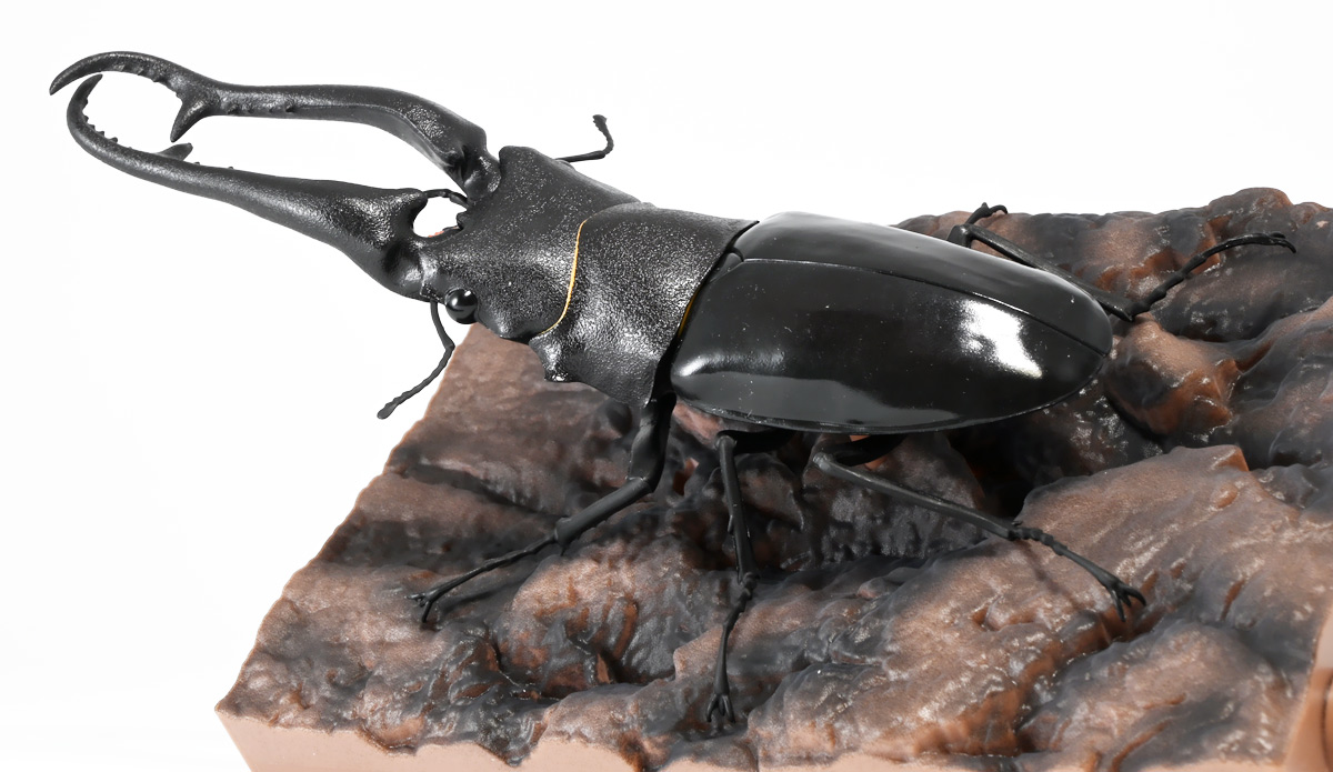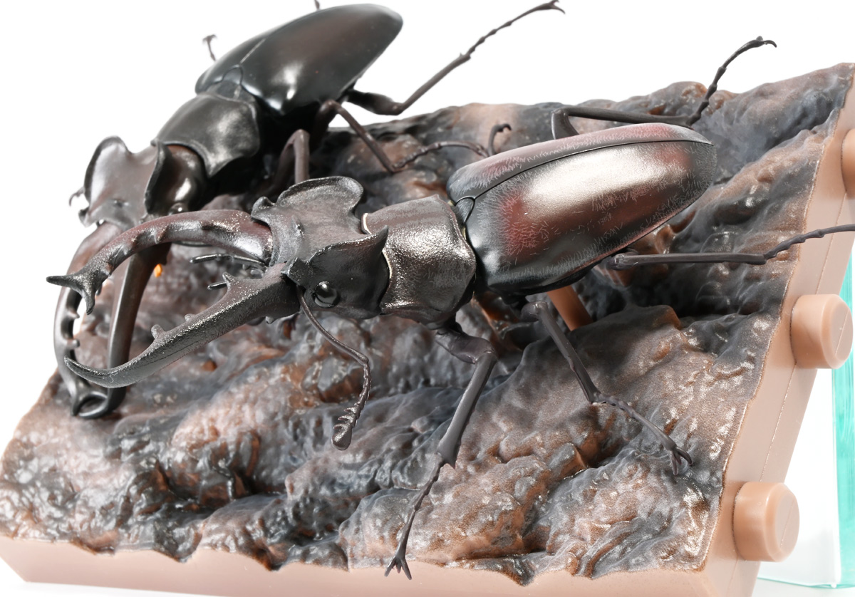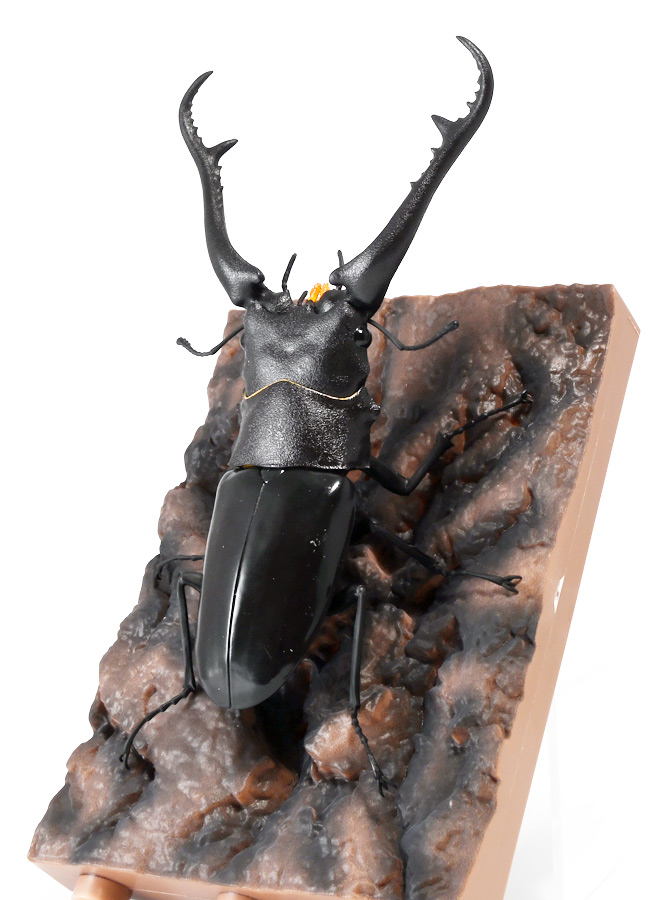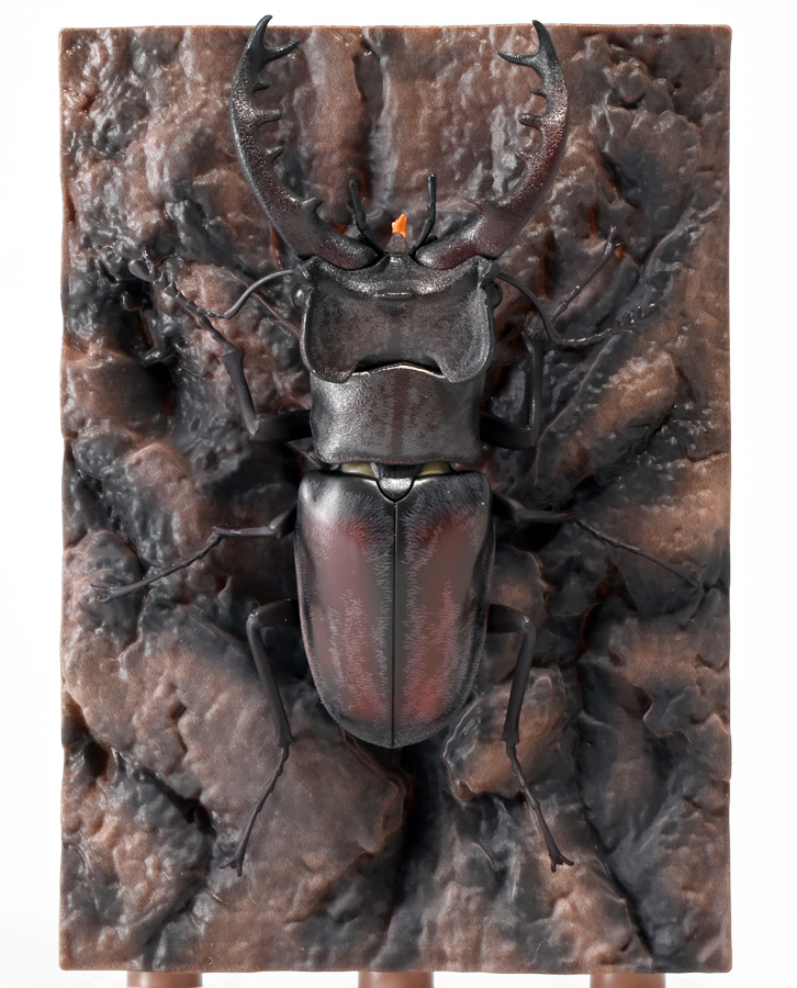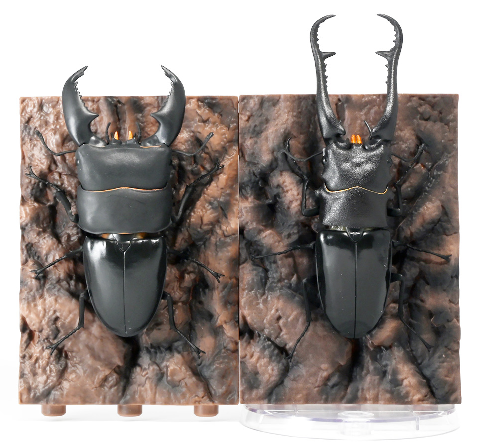 ■バンダイ いきもの大図鑑 くわがた11 樹皮台座(小)セット ギラファノコギリクワガタ(ダイスケイ) ![]() ガシャポンオンライン限定の一回650円ガチャ(+送料)。 2025年9月30日〜11月10日受注、2026年1月30日着弾でした。 ![]() ラインナップは「ギラファノコギリクワガタ(ケイスケイ)」、「ギラファノコギリクワガタ(ダイスケイ)」、 「サバゲノコギリクワガタ」、「ミヤマクワガタ(新色)」、 「ノコギリクワガタ幼虫(新色)」となっており、当選確率は全て20%均一アソート。 このうちノコギリクワガタ幼虫のみオンライン限定となっており、 一般販売の自販機筐体版では「コンフキウスノコギリクワガタ」が代わりにラインナップされているぞよ。 また、実機版は500円であるのに対し、 オンライン版は650円で、幼虫を除くラインナップに「樹皮台座(小)」がおまけに付く違いがある。 ![]() 従って、オンラインを回す人は全員幼虫狙いとなるのだが・・・ おっと・・・今回の中身は「ギラファノコギリクワガタ(ダイスケイ)」だったぞよ。 ギラファは2種封入で確率40%を占めており、彩色箇所も少ないのでハズレ枠。 ハズレが人気のギラファとは豪華な弾であるぞよ! ![]() 東南アジアに広く分布するギラファノコギリクワガタは「giraffa」、 つまりキリンの名を冠された通り、世界最長クラスのクワガタムシであるぞよ! 多様なノコギリクワガタ属(Prosopocoilus)の中でギラファノコギリクワガタは9亜種知られており、 今回はフィリピンのネグロス島、バナイ島、シブヤン島などで見られる「ダイスケイ」と、 インドネシアのロンボック島、スンバワ島、サンゲアン島、フローレンス島、スンバ島などで見られる「ケイスケイ」 2亜種が一部造形違いでラインナップされているぞよ。 ![]() 学名は記載した水沼哲郎氏が長男・次男に献名したものである。 このうち、ケイスケイはギラファノコギリクワガタの最大種であり、全長は12.2センチにも達すると言う。 ダイスケイも負けておらず、11.94センチの記録を持つぞよ。 ![]() さて、ギラファノコギリクワガタと言えば大人気のクワガタで玩具も様々登場しており、 過去にもアニアレビュー辺りで何度か取り上げているのでさくっと進めよう! 「いきもの大図鑑」においてギラファはやはり過去に幾度かラインナップされており、 初弾となる「くわがた(2020年10月)」から真っ先に登場。 この時は玩具然としていたが、 2023年8月には「いきもの大図鑑プレミアム ギラファノコギリクワガタ」として7700円の超豪華決定版が発売されている。 その後、「いきもの大図鑑アドバンス ギラファノコギリクワガタとマンディブラリスフタマタクワガタ(2025年2月)」 では廉価版ながら飛行形態を備えたアドバンスバージョンとして再登場し、 さらに今回は500円の簡易仕様となって三度登場したと言う流れであるぞよ。 ![]() プレミアム以降のギラファでは実物標本からのCTスキャンを原型に用いている事がウリで、 造形は本物に正確であるぞよ。 更に、プレミアムでは18.5センチ、 アドバンスでは16.5センチと超絶拡大模型だったが、本商品はより小さく、 全長は約14.5センチ! やはり本物よりは大きいが、掌に乗せた時の存在感ではかなりリアルな塩梅となっているのだ! ![]() ぱっと見の再現度では標本と見紛う仕上がりだが、一方で可動域は大幅に減らされており、 可動箇所は12箇所の簡易仕様。 飛行形態に変形できず、腹部のくにくに可動もオミットされてしまったぞよ。 従ってプレミアム、アドバンスは上位版として一定の地位を保っていると言える。 500円弾は繊細な部分が固定なので破損を気にせず気軽の弄繰り回せるのが嬉しいぞよね! ![]() 沢山わちゃわちゃ並べるならこの500円弾が取り回しやすくコレクション性も高いのです! ![]() オンライン限定の樹皮台座に乗せてみよう! こちらはシリーズではお馴染みとなった共通仕様でいつものやつだ。 ![]() 簡易可動とは言え、自慢の大顎の動きは健在! 本弾では大顎の接続がダブルボールジョイントとなり、 よりリアルでスムーズな動きが可能となっているぞよ。 ![]() さらに過去弾で見られた頭部、胸部のざらざら加工も受け継がれている。 いきもの大図鑑あるある、受注時の見本画像と製品で全然仕様が違う・・・! 見本時はつるつるだったものが、製品ではざらざらになっているワケです。 こりゃ見本を見て回す我々からしたら実際の製品と仕様が異なると言うのは厄介な点でもあるのですが・・・ ことざらざら加工に関しては、わたくしはクワガタの雰囲気を良く再現出来ていると好感を持っているので アリとしたい・・・! 彩色がグレードダウンしている場合は勿論ナシであるぞよ・・・! ![]() 樹皮台座は過去弾と連結可能! 樹上の対決を再現しようっ! ![]() 更に汎用台座のベースと合体する事で立てて飾る事も出来ちゃいます。 リアルな「樹」がキミのお部屋にやってくる! いきもの大図鑑は環境ごと飾るフェーズに突入しているのだ・・・!!! ![]() 縦だけ