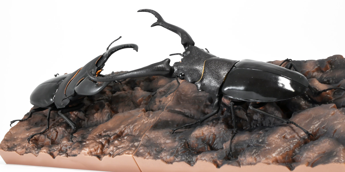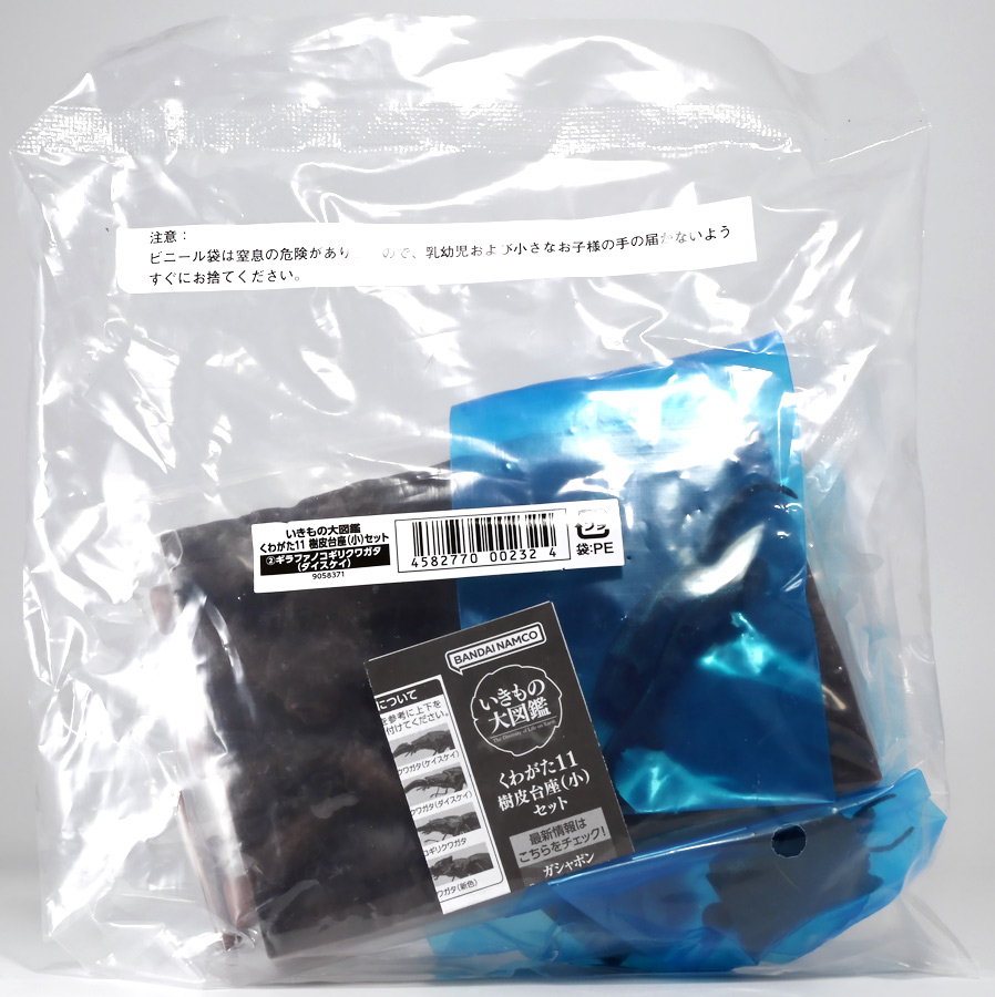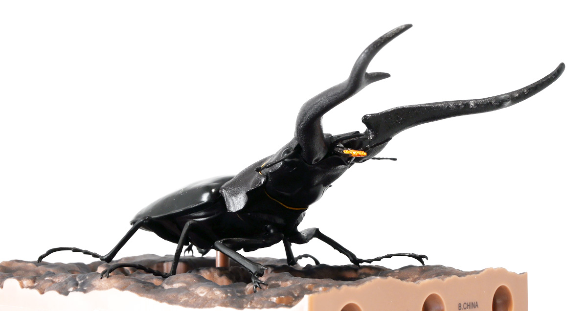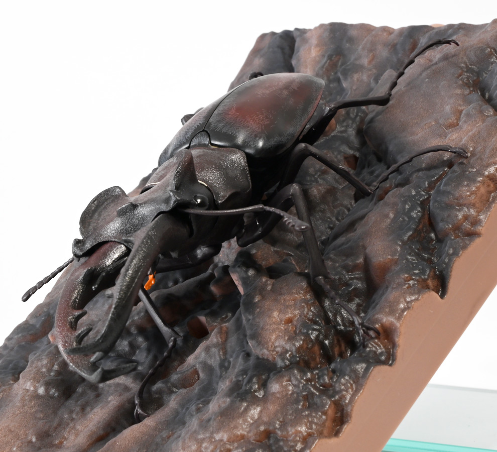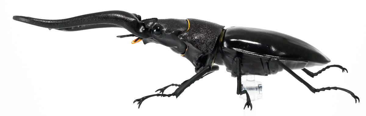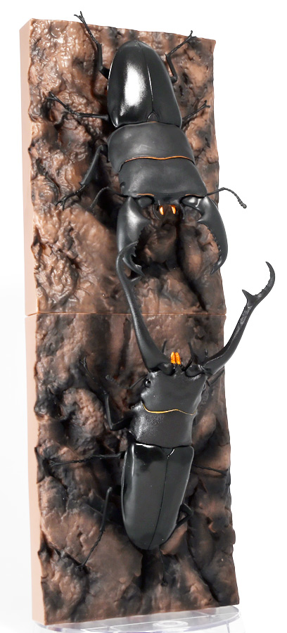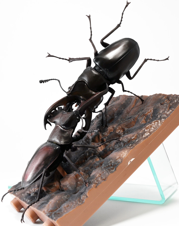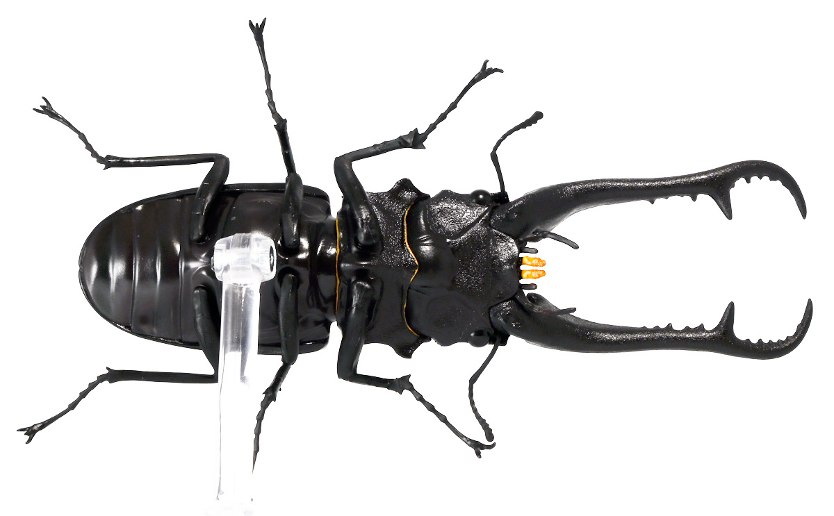 ■バンダイ いきもの大図鑑 くわがた11 樹皮台座(小)セット ギラファノコギリクワガタ(ダイスケイ) ![]() ガシャポンオンライン限定の一回650円ガチャ(+送料)。 2025年9月30日〜11月10日受注、2026年1月30日着弾でした。 ![]() ラインナップは「ギラファノコギリクワガタ(ケイスケイ)」、「ギラファノコギリクワガタ(ダイスケイ)」、 「サバゲノコギリクワガタ」、「ミヤマクワガタ(新色)」、 「ノコギリクワガタ幼虫(新色)」となっており、当選確率は全て20%均一アソート。 このうちノコギリクワガタ幼虫のみオンライン限定となっており、 一般販売の自販機筐体版では「コンフキウスノコギリクワガタ」が代わりにラインナップされているぞよ。 また、実機版は500円であるのに対し、 オンライン版は650円で、幼虫を除くラインナップに「樹皮台座(小)」がおまけに付く違いがある。 ![]() 従って、オンラインを回す人は全員幼虫狙いとなるのだが・・・ おっと・・・今回の中身は「ギラファノコギリクワガタ(ダイスケイ)」だったぞよ。 ギラファは2種封入で確率40%を占めており、彩色箇所も少ないのでハズレ枠。 ハズレが人気のギラファとは豪華な弾であるぞよ! ![]() 東南アジアに広く分布するギラファノコギリクワガタは「giraffa」、 つまりキリンの名を冠された通り、世界最長クラスのクワガタムシであるぞよ! 多様なノコギリクワガタ属(Prosopocoilus)の中でギラファノコギリクワガタは9亜種知られており、 今回はフィリピンのネグロス島、バナイ島、シブヤン島などで見られる「ダイスケイ」と、 インドネシアのロンボック島、スンバワ島、サンゲアン島、フローレンス島、スンバ島などで見られる「ケイスケイ」 2亜種が一部造形違いでラインナップされているぞよ。 ![]() 学名は記載した水沼哲郎氏が長男・次男に献名したものである。 このうち、ケイスケイはギラファノコギリクワガタの最大種であり、全長は12.2センチにも達すると言う。 ダイスケイも負けておらず、11.94センチの記録を持つぞよ。 ![]() さて、ギラファノコギリクワガタと言えば大人気のクワガタで玩具も様々登場しており、 過去にもアニアレビュー辺りで何度か取り上げているのでさくっと進めよう! 「いきもの大図鑑」においてギラファはやはり過去に幾度かラインナップされており、 初弾となる「くわがた(2020年10月)」から真っ先に登場。 この時は玩具然としていたが、 2023年8月には「いきもの大図鑑プレミアム ギラファノコギリクワガタ」として7700円の超豪華決定版が発売されている。 その後、「いきもの大図鑑アドバンス ギラファノコギリクワガタとマンディブラリスフタマタクワガタ(2025年2月)」 では廉価版ながら飛行形態を備えたアドバンスバージョンとして再登場し、 さらに今回は500円の簡易仕様となって三度登場したと言う流れであるぞよ。 ![]() プレミアム以降のギラファでは実物標本からのCTスキャンを原型に用いている事がウリで、 造形は本物に正確であるぞよ。 更に、プレミアムでは18.5センチ、 アドバンスでは16.5センチと超絶拡大模型だったが、本商品はより小さく、 全長は約14.5センチ! やはり本物よりは大きいが、掌に乗せた時の存在感ではかなりリアルな塩梅となっているのだ! ![]() ぱっと見の再現度では標本と見紛う仕上がりだが、一方で可動域は大幅に減らされており、 可動箇所は12箇所の簡易仕様。 飛行形態に変形できず、腹部のくにくに可動もオミットされてしまったぞよ。 従ってプレミアム、アドバンスは上位版として一定の地位を保っていると言える。 500円弾は繊細な部分が固定なので破損を気にせず気軽の弄繰り回せるのが嬉しいぞよね! ![]() 沢山わちゃわちゃ並べるならこの500円弾が取り回しやすくコレクション性も高いのです! ![]() オンライン限定の樹皮台座に乗せてみよう! こちらはシリーズではお馴染みとなった共通仕様でいつものやつだ。 ![]() 簡易可動とは言え、自慢の大顎の動きは健在! 本弾では大顎の接続がダブルボールジョイントとなり、 よりリアルでスムーズな動きが可能となっているぞよ。 ![]() さらに過去弾で見られた頭部、胸部のざらざら加工も受け継がれている。 いきもの大図鑑あるある、受注時の見本画像と製品で全然仕様が違う・・・! 見本時はつるつるだったものが、製品ではざらざらになっているワケです。 こりゃ見本を見て回す我々からしたら実際の製品と仕様が異なると言うのは厄介な点でもあるのですが・・・ ことざらざら加工に関しては、わたくしはクワガタの雰囲気を良く再現出来ていると好感を持っているので アリとしたい・・・! 彩色がグレードダウンしている場合は勿論ナシであるぞよ・・・! ![]() 樹皮台座は過去弾と連結可能! 樹上の対決を再現しようっ! ![]() 更に汎用台座のベースと合体する事で立てて飾る事も出来ちゃいます。 リアルな「樹」がキミのお部屋にやってくる! いきもの大図鑑は環境ごと飾るフェーズに突入しているのだ・・・!!! ![]() 縦だけ