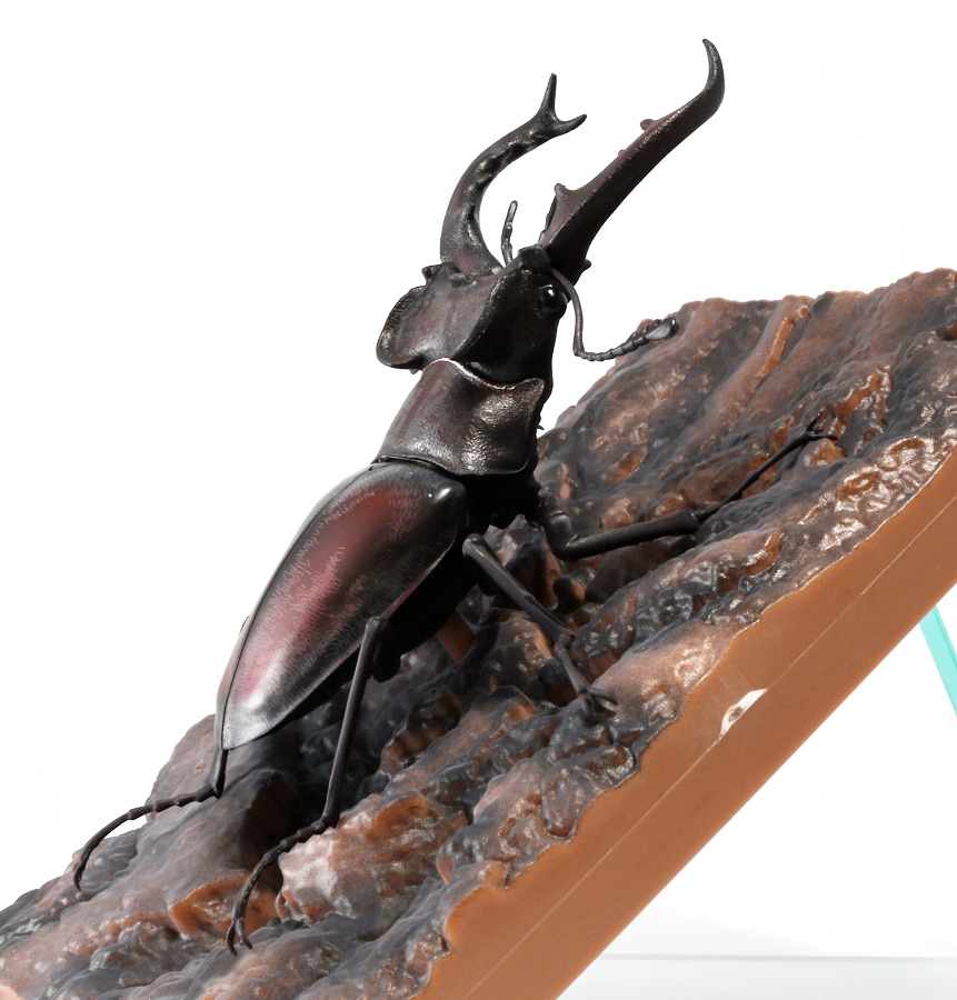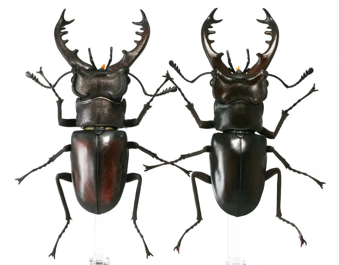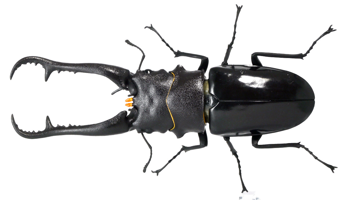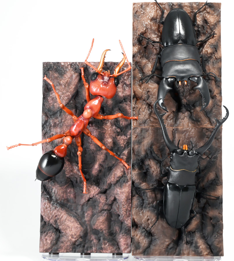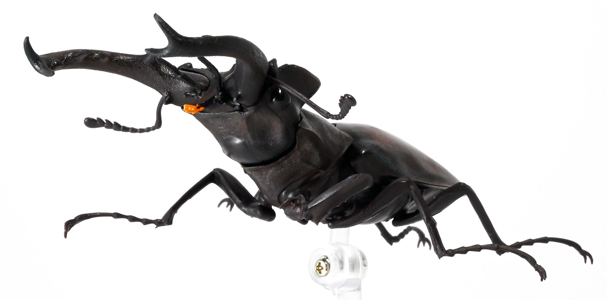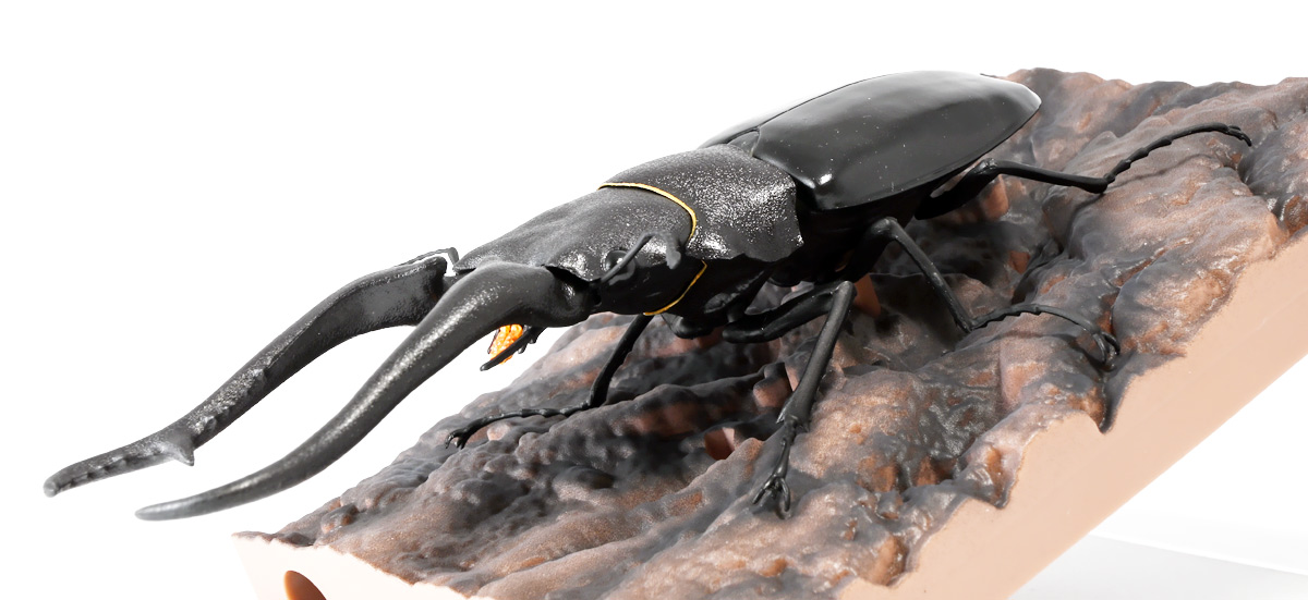 ■バンダイ いきもの大図鑑 くわがた11 樹皮台座(小)セット ギラファノコギリクワガタ(ダイスケイ) ![]() ガシャポンオンライン限定の一回650円ガチャ(+送料)。 2025年9月30日〜11月10日受注、2026年1月30日着弾でした。 ![]() ラインナップは「ギラファノコギリクワガタ(ケイスケイ)」、「ギラファノコギリクワガタ(ダイスケイ)」、 「サバゲノコギリクワガタ」、「ミヤマクワガタ(新色)」、 「ノコギリクワガタ幼虫(新色)」となっており、当選確率は全て20%均一アソート。 このうちノコギリクワガタ幼虫のみオンライン限定となっており、 一般販売の自販機筐体版では「コンフキウスノコギリクワガタ」が代わりにラインナップされているぞよ。 また、実機版は500円であるのに対し、 オンライン版は650円で、幼虫を除くラインナップに「樹皮台座(小)」がおまけに付く違いがある。 ![]() 従って、オンラインを回す人は全員幼虫狙いとなるのだが・・・ おっと・・・今回の中身は「ギラファノコギリクワガタ(ダイスケイ)」だったぞよ。 ギラファは2種封入で確率40%を占めており、彩色箇所も少ないのでハズレ枠。 ハズレが人気のギラファとは豪華な弾であるぞよ! ![]() 東南アジアに広く分布するギラファノコギリクワガタは「giraffa」、 つまりキリンの名を冠された通り、世界最長クラスのクワガタムシであるぞよ! 多様なノコギリクワガタ属(Prosopocoilus)の中でギラファノコギリクワガタは9亜種知られており、 今回はフィリピンのネグロス島、バナイ島、シブヤン島などで見られる「ダイスケイ」と、 インドネシアのロンボック島、スンバワ島、サンゲアン島、フローレンス島、スンバ島などで見られる「ケイスケイ」 2亜種が一部造形違いでラインナップされているぞよ。 ![]() 学名は記載した水沼哲郎氏が長男・次男に献名したものである。 このうち、ケイスケイはギラファノコギリクワガタの最大種であり、全長は12.2センチにも達すると言う。 ダイスケイも負けておらず、11.94センチの記録を持つぞよ。 ![]() さて、ギラファノコギリクワガタと言えば大人気のクワガタで玩具も様々登場しており、 過去にもアニアレビュー辺りで何度か取り上げているのでさくっと進めよう! 「いきもの大図鑑」においてギラファはやはり過去に幾度かラインナップされており、 初弾となる「くわがた(2020年10月)」から真っ先に登場。 この時は玩具然としていたが、 2023年8月には「いきもの大図鑑プレミアム ギラファノコギリクワガタ」として7700円の超豪華決定版が発売されている。 その後、「いきもの大図鑑アドバンス ギラファノコギリクワガタとマンディブラリスフタマタクワガタ(2025年2月)」 では廉価版ながら飛行形態を備えたアドバンスバージョンとして再登場し、 さらに今回は500円の簡易仕様となって三度登場したと言う流れであるぞよ。 ![]() プレミアム以降のギラファでは実物標本からのCTスキャンを原型に用いている事がウリで、 造形は本物に正確であるぞよ。 更に、プレミアムでは18.5センチ、 アドバンスでは16.5センチと超絶拡大模型だったが、本商品はより小さく、 全長は約14.5センチ! やはり本物よりは大きいが、掌に乗せた時の存在感ではかなりリアルな塩梅となっているのだ! ![]() ぱっと見の再現度では標本と見紛う仕上がりだが、一方で可動域は大幅に減らされており、 可動箇所は12箇所の簡易仕様。 飛行形態に変形できず、腹部のくにくに可動もオミットされてしまったぞよ。 従ってプレミアム、アドバンスは上位版として一定の地位を保っていると言える。 500円弾は繊細な部分が固定なので破損を気にせず気軽の弄繰り回せるのが嬉しいぞよね! ![]() 沢山わちゃわちゃ並べるならこの500円弾が取り回しやすくコレクション性も高いのです! ![]() オンライン限定の樹皮台座に乗せてみよう! こちらはシリーズではお馴染みとなった共通仕様でいつものやつだ。 ![]() 簡易可動とは言え、自慢の大顎の動きは健在! 本弾では大顎の接続がダブルボールジョイントとなり、 よりリアルでスムーズな動きが可能となっているぞよ。 ![]() さらに過去弾で見られた頭部、胸部のざらざら加工も受け継がれている。 いきもの大図鑑あるある、受注時の見本画像と製品で全然仕様が違う・・・! 見本時はつるつるだったものが、製品ではざらざらになっているワケです。 こりゃ見本を見て回す我々からしたら実際の製品と仕様が異なると言うのは厄介な点でもあるのですが・・・ ことざらざら加工に関しては、わたくしはクワガタの雰囲気を良く再現出来ていると好感を持っているので アリとしたい・・・! 彩色がグレードダウンしている場合は勿論ナシであるぞよ・・・! ![]() 樹皮台座は過去弾と連結可能! 樹上の対決を再現しようっ! ![]() 更に汎用台座のベースと合体する事で立てて飾る事も出来ちゃいます。 リアルな「樹」がキミのお部屋にやってくる! いきもの大図鑑は環境ごと飾るフェーズに突入しているのだ・・・!!! ![]() 縦だけ