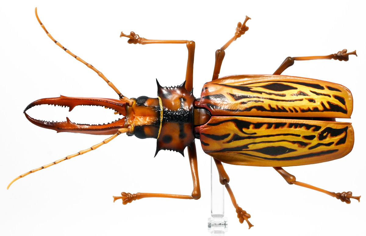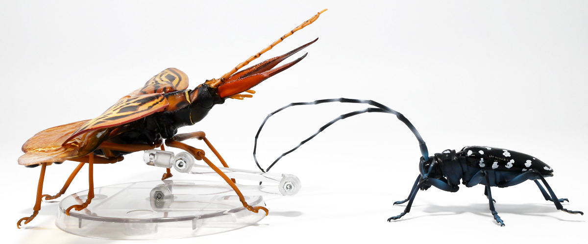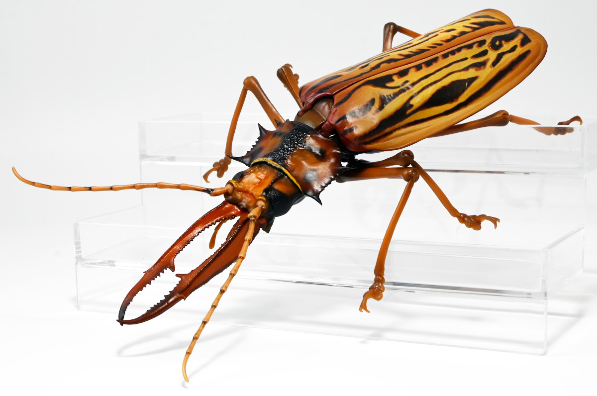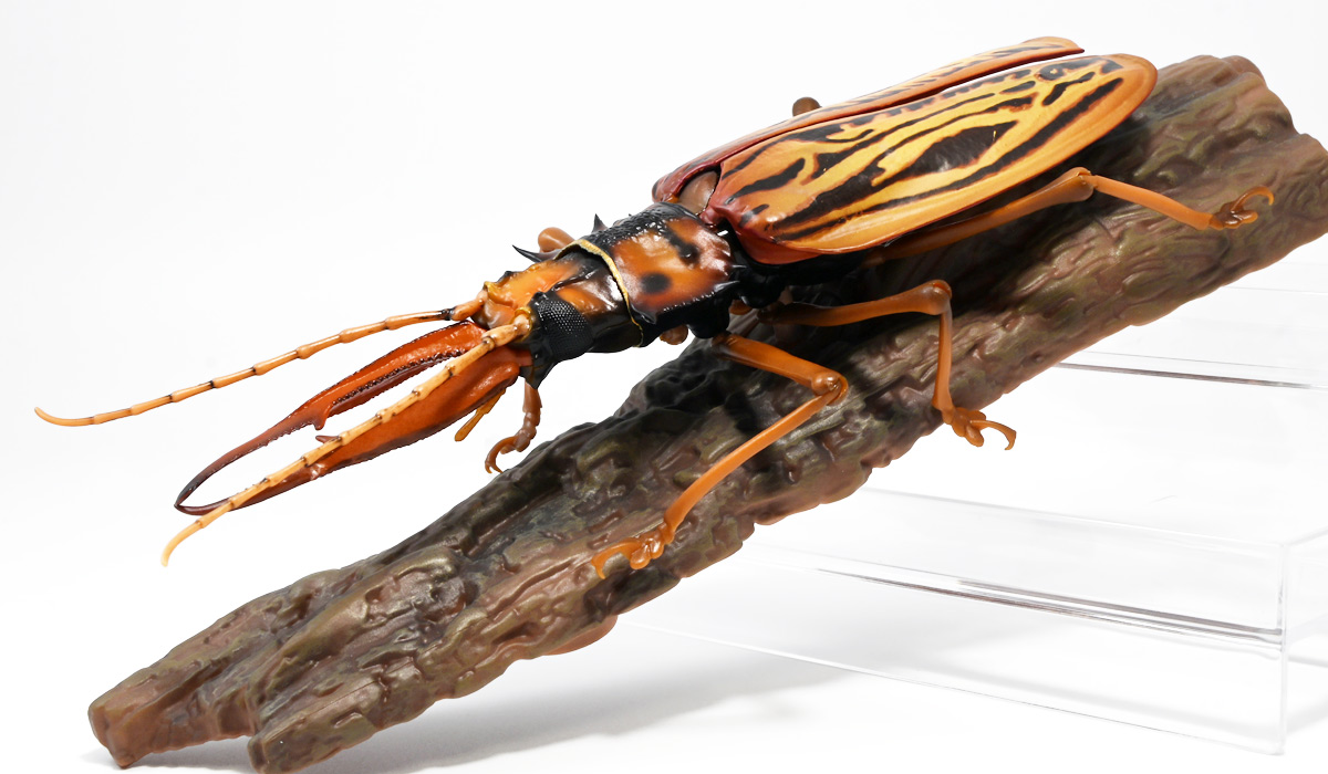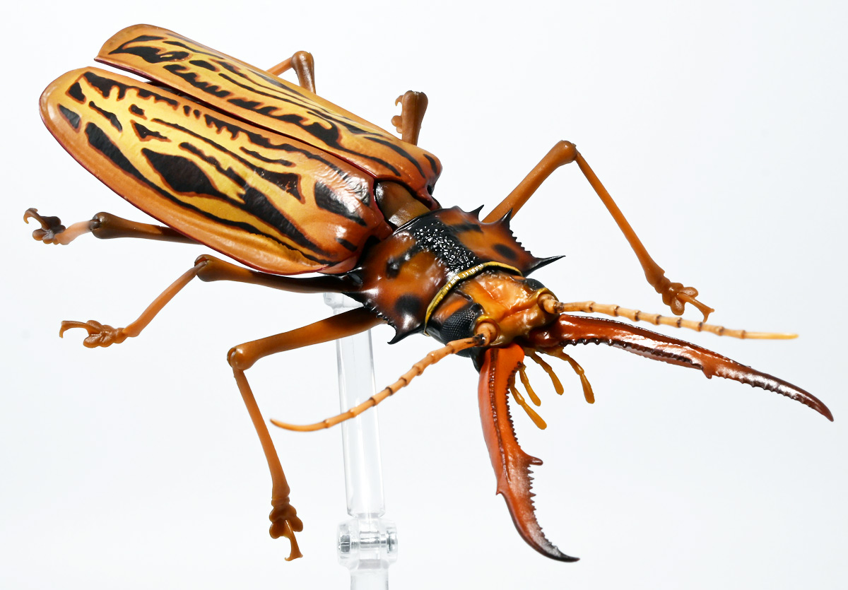■バンダイ いきもの大図鑑アドバンス オオキバウスバカミキリとハンミョウ オオキバウスバカミキリ(ライト) ![]() バンダイより2025年5月第4週登場のプレミアムガシャ。 大人気「いきもの大図鑑」シリーズのアドバンス弾ぞよね! 筐体版は一回1500円、ガシャポンオンライン版は一回1800円+送料で一部仕様が異なるぞよ。 ![]() ラインナップは「オオキバウスバカミキリ」が「ダーク」と「ライト」の二色。 「ハンミョウ」が「レッド」と「イエロー」の二色封入、全四種となっているぞよ。 ![]() パカっと開封! 虫のバラバラ死体が入っています・・・。 ![]() 今回もオンライン版は専用ディスプレイスタンド&後翅セットがおまけに付属するぞよ! 後翅は汎用性の無い本商品専用のものが入っている。 恐らくいつも通りだと後で筐体版用に別途500円でオンライン販売があると思われますが・・・ 最初から本商品をオンラインで買った方がややお得であるぞよ。 ![]() 組み立てる事で完成! おーっ! これは狙いの「オオキバウスバカミキリ」のライトカラー! 大当たりぞよーっ!! ![]() 本弾ラインナップ中、オオキバウスバカミキリは筐体版と明確に仕様が異なり、 オンライン版は前翅がやや長い個体で7.7センチバージョン。 筐体版はやや短い個体で7.2センチバージョンとなっているぞよ。 前翅パーツ以外はどちらも共通造形の模様。 ![]() さて、見るも異形のこの昆虫・・・ 恐らく虫にさっぱり興味のないおろかなにんげんどもは見た事も聞いた事もないであろう オオキバウスバカミキリとは鞘翅目カミキリムシ科の所謂巨大なカミキリムシであるぞよ! 成虫では全長15センチ〜時に17センチ以上にもなると言われ、 世界最大のカミキリムシであるタイタンオオウスバカミキリに匹敵するか、稀にはそれ以上にもなり得る巨大昆虫だ! ![]() ペルー〜フランス領ギアナ、アマゾン川流域、ブラジルの熱帯雨林に生息すると言われるこのカミキリムシは、 南アメリカ大陸最大の甲虫の一つと言われ、その見た目の格好良さと奇抜さに反してあまり研究が進んでいない昆虫でもあるぞよ。 その暮らしぶりや習性などは殆ど判明しておらず、 基本的には樹を伐採した時偶然見つけるか、灯火に飛んできたものを得るよりほかない。 これが為に標本はまず高額で取引されており、 おろかなにんげんどもは何とかこいつを捕まえて金に換えてやろうとするので、 元々希少なものが捕らえられ、また生息域の破壊も進み個体数は大きく減少していると言うぞよ。 そしてまた、カミキリムシと言えばこの日本では樹木を食害する害虫として良く知られており、 カミキリムシ類は農作物や樹木への影響を鑑みて生体の輸入が厳しく取り締まられているぞよ。 従って本種の生きた姿を国内で見る事は出来ない! 生きた研究材料がないのでは飼育方法を確立する事も生態を明らかにする事も出来ないからして、 本種について判っている事はごく少ないと言うワケなんです! ![]() 本種が個体数を減らす原因の一つとしては、食用になる事も上げられる。 なんでもパンヤ科(キワタ科)の軟らかい樹の中から発見されると言うオオキバウスバカミキリの幼虫は 極めて巨大かつ水分豊富な珍味として現地の人々の貴重なタンパク源になると言うのだ! 生焼けか蒸し焼き状態で食されると言い、これがクリーミーで実に美味いらしいんですね! カミキリムシのむちむちぷりぷりな幼虫を食うとは・・・うげげぞよーっ!! ・・・と言いたいところだが、カミキリムシの幼虫は美味として知られ、これを食う文化は世界中で見られる。 この日本でも「とっこむし」、「ごとうむし」、「鉄砲虫」などと呼び数十年前まで食う地域があったようだ。 その昔はおろかなにんげんどもは電気を持たず、薪などをエネルギーに使う事が多かったため、 薪割りの時などに中からカミキリムシの幼虫を見つける事が多く、おやつにちゅるんと食っていたのであろう。 また、滋養強壮の薬としても食されていたようである。 現代日本では薪割りなんてとんとやらなくなったのでこの文化は廃れてしまったが、 世界ではその限りでないと言う事ぞよね。 特にウスバカミキリ類の幼虫は中でも美味いと聞くが・・・ オオキバウスバカミキリの場合、生活史がよく判らんのではっきりとした事は言えんが、 成虫になるまで3年前後から10年かかると考えられているぞよ。 これを木の中からほじくり出して一日に五匹も十匹もちゅるんと食っていたのでは、 数を減らすのも納得であるぞよよよよ〜・・・! ![]() 生息地のギアナでは本種を指して「コーヒー蠅」と呼んでいる。 なんでもコーヒーの樹の間をブンブンと物凄い羽音を立てて飛び回り、その大顎で枝を切ってしまうというのだ! 現地の人々はこれがコーヒーの樹を害する害虫であると信じているが・・・ コーヒーばかりを狙って切り落とすと言うのは人々の勘違いで、本当のところは前述の通りパンヤの木を好むらしいぞよ。 オオキバウスバカミ