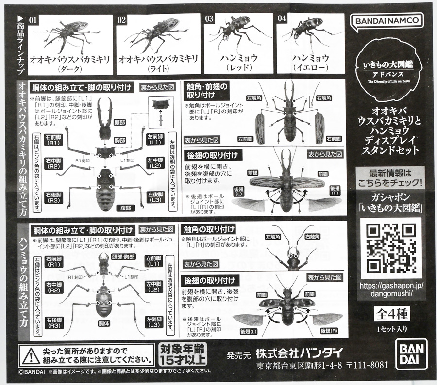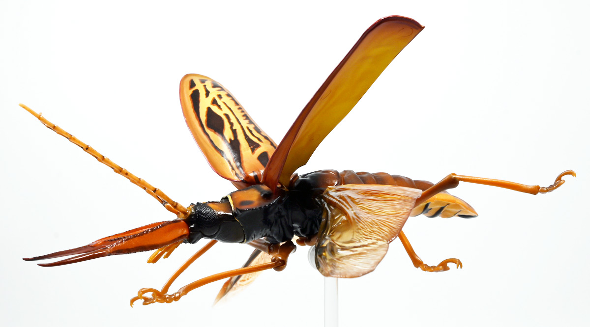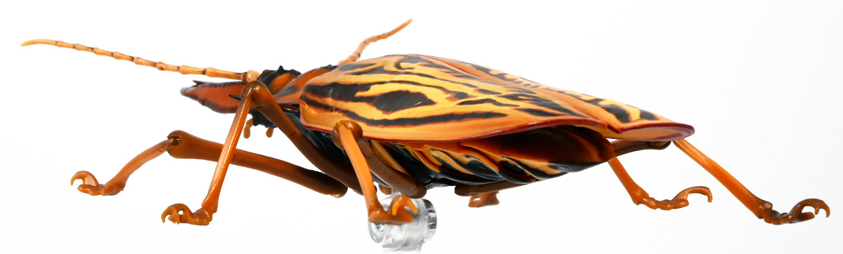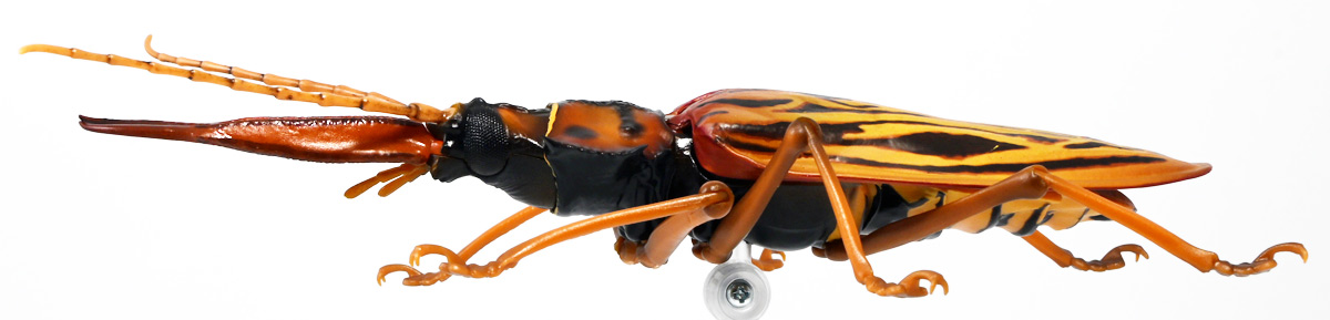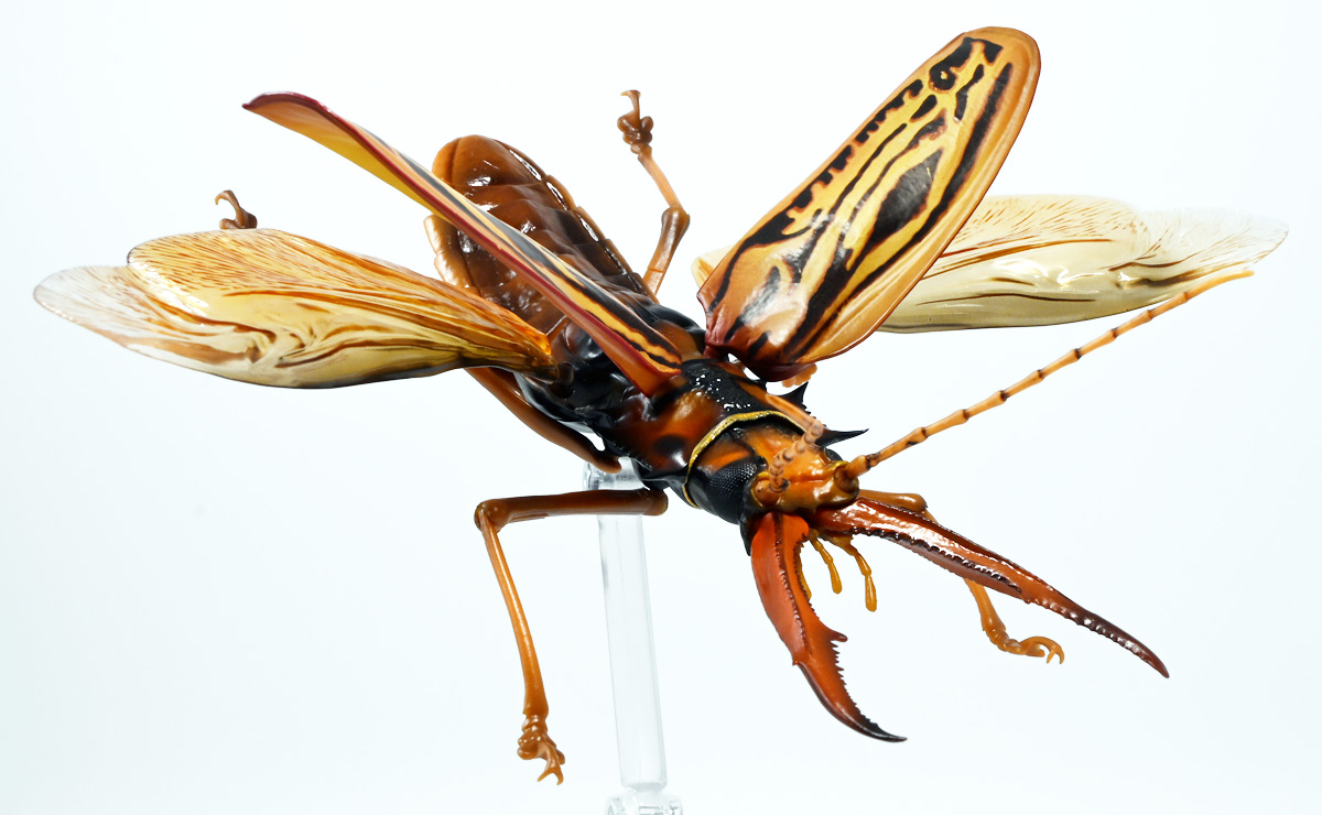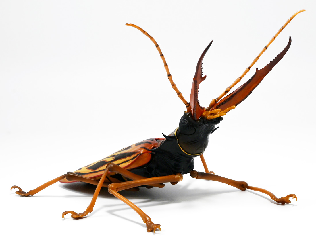 ■バンダイ いきもの大図鑑アドバンス オオキバウスバカミキリとハンミョウ オオキバウスバカミキリ(ライト) ![]() バンダイより2025年5月第4週登場のプレミアムガシャ。 大人気「いきもの大図鑑」シリーズのアドバンス弾ぞよね! 筐体版は一回1500円、ガシャポンオンライン版は一回1800円+送料で一部仕様が異なるぞよ。 ![]() ラインナップは「オオキバウスバカミキリ」が「ダーク」と「ライト」の二色。 「ハンミョウ」が「レッド」と「イエロー」の二色封入、全四種となっているぞよ。 ![]() パカっと開封! 虫のバラバラ死体が入っています・・・。 ![]() 今回もオンライン版は専用ディスプレイスタンド&後翅セットがおまけに付属するぞよ! 後翅は汎用性の無い本商品専用のものが入っている。 恐らくいつも通りだと後で筐体版用に別途500円でオンライン販売があると思われますが・・・ 最初から本商品をオンラインで買った方がややお得であるぞよ。 ![]() 組み立てる事で完成! おーっ! これは狙いの「オオキバウスバカミキリ」のライトカラー! 大当たりぞよーっ!! ![]() 本弾ラインナップ中、オオキバウスバカミキリは筐体版と明確に仕様が異なり、 オンライン版は前翅がやや長い個体で7.7センチバージョン。 筐体版はやや短い個体で7.2センチバージョンとなっているぞよ。 前翅パーツ以外はどちらも共通造形の模様。 ![]() さて、見るも異形のこの昆虫・・・ 恐らく虫にさっぱり興味のないおろかなにんげんどもは見た事も聞いた事もないであろう オオキバウスバカミキリとは鞘翅目カミキリムシ科の所謂巨大なカミキリムシであるぞよ! 成虫では全長15センチ〜時に17センチ以上にもなると言われ、 世界最大のカミキリムシであるタイタンオオウスバカミキリに匹敵するか、稀にはそれ以上にもなり得る巨大昆虫だ! ![]() ペルー〜フランス領ギアナ、アマゾン川流域、ブラジルの熱帯雨林に生息すると言われるこのカミキリムシは、 南アメリカ大陸最大の甲虫の一つと言われ、その見た目の格好良さと奇抜さに反してあまり研究が進んでいない昆虫でもあるぞよ。 その暮らしぶりや習性などは殆ど判明しておらず、 基本的には樹を伐採した時偶然見つけるか、灯火に飛んできたものを得るよりほかない。 これが為に標本はまず高額で取引されており、 おろかなにんげんどもは何とかこいつを捕まえて金に換えてやろうとするので、 元々希少なものが捕らえられ、また生息域の破壊も進み個体数は大きく減少していると言うぞよ。 そしてまた、カミキリムシと言えばこの日本では樹木を食害する害虫として良く知られており、 カミキリムシ類は農作物や樹木への影響を鑑みて生体の輸入が厳しく取り締まられているぞよ。 従って本種の生きた姿を国内で見る事は出来ない! 生きた研究材料がないのでは飼育方法を確立する事も生態を明らかにする事も出来ないからして、 本種について判っている事はごく少ないと言うワケなんです! ![]() 本種が個体数を減らす原因の一つとしては、食用になる事も上げられる。 なんでもパンヤ科(キワタ科)の軟らかい樹の中から発見されると言うオオキバウスバカミキリの幼虫は 極めて巨大かつ水分豊富な珍味として現地の人々の貴重なタンパク源になると言うのだ! 生焼けか蒸し焼き状態で食されると言い、これがクリーミーで実に美味いらしいんですね! カミキリムシのむちむちぷりぷりな幼虫を食うとは・・・うげげぞよーっ!! ・・・と言いたいところだが、カミキリムシの幼虫は美味として知られ、これを食う文化は世界中で見られる。 この日本でも「とっこむし」、「ごとうむし」、「鉄砲虫」などと呼び数十年前まで食う地域があったようだ。 その昔はおろかなにんげんどもは電気を持たず、薪などをエネルギーに使う事が多かったため、 薪割りの時などに中からカミキリムシの幼虫を見つける事が多く、おやつにちゅるんと食っていたのであろう。 また、滋養強壮の薬としても食されていたようである。 現代日本では薪割りなんてとんとやらなくなったのでこの文化は廃れてしまったが、 世界ではその限りでないと言う事ぞよね。 特にウスバカミキリ類の幼虫は中でも美味いと聞くが・・・ オオキバウスバカミキリの場合、生活史がよく判らんのではっきりとした事は言えんが、 成虫になるまで3年前後から10年かかると考えられているぞよ。 これを木の中からほじくり出して一日に五匹も十匹もちゅるんと食っていたのでは、 数を減らすのも納得であるぞよよよよ〜・・・! ![]() 生息地のギアナでは本種を指して「コーヒー蠅」と呼んでいる。 なんでもコーヒーの樹の間をブンブンと物凄い羽音を立てて飛び回り、その大顎で枝を切ってしまうというのだ! 現地の人々はこれがコーヒーの樹を害する害虫であると信じているが・・・ コーヒーばかりを狙って切り落とすと言うのは人々の勘違いで、本当のところは前述の通りパンヤの木を好むらしいぞよ。 オオキバウスバカミ