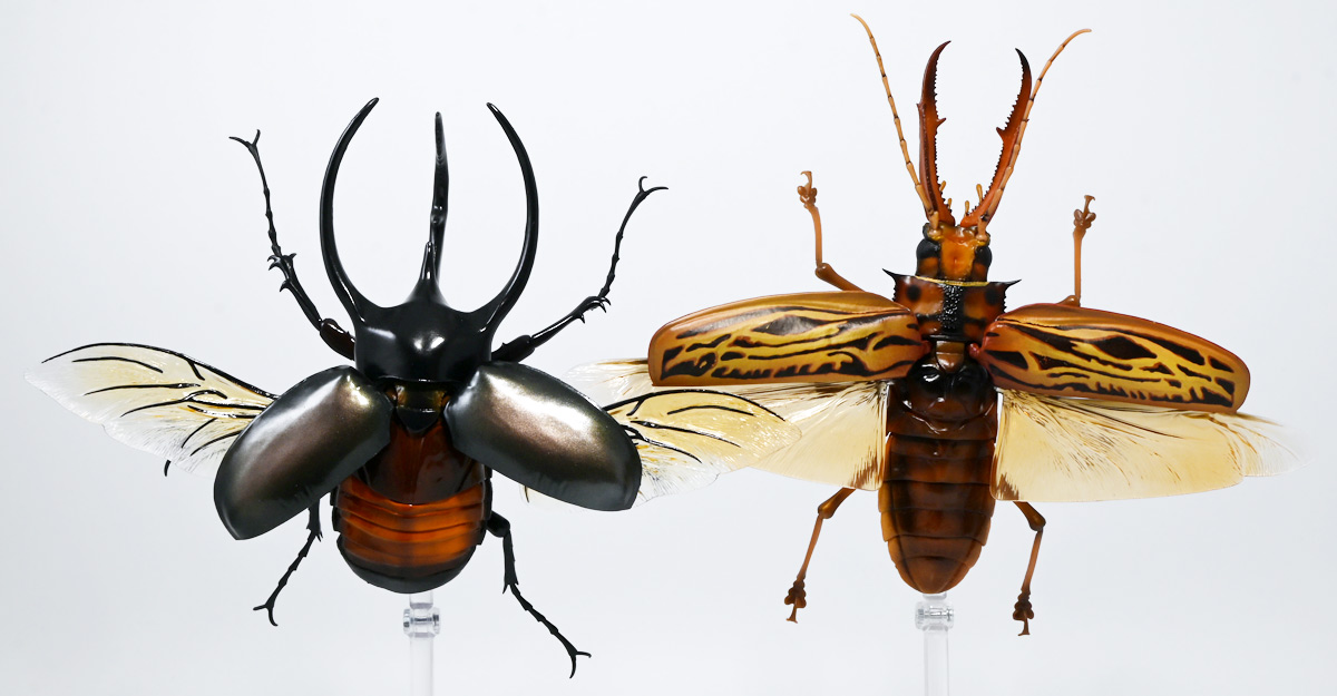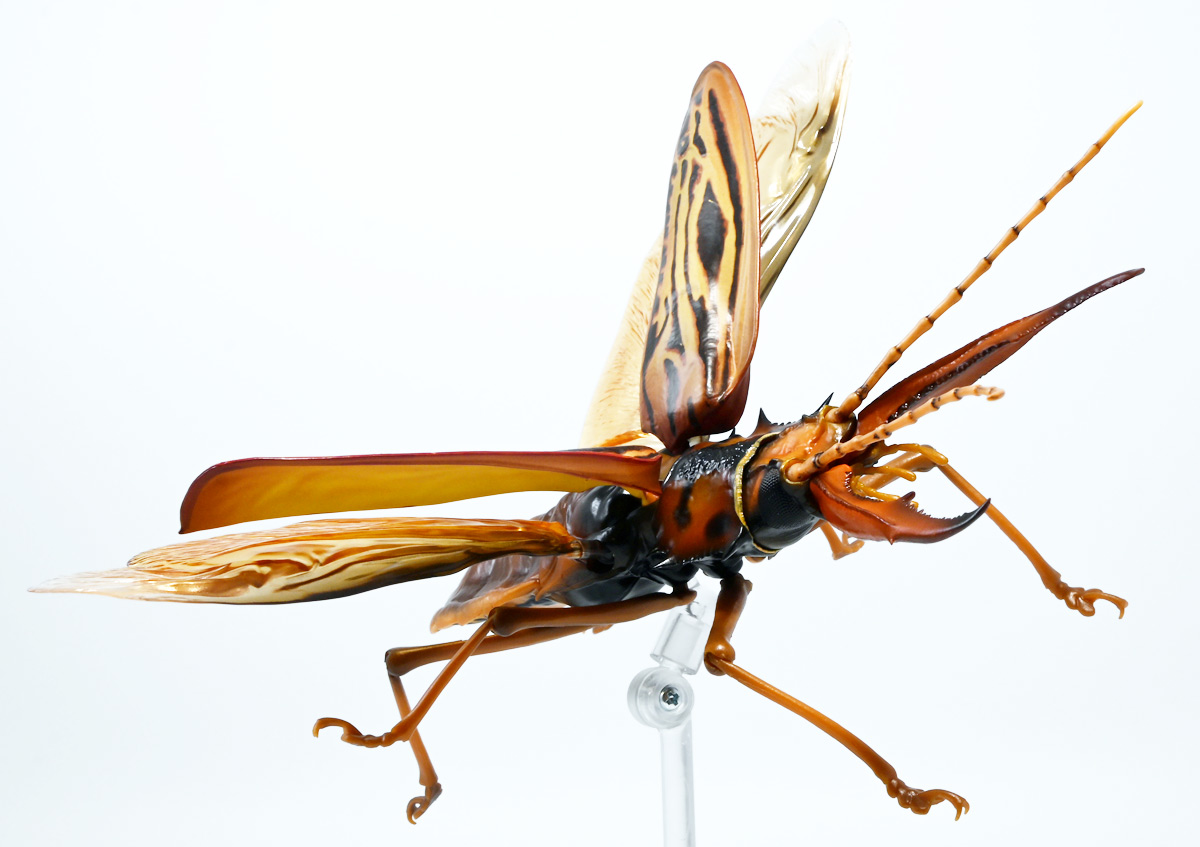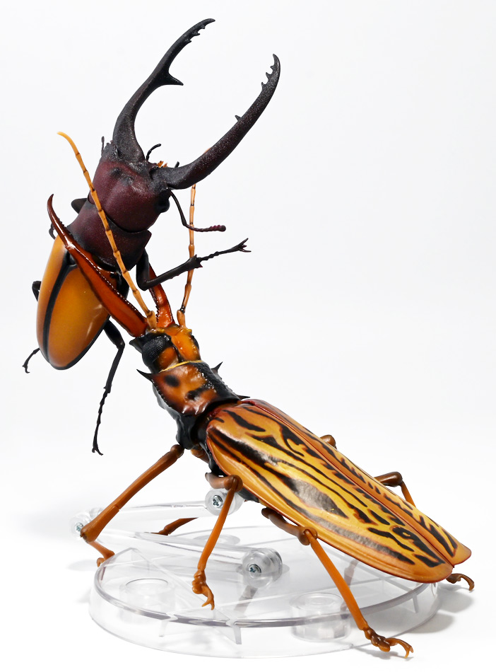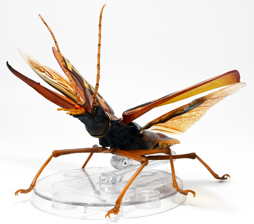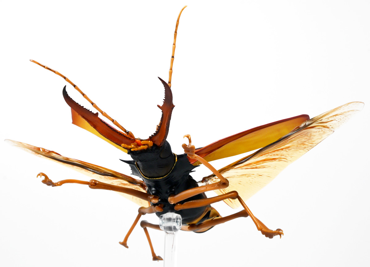 ■バンダイ いきもの大図鑑アドバンス コーカサスオオカブト コーカサスオオカブト(ジャワ島) ![]() バンダイより、2025年4月登場のプレミアムガシャ。 実機は第3週登場で一回1500円。 「ガシャポンオンライン」では先行予約後、第4週発送で一回1800円+送料となり、 本体に加えて専用ディスプレイスタンド&後翅セットがおまけ封入されているぞよ。 今回紹介するのはオンライン版となる。 ![]() ラインナップは「コーカサスオオカブト」が「ジャワ島」、「スマトラ」の産地別に二種。 加えて「モーレンカンプオオカブト」が入った全三種となっている。 どれを引いてもカルコソマ属の三本角オオカブトなので摘みやすいぞよね! 毎回こんなラインナップにしてくれぞよーっ!! ![]() それでは開封ぞよ! 虫のばらばら死体が袋詰めで入っています。 いつもの事だけどジョイントは結構固めなのでドライヤーで温めながら組み立てると容易に組み上がるぞよ。 なんかたまにジョイントの方を温めているおろかなにんげぇ〜んがいるようだが・・・ 普通に考えて温めるのはメス側、穴の方ぞよね!? 知恵を使えぞよ〜。 ![]() おまけで汎用ディスプレイスタンドと後翅セットが付属します。 毎度お馴染みいつものヤツだ。 台座も大後翅ももういっぱい持ってるので無くても別に良いのだが・・・ やっぱりあると便利なんですよ〜。 ![]() 組み立てて完成! おっと・・・これは・・・ジャワ島産のコーカサスオオカブト、所謂ジャワコーカサスだ!! 本弾中でも特に彩色が渋い雰囲気、かつ胸部の淵が唯一彩色されており色数が多い為、 最も豪華な仕様と言える大当たりラインナップ! やったぞよーっ!! ![]() 鞘翅目の中でもアジア最大級のカブトムシとして知られるコーカサスオオカブト! 本商品のモチーフとなる原名亜種のジャワ島産は最大全長12センチで、 コーカサスの中では最小であるが、胸角が細長く優雅に歪曲し、 頭角にはアトラスオオカブトのような突起が見られとても格好良い! 個体数が多く国内でも安価に広く出回っている為、最もお馴染みの亜種でもあるぞよ! ただ、一時コロナで輸入がストップして最近はちょっと値上がりしているみたい。 ![]() この原名亜種は元々1801年に記載された「カルコソマ・コーカサス」の学名で親しまれていたが、 後に1789年の段階で「カルコソマ・キロン」と記載されていたカブトムシがジャワコーカサスだと言う事が判明。 学名は普通最初に記載された方が有効になるので、本種は「カルコソマ・キロン」へと改められたぞよ。 従って和名も「コーカサスオオカブト」ではなく、「キロンオオカブト」と呼ぶのが正確な所であるが・・・ ゲームや玩具ですっかりお馴染みのコーカサスを今更呼び直すのもなかなか難しいって事で、 本商品も潔く「コーカサス」の名前が用いられているぞよ。 ![]() 本種は複雑な金属光沢を帯びているのも特徴の一つであるぞよ。 普通にしていると全体としては黒っぽく前翅が深い緑をすると言った印象だが、 光と角度の加減によっては青銅色に見えたり、黄色みを帯びたり、 また自然の風景を反射して鮮やかな緑に色付いて見えたりもする。 この構造色の輝きはフィギュア彩色の原理ではとても再現できないのだが、 本商品では銅色に鈍く輝いた瞬間をメタリックのグラデーション彩色で見事に表現しており、 これが実に格好良いではないか!! この艶感と鈍い輝き・・・少年心を擽られるぞよね!! ちなみに属名の「カルコソマ」は「青銅の体」を意味し、 「コーカサス」とは古代スキタイ語で「白い雪」を意味する「クロウカシス」に由来すると言う。 カブトムシが光を受けて白んで瞬く様に雪解けの輝きを見るとは、なかなかに風流であるぞよ。 ![]() この金属光沢の輝きは自然の環境下では光を反射し風景に溶け込み、天敵から姿を隠すのに有利と考えられる。 それだからコーカサスが昼間樹にくっついている姿はなかなか見つけられないぞよ。 集める時は灯火採集が主に試される。 夜中にライトを煌々と焚いている所にこんな奴がブーンと飛んで来たら悲鳴を上げてしまいそうぞよね! カルコソマ属の必殺技には、三本角攻撃の他に、頭部と胸部のフチで相手を挟み込む爪切りアタックもある! 鋭く研ぎ澄まされた外殻のフチが刃物の様になっており、 凄まじいパワーで敵を挟むとそのまま切断してしまうと言う恐るべき技ぞ。 おろかなにんげんどもも、 捕まえようとしてうっかり指や皮膚を挟まれると大変な事になってしまうから気を付けるのだ! ![]() 原型は毎度お馴染み株式会社JMCの手による実物標本のCTスキャンから起こされており、 極めて正確である。 美しい金属光沢を再現した彩色は、こちらもお馴染みCount blueの三浦二郎氏の手によるもの。 前述した前翅の色味は、スマトラコーカサスで青緑色、モーレンカンプでダークメタリックグリーン、 そして本商品では赤銅色が施されており、 それぞれ光を受けて発色した一瞬の色を切り取ったかの表