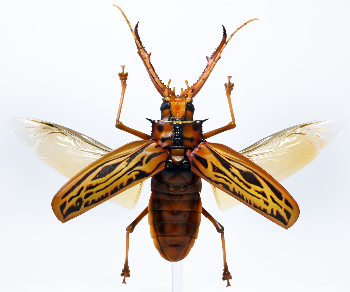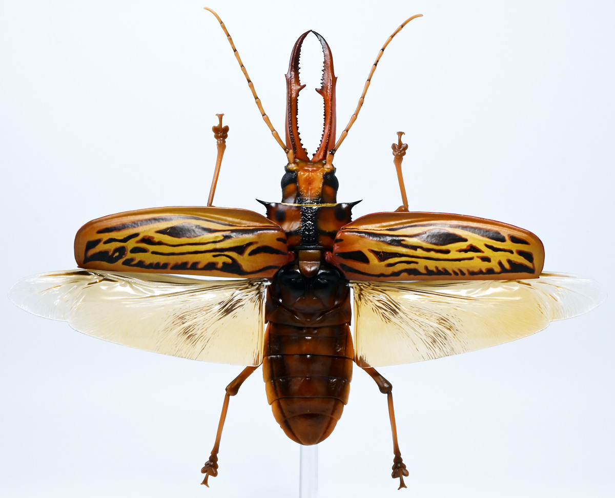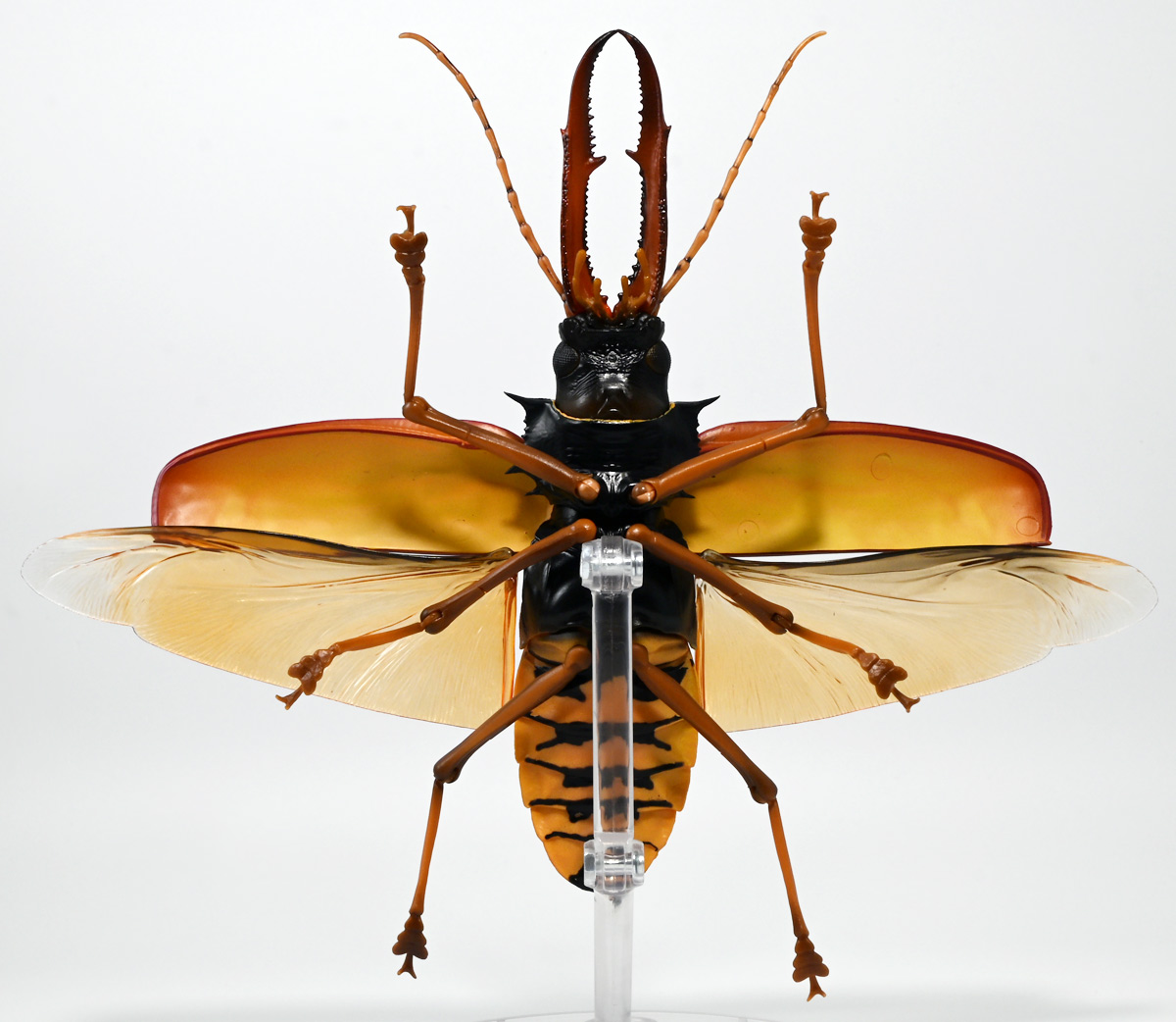 ■バンダイ いきもの大図鑑アドバンス ギラファノコギリクワガタとマンディブラリスフタマタクワガタ マンディブラリスフタマタクワガタ(赤褐色) ![]() 2025年2月第4週発売の一回1500円ガチャ! 直径9センチカプセルが排出できる新型自販機での販売となり、 通常の500円弾カプセルと並べると・・・このサイズ感! と言う事で中身もめちゃくちゃでっかいのです! ![]() ラインナップは「ギラファノコギリクワガタ」が「ケイスケイ」と「ダイスケイ」で2種。 マンディブラリスフタマタクワガタが「黒」と「赤褐色」で2色の全4種となっている。 どれが出ても巨大クワガタ確定が嬉しい特集弾ぞよね! ちなみにガシャポンオンライン版では後翅とディスプレイスタンドがセットとなって1800円でした。 わたくしは後翅もスタンドもいくつか持っているので今回筐体版を購入したぞよ。 「後翅&ディスプレイスタンドセット」は500円でオンライン限定販売される事が時々ありますが、 本体と合わせると2000円になってちょっと割高ぞよ。 追加パーツを持っていないおろかなにんげんどもは、最初からセット版を買うのが最もお得と言うワケだが・・・、 どちらの場合も送料が追加でかかる事をお忘れなく! ![]() ぱかっと開封! おっとこちらは〜・・・肝心の大顎が薄紙に包まれて保護されているので、 組み立てるまで中身がよく判らんぞよ! ![]() じゃん! おうちに帰って組み立ててみると、マンディブラリスフタマタクワガタの赤褐色カラーでした! お〜っ! 今回のラインナップでは最もはっきり彩色されており豪華な一体! 人気で言えばギラファの方が上だろうが・・・こりゃアタリと言って良いんじゃないぞよか〜っ!? ![]() マンディブラリスフタマタクワガタはボルネオ島、スマトラ島に分布する巨大フタマタクワガタぞよ! 最大全長は11.95センチとなっており、 あのギラファノコギリクワガタと双璧を成す世界最大級のクワガタムシの一つであるぞよ! ![]() 見るも巨大な大顎を持つ事から「マンディブラリス(大顎の)」の意を冠された巨大クワガタ! ボルネオ島の原名亜種「mandibularis」と、スマトラ島の亜種「sumatranu」が知られており、 どちらかと言うと後者のスマトラ島産の方が大きく、ペットとして広く流通するのもスマトラ産であるぞよ。 と言う事で普通に考えたら本商品は最も入手しやすいスマトラ産の個体をスキャンしたものと考えられる。 しかし、スマトラ産が黒っぽいのに対し、ボルネオ産はやや小柄ながら赤く発色しやすく美しい。 本商品の赤褐色バージョンはどちらにしても大変に珍しい理想的な個体を再現したものと言うワケぞよ! ![]() 本種は標高1000メートル以上の熱帯雨林に生息し、 ラタンヤシを寄主として成虫は樹液を、幼虫は朽ち木などを食べるぞよ。 性質は極めて狂暴で好戦的。 見るもの全てを自慢の大顎で挟むや、たちまち真っ二つに捻り裂いてしまう為に、 ペットとして飼う時も単独飼育が必要な程だ。 飼育下で繁殖する際には大顎をワイヤーなどで封印する工夫が要るのは難儀であるぞよ! こんなに気性が荒くて、野生下ではどうやって交尾しているのか不思議であるが、 メスもオスの性質を心得ていて、事が済んだらさっさと逃げてしまうのだろう! 強かな奴らぞ!! ![]() 野生下においてはパリーフタマタクワガタなどの同じフタマタクワガタ属のクワガタ達と生息域が被っており、 時々交雑種が見られる事もあると言う。 特にメスは全く見分けがつかないと言って良い! それが為に、ペットとして日本に輸入されてくる際には誤同定される事もしばしばあるぞよ。 交雑種は繁殖能力を持たず、卵を産まない為に通常増やす事は出来ないとされる。 ![]() 前述の通り、スマトラ産のものは黒い艶消しカラーが多く、 ボルネオ産のものは赤みが強く光沢を帯びる事の多いマンディブラリスフタマタクワガタ。 赤くなる場合は前翅のお尻側に色が乗るのだが・・・本商品でもその特徴をばっちり再現しているぞよね! そして「くわがた09」でも見られた頭と胸のツブツブテクスチャ表現が本商品でも受け継がれており、 実に生き物めいたリアルなディテール感ぞよ! ![]() お腹側も丁寧に彩色されており、脚まですっかりフル彩色なのは流石アドバンス弾だ! フタマタクワガタの決定版を作ってやるぞ・・・と言う気概を感じるぞよね! 原型は毎度お馴染み株式会社JMCの手による実物標本のCTスキャンから起こされており、 彩色モデル作成はこちらもお馴染みのCount blue・三浦二郎氏が手掛けられている。 信頼のタッグにより標本と見紛う仕上がりとなったが・・・、 なんとこの商品、デカ玉対応の結果全長16.8センチもあるぞよ! で、でっかすぎーっ!! もうここまでデカいと圧巻と言いますか・・・1500円でこんな豪華なの出せるんですね! と言う驚きしかない!! 玩具としても満足度の高い逸品となっておりますぞよぉ・・・っ! って事で本商品、例によって拡大模型ぞよ。 ![]() いきもの大図鑑のアドバンス弾と言えば本