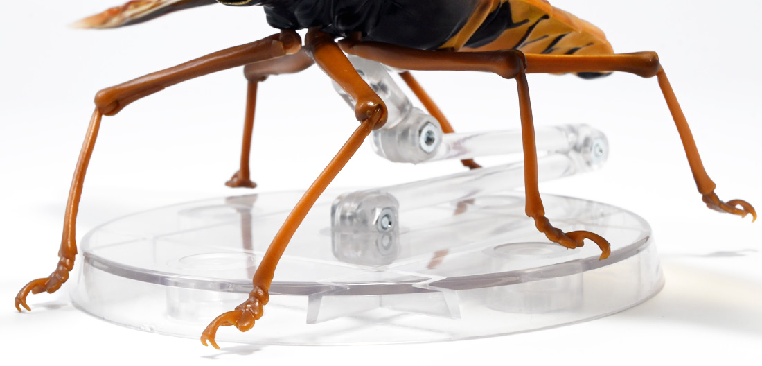 ■バンダイ いきもの大図鑑アドバンス オオカマキリとショウリョウバッタ オオカマキリ(褐色型) ![]() バンダイより、2025年4月第4週登場のプレミアムガシャ! 実機版は1500円、90mmカプセル対応の新型筐体から排出されるデカ玉商品ぞよ。 ガシャポンオンライン版は1800円で、ディスプレイスタンドと後翅セットがおまけに付属しました。 ![]() ラインナップは「オオカマキリ」と「ショウリョウバッタ」の二種。 それぞれ「緑色型」と「褐色型」のカラバリが入った全四種となっていますぞよ。 ![]() オンライン版はカプセル封入でないのでパーツ折れの心配もなく安心ぞよ。 いつも通り小袋にバラバラ死体が入っています。 今回組み立てがやや難ありであるぞよ・・・! まず胸部と腹のジョイント、なかなかハマりません! これはもう温めがどうのとかいう次元でなく、 上手い事噛み合うポジションとそうならず弾かれるポジションがあるとしか言えん! むぎゅっと合体させてきちんとハマるまで何度も繰り返そう! そして軟質の腹部から脚ジョイントがすぐに脱落してしまう、これも難儀である! これなんですけど〜、ジョイント軸が二段階になっていて、 奥まで差し込むともりゅっと固定されるポジションがやはりある。 従って、胴体側を温めながら慎重に差し込み、もりゅっと手ごたえがあったら弄らず冷まして固める。 するとある程度はしっかり食いつく筈ぞよ。 勿論動かしているとぽろっと取れたりするのだが・・・それは仕方がない! また同じ工程で差し込み直すのだ! ![]() こちらの専用スタンド&後翅セットはオンライン限定のおまけ。 カマキリ後翅はこれまでに単品販売された事がないけど、 いつもの仕様なら後にオンラインで500円販売される筈。 どちらにせよ最初からオンラインで本商品を買った方がちょっぴりお安くお得だったぞよ。 ![]() 早速中身を見ていこう! おっと・・・バッタよりボリュームのあるオオカマキリが当たったのはまず嬉しいが、 こりゃ地味な褐色型じゃないか〜っ! 褐色の方がその辺にいっぱいいてリアルと言う見方もあるが・・・ どうも緑色型の方が単純に彩色工程が多く豪華仕様だったようだ。 と言う事で今回は中吉と言う事にしておくぞよ! ![]() しかしなんともリアルなオオカマキリぞよね! この日本では11種くらいが見られると言うカマキリのうち、 ご存知オオカマキリは最も一般的に見られる身近な普通種であるぞよ! 体長はメスでは9.5センチにもなると言われ、沖縄のマエモンカマキリを除けば国内最大種でもあり、 昼行性で夥しく発生するので人目にもつきやすい! 鋭い鎌が格好良い、ちびっ子の憧れの昆虫の一つであるぞよ! ![]() そんなオオカマキリを本商品は迫真のリアル造形で再現している! さて、情報量が多く見所があり過ぎてどこから紹介したらよいものか悩ましいが、 まずはこの勇ましくも愛らしい正面向きの目ぞよね! オオカマキリが「いきもの大図鑑」に登場するのはこれが初めてではない。 2020年11月に登場した500円弾「かまきり」にもラインナップされており、 今回はそのグレードアップ・アドバンスバージョンと言う位置づけなのだが・・・ 500円弾ではクリア成型で再現されていた目が、今回はフル彩色で再現されているのだ! カマキリの目は他の昆虫と同じく、やはり「複眼」であるぞよ。 しかし、どうもこちらをじっと見る瞳のような黒い点が浮かんでいるぞよね? これは「偽瞳孔」と呼ばれるものであるぞよ! つまり、複眼は円筒状の小さな個眼が並んで形作られているが、 この底は黒い色をしている。 それを外から覗くと、丁度正面に見える個眼の底が黒い点の様に見えて、 我々を追いかける瞳の様に見える・・・こういう構造なワケぞよ! このような構造はカマキリだけでなく、他の昆虫でも同様な見え方をする場合がある。 本商品ではこの偽瞳孔がプリントで再現されているんですね。 そしてこれはカマキリの昼間の色である。 夜になると、カマキリは個眼の色素を移動させて黒くし、 暗闇でより感度を高めようとするので、夜間は全体に黒い目に変化するのだ。 全く忍者みたいなヤツぞよね! 更に、カマキリは触角の間に光を感知する為の三つの単眼も持っている。 これもごく小さなものだが、本商品では造形で再現されており正確ぞよ。 ![]() 今回アソートされている緑色型と褐色型。 カマキリの一般的なイメージの色で、自然に見られる二色のバリエーションぞよね! カマキリの仲間は泡のようなスポンジのような卵嚢(卵鞘)として越冬する。 オオカマキリの場合は一つの卵嚢に卵が200個とか300個集まって固まっていて、 春になると夥しい数の前幼虫が出現し、それらが生まれると同時に最初の脱皮を行い、 薄皮を脱ぎ捨てて触角や脚を外に展開すると1齢幼虫になるぞよ。 カマキリは不完全変態昆虫なので、まず最初からカマキリらしい姿をして生まれてくるのだ。 それから普通二週間に一度くらいの周期で脱皮を繰り返し、 オスでは6齢