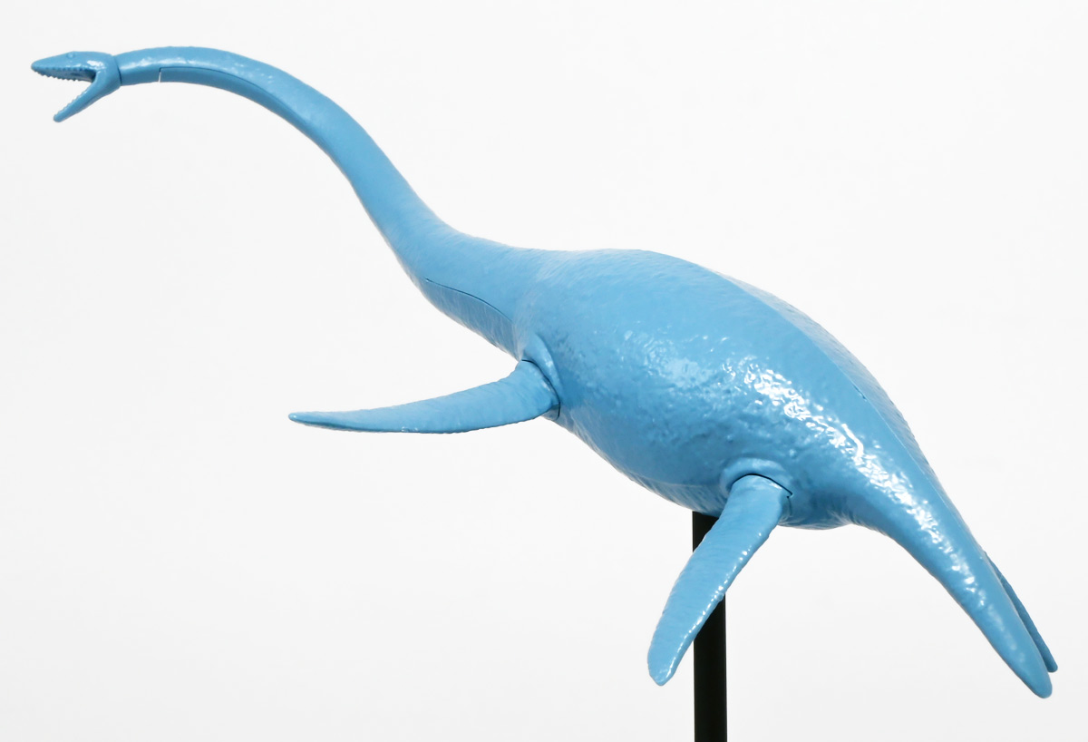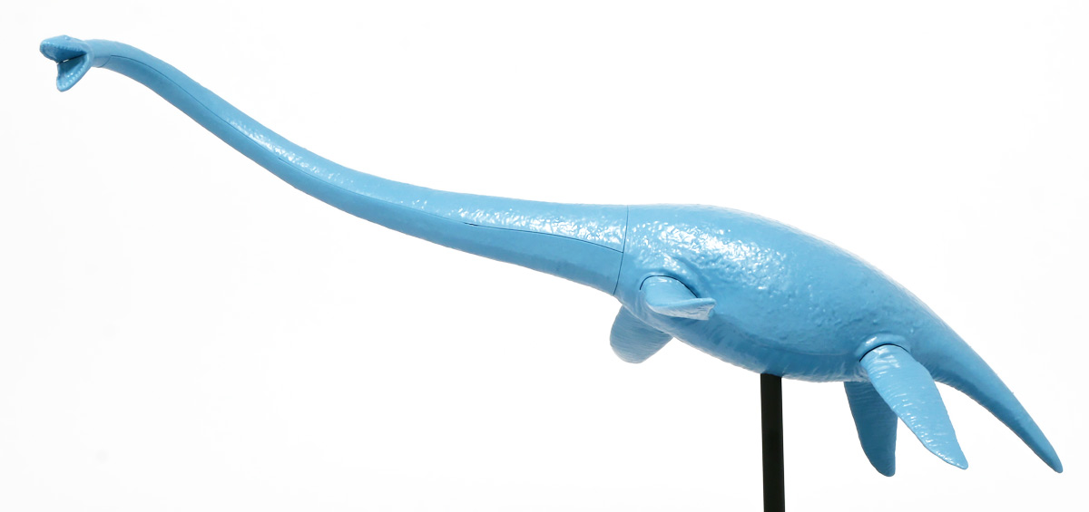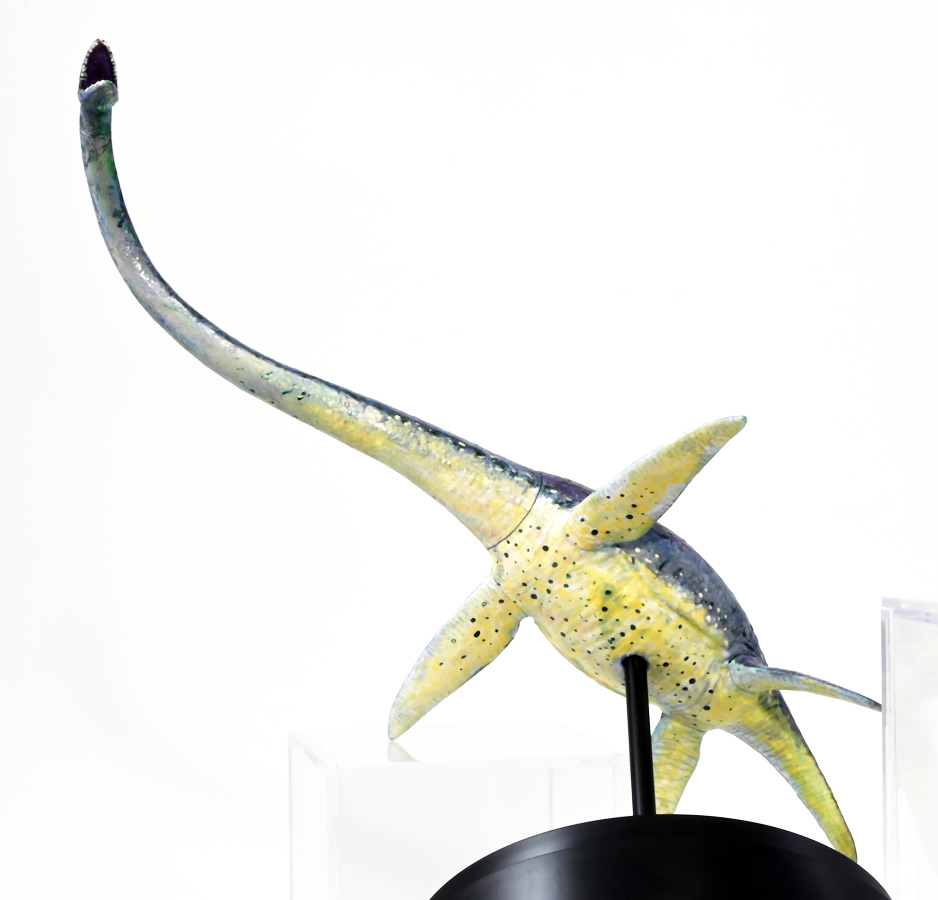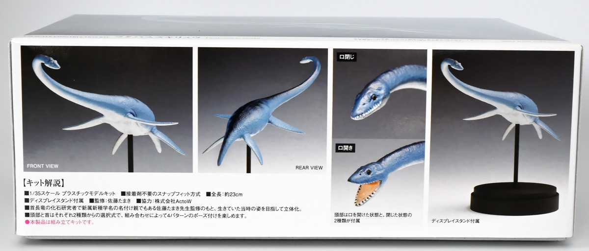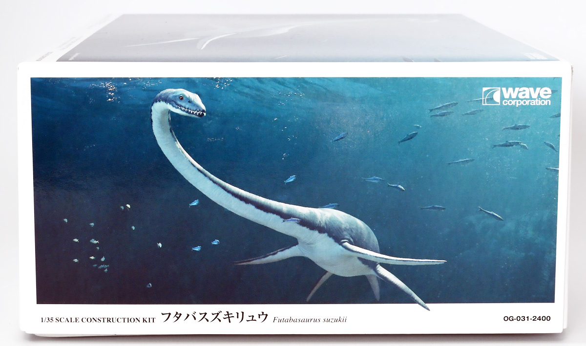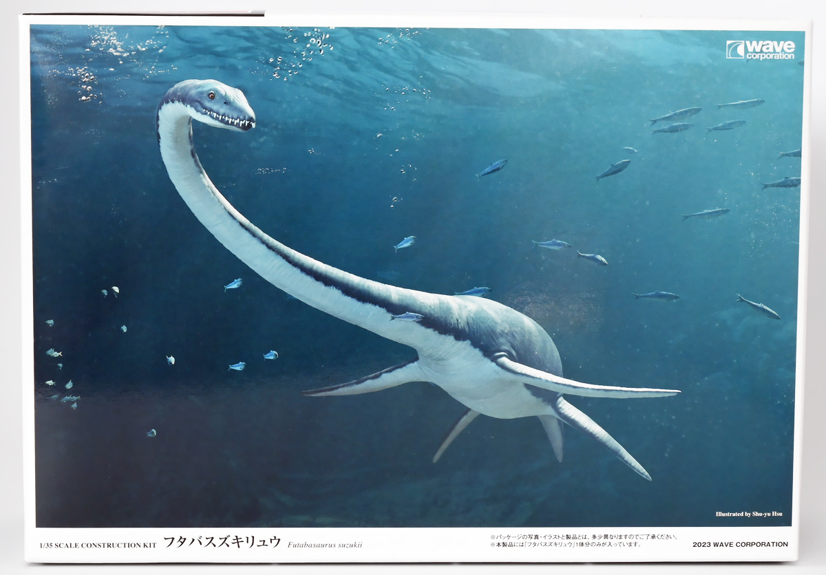 ■株式会社ウェーブ 1/35 フタバスズキリュウ ![]() 2023年3月発売 / 2640円(税込) 株式会社ウェーブよりひょっこり発売された1/35スケールのフタバスズキリュウプラモ。 この年なぜかプラモ業界は恐竜プラモをこぞって出しており、 ウェーブはその隙間を縫って他に誰も出しそうにない首長竜を出してきた感があるぞよ。 首長竜と言えば以前は古生物界のアイドルだったが、近年はジュラワの影響でモササウルスに取って代わられて久しい。 それが2023年に出来の良いプラモとなってやってきたとは嬉しい驚きぞ! ![]() パッケージアートが非常に格好良いぞよね〜! 背中とお腹の境目が鯨類のようで説得力のある彩色。 周りに魚が泳いでいるのはエサを狙っているのだろう。 ドラマを感じる名画はShu-yu Hsu氏の手によるもの。 キットのポージングを元にしたCGのようだ。 ![]() 本商品は監修を日本の古生物学者にして首長竜研究の第一人者・佐藤たまき先生が務めておられるぞよ。 即ち、フタバスズキリュウを新属新種の首長竜 「フタバサウルス・スズキイ」として記載した研究チームの一人が監修していると言う事で、 正に本格復元模型なのである! 佐藤たまき先生の首長竜玩具には以前に紹介した株式会社シオニーの「ホベツアラキリュウ ペーパーパズル」もあった。 今回も期待が高まるぞよね! ![]() 本商品は接着剤不要のスナップフィットタイプのキットとなっており、かんたん設計であるぞよ。 それだけに奥深く突き詰めればどこまでも深掘りできるキットとなっているが・・・ 今回はさくっと組み立ててゆくぞ!! ランナーからパーツを切り離すのにニッパーとデザインナイフは必須なので用意しておきましょう。 ![]() ぱかっと開封! ランナーと説明書が入っています。 ![]() なんと潔い成型色一色! パーツは殆どもなかちゃんなので組み立てるだけならほんの10分とか20分とかで出来てしまうのだ! ![]() シンプルな台座がおまけに入っているので作ったらすぐに展示できます。 これは嬉しい仕様であるぞよ! ![]() 説明書にはフタバスズキリュウの特徴を示したメモが挿入されており、 知識を深めながら楽しく組み立てる事が出来る。 こういう細かい遊びが面白いんですね〜。 ![]() 接着剤不要でさくっと完成! 首と頭が形状違いで二種ずつ付属し、それぞれ入れ替え可能なので4パターン組み立てる事が出来るのだ! ![]() 完成! 1/35フタバスズキリュウ!! 学名「フタバサウルス・スズキイ」は後期白亜紀サントニアン期、 この日本近海に生息していたプレシオサウルス上科エラスモサウルス科の首長竜であるぞよ! 1968年、国内で初めて発見された首長竜であり、 この発見を機に「首長竜」と言う言葉が作られた記念すべき種である! 本商品の原型制作、説明書のイラストや解説は、 株式会社ActoWの代表取締役・徳川広和氏が手掛けられている。 国内外の博物館からも依頼を受けて古生物復元模型を製作するActoW製作と言う事で、 本キットは博物館級に本格的な立体物と言えるだろう! ![]() ちょうどこの間株式会社いきもんから発売された「ネイチャーテクニカラー 古生物」のレビューで フタバサウルスの事を書いてしまったのでもうここで改めて紹介する事も無かろう! フタバサウルスは他に「アニア AL-09 クビナガリュウ(フタバサウルス)」や、 「アニアのたまご 恐竜コレクション2」でも登場しているのでそちらのレビューも参照のことぞ! ![]() まずは首を前方に向けたスタンダードなポーズ。 遊泳状態とも、水中に浮かんで餌を探しているともとれるポージングぞよね! こちらには大人しい口閉じ顔を装着してみた。 今回、首の着脱ギミックは活かし、ちっちゃくて着脱が面倒な頭部は固定で作ってゆく事にしたぞよ! ![]() ご覧の通りそのまま作るだけでは合わせ目が出てしまう。 生物模型なのでここはどうにかしたいと思うおろかなにんげんどもが多い事でしょう。 ・・・お、おろか〜っ!! キミ達そんな細かい事を気にしていて、生涯であといくつプラモを作るつもりなんだぞよ!? 作るヤツ全部ちまちま粗を潰していては作っても作り切れん! きっとおろかなにんげんどもは無限の積みプラに囲まれて死んでゆくんだろう・・・! わたくしは違う! 細かい所はいちいち気にしない! プラモは楽しく作ってこそ輝くのだ! 合わせ目を無視する勇気こそが道を切り開くぞよっ!! ![]() 首の下に隙間開いちゃってるけど気にしないの。 ま〜ど〜しても気になると言うおろかなにんげんどもは、 流し込み接着剤でむにゅっとするだけでも隙間が埋まって見栄えが良くなるかもしれません。 ![]() そしてもう一つのパターンとして、左曲がりの首と口を開けた頭部を組み合わせて製作。 差し替えのピンがややキツめなので、 組み換え遊びを楽しみたい人はちょこっと削っておくとスムーズだろう。 ![]() こちらのポージングでは一転動きのある首長竜に大変身! どっちの首で飾るか迷っちゃうぞよよ〜っ! ![]() そして、見よ、このシルエット! 首を左に巻い
