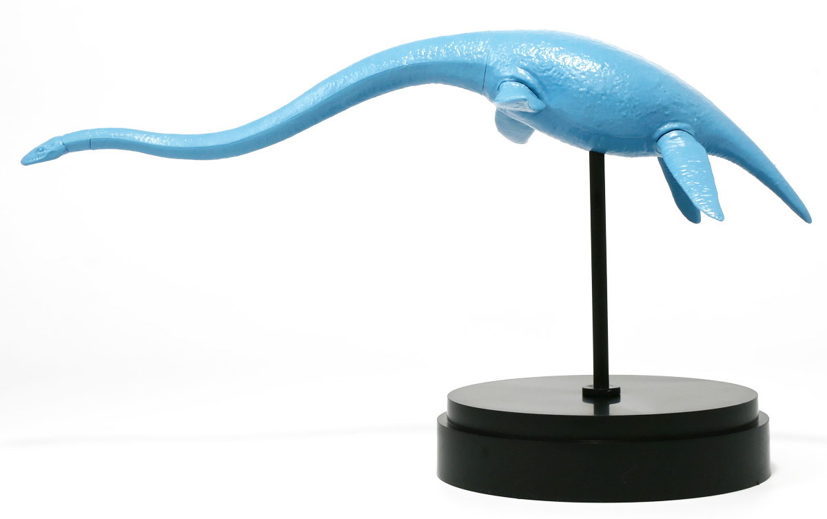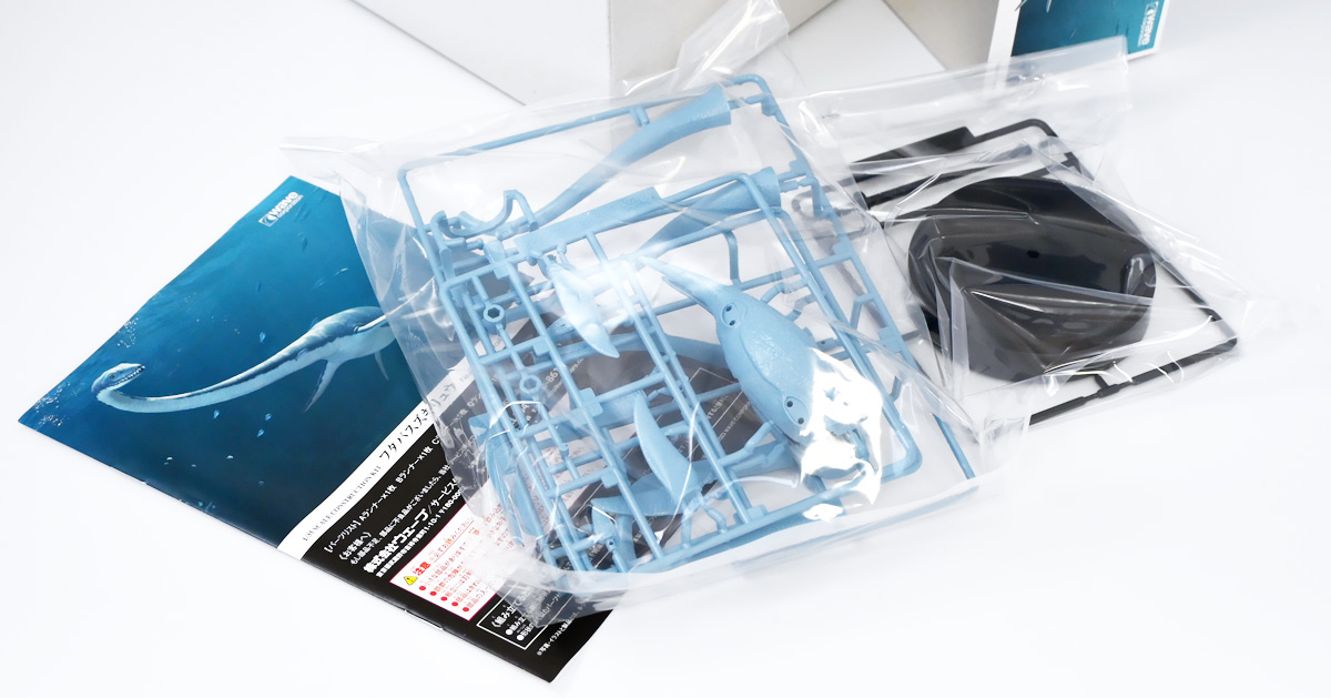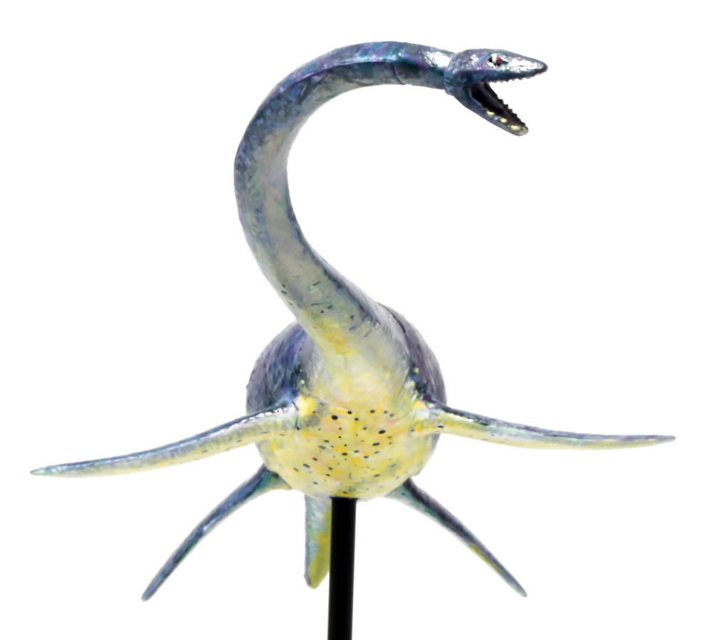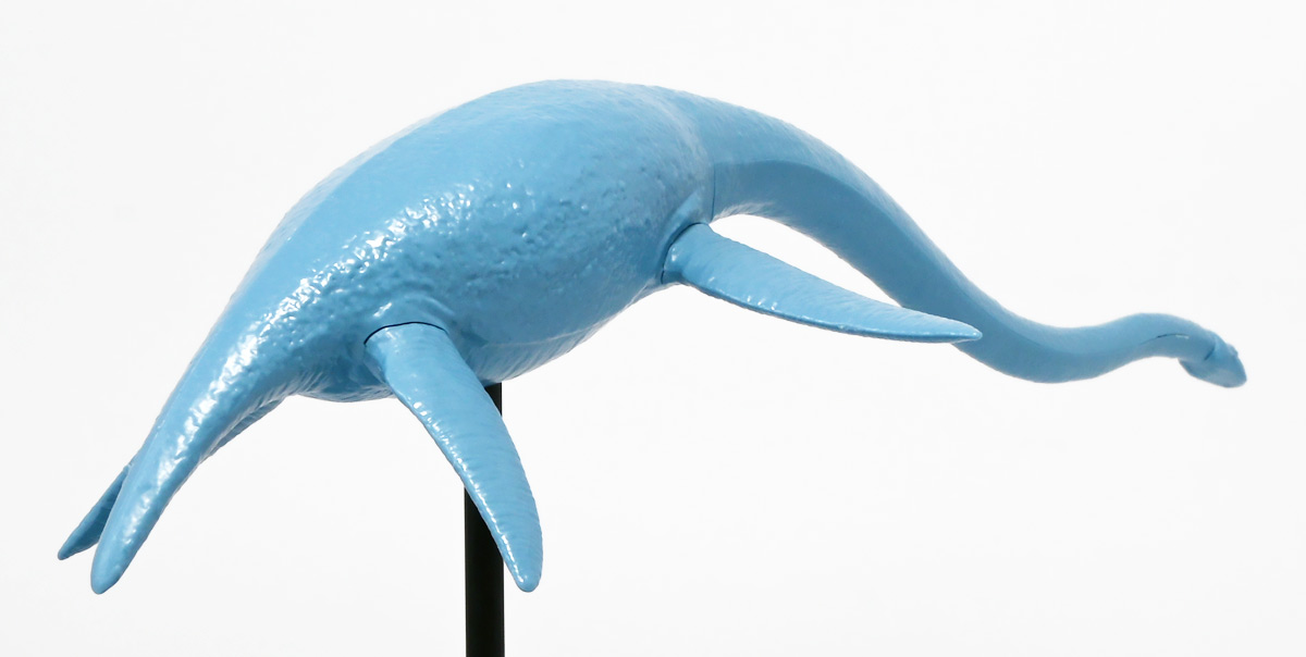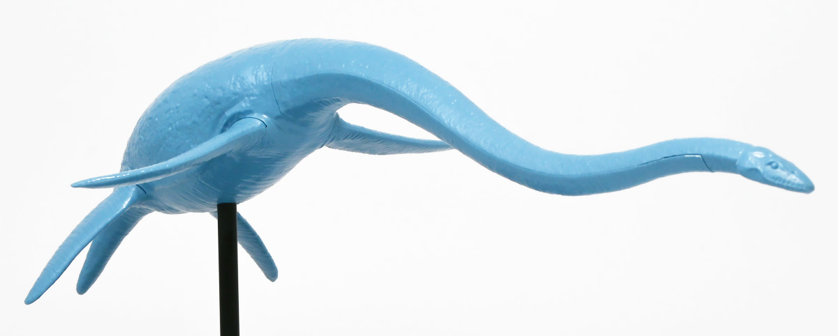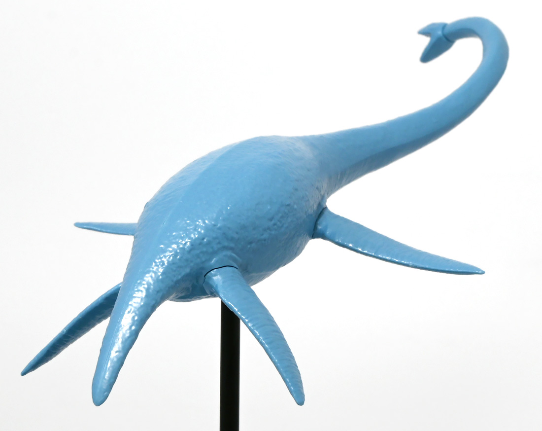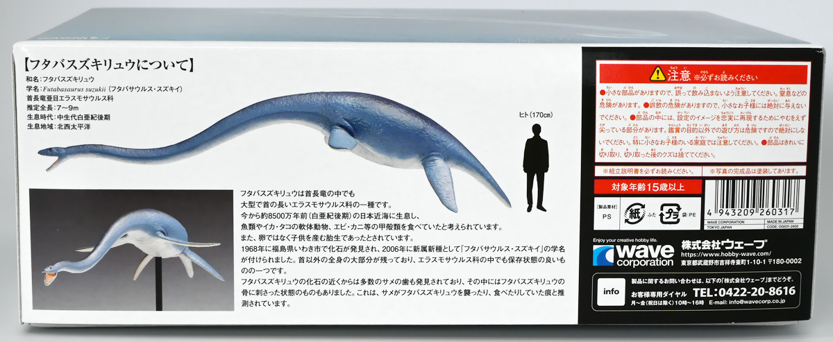 ■株式会社ウェーブ 1/35 フタバスズキリュウ ![]() 2023年3月発売 / 2640円(税込) 株式会社ウェーブよりひょっこり発売された1/35スケールのフタバスズキリュウプラモ。 この年なぜかプラモ業界は恐竜プラモをこぞって出しており、 ウェーブはその隙間を縫って他に誰も出しそうにない首長竜を出してきた感があるぞよ。 首長竜と言えば以前は古生物界のアイドルだったが、近年はジュラワの影響でモササウルスに取って代わられて久しい。 それが2023年に出来の良いプラモとなってやってきたとは嬉しい驚きぞ! ![]() パッケージアートが非常に格好良いぞよね〜! 背中とお腹の境目が鯨類のようで説得力のある彩色。 周りに魚が泳いでいるのはエサを狙っているのだろう。 ドラマを感じる名画はShu-yu Hsu氏の手によるもの。 キットのポージングを元にしたCGのようだ。 ![]() 本商品は監修を日本の古生物学者にして首長竜研究の第一人者・佐藤たまき先生が務めておられるぞよ。 即ち、フタバスズキリュウを新属新種の首長竜 「フタバサウルス・スズキイ」として記載した研究チームの一人が監修していると言う事で、 正に本格復元模型なのである! 佐藤たまき先生の首長竜玩具には以前に紹介した株式会社シオニーの「ホベツアラキリュウ ペーパーパズル」もあった。 今回も期待が高まるぞよね! ![]() 本商品は接着剤不要のスナップフィットタイプのキットとなっており、かんたん設計であるぞよ。 それだけに奥深く突き詰めればどこまでも深掘りできるキットとなっているが・・・ 今回はさくっと組み立ててゆくぞ!! ランナーからパーツを切り離すのにニッパーとデザインナイフは必須なので用意しておきましょう。 ![]() ぱかっと開封! ランナーと説明書が入っています。 ![]() なんと潔い成型色一色! パーツは殆どもなかちゃんなので組み立てるだけならほんの10分とか20分とかで出来てしまうのだ! ![]() シンプルな台座がおまけに入っているので作ったらすぐに展示できます。 これは嬉しい仕様であるぞよ! ![]() 説明書にはフタバスズキリュウの特徴を示したメモが挿入されており、 知識を深めながら楽しく組み立てる事が出来る。 こういう細かい遊びが面白いんですね〜。 ![]() 接着剤不要でさくっと完成! 首と頭が形状違いで二種ずつ付属し、それぞれ入れ替え可能なので4パターン組み立てる事が出来るのだ! ![]() 完成! 1/35フタバスズキリュウ!! 学名「フタバサウルス・スズキイ」は後期白亜紀サントニアン期、 この日本近海に生息していたプレシオサウルス上科エラスモサウルス科の首長竜であるぞよ! 1968年、国内で初めて発見された首長竜であり、 この発見を機に「首長竜」と言う言葉が作られた記念すべき種である! 本商品の原型制作、説明書のイラストや解説は、 株式会社ActoWの代表取締役・徳川広和氏が手掛けられている。 国内外の博物館からも依頼を受けて古生物復元模型を製作するActoW製作と言う事で、 本キットは博物館級に本格的な立体物と言えるだろう! ![]() ちょうどこの間株式会社いきもんから発売された「ネイチャーテクニカラー 古生物」のレビューで フタバサウルスの事を書いてしまったのでもうここで改めて紹介する事も無かろう! フタバサウルスは他に「アニア AL-09 クビナガリュウ(フタバサウルス)」や、 「アニアのたまご 恐竜コレクション2」でも登場しているのでそちらのレビューも参照のことぞ! ![]() まずは首を前方に向けたスタンダードなポーズ。 遊泳状態とも、水中に浮かんで餌を探しているともとれるポージングぞよね! こちらには大人しい口閉じ顔を装着してみた。 今回、首の着脱ギミックは活かし、ちっちゃくて着脱が面倒な頭部は固定で作ってゆく事にしたぞよ! ![]() ご覧の通りそのまま作るだけでは合わせ目が出てしまう。 生物模型なのでここはどうにかしたいと思うおろかなにんげんどもが多い事でしょう。 ・・・お、おろか〜っ!! キミ達そんな細かい事を気にしていて、生涯であといくつプラモを作るつもりなんだぞよ!? 作るヤツ全部ちまちま粗を潰していては作っても作り切れん! きっとおろかなにんげんどもは無限の積みプラに囲まれて死んでゆくんだろう・・・! わたくしは違う! 細かい所はいちいち気にしない! プラモは楽しく作ってこそ輝くのだ! 合わせ目を無視する勇気こそが道を切り開くぞよっ!! ![]() 首の下に隙間開いちゃってるけど気にしないの。 ま〜ど〜しても気になると言うおろかなにんげんどもは、 流し込み接着剤でむにゅっとするだけでも隙間が埋まって見栄えが良くなるかもしれません。 ![]() そしてもう一つのパターンとして、左曲がりの首と口を開けた頭部を組み合わせて製作。 差し替えのピンがややキツめなので、 組み換え遊びを楽しみたい人はちょこっと削っておくとスムーズだろう。 ![]() こちらのポージングでは一転動きのある首長竜に大変身! どっちの首で飾るか迷っちゃうぞよよ〜っ! ![]() そして、見よ、このシルエット! 首を左に巻い