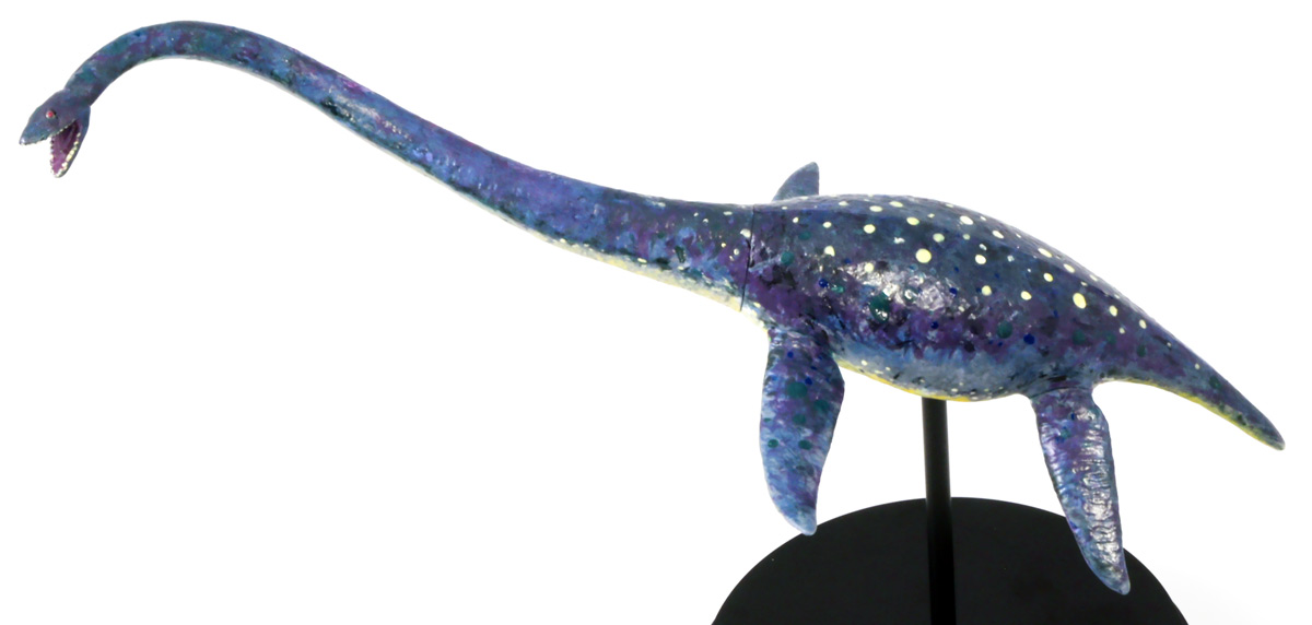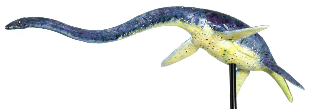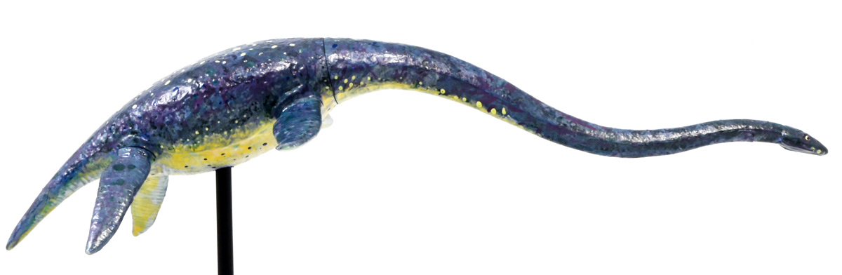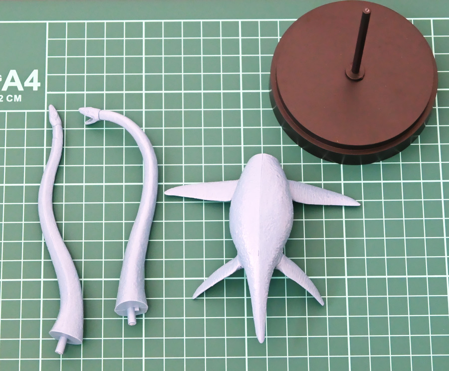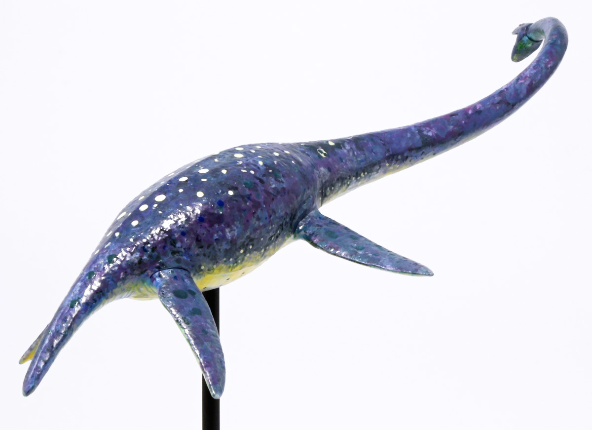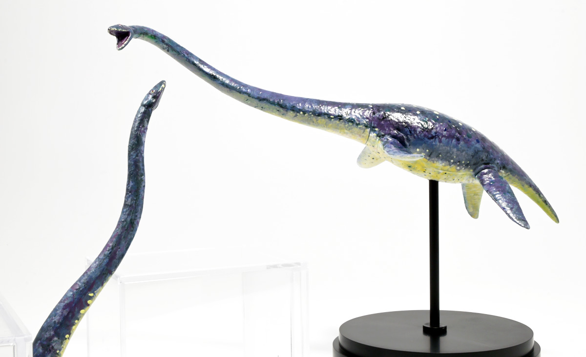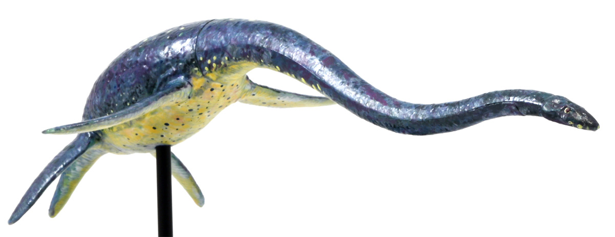 ■株式会社ウェーブ 1/35 フタバスズキリュウ ![]() 2023年3月発売 / 2640円(税込) 株式会社ウェーブよりひょっこり発売された1/35スケールのフタバスズキリュウプラモ。 この年なぜかプラモ業界は恐竜プラモをこぞって出しており、 ウェーブはその隙間を縫って他に誰も出しそうにない首長竜を出してきた感があるぞよ。 首長竜と言えば以前は古生物界のアイドルだったが、近年はジュラワの影響でモササウルスに取って代わられて久しい。 それが2023年に出来の良いプラモとなってやってきたとは嬉しい驚きぞ! ![]() パッケージアートが非常に格好良いぞよね〜! 背中とお腹の境目が鯨類のようで説得力のある彩色。 周りに魚が泳いでいるのはエサを狙っているのだろう。 ドラマを感じる名画はShu-yu Hsu氏の手によるもの。 キットのポージングを元にしたCGのようだ。 ![]() 本商品は監修を日本の古生物学者にして首長竜研究の第一人者・佐藤たまき先生が務めておられるぞよ。 即ち、フタバスズキリュウを新属新種の首長竜 「フタバサウルス・スズキイ」として記載した研究チームの一人が監修していると言う事で、 正に本格復元模型なのである! 佐藤たまき先生の首長竜玩具には以前に紹介した株式会社シオニーの「ホベツアラキリュウ ペーパーパズル」もあった。 今回も期待が高まるぞよね! ![]() 本商品は接着剤不要のスナップフィットタイプのキットとなっており、かんたん設計であるぞよ。 それだけに奥深く突き詰めればどこまでも深掘りできるキットとなっているが・・・ 今回はさくっと組み立ててゆくぞ!! ランナーからパーツを切り離すのにニッパーとデザインナイフは必須なので用意しておきましょう。 ![]() ぱかっと開封! ランナーと説明書が入っています。 ![]() なんと潔い成型色一色! パーツは殆どもなかちゃんなので組み立てるだけならほんの10分とか20分とかで出来てしまうのだ! ![]() シンプルな台座がおまけに入っているので作ったらすぐに展示できます。 これは嬉しい仕様であるぞよ! ![]() 説明書にはフタバスズキリュウの特徴を示したメモが挿入されており、 知識を深めながら楽しく組み立てる事が出来る。 こういう細かい遊びが面白いんですね〜。 ![]() 接着剤不要でさくっと完成! 首と頭が形状違いで二種ずつ付属し、それぞれ入れ替え可能なので4パターン組み立てる事が出来るのだ! ![]() 完成! 1/35フタバスズキリュウ!! 学名「フタバサウルス・スズキイ」は後期白亜紀サントニアン期、 この日本近海に生息していたプレシオサウルス上科エラスモサウルス科の首長竜であるぞよ! 1968年、国内で初めて発見された首長竜であり、 この発見を機に「首長竜」と言う言葉が作られた記念すべき種である! 本商品の原型制作、説明書のイラストや解説は、 株式会社ActoWの代表取締役・徳川広和氏が手掛けられている。 国内外の博物館からも依頼を受けて古生物復元模型を製作するActoW製作と言う事で、 本キットは博物館級に本格的な立体物と言えるだろう! ![]() ちょうどこの間株式会社いきもんから発売された「ネイチャーテクニカラー 古生物」のレビューで フタバサウルスの事を書いてしまったのでもうここで改めて紹介する事も無かろう! フタバサウルスは他に「アニア AL-09 クビナガリュウ(フタバサウルス)」や、 「アニアのたまご 恐竜コレクション2」でも登場しているのでそちらのレビューも参照のことぞ! ![]() まずは首を前方に向けたスタンダードなポーズ。 遊泳状態とも、水中に浮かんで餌を探しているともとれるポージングぞよね! こちらには大人しい口閉じ顔を装着してみた。 今回、首の着脱ギミックは活かし、ちっちゃくて着脱が面倒な頭部は固定で作ってゆく事にしたぞよ! ![]() ご覧の通りそのまま作るだけでは合わせ目が出てしまう。 生物模型なのでここはどうにかしたいと思うおろかなにんげんどもが多い事でしょう。 ・・・お、おろか〜っ!! キミ達そんな細かい事を気にしていて、生涯であといくつプラモを作るつもりなんだぞよ!? 作るヤツ全部ちまちま粗を潰していては作っても作り切れん! きっとおろかなにんげんどもは無限の積みプラに囲まれて死んでゆくんだろう・・・! わたくしは違う! 細かい所はいちいち気にしない! プラモは楽しく作ってこそ輝くのだ! 合わせ目を無視する勇気こそが道を切り開くぞよっ!! ![]() 首の下に隙間開いちゃってるけど気にしないの。 ま〜ど〜しても気になると言うおろかなにんげんどもは、 流し込み接着剤でむにゅっとするだけでも隙間が埋まって見栄えが良くなるかもしれません。 ![]() そしてもう一つのパターンとして、左曲がりの首と口を開けた頭部を組み合わせて製作。 差し替えのピンがややキツめなので、 組み換え遊びを楽しみたい人はちょこっと削っておくとスムーズだろう。 ![]() こちらのポージングでは一転動きのある首長竜に大変身! どっちの首で飾るか迷っちゃうぞよよ〜っ! ![]() そして、見よ、このシルエット! 首を左に巻い