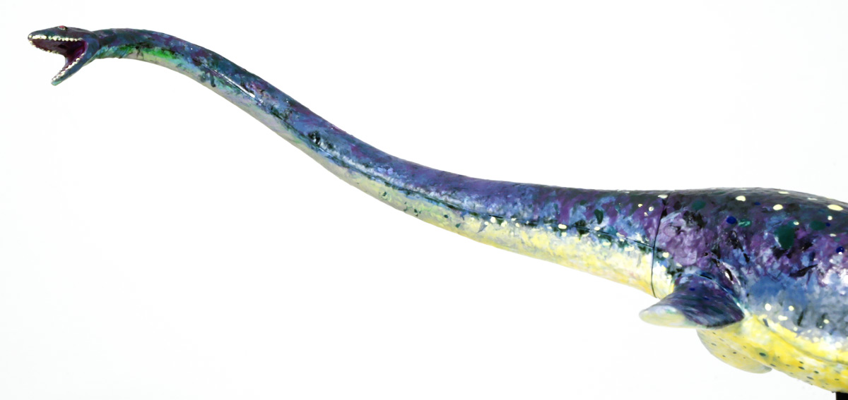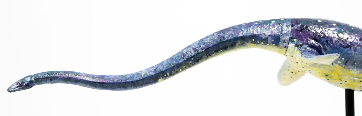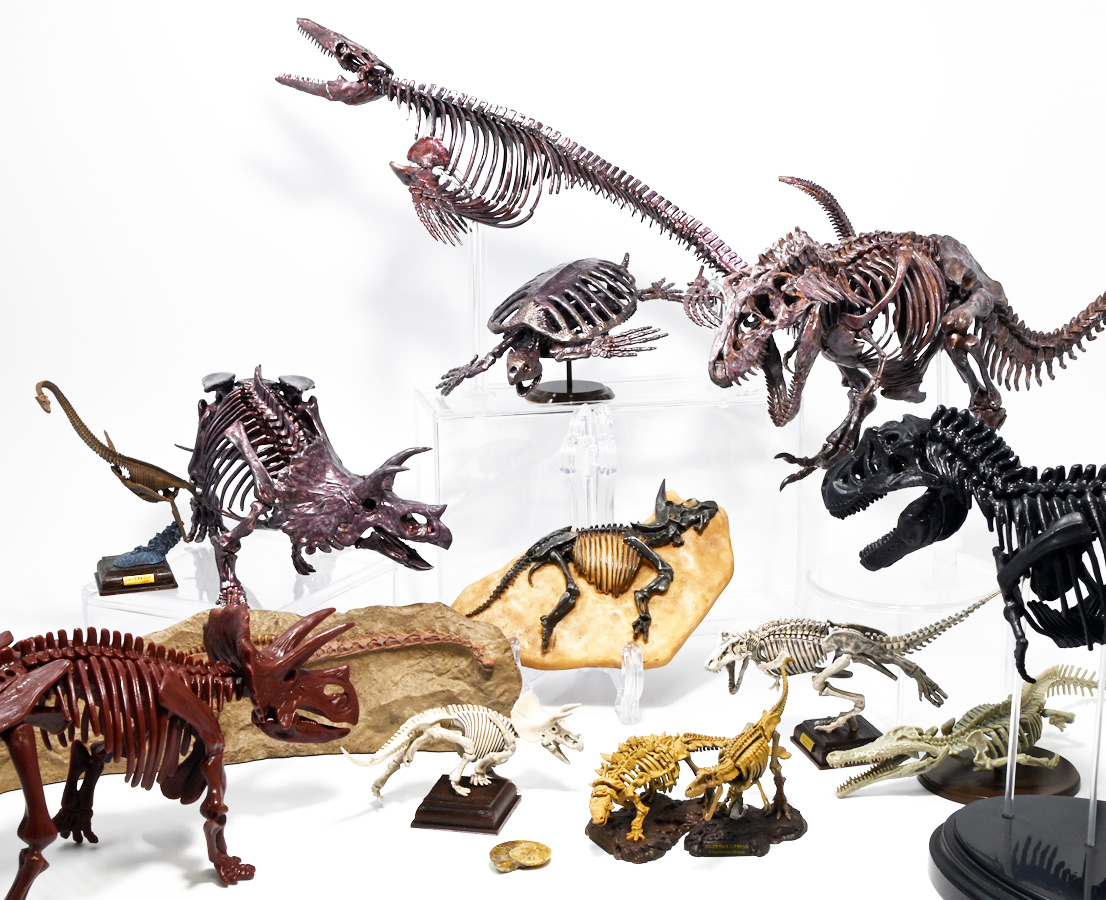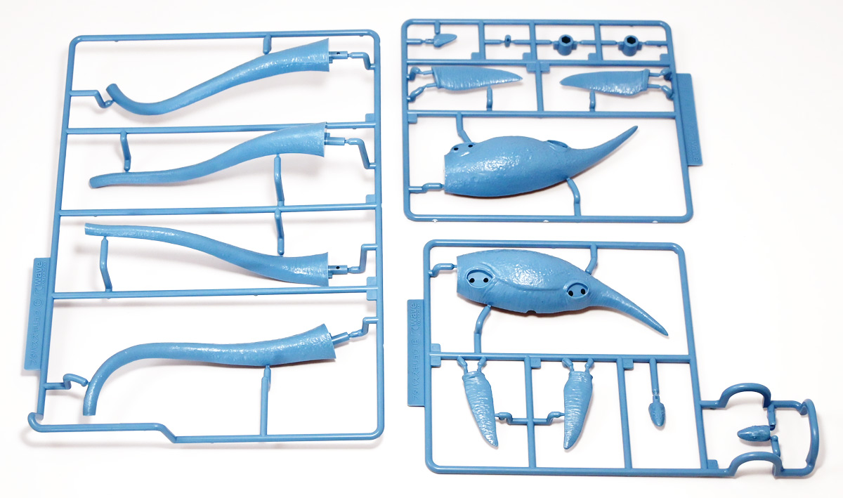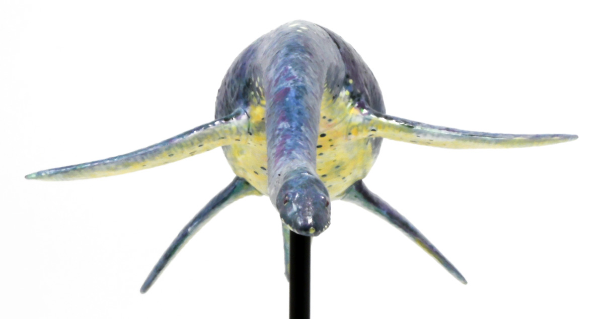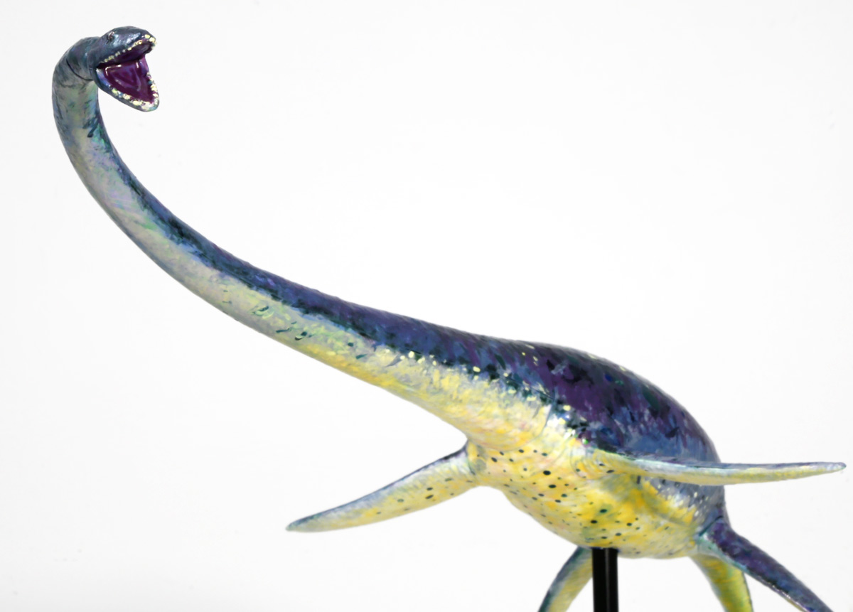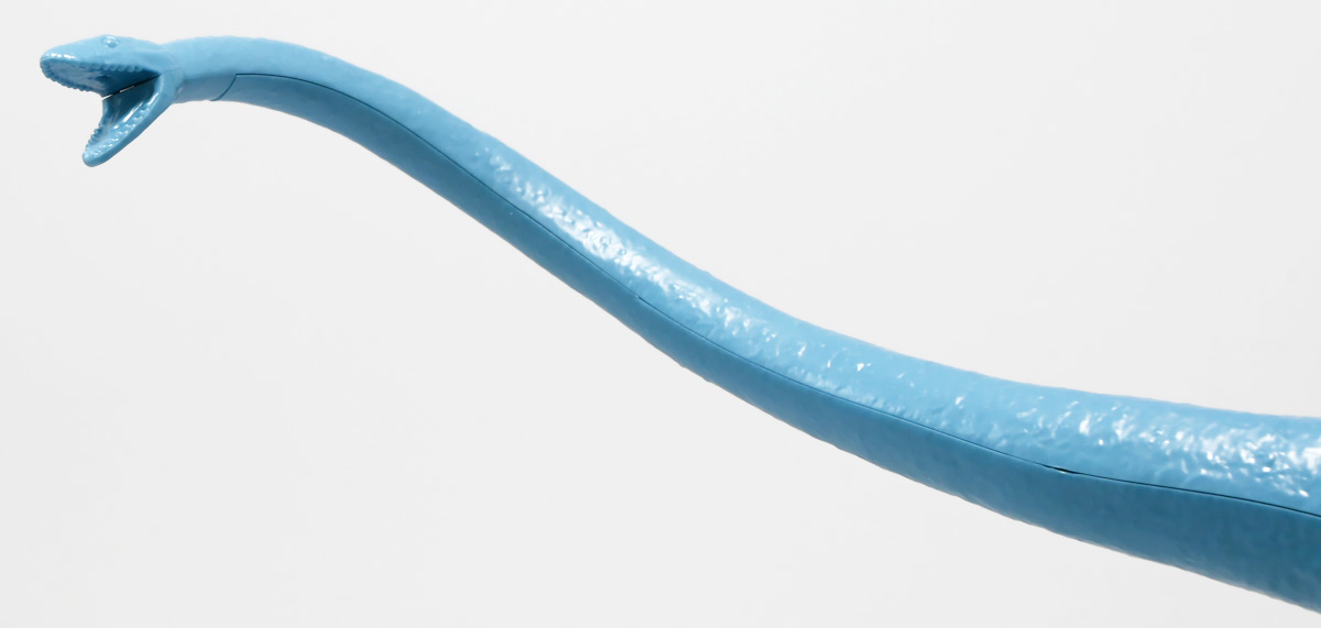 ■株式会社ウェーブ 1/35 フタバスズキリュウ ![]() 2023年3月発売 / 2640円(税込) 株式会社ウェーブよりひょっこり発売された1/35スケールのフタバスズキリュウプラモ。 この年なぜかプラモ業界は恐竜プラモをこぞって出しており、 ウェーブはその隙間を縫って他に誰も出しそうにない首長竜を出してきた感があるぞよ。 首長竜と言えば以前は古生物界のアイドルだったが、近年はジュラワの影響でモササウルスに取って代わられて久しい。 それが2023年に出来の良いプラモとなってやってきたとは嬉しい驚きぞ! ![]() パッケージアートが非常に格好良いぞよね〜! 背中とお腹の境目が鯨類のようで説得力のある彩色。 周りに魚が泳いでいるのはエサを狙っているのだろう。 ドラマを感じる名画はShu-yu Hsu氏の手によるもの。 キットのポージングを元にしたCGのようだ。 ![]() 本商品は監修を日本の古生物学者にして首長竜研究の第一人者・佐藤たまき先生が務めておられるぞよ。 即ち、フタバスズキリュウを新属新種の首長竜 「フタバサウルス・スズキイ」として記載した研究チームの一人が監修していると言う事で、 正に本格復元模型なのである! 佐藤たまき先生の首長竜玩具には以前に紹介した株式会社シオニーの「ホベツアラキリュウ ペーパーパズル」もあった。 今回も期待が高まるぞよね! ![]() 本商品は接着剤不要のスナップフィットタイプのキットとなっており、かんたん設計であるぞよ。 それだけに奥深く突き詰めればどこまでも深掘りできるキットとなっているが・・・ 今回はさくっと組み立ててゆくぞ!! ランナーからパーツを切り離すのにニッパーとデザインナイフは必須なので用意しておきましょう。 ![]() ぱかっと開封! ランナーと説明書が入っています。 ![]() なんと潔い成型色一色! パーツは殆どもなかちゃんなので組み立てるだけならほんの10分とか20分とかで出来てしまうのだ! ![]() シンプルな台座がおまけに入っているので作ったらすぐに展示できます。 これは嬉しい仕様であるぞよ! ![]() 説明書にはフタバスズキリュウの特徴を示したメモが挿入されており、 知識を深めながら楽しく組み立てる事が出来る。 こういう細かい遊びが面白いんですね〜。 ![]() 接着剤不要でさくっと完成! 首と頭が形状違いで二種ずつ付属し、それぞれ入れ替え可能なので4パターン組み立てる事が出来るのだ! ![]() 完成! 1/35フタバスズキリュウ!! 学名「フタバサウルス・スズキイ」は後期白亜紀サントニアン期、 この日本近海に生息していたプレシオサウルス上科エラスモサウルス科の首長竜であるぞよ! 1968年、国内で初めて発見された首長竜であり、 この発見を機に「首長竜」と言う言葉が作られた記念すべき種である! 本商品の原型制作、説明書のイラストや解説は、 株式会社ActoWの代表取締役・徳川広和氏が手掛けられている。 国内外の博物館からも依頼を受けて古生物復元模型を製作するActoW製作と言う事で、 本キットは博物館級に本格的な立体物と言えるだろう! ![]() ちょうどこの間株式会社いきもんから発売された「ネイチャーテクニカラー 古生物」のレビューで フタバサウルスの事を書いてしまったのでもうここで改めて紹介する事も無かろう! フタバサウルスは他に「アニア AL-09 クビナガリュウ(フタバサウルス)」や、 「アニアのたまご 恐竜コレクション2」でも登場しているのでそちらのレビューも参照のことぞ! ![]() まずは首を前方に向けたスタンダードなポーズ。 遊泳状態とも、水中に浮かんで餌を探しているともとれるポージングぞよね! こちらには大人しい口閉じ顔を装着してみた。 今回、首の着脱ギミックは活かし、ちっちゃくて着脱が面倒な頭部は固定で作ってゆく事にしたぞよ! ![]() ご覧の通りそのまま作るだけでは合わせ目が出てしまう。 生物模型なのでここはどうにかしたいと思うおろかなにんげんどもが多い事でしょう。 ・・・お、おろか〜っ!! キミ達そんな細かい事を気にしていて、生涯であといくつプラモを作るつもりなんだぞよ!? 作るヤツ全部ちまちま粗を潰していては作っても作り切れん! きっとおろかなにんげんどもは無限の積みプラに囲まれて死んでゆくんだろう・・・! わたくしは違う! 細かい所はいちいち気にしない! プラモは楽しく作ってこそ輝くのだ! 合わせ目を無視する勇気こそが道を切り開くぞよっ!! ![]() 首の下に隙間開いちゃってるけど気にしないの。 ま〜ど〜しても気になると言うおろかなにんげんどもは、 流し込み接着剤でむにゅっとするだけでも隙間が埋まって見栄えが良くなるかもしれません。 ![]() そしてもう一つのパターンとして、左曲がりの首と口を開けた頭部を組み合わせて製作。 差し替えのピンがややキツめなので、 組み換え遊びを楽しみたい人はちょこっと削っておくとスムーズだろう。 ![]() こちらのポージングでは一転動きのある首長竜に大変身! どっちの首で飾るか迷っちゃうぞよよ〜っ! ![]() そして、見よ、このシルエット! 首を左に巻い