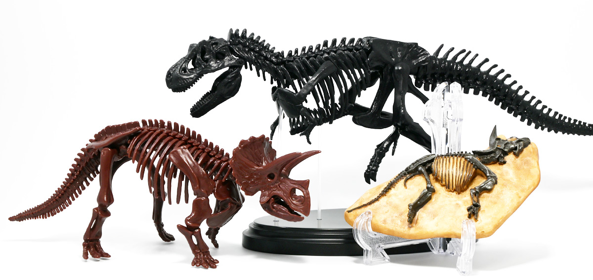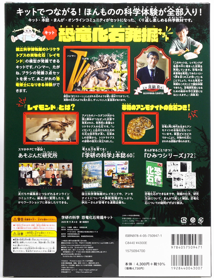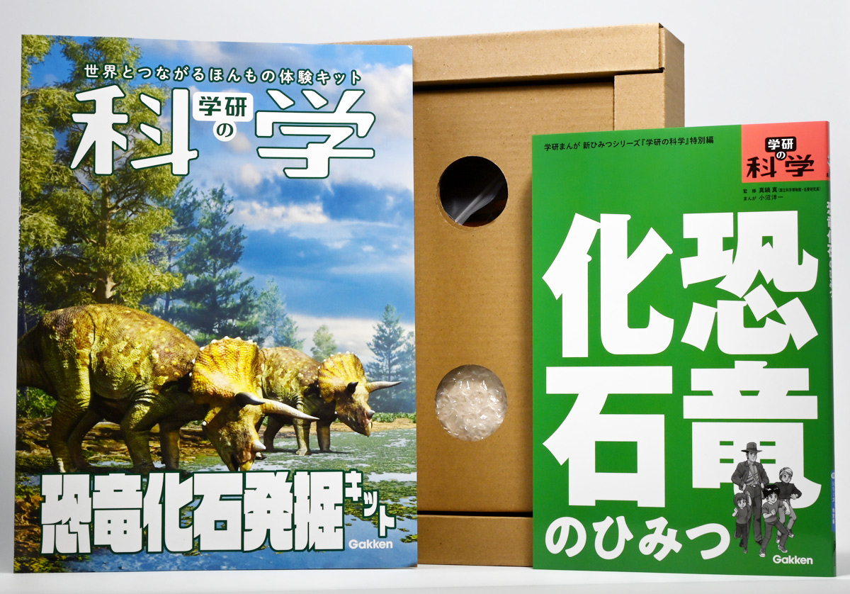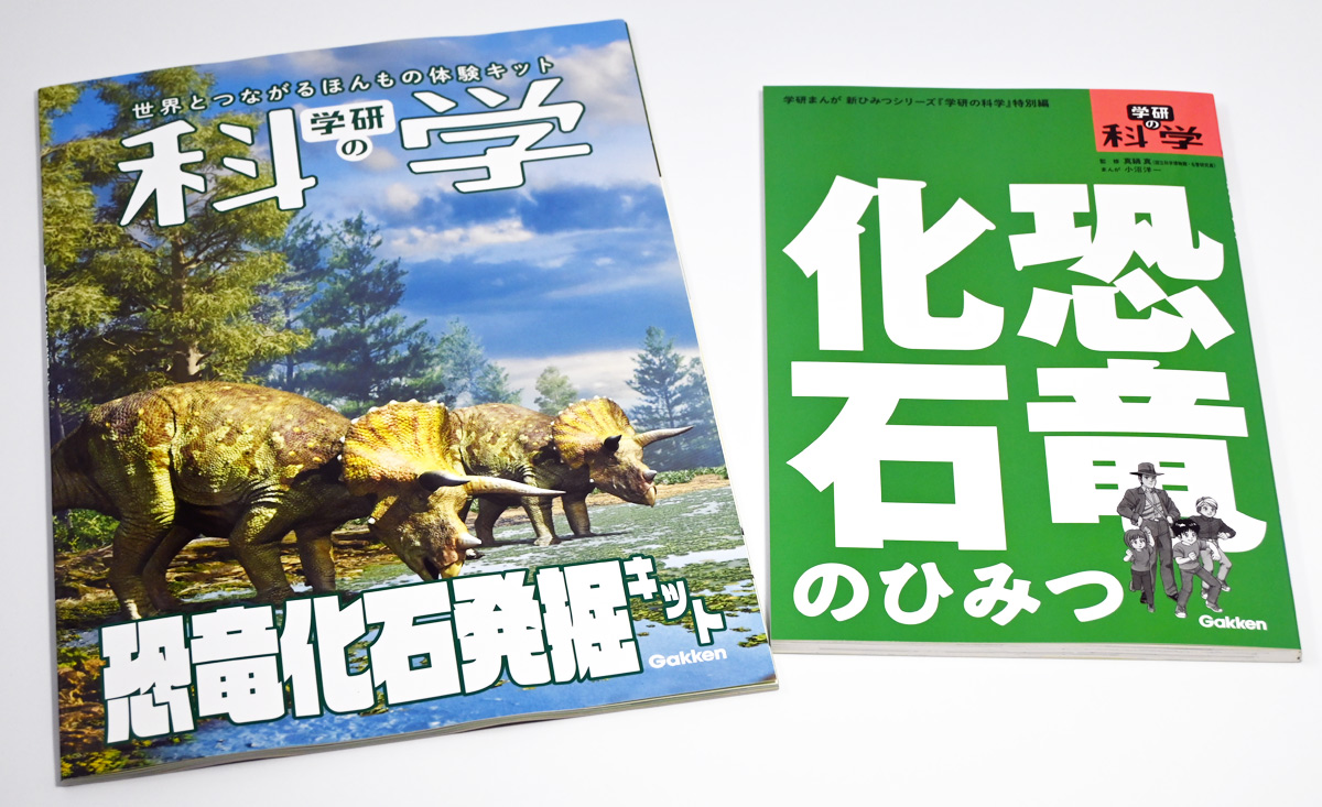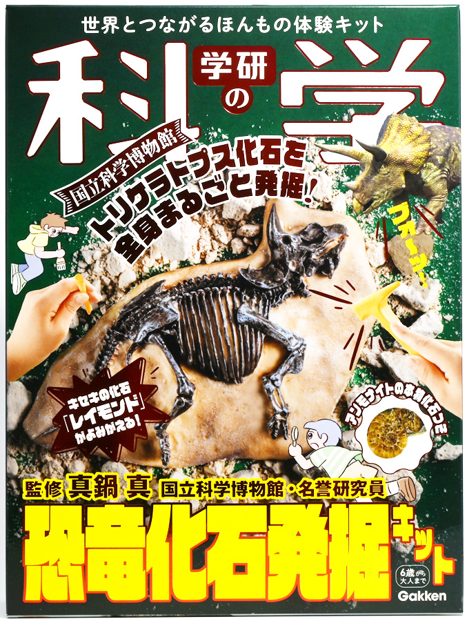 ■学研の科学 恐竜化石発掘キット: 世界とつながるほんもの体験キット ![]() 2025年10月23日発売 / 4730円(税込) 子供達が夢中になるほんものの科学体験を付録にした「学研の科学」シリーズより、 恐竜学者になりきれる「恐竜化石発掘キット」が遂に登場・・・! なんとモチーフはあの科博に展示されているトリケラトプスの実物産状化石 「レイモンド」と言うから本格的にも通なアイテムであるぞよ! ![]() 丁度この10月は新作ゲーム「Pokemon LEGENDS Z-A」の発売月。 楽天ブックスで買ったら「Z-A」の広告が入っていたぞよ!! ![]() 切り離すと栞になる仕様が楽しい広告だ。 この月はゲームもやらなきゃならんし化石も掘らなきゃならんしで忙しかったぞよよ〜!! ![]() 「レイモンド」をモチーフとしているだけあって、 国立科学博物館・名誉研究員の真鍋真先生が監修となっておられる。 巷にあふれる化石発掘キットと言えば胡乱ななんちゃって骨格玩具が出てくるテキトーなものばかりだが、 本商品はかなり本格的な珍しいアイテムと言えるだろう・・・! ![]() 燦然と輝く国立科学博物館 トリケラトプス化石「レイモンド」の文字・・・! ![]() 科博の地下にはトリケラトプスの復元骨格も展示されており、 ティラノと戦っているこっちに一見目が行きがちだが、 実は奥に横たわっているレイモンドの方が実物で貴重な展示なのだ! ![]() ちなみにパッケージの赤い装丁は全て箔押しの豪華な仕様! キラキラして格好良い!! これはちびっ子の目に留まる良いデザインですぞよ〜! ![]() パカっと開封! 冊子が二冊と付録箱が入っています。 ![]() トリケラトプスのCG絵が表紙の「学研の科学」本誌と、 付録まんが特別編「学研まんがひみつシリーズ『恐竜化石のひみつ』」が入っているぞよ。 ![]() 本誌の方はレイモンド発掘キットの説明書も兼ねているので、キットで遊ぶ前にこちらに目を通そう! まんがの方は後でじっくり読むとタメになるぞよ! ![]() 本誌はフルカラー58ページでレイモンドがどういう化石なのか解説しながら、 恐竜の二大分類や代表種など基本知識も紹介。 「ジュラシック・ワールド」の映画怪獣から恐竜に興味を持ったちびっ子が、 「恐竜」と言う生き物について一歩踏み込んだ知識を学ぶのに最適な入門本となっているぞよ! 真鍋真先生も実写で登場し我々を楽しませてくれる。 やはり本物の古生物学者ともなると、こうしてにこやかに表に出て来なくてはならんから大変なのだ! わたくしが面白いと思ったのは、駒場東邦中学校・高等学校地学部が特集されている点ぞよ! この地学部ではフィールドワークで実際に化石や鉱物の採集を行っており、 その活動が判りやすく紹介されているのだが・・・ おろかなにんげんども、大体恐竜を考古学と勘違いしがち! 恐竜は古生物学で、化石は石なので地質学を修めねばならんが、 普通そんなこと知らんのでちびっ子はどの進路を取ればよいのかさっぱりわからず道を誤るのである。 この本を読めば成程恐竜は地質学か!と学ぶ事が出来るので、 ひょっとしたら未来の恐竜博士の指標となる一冊になるかもしれないぞよね! ![]() 付録まんがはモノクロ72ページで化石や発掘に関しての知識が物語形式で面白おかしく解説されている。 これらの本ではイラストやCGビジュアルだけでなく、実物やレプリカ化石の写真が沢山掲載されているのも嬉しいポイントぞよ。 まんが巻末にはこの日本で見つかった恐竜化石もマップで網羅・紹介されており、 夢とロマンの高まる資料集ともなっている。 ![]() 続いてキットの中身を見ていこう! 本格的な発掘セットとして、オレンジのハンマー、たがね、ブラシが封入。 おまけでアンモナイトも入っているぞよ! ![]() これらのアイテムは化石レリーフを石膏岩盤から掘り出す時に使用する。 ま〜見ての通りの道具であるぞよ。 鋭利な部分は無いので使い終わった後は玩具にして遊んでも良いだろう! ![]() 付録のアンモナイトはなんとまさか! マダガスカル産の実物化石ぞよーっ!! 天然ものなので勿論同じ形は一つとしてない、全てが一品ものなのだ! 本誌ではアンモナイト専門家にしてポケモン化石博物館でもお馴染みの、 相場大佑先生も登場し街中で見つけるアンモナイト化石特集を解説しておられるぞよ。 ![]() アンモナイトは約4億年前の古生代デボン紀に登場し、 中生代白亜紀に大繁栄。 6600万年前に恐竜達と共に姿を消すまで太古の海で長く繁栄した頭足類で、 イカやタコと同じグループであるぞよ。 本キットに収録されている化石は白亜紀のものとなる。 化石と言うのは生物の痕跡が長い年月をかけて鉱物となって残ったものであるからして、 宝石のように磨いてしまうと本質が失われ価値が下がってしまうぞよ。 ところがこのアンモナイトは白亜紀の地層からわんさか出て来るのでまず最初から価値がない。 従ってピカピカに磨いたりカットしても勿体なくないと言う訳ぞよ! 本キットのアンモナイトは半分にカットして断面を磨いてある