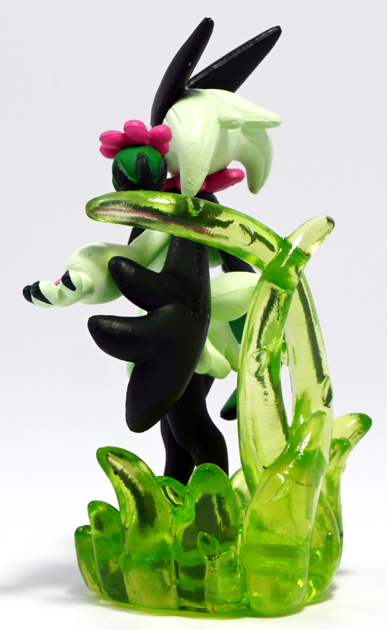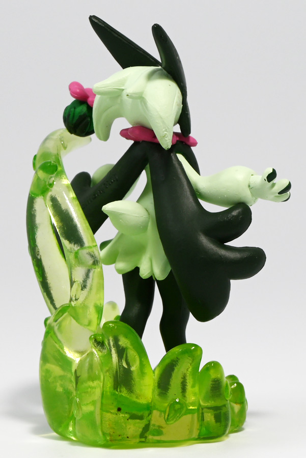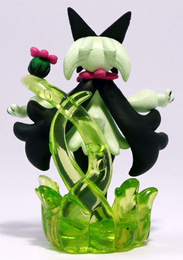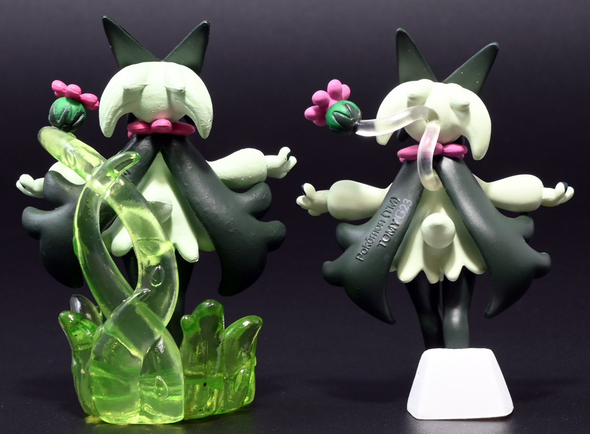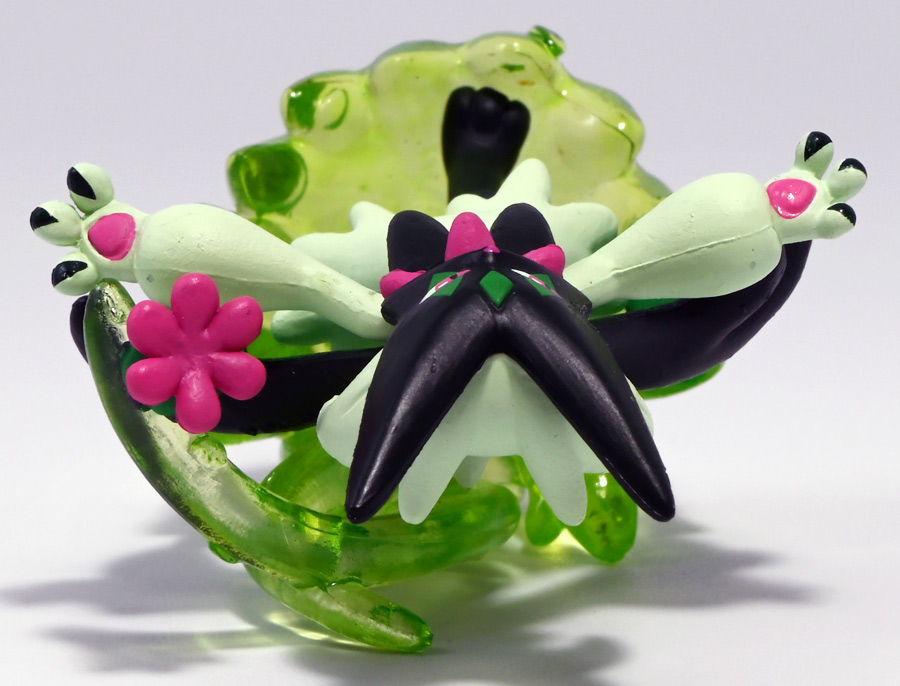 本商品はクリア台座に花爆弾が乗っているが、モンコレは背中から生えた透明な茎で支えられている。