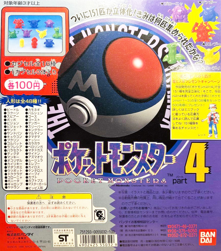 ■バンダイ 塩ビ人形 ポケットモンスターpart2 ![]() 初代ポケモン無彩色人形第2弾。 1回100円で無彩色人形3体入りの30種/全10カプセル×各成型色となっています。 「赤」のリザードンに続く第二弾と言う事で、メインビジュアルは「緑」のフシギバナですね。 ![]() 貴重なミニブックのスキャン画像。 今回はポケモンに加えてアイテム系も初ラインナップされています。 当時のイラストが載っているのも貴重な資料ぞよね! ![]() ガチャガチャ商品と言う事で発売日等の詳細な情報はよくわからないのだが、 アンケート締め切りが平成8年となっているので、その時期の商品と言う事がわかる。 当時のコロコロコミック1996年7月号(6月発売)のなかで「パート2発売中」と紹介されているので、 1997年1月まで2〜3か月ごとにリリースされていたと考えられる。 ![]() 第二弾は第一弾を補完する様な内容! ここで御三家中間進化が網羅され、はじまりの3匹進化形が揃う。 ![]() フシギソウ くさ・どく HP60 リザード ほのお HP58 カメール みずHP59 アーボ どく(ほのお) HP35 リザードが一番HPが低いのは意外な気もするが、 フシギソウは くさ=回復系のようなRPGイメージでHP高めなのかも。 ![]() ピカチュウの進化系・ライチュウもここで登場! アニメで主役級とも言えるニャースもラインナップ。 ![]() アーボック どく(ほのお) HP60 ライチュウ でんき(くさ) HP60 ダグトリオ じめん(ほのお) HP35 ニャース ノーマル(みず) HP40 ![]() 「株式会社ポケモン」は、任天堂、ゲームフリーク、クリーチャーズの3社が共同出資し、 1998年に「ポケモンセンター株式会社」として設立される。 本商品はそれ以前のポケモングッズとなり、ライセンス刻印も「任天堂」だ。 ![]() ガーディ ほのお HP55 ニョロゾ みず HP65 フーディン エスパー(みず) HP55 ワンリキー かくとう(ほのお) HP70 ![]() 首がめちゃ細いドードー。 ![]() ゴーリキー かくとう(ほのお) HP80 ウツドン くさ・どく HP65 ドードー ノーマル・ひこう HP35 パウワウ みず HP65 ![]() 塩ビ人形にはそれぞれキャップ穴が設けられており、鉛筆に装着する事ができる。 この手の無彩色人形は「消しゴム」と呼ばれる事も多いが、単なる通称でほんとはなんにも消せないぞよ。 ![]() 初代ポケモンでは進化後の豹変っぷりからインパクトの強いコイキング&ギャラドス。 この時点でかなりデザインが完成されているが、よく見るとギャラドスは髭がない。 もっとも、ゲームドットでもミニブックの公式絵でもちゃんと髭がついているので、これは造形時のミスか省略だろう。 ![]() サワムラー かくとう(ほのお) HP50 エビワラー かくとう(ほのお) HP50 コイキング みず HP20 ギャラドス みず・ひこう HP95 丁度ギャラドスを赤成型色で入手出来たのが嬉しいぞよな〜! ![]() ブイズ進化形がここで網羅。 これらは同ランナー収録だった。 オムナイトはシリーズ中でも特殊な一体で、ギミックは後述する。 ![]() シャワーズ みず HP130 サンダース でんき(くさ) HP65 ブースター ほのお HP65 オムナイト いわ・みず HP35 ごく初期のゲームドット絵で足ヒレがついていたシャワーズだが、 ここではすでにアニメ化以降に近いキャラデザとなっている。 ![]() 伝説の鳥ポケモン・フリーザーがここで登場。 151匹目のミュウも収録されている! 初代「ポケットモンスター赤・緑」の発売が、1996年2月末で、 ミュウが初めてコロコロのキャンペーンでプレゼントされるのが同年4月。 それと前後する発売と考えられる本商品で早速立体化もされている。 ミュウはもともと開発側が任天堂にも内緒でこっそり仕込んだ使う予定の無かったデータとされる。 これが予期せぬバグで出現するケースが頻発し、都市伝説的にミュウの存在が明らかになってしまったが為に、 配布に繋がった・・・というのが定説だ。 しかしミュウの存在自体は劇中ストーリーで示唆されているし、商品展開も早い事を鑑みるに、 もともと組み込まれた販促キャンペーンだったのではないかと言う気がしてならない。 ミュウの誕生秘話はゲームフリークの公式動画でも、ほぼ定説と同じ事が語られている。 これを見ると、もともとは「こんな催しができたらいいな〜」くらいのノリで考えられていたキャンペーンが、 ポケモンのヒットで早々に実現した、と言う話は半ば事実ではあるのだろう。 しかし実態として「ミュウの存在がバグで露見し、都市伝説的に噂されたが為に配布に繋がった」というのは あとから作られたドラマであり、ほとんどは公式側が主導したキャンペーンと捉えるのが自然な感も強い。 そもそも、ポケモンのゲームデザインを考えれば、 交換でしか入手できない隠しキャラがいる事は極めて自然だ (もちろん、当時としては画期的だったし、なんなら急に閃いて勢いで実装したのかもしれないぞよね!) と言う事でわたくしの考えとしては半分ほんとで半分作り話なのだろうという気がするぞよね! 正直真相は、当時の開発陣も話盛ってるうちに記憶がごっちゃになっちゃってて