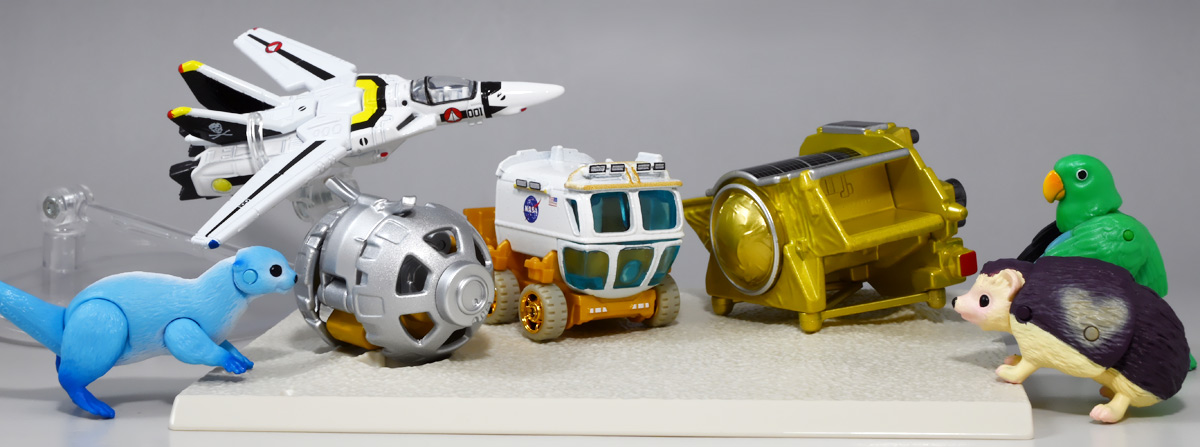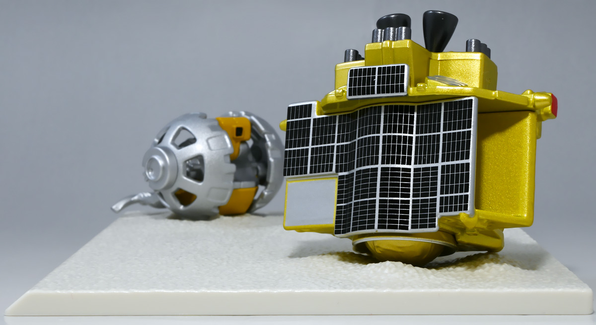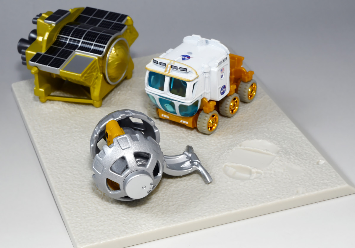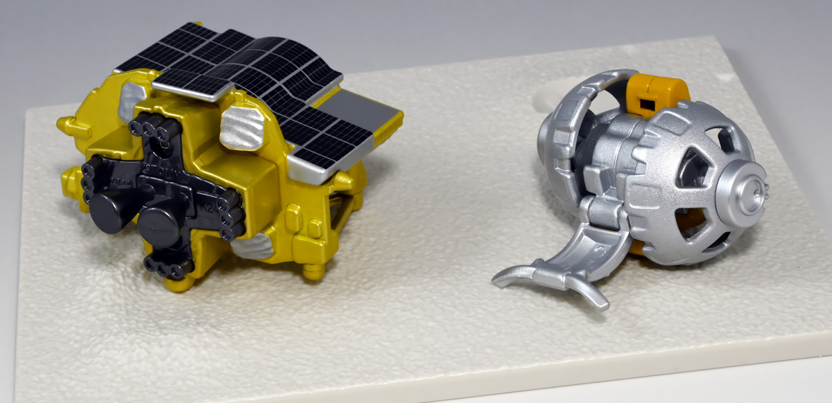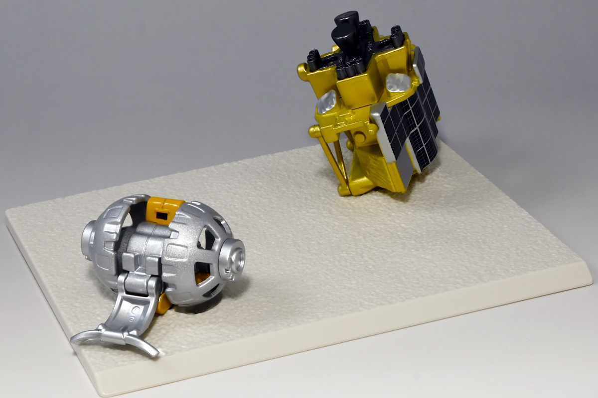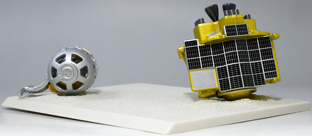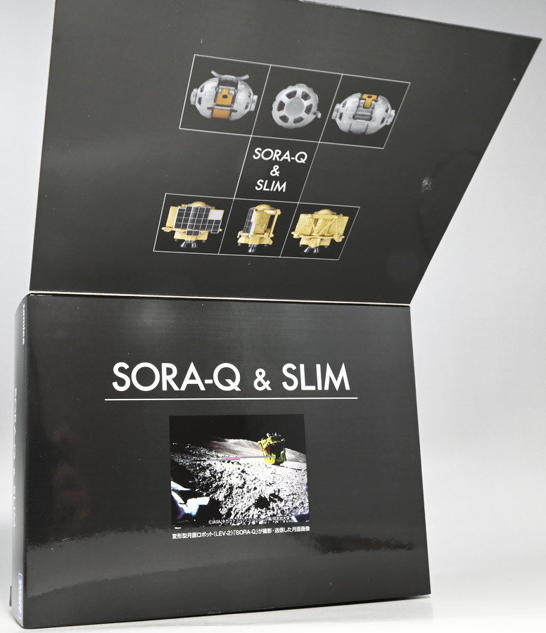 ■トミカプレミアム SORA-Q & SLIM ![]() こちらは2024年4月23日〜5月31日まで、タカラトミーモール他で受注予約された限定トミカプレミアム。 タカラトミーから実機玩具も発売されている「SORA-Q」と、 小型月着陸実証機「SLIM」をモチーフとしたここでしか手に入らないセットパッケージぞよ。 日本初の月面着陸実験から一周年となる、2025年1月20日(月)の着弾と言う事で、 すっかり忘れた頃にやってきた粋なトミカなのだ!! 価格は2750円(税込)ぞよ。 ![]() わたくしは宇宙ってアニメの宇宙しか興味ないぞよ。 従って宇宙関連のニュースもぼんやりとしか聞いていないのだが・・・ このトミカのモチーフとなった「SORA-Q」は、我らがタカラトミーがJAXA、ソニーグループ、同志社大学と共同開発しており、 実際に月面探査に加わった実機と同じモデルが玩具として販売されると言う事でわたくしも特別注目していたぞよ! 実機玩具のお値段は27500円と、戯れに買える値段じゃないので我慢しましたが・・・ それがトミカになると言われたら絶対欲しくなっちゃうぞよね!? って事で予約していたのだ! ![]() 限定物だけどパッケージもちゃんとした専用デザインの豪華箱となっている。 ![]() シールで封がされてあるのでブリスター窓になっているのかな・・・と思いきや、 ![]() パカっと開けると・・・な〜んだ絵しかないじゃん・・・と思いきや! こりゃ実物のSORA-Qが撮った月面写真の本物じゃないか! 粋な演出ぞよ〜! ![]() 中身はちゃんとブリスターで保護されています。 それでは早速見ていきましょう! ![]() まずはこちら! 可愛い変形型月面探査ロボの「SORA-Q」ぞよ! 前述の通り、タカラトミーが開発した変型メカぞよね! なんでも広報ではトランスフォーマーの技術が使われているとか宣伝される事が多かった。 パケの写真でも証明されたように、ちゃ〜んと月へ行って務めを果たしたおりこうさんぞよ! ![]() 「宇宙探査イノベーションハブ」とタカラトミーは2016年より 宇宙空間および地球上で活動できる安価な昆虫型ロボットの研究開発を行っていたが、 2019年にソニーグループが、2021年に同志社大学が加わり、最終的な成果として完成を見たのがこの「SORA-Q」であるぞよ! タカラトミーがこれまで開発してきた玩具で用いられているギミックを実際のロボットに落とし込んだ結果、 当初は昆虫型をベースとしていた機体は球体へと変更。 基本形態からの変形によって走行・ターンなどをごく小さなエネルギーで行えるようになり、 月面での活動も可能となったのだ! ![]() こうして完成した「SORA-Q」は球体モードで「SLIMミッション」への搭載が決定した。 これは月面低重力環境下における超小型ロボットの探査技術の実証実験であるぞよ。 着陸機SLIMから射出された球体SORA-Qは月面で展開モードに変形し、 斜面を転がって移動、搭載カメラで状況を撮影。 撮影画像を対になるもう一つの探査機「LEV-1」経由で地球に送信すると言うミッションが課せられていた。 トミカでは格納状態である完全な球体モードには変形できないが、 展開状態と走行形態などのギミックを簡易再現しているぞよ。 ![]() 月着陸実証機SLIMに搭載されたものは正式名称「LEV-2」 バネを伸縮させ月面移動し、地球へのデータ送信を目的とする「LEV-1」とそれぞれ役割分担して活動するぞよ。 タカラトミーが一般販売したLEV-2とほぼ同型機の市販モデルの商品名が「SORA-Q」となっている。 これは 宇宙を意味する「宙(そら)」と、宇宙に対する「Question(問い)」、「Quest(探求)」、 そして「球体」などを文字った愛称である。 また、シルエットが「Q」に似ている事もモチーフとなっているぞよ。 可愛いぞよね! 前述の通り、LEV-2=SORA-Qの開発に当たっては「ゾイド」や「トランスフォーマー」などのタカトミ玩具のノウハウが活かされていると言う。 しかし、タカトミが月面探査ロボの開発に関わる大元の切っ掛けとしては、 2007年にタカトミから発売された二足歩行ロボット「Omnibot 17μ i-SOBOT」の存在が大きかったとされているぞよ。 ![]() SORA-Qが形になるのは苦難の連続であったという。 形状を球体にした事で省エネ&小サイズ化には成功したものの、初期段階ではあんまり馬力が少なく、 ほんの小さな段差も乗り越える事が出来なかったのだ。 しかし、ある動物が突破口に繋がるヒントとなった! ・・・その動物とは・・・ なんとウミガメの赤ちゃん! ![]() 孵化したてのウミガメの赤ちゃんは、親が産卵の為に砂浜に掘った深い穴も器用に登ってゆく事が出来る。 その秘密は、左右交互に砂をかくヒレの動き! この動きをヒントに、SORA-Qは球体モードからボディを左右に分割し、 この割れたボディをタイヤとして、左右同時に回転させたり、交互に回転させたりする事で、 月面の砂をかいて力強くも器用に前進する事が出来るようになったのだ! ![]() SLIMから発進したSORA-Qは、月面に落ちてまずボディを左右に分割し、このようにスタビライザーを展開。 この尻尾は本体が転ばな