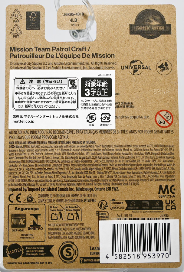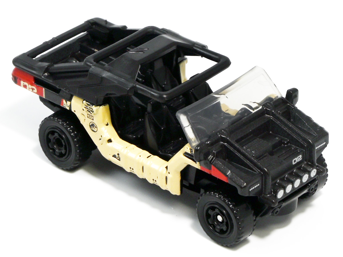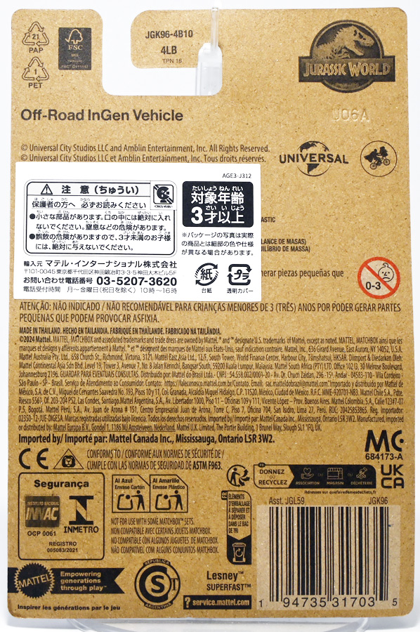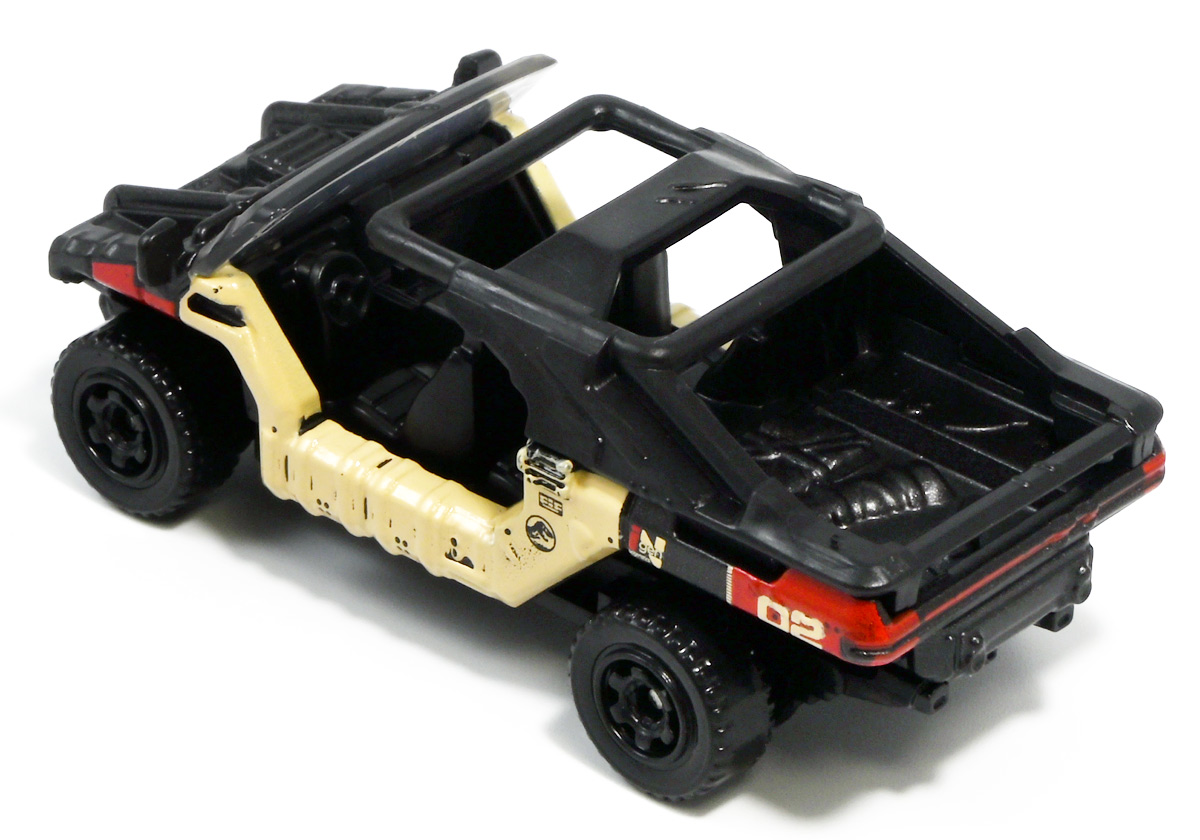 ■マッチボックス(Matchbox) ジュラシック・ワールド ベーシックカー インジェン社 オフロード ビークル Jurassic World Rebirth (2025) Off-Road InGen Vehicle ![]() 国内では2025年6月27日より販売開始されているマッチボックス・ジュラワアソートの一台。 今年は一台550円(税込)となっているぞよ。 ![]() 褐色のカード裏が格好良い。 国内販売向けに日本語シールが貼られています。 ![]() 早速開封! こちらは新登場の「インジェン社オフロードビークル」の2号車であるぞよ! 同時発売で「ジュラシックワールド5カーパック」3種が登場しており、 そのうちの1パックにはこのオフロードビークルのカラバリとなる3号車が封入されている。 しかし5カーパック版は側面しか彩色されておらず、 こちらの単品版はフロントとバックも彩色されているので豪華であるぞよ。 ちなみに前回(2022年)国内で販売されたジュラワ5カーパックは1499円だったが、 今年は爆裂に値上がりしており2530円となってしまったぞよ! 中身もイマイチぱっとしないし、庶民わたくし今回は泣く泣くスルーです!! ![]() このインジェンオフロードビークルは2025年8月8日国内公開の最新映画 「ジュラシック・ワールド/復活の大地」で新たに登場する車両。 本商品は映画公開に先駆けて国内販売されています。 名前から察するにインジェン社の野外調査用ビークルのようだ。 ![]() 車にさっぱり詳しくないわたくし、よく判らんがこれはどうもインジェン社の特注ビークルのようである。 しかし撮影に際して自走可能な本物が製作されているみたい。 元の車両がなんなのかは既に映画を鑑賞した海外ファンの間でも色々噂されているようだ・・・ が、本場のキミたちにわからんものがこのわたくしに判る訳がない! と言う事でなんもわからんがご愛敬である。 ![]() なにせこのレビューを書いている7月末現在、日本ではまだ映画が公開されておらず、 このビークルはPVに影も形も無いからして、どんな活躍をするかも不明なのだ。 色々想像を膨らませて映画公開を待とうではないか! ![]() このビークルは他にもマテルから大きな玩具も出ている。 今度の映画ではモササウルスに襲われる船と同じくらいメイン級のメカになるのかもしれないぞよ。 ![]() 内装や荷物もモールド再現されています。 ![]() なんかゾウが彫られている。 こりゃどうもタイ工場で作っている証と言う事である。 かわいいぞよね! ![]() サイドにはジュラシックマークやインジェン社ロゴがプリントされているぞよ。 ちなみにアソート24台中このビークルは4つ入っています。 ![]() と言う事で比較的入手は容易なのです。 ![]() 歴代映画メイン級ビークル。 大体みんなひっくり返されて破壊されてしまうので今回もきっと車は酷い目に合うのだろう! ![]() 「新たなる支配者」で登場したジープグラディエーターと積んでるアイテムがちょっと似ている。 なぜか毎回チェンソーを積んでいるぞよ。 同アソートからは他にも二台摘んだので合わせて紹介。 ↓レビューへ続くぞよ! :このリンクを踏んで何かポチるとわたくしにささやかな報酬が入りサイトの運営費となるのでよろしくぞ! ・「マッチボックス(Matchbox) ジュラシック・ワールド ベーシックカー」 ・「マッチボックス(Matchbox) ジュラシック・ワールド 5パック アソート」 ▲TOP |