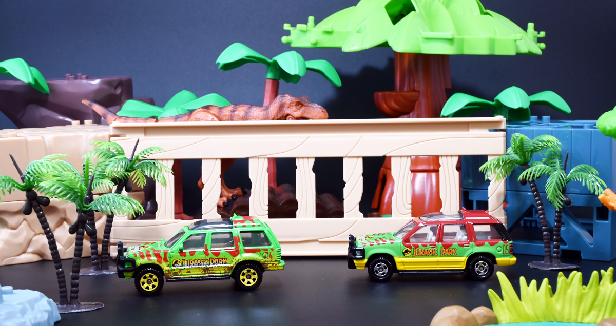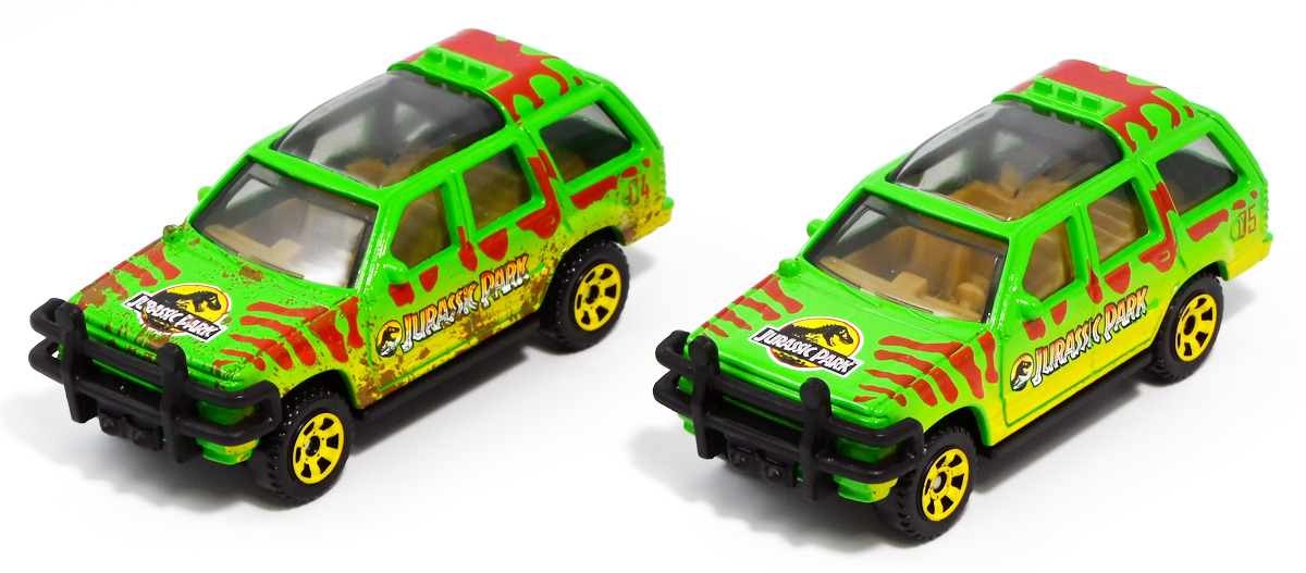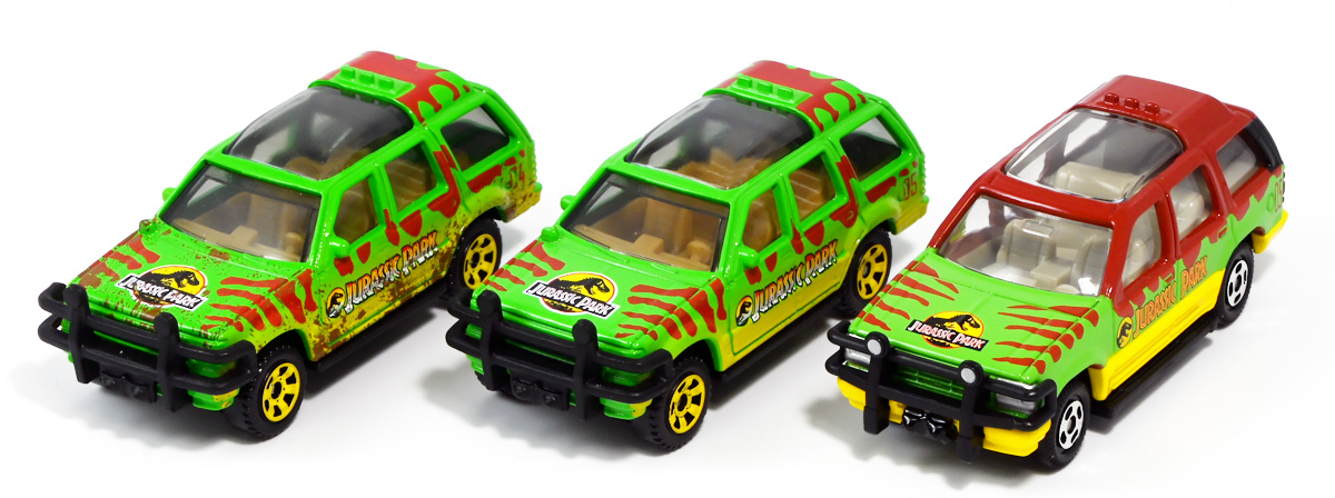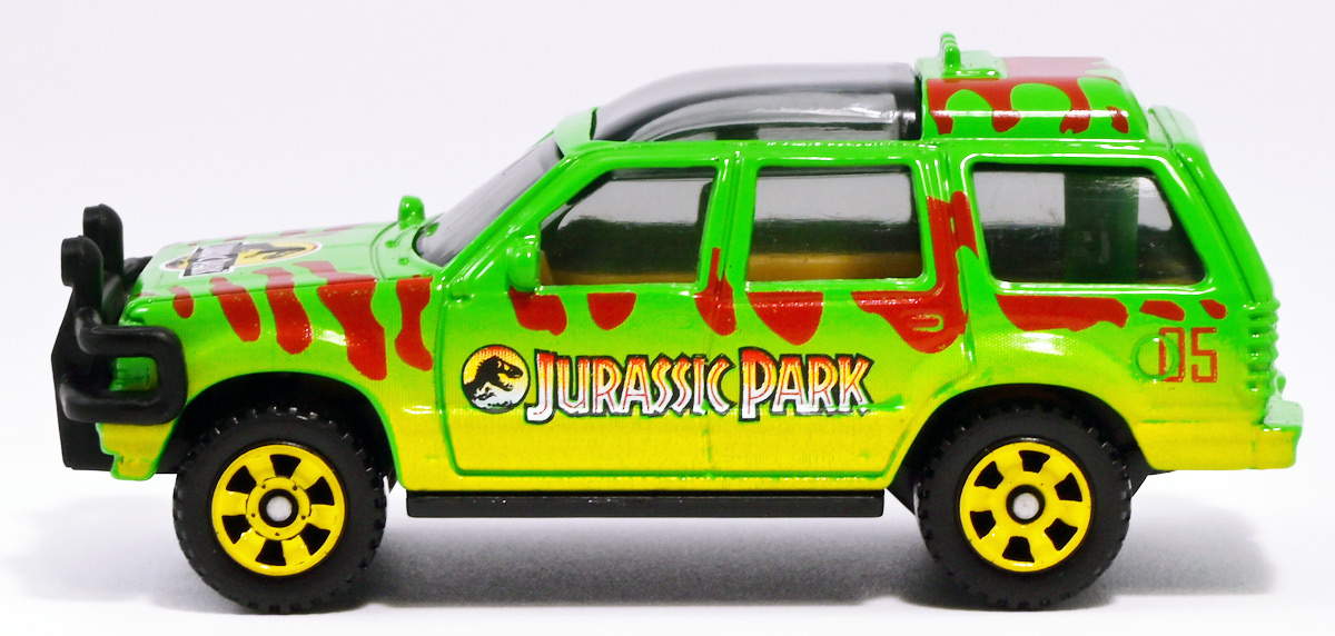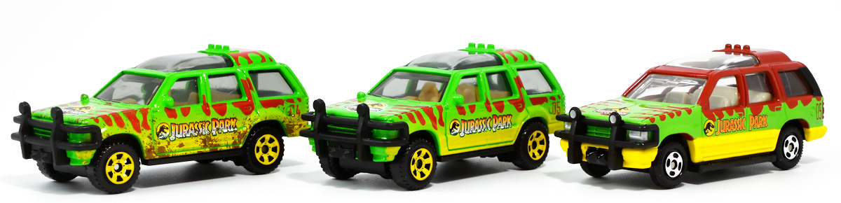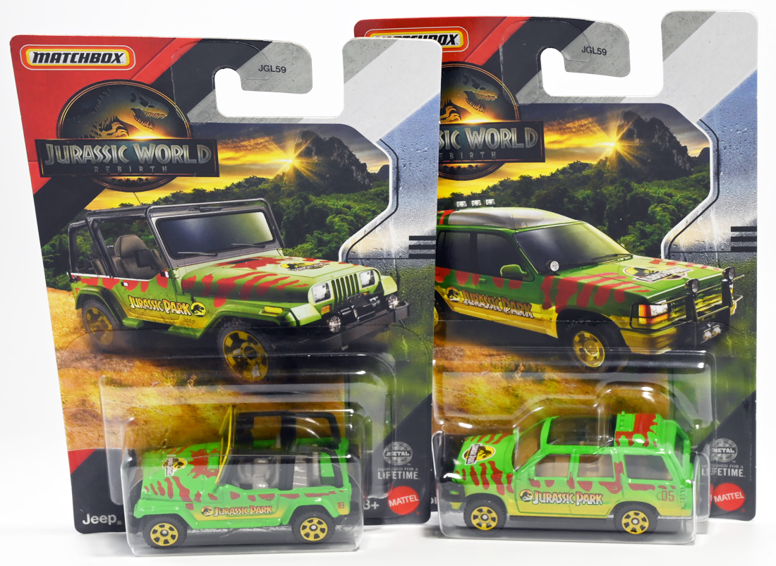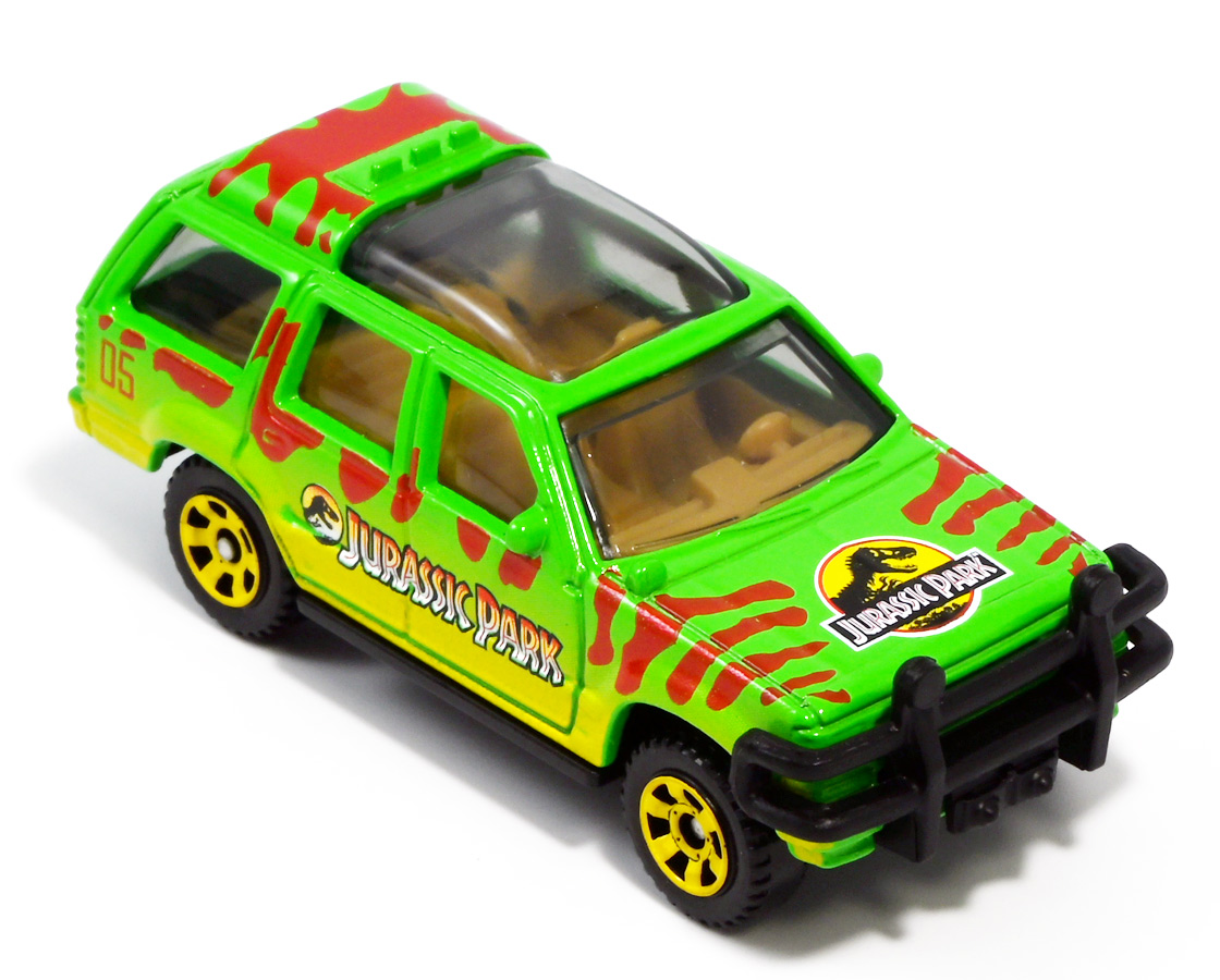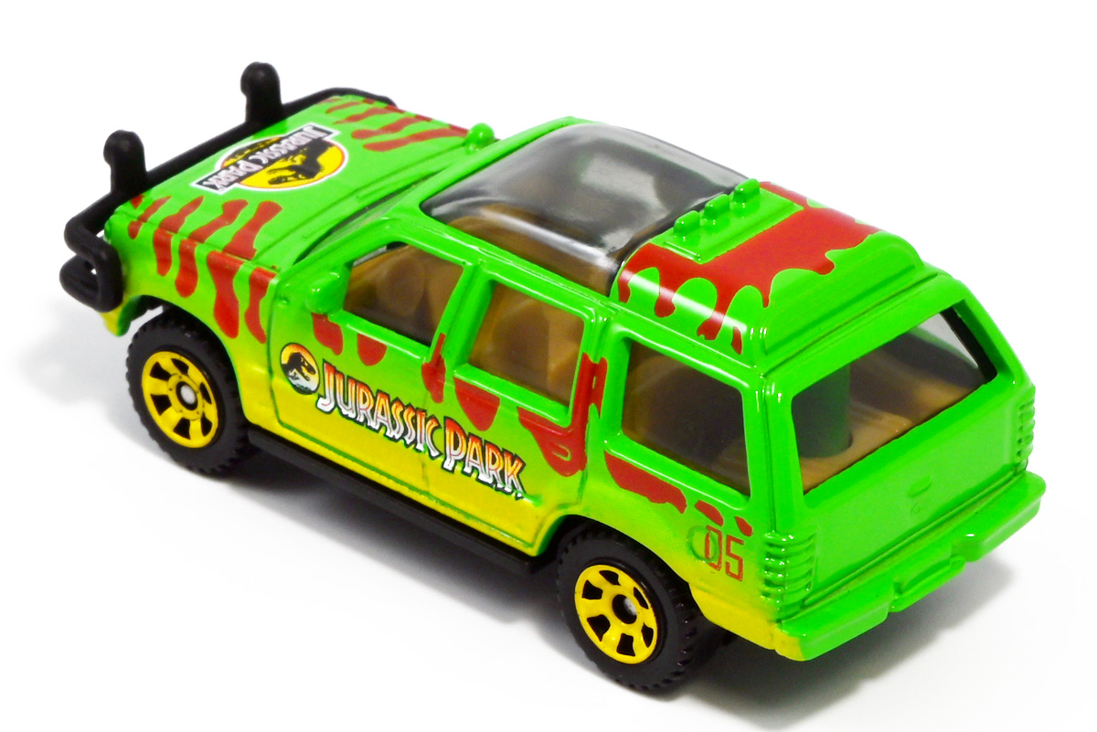 ■マッチボックス(Matchbox) ジュラシック・ワールド ベーシックカー フォードエクスプローラー(#5) Jurassic World Rebirth (2025) Ford Explorer (#5) ![]() 2025年6月27日発売 / 550円(税込) 映画「ジュラシック・パーク」に登場したフォードエクスプローラー5号車がマッチボックスで登場! ![]() こちらは新規アイテムでなく過去弾の再録。 24台アソート中には3つ入っているぞよ。 2022年にはトイザらスでひっそり販売されるばかりだったマッチボックス・ジュラシックワールドだが、 この2025年は映画復活一本目と言う事であちこちのお店で取り扱いがある。 しかしAmazonではベーシックカーは24台アソートボックス13200円の販売のみ。 5カーパック2530円は3種どれかがランダムで着弾する仕様。 ヨドバシカメラ他は単品通販もあるが、やはりアソートアイテムのどれかがランダムで届く仕様で実に買いにくい! 好きな奴を摘むには店舗に出向くしかないぞよ。 ![]() 今回のアソートにはジュラパ柄のジープも入っています。 謎のカラバリぞよ。 マッチボックスジュラワベーシックカーは7月26日に第二弾も国内販売開始。 モササウルスに襲われる船などがラインナップされているぞよ。 ![]() パカっと開封! こちらは映画「ジュラシック・パーク(1993)」に登場したフォードエクスプローラーの5号車だ! 「ジュラシックパーク」の園内で恐竜を見物する為に運用される筈だったツアービークル車両で、 1992年型フォードエクスプローラーXLTを元に、 レールの上を走行する電気自動車仕様に改造されているぞよ。 高い静音性を誇る為恐竜に気づかれる事なくパーク内を自動巡回できる筈だったが、 これが仇となり、劇中では停電トラブルのせいで動かなくなってしまったのだ。 ![]() 停車したツアービークルへ、停電で機能停止した電気柵をすり抜けたT-レックスが迫るシーンは劇中屈指の名場面! 劇中に登場する4号車と5号車のうち、4号車は無惨に破壊され、崖から転落してしまうが、 グラント博士とマルコム博士が乗っていたこちらの5号車は無傷で放置されフェードアウト。 後にジュラシック・パークのあったイスラ・ヌブラル島は火山噴火で壊滅した為、 もしこの5号車が生きていても、「ジュラシック・ワールド」で再登場した4号車同様 溶岩に飲み込まれてしまったかもしれないぞよ。 ![]() と言う事で印象深いビークルだが恐らく本編登場は二度と望めない車両なのです。 新作映画「復活の大地」では前作までの設定を引き継ぎながらも、 「恐竜が世界中に拡散した」と言う要素はドラマに活かせないまま強引なリセットがかかるらしい。 こんな事ならイスラ・ヌブラル島やビークルも崩壊などさせず大事に取っておけばまた象徴的に再利用もできたものを・・・。 つくづく勿体ないと言わざるを得んぞよ!! ![]() 車体には名作「ジュラシック・パーク」のロゴが刻まれている。 劇中の恐竜動物園のロゴが映画のロゴでもあるってオシャレぞよね〜。 ![]() しかしこのビークル、全体的に色が足りない。 国内販売550円もしてこの仕様は物足りないと言わざるを得んぞよよよよ・・・。 ![]() トップ。 色は足りないがちゃんとガラスルーフ仕様になっており内装が覗ける。 T-レックスに悪戯された時これがパコっと外れちゃうのは脚本にないアクシデントだったようだが、 そのまま本編映像に採用されているぞよ。 ![]() シャーシにはやはりゾウさんがおりますよ。 ![]() ボンネットにもジュラシックロゴが入っている。 ![]() ホイールがちゃんと黄色でそこは偉いぞよ。 ![]() 4号車の泥はねバージョンと並べて〜。 こちらは前回2022年国内販売の「ランド&エアーチーム」に入っていたもの。 今回の5カーパックにもやはり4号車の泥はねバージョンが入っているパックがありました。 ちなみにこのマッチボックスツアービークル4号車には T-レックスの襲撃を受けて破壊されたクラッシュバージョンも存在するのだが・・・、 今回もやはり国内には入ってきていないようだ! お、おい〜っ! マテルーっ!! どうしてそんな意地悪な事をするぞよ? みんなが欲しいのはクラッシュバージョンのツアービークルなのに・・・ ちゃんと単品販売してくれぞよーっ! どうせすぐ狩られて買えないんだからアソートに10個くらい入れといてくれや!! ![]() そんなツアービークルは1/32ミニカーも出ています。 こちらは「JADA TOYS 1/32 1993 フォード エクスプローラー "ジュラシック・パーク"」ぞよ。 ご覧の通り色もちゃんと塗られており、アンテナも生えていて立派なツアービークル。 これが2000円くらいで買えるのだからわたくしの様な庶民向けには決定版的ミニカーではないか! 比べるとマッチボックスは屋根の色も足りなければ下側の黄色も側面しか塗られていないと言うコストカットぶりでトホホぞよ。 ![]() ともあれこれでマッチボックスの4号車と5号車がわたくしのお部屋にも揃ったぞよ! 早速並べてジュラパごっこだ!! ![]() 出たぞ! T-レックスの襲撃だッ!! おろかなにんげんどもは成す