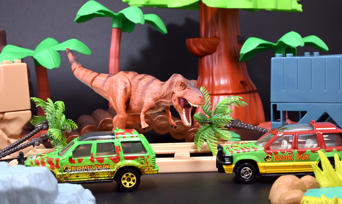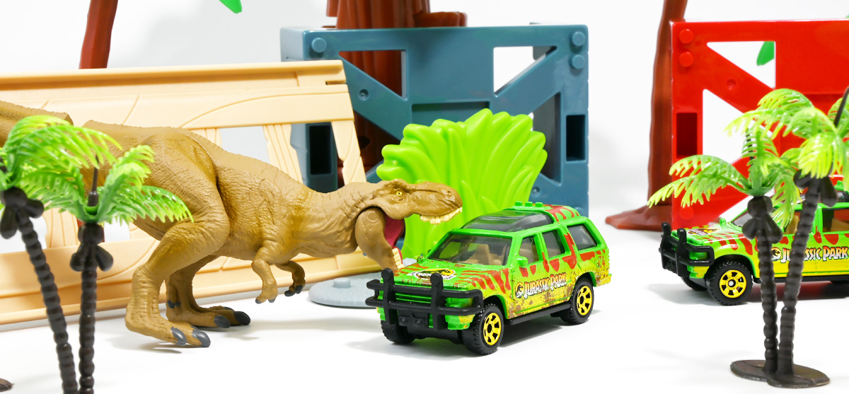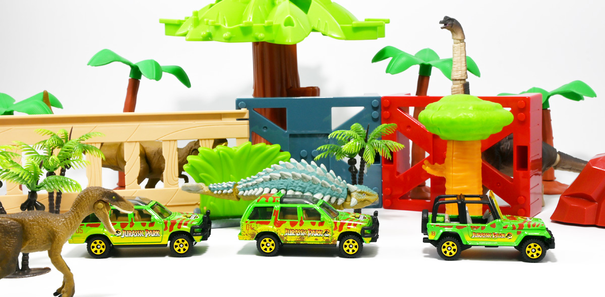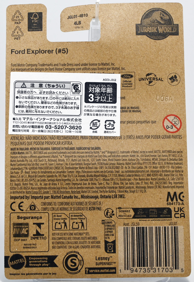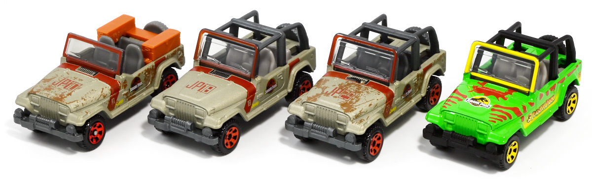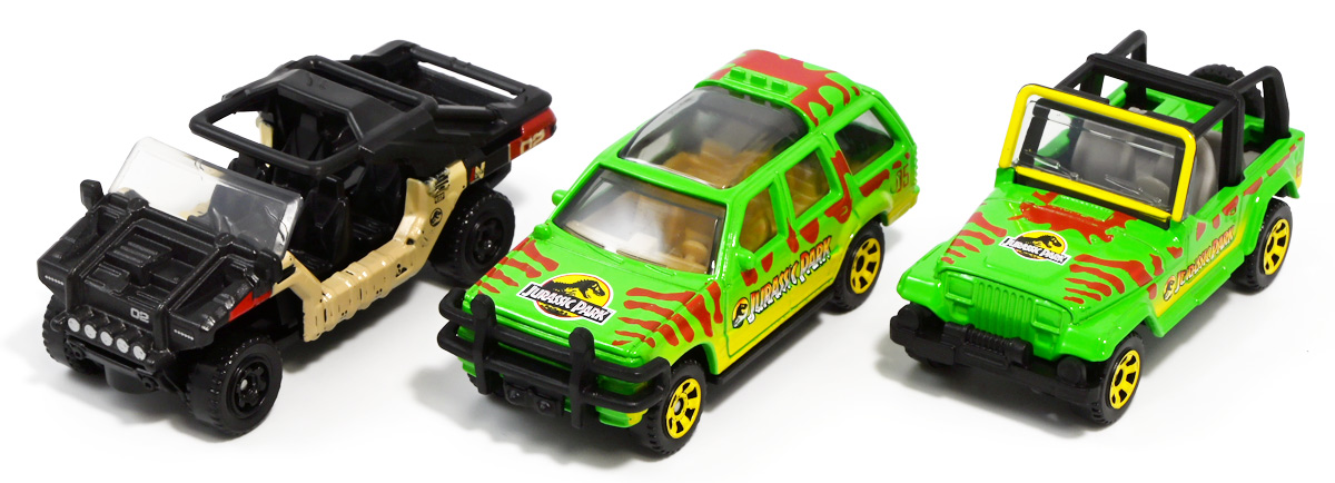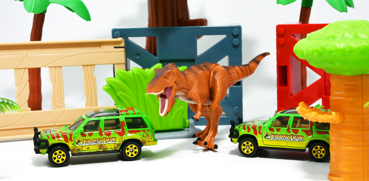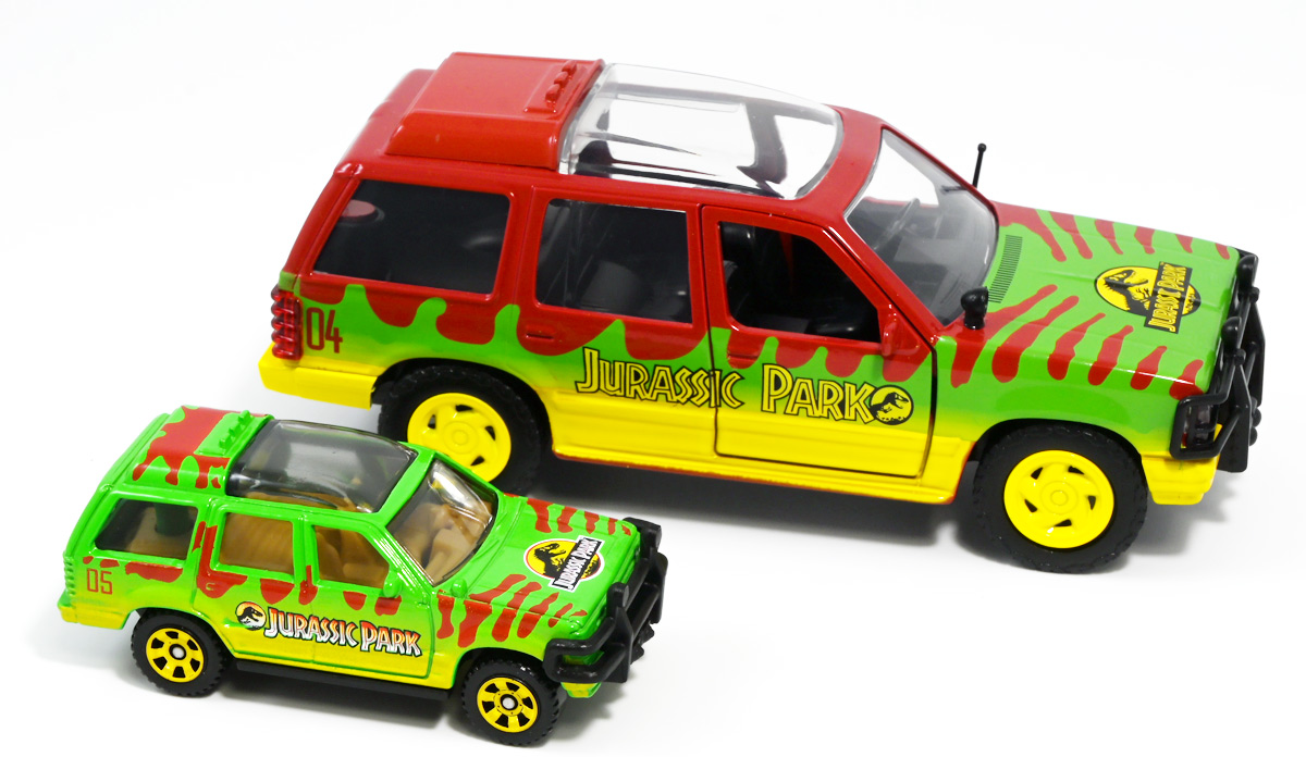 ■マッチボックス(Matchbox) ジュラシック・ワールド ベーシックカー フォードエクスプローラー(#5) Jurassic World Rebirth (2025) Ford Explorer (#5) ![]() 2025年6月27日発売 / 550円(税込) 映画「ジュラシック・パーク」に登場したフォードエクスプローラー5号車がマッチボックスで登場! ![]() こちらは新規アイテムでなく過去弾の再録。 24台アソート中には3つ入っているぞよ。 2022年にはトイザらスでひっそり販売されるばかりだったマッチボックス・ジュラシックワールドだが、 この2025年は映画復活一本目と言う事であちこちのお店で取り扱いがある。 しかしAmazonではベーシックカーは24台アソートボックス13200円の販売のみ。 5カーパック2530円は3種どれかがランダムで着弾する仕様。 ヨドバシカメラ他は単品通販もあるが、やはりアソートアイテムのどれかがランダムで届く仕様で実に買いにくい! 好きな奴を摘むには店舗に出向くしかないぞよ。 ![]() 今回のアソートにはジュラパ柄のジープも入っています。 謎のカラバリぞよ。 マッチボックスジュラワベーシックカーは7月26日に第二弾も国内販売開始。 モササウルスに襲われる船などがラインナップされているぞよ。 ![]() パカっと開封! こちらは映画「ジュラシック・パーク(1993)」に登場したフォードエクスプローラーの5号車だ! 「ジュラシックパーク」の園内で恐竜を見物する為に運用される筈だったツアービークル車両で、 1992年型フォードエクスプローラーXLTを元に、 レールの上を走行する電気自動車仕様に改造されているぞよ。 高い静音性を誇る為恐竜に気づかれる事なくパーク内を自動巡回できる筈だったが、 これが仇となり、劇中では停電トラブルのせいで動かなくなってしまったのだ。 ![]() 停車したツアービークルへ、停電で機能停止した電気柵をすり抜けたT-レックスが迫るシーンは劇中屈指の名場面! 劇中に登場する4号車と5号車のうち、4号車は無惨に破壊され、崖から転落してしまうが、 グラント博士とマルコム博士が乗っていたこちらの5号車は無傷で放置されフェードアウト。 後にジュラシック・パークのあったイスラ・ヌブラル島は火山噴火で壊滅した為、 もしこの5号車が生きていても、「ジュラシック・ワールド」で再登場した4号車同様 溶岩に飲み込まれてしまったかもしれないぞよ。 ![]() と言う事で印象深いビークルだが恐らく本編登場は二度と望めない車両なのです。 新作映画「復活の大地」では前作までの設定を引き継ぎながらも、 「恐竜が世界中に拡散した」と言う要素はドラマに活かせないまま強引なリセットがかかるらしい。 こんな事ならイスラ・ヌブラル島やビークルも崩壊などさせず大事に取っておけばまた象徴的に再利用もできたものを・・・。 つくづく勿体ないと言わざるを得んぞよ!! ![]() 車体には名作「ジュラシック・パーク」のロゴが刻まれている。 劇中の恐竜動物園のロゴが映画のロゴでもあるってオシャレぞよね〜。 ![]() しかしこのビークル、全体的に色が足りない。 国内販売550円もしてこの仕様は物足りないと言わざるを得んぞよよよよ・・・。 ![]() トップ。 色は足りないがちゃんとガラスルーフ仕様になっており内装が覗ける。 T-レックスに悪戯された時これがパコっと外れちゃうのは脚本にないアクシデントだったようだが、 そのまま本編映像に採用されているぞよ。 ![]() シャーシにはやはりゾウさんがおりますよ。 ![]() ボンネットにもジュラシックロゴが入っている。 ![]() ホイールがちゃんと黄色でそこは偉いぞよ。 ![]() 4号車の泥はねバージョンと並べて〜。 こちらは前回2022年国内販売の「ランド&エアーチーム」に入っていたもの。 今回の5カーパックにもやはり4号車の泥はねバージョンが入っているパックがありました。 ちなみにこのマッチボックスツアービークル4号車には T-レックスの襲撃を受けて破壊されたクラッシュバージョンも存在するのだが・・・、 今回もやはり国内には入ってきていないようだ! お、おい〜っ! マテルーっ!! どうしてそんな意地悪な事をするぞよ? みんなが欲しいのはクラッシュバージョンのツアービークルなのに・・・ ちゃんと単品販売してくれぞよーっ! どうせすぐ狩られて買えないんだからアソートに10個くらい入れといてくれや!! ![]() そんなツアービークルは1/32ミニカーも出ています。 こちらは「JADA TOYS 1/32 1993 フォード エクスプローラー "ジュラシック・パーク"」ぞよ。 ご覧の通り色もちゃんと塗られており、アンテナも生えていて立派なツアービークル。 これが2000円くらいで買えるのだからわたくしの様な庶民向けには決定版的ミニカーではないか! 比べるとマッチボックスは屋根の色も足りなければ下側の黄色も側面しか塗られていないと言うコストカットぶりでトホホぞよ。 ![]() ともあれこれでマッチボックスの4号車と5号車がわたくしのお部屋にも揃ったぞよ! 早速並べてジュラパごっこだ!! ![]() 出たぞ! T-レックスの襲撃だッ!! おろかなにんげんどもは成す