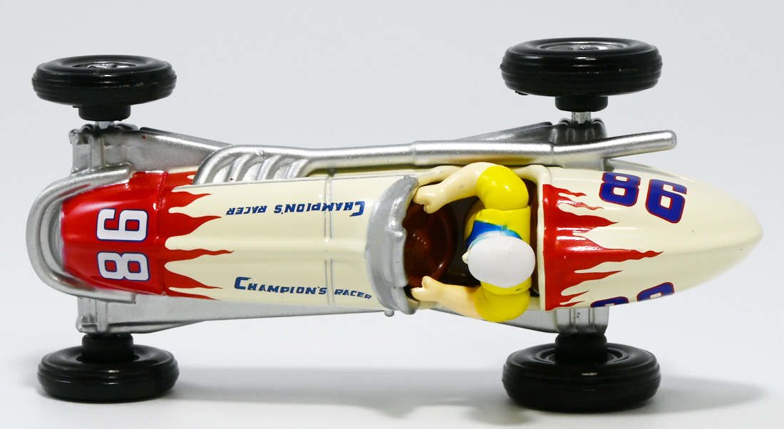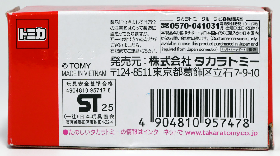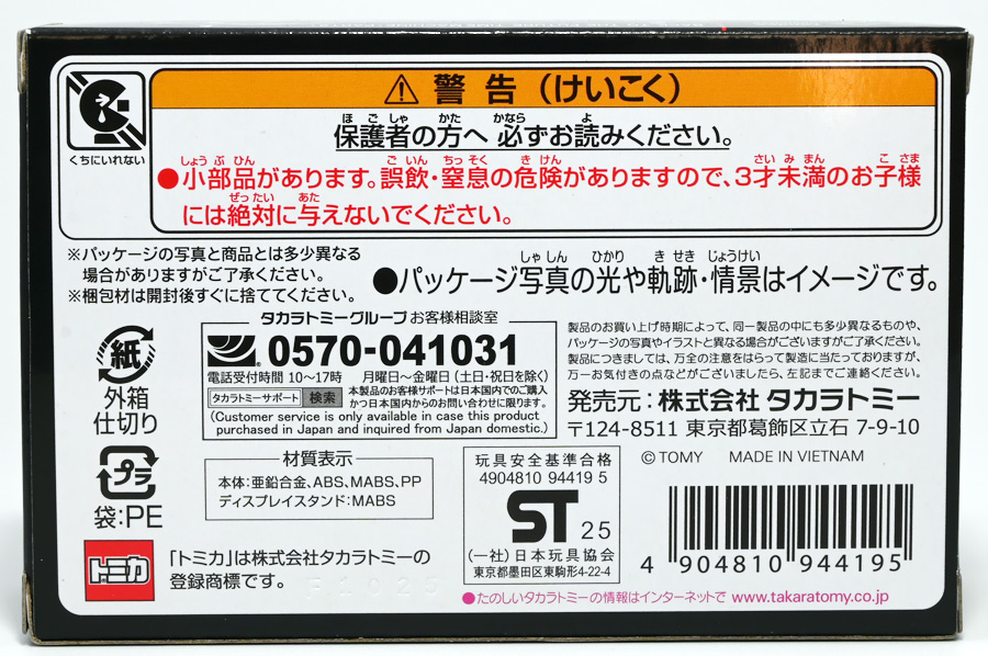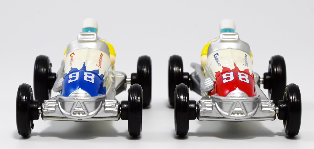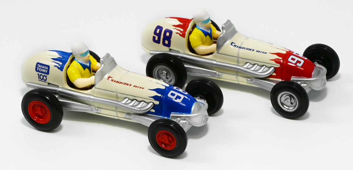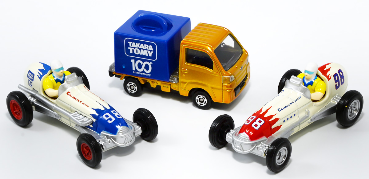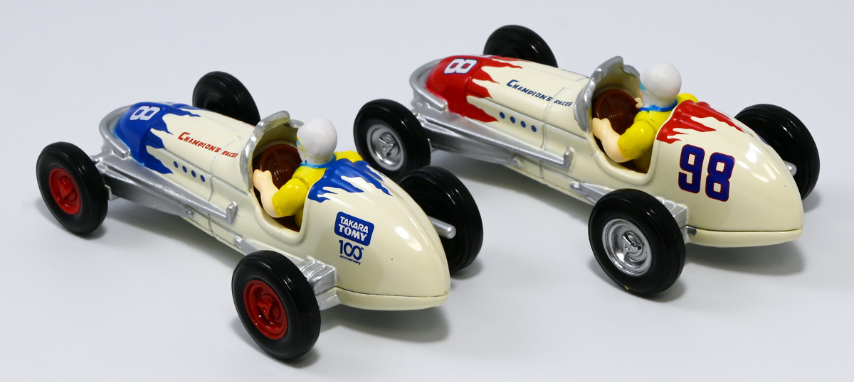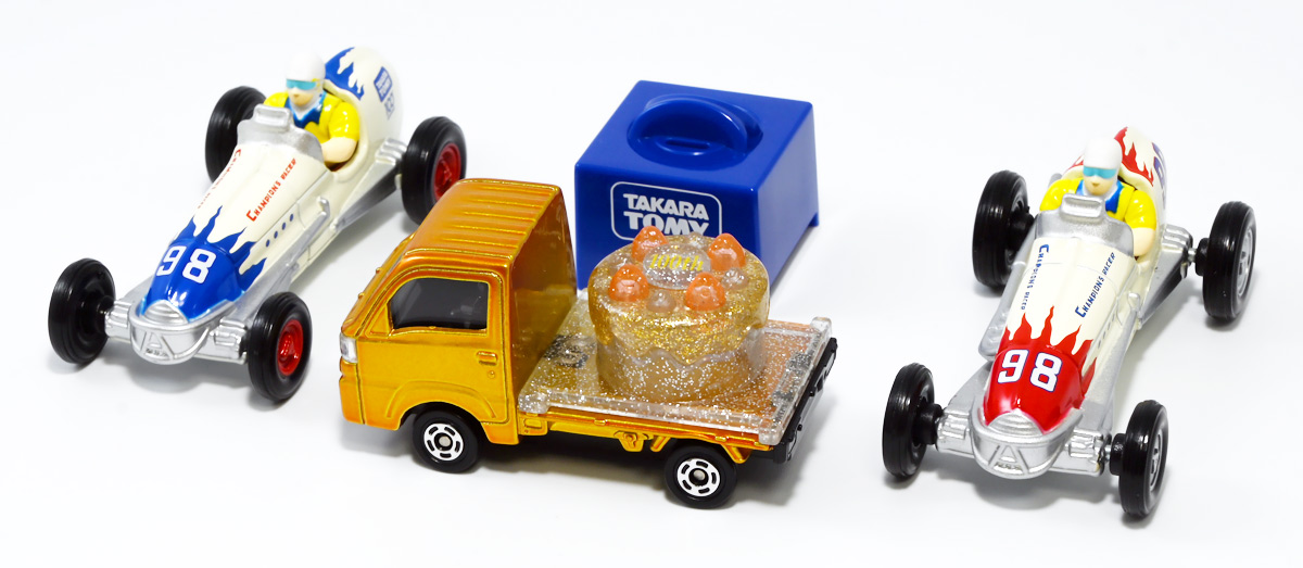 ■トミカ チャンピオンレーサートミカ / トミカ チャンピオンレーサートミカ BLUE Ver. ![]() 2024年7月13日発売 / 各1320円(税込) タカラトミー100周年を記念してトミカから特別な商品が登場! 1953年に発売し大ヒットを記録したブリキ製レースカーを再現したトミカぞよ! ![]() 最初に言っとくとこれらのトミカ、出来は全然悪くない。 しかしちょっと値段が高いのとモチーフのブリキ玩具がトミカファンには刺さらなかったようで、 哀れな事に各販売店で投げ売りされてしまったぞよ。 何を隠そうわたくしも一台200円だか300円だかでゲットしたのだ! ちなみにこのセールは現在進行形で、2025年11月になってもその辺の通販で300円くらいで買えちゃうぞよよよよ・・・。 ![]() パッケージは横長の大きな箱で豪華なのですが・・・。 ![]() ぱかっと開けるとタカトミ会長である富山幹太郎氏の写真と共にメッセージも入っている。 窓から中身も覗けるしほんと豪華なパケぞよね! ![]() ちなみにこの人はトミー創業者・富山栄市郎氏の孫であるぞよ。 ま〜玩具史的にも象徴的な記念アイテム的な事なんだけど トミカファンにはイマイチピンとこなかったみたいぞよね〜。 ![]() ブリスターに収まっています。 ![]() まずはスタンダードな赤バージョン。 モチーフとなった「Champion’s Racer No.98」はトミーの前身である富山玩具製作所が1953年に発売したブリキ玩具。 なんでも昭和27年の第36回インディー500で優勝したレーシングカーをモデルとしているみたいぞよ。 だからチャンピオンレーサーって言うぞよね! ![]() 1999年にトミーからこのブリキ玩具の復刻版が関係者のみに配られた事もあり、 象徴的なモチーフとなっているのだ。 ![]() ダイキャスト製でずっしり重く、かなり満足度は高い一品となっている! ![]() こっちのブルーバージョンは現タカラトミーのロゴをモチーフとしたカラバリ。 当時のデザインを可能な限り再現したと言う赤バージョンと比べると、 より100周年記念に重きを置いた特別デザインと言えるぞよ。 ![]() トップ。 プリントなども凝っていてなかなかかっこ可愛い一台では無いか! ![]() ホイールも赤くなっている。 ![]() 二台並べて〜。 せっかく記念に作って出来も良いのに投げ売りは可哀想ぞよね! ま〜・・・わたくしも予約開始日はスルーして、セールで目について買ったクチであるが・・・。 ![]() ブルーバージョンは「98」の部分がタカトミロゴ&100周年記念ロゴに置き換わっている。 ![]() 玩具史的には象徴的なモチーフっぽいが、過去のブリキ玩具ブームもなんとなく過ぎ去った感があるし、 もうちょい公式ページで玩具の歴史を突っ込んで紹介してくれていたら捌けていた気がしないでもない。 普通の人はこんなの知らないぞよよ!! ![]() 造形も彩色も豪華で可愛いトミカではありますぞよ。 ![]() それにしても玩具を作り続けて100年とは歴史を感じるぞよね! ![]() 運転席やドライバーフィギュアも丁寧仕上げ。 ![]() 100周年記念と言えば・・・この年の優待トミカも100周年記念仕様だったぞよ。 中でもこのケーキカーの金ピカカラバリは見所がある。 ![]() ぱかっと開けると100周年記念のラメラメケーキが出てくるのだ! この金ピカ仕様は一般販売版の「タカラトミー100周年記念トミカセット」に合わせたカラバリみたいぞよね。 なんとなく載せそびれたまま2025年も終わりに近づいてしまったのでここで消化しておくぞよ!! :このリンクを踏んで何かポチるとわたくしにささやかな報酬が入りサイトの運営費となるのでよろしくぞよ! ・「タカラトミーチャンピオンレーサートミカ BLUE Ver.」 ・「ホットウィール(Hot Wheels) マテル80周年 5パック」 ▲TOP |