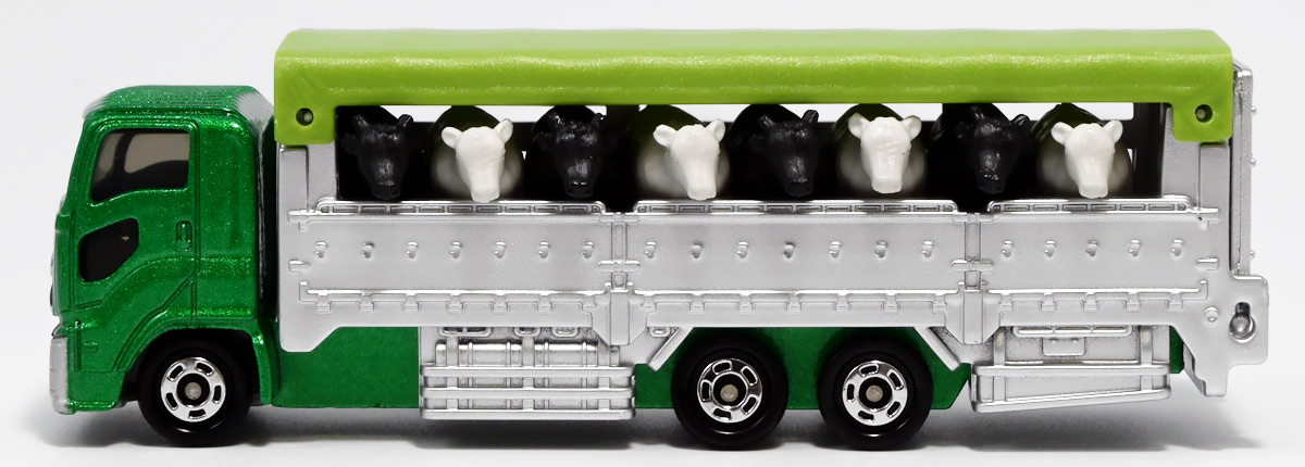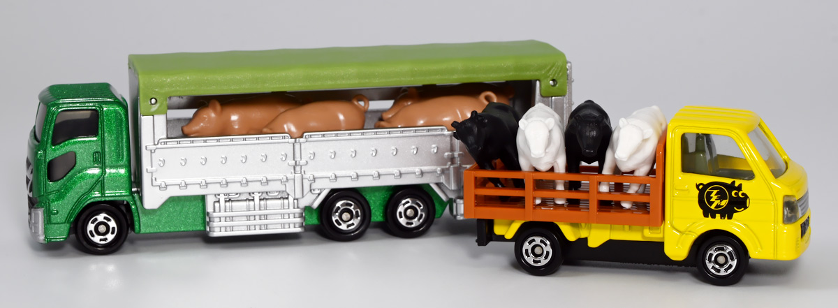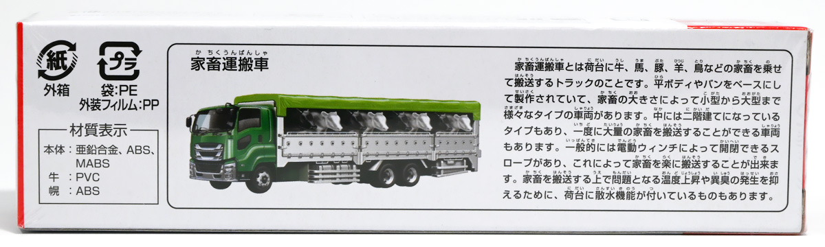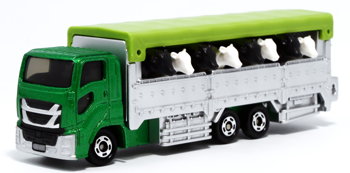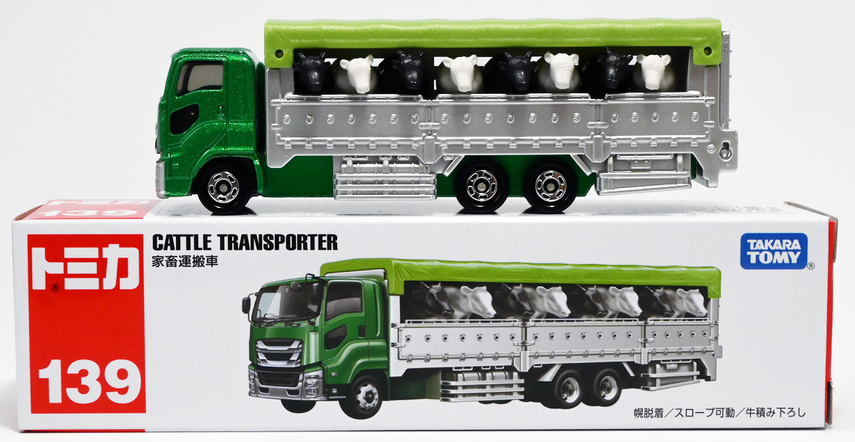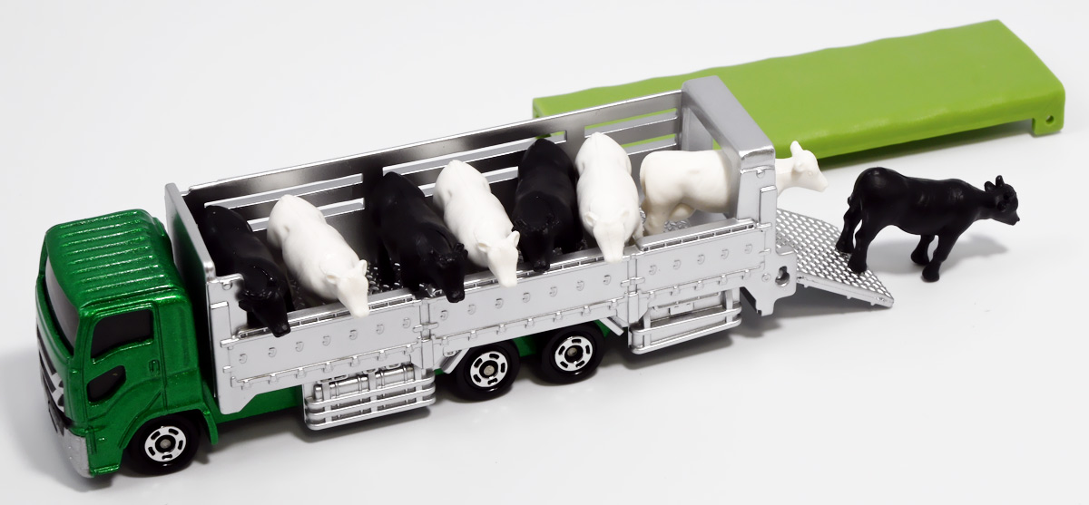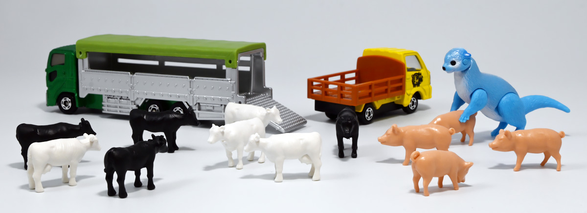 ■ロングタイプトミカ No.139 家畜運搬車 ![]() 2019年9月21日発売 / 1100円(税込) ロングタイプトミカで新たに登場したロングな家畜運搬車! おまけ&ギミックもりもりの傑作ぞよ!! ![]() パケ裏には解説が入っていて勉強になるぞよ! ![]() 対象年齢3才以上! ![]() 集めよう! 楽しさいっぱい! ミニカーの王様 ![]() それではパカっと開封! おまけがいっぱい入っている! ![]() ロングタイプ「家畜運搬車」! その名の通りおろかなにんげんどもが糧とする家畜達を運ぶための運搬車であるぞよ! 運ぶものは牛、馬、豚、羊、鳥など様々だが、本商品では白黒の牛さんフィギュアを運搬している。 ![]() 衛生管理が簡単で洗浄しやすく、 また腐食しにくいステンレス製やアルミ製ボディがシルバー彩色で再現されている。 このギラギラ感、たまらんぞよね! フィギュアを乗せるとちゃんと牛さんの頭が覗くようになっていて可愛いぞよ。 ![]() 特徴的なフロントからキャブのモチーフは「いすゞ・ギガ」大型トラックみたいぞよ。 本商品では緑のラメ塗装で可愛い感じ。 ![]() 荷台のディテールなど実に良く出来ている。 トミカでは片側が開閉、もう片側は柵で塞がっており牛の向きが決められているが、 実車は普通左右対称みたいぞよ。 ![]() おろかなにんげんどもが牛乳を飲めるのも焼き肉を食えるのも、 陰でこの運搬車が働いているからこそぞよ! 日常を支える立派なお仕事なのだ!! ![]() 牛が暴れてもびくともしない堅牢なリアハッチ。 ![]() ボトム。 箱にライセンス記載はないがシャーシにはちゃんと「ISUZU GIGA」とモチーフの刻印がある。 スケールは1/90のようだ。 ![]() パカっと開封! なんと帆の着脱が可能となっている! これにより牛フィギュアの乗り降りが出来ると言う訳ぞよ! ![]() 荷台内部はべこちゃんが滑らないように滑り止めがついています。 細かい所まで良く出来ているぞよ! ![]() おまけの牛フィギュア、黒牛と白牛で二体入っている。 わたくしはてっきり白黒の色違いで2種入っているだけと思っていたが・・・、 ![]() よく見ると造形が違う!! 黒牛はオス、白牛はお乳が造形されていてメスじゃないか!! なんと凝った仕様であるぞよ! ![]() 黒毛和牛と白い乳牛と言うワケぞよね! 国内の乳牛は殆どホルスタインでまだら模様が普通だが、 本商品はおまけなので無彩色フィギュアなのはご愛敬だ! ちなみにイベントモデルとして本商品のカラバリ「トミカ牧場動物移動トラック (うま)」も出ており、 そちらには茶色と黒の馬フィギュアがおまけに入っているぞよ。 ![]() リアハッチのスロープが展開し、牛の積み下ろし遊びが楽しめるぞよ!! これ一つで牧歌的な情景が作れる良いセットではないか〜。 ![]() 牛を綺麗に並べる時は帆を外して整頓しましょう! トラック自体も2パターンで遊べる良いトミカ。 何か他のフィギュアを乗せて遊んでも楽しいぞよね! ![]() これは可能性を感じる一台ですぞよ・・・!! ![]() ここはわたくし玩具牧場。 可愛いべこちゃん達をすくすくと育てています。 ![]() さあ、みんなトラックに乗るぞよよ〜! これから楽しい場所へ行くんだよ〜!! ![]() 哀れドナドナされてゆくべこ達・・・ しかし悲しむ事は無い、彼らはお肉やミルクとなって我々の血肉となり、共になるのだ! さらば、べこ達・・・いや、立派な牛さんよ! 次は食卓で会おう!! ![]() という事でロングタイプトミカの傑作、家畜運搬車でした! これはおまけも豪華でオススメの一台ぞよ!! ・このリンクを踏んで何かポチるとわたくしにささやかな報酬が入りサイトの運営費となるのでよろしくぞ! 「トミカ 家畜運搬車」 「Yes!プリキュア5GoGo!×サンリオキャラクターズ マルチリングプラス Lサイズ ミルキィローズ」 ▲TOP |