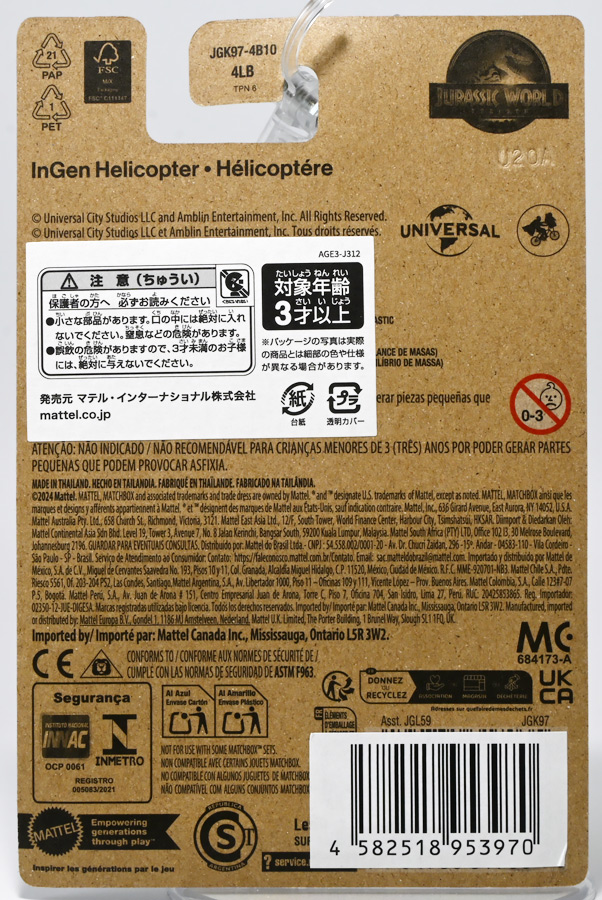 ■マッチボックス(Matchbox) ジュラシック・ワールド ベーシックカー インジェン社 ヘリコプター ![]() 2025年7月発売 / 550円(税込) 最新映画「復活の大地」に合わせて登場したマッチボックスジュラワアソートの7月弾のうちの一つ。 今回初登場の新規金型となっているぞよ! ![]() 詳しい内約は同時発売のエセックス号レビューを参照のことぞ。 このヘリは24台アソート中4台入っていて最も入手しやすくなっているぞよ。 ![]() インジェン社ヘリN293G号! 「復活の大地」劇中登場のヘリと言えばD-レックスに哀れ破壊されてしまう救出ヘリ・・・ ですが! こっちは初代「ジュラシック・パーク」映画冒頭で飛んでるインジェン社の観光客輸送用の銀色のヘリぞよ! ![]() 劇中ではグラント博士、サトラー博士、マルコム博士、 そしてインジェン社の顧問弁護士ドナルド・ジェナーロをイスラ・ヌブラル島に運んでいる。 事件後みんなを救出に来てくれたのもこのヘリであるぞよ。 ![]() 機体はイタリアのアグスタ社が開発したアグスタウエストランド AW109(アグスタ A109)ヘリコプターが元となっている。 ニューヨークからロサンゼルス間での最速ヘリコプター記録を作っており、 パワフルで俊敏なヤツのようだ! ![]() 銀色の機体が眩しいぞよね〜! インジェン社のロゴと機体名がちゃんと入っている。 映画の冒頭と終わりに出てくる印象的なヘリではあるが、 メインのビークルとは言い難いのでかなり通なラインナップぞよ。 ![]() おしり。 ![]() トップ。 ローターもラメラメ仕様です。 ![]() ボトム。 タイヤは造形されているけど転がし走行機能は無し。 三点接地だが接地面が小さいのでコテっと倒れがちなのだ。 ![]() ローターは勿論手回し回転が可能となっている。 ![]() ジュラワのヘリと言えばバイオシン社の白いヘリもある。 写真は「新たなる支配者」の時に国内で超ひっそりと販売されたヤツだが、 今回も第一弾アソートに「ラピッド レスキューコプター」として2個含まれており入手の機会がありました。 ![]() 時を超えて、新たな恐竜島にやってきたインジェン社ヘリ! このサン・ユベール島は17年のうちに魔境と化していたぞよ・・・!! ![]() い、いかん! 翼竜たちに見つかってしまった! 撤収ぞよーっ!! と言う事でフィギュアと組み合わせても楽しいマッチボックスミニカーでした。 ヘリは今回の新規造形なので見逃すなぞよ!! ![]() 「復活の大地」を誰よりも深掘りする「ぞよラジ」も合わせてお楽しみくださいぞよ!! :このリンクを踏んで何かポチるとわたくしにささやかな報酬が入りサイトの運営費となるのでよろしくぞ! ・「マッチボックス(Matchbox) ジュラシック・ワールド ベーシックカー」 ・「マッチボックス(Matchbox) ジュラシック・ワールド 5パック アソート」 ・「マッチボックス(Matchbox) ジュラシック・ワールド ベーシックカー」 ▲TOP |