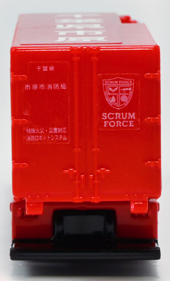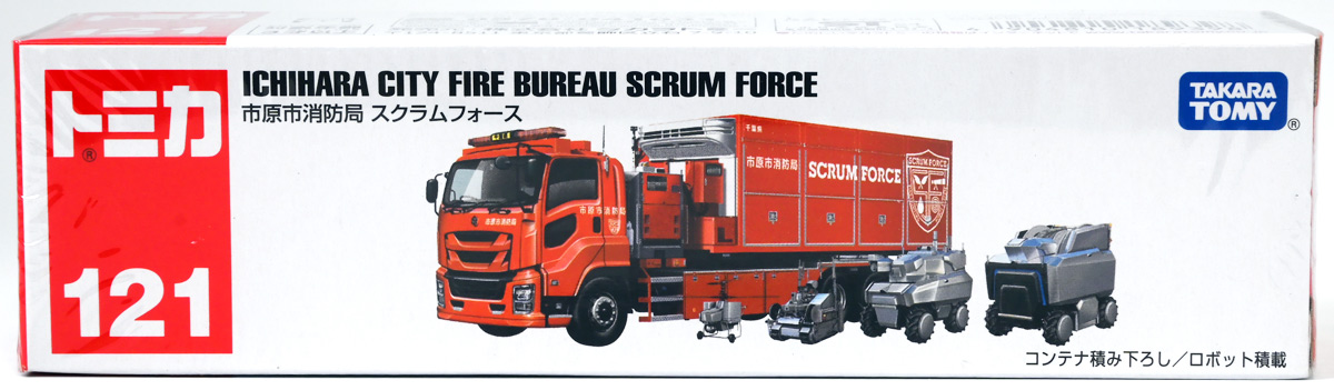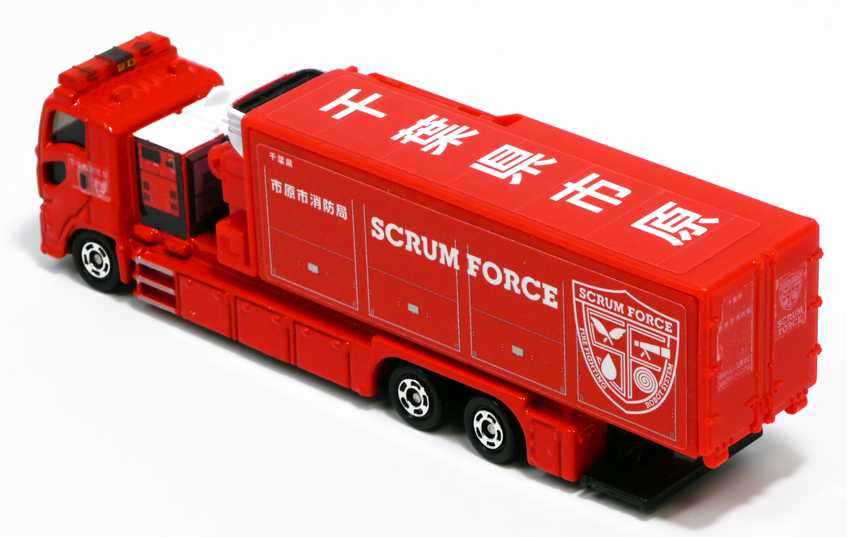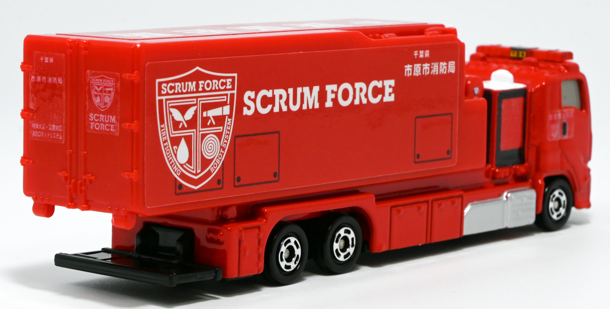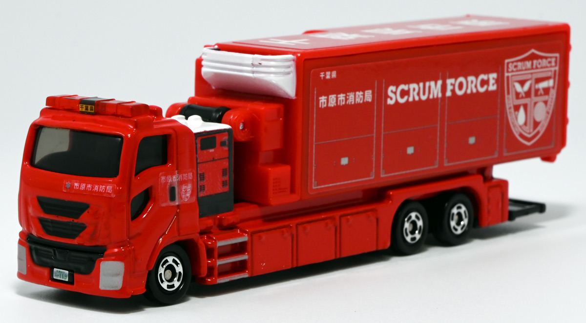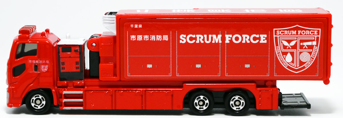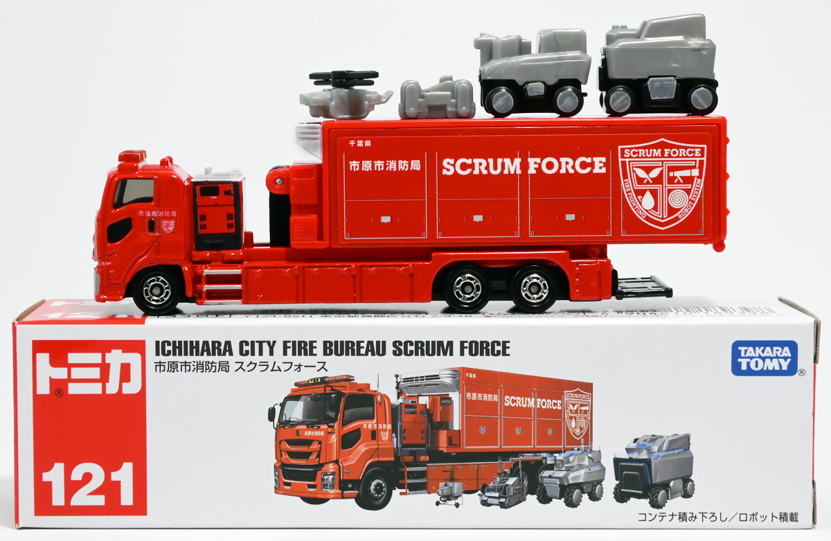 ■ロングタイプトミカ No.121 市原市消防局 スクラムフォース ![]() 2022年12月17日発売 / 1100円(税込) ロングタイプトミカとは、その名の通り普通のトミカよりちょっとロングなトミカである・・・! そんなロングタイプトミカに日本の技術力を結集した消防車両、市原市消防局スクラムフォースが登場ぞよ! ![]() スクラムフォースってなんのこっちゃ過ぎるので親切にもパケ裏に解説が書かれている。 これ普通のトミカにも書いといてくれぞよ〜! ![]() ちゃんと「いすゞ」のライセンス商品ぞよ。 ![]() 集めよう! 楽しさいっぱい! ミニカーの王様 ![]() それではパカっと開封。 ![]() トミカ本体とロボット軍団。 プラ製の頑丈なシールが付属します。 ![]() シールはマーキングと色分けを再現するもので、 ごく細かいのでちびっ子向けには貼らなくてもまぁいいでしょう! 警光灯の「千葉県」シールは折り込んで貼り付ける仕様だが、 シールが硬く圧着しても剥がれて来てしまいがちなのでカットした方が良いかもしれないぞよ。 ![]() 完成! 「市原市消防局スクラムフォース」! このでっかいコンテナ車両は消防ロボットシステムの搬送は勿論、 各機の発進後はロボットシステムの中心的な拠点としても機能する「搬送車両」ぞよ。 発動発電機を搭載し、外部給電なしにロボットシステムを稼働可能な基地車両だ! ![]() 細かい透明シールは自分で貼る必要があるが、コンテナ部分は予め貼り付け済み。 車両ギミックの肝であるコンテナハッチがシールの絵柄で再現されているのはやや物足りない気もするが・・・ 全体としては豪華で格好良い基地車両ぞよね! ![]() ![]() スクラムフォースの格好良いマークなどシールで再現されている。 ナンバープレートもごく小さなシールで再現されているが、多分ナンバーは実車に倣うのだろう! ![]() コンテナ側面のシールは予め貼り付け済み。 この辺上手い事モールドとプリントで再現できなかったんか!?と言う気もするが、 ロングタイプトミカと言えどほんの1000円なので難しかったのか。 ![]() でっかく掲げた「千葉県市原」の文字・・・! 市原市には「市原ぞうの国」と言う王国があり、そこに君臨するアジアゾウが実質的な権力を握っており、 おろかなにんげんどもは彼らの忠実なしもべとして頭を垂れていると言うぞよ・・・! ![]() タイヤが六輪もついていて豪華である。 シャーシにメカディテールは再現されていません。 ![]() スクラムフォース搬送車両は有事にはフックロールによるコンテナ展開により、 速やかに搭載ロボットたちを出撃させるぞよ! そのギミックはトミカでも勿論健在だ!! ![]() じゃきーん!! コンテナ設置完了ッ!! このフックロール、可動部がちょっと硬く最初はどこまで動くのか判然としない感触だが、 きちんと動かしてやるとコンテナがちゃんと接地するぞよ。 ![]() パカっと開封! コンテナハッチはシール再現の絵柄なので、側面の蓋がぱこっと丸ごと外れて展開します。 なんとも豪快なギミックだ! ![]() スクラムフォースメカ発進ッ!! ご覧の通り付属の各機はコンテナ内に収納可能で出撃遊びが楽しめるぞよ! これは嬉しいおまけぞよーっ!! ![]() 左が「走行型偵察・監視ロボット ランド・アイ」、 右が「飛行型偵察・監視ロボット スカイ・アイ」、 陸空を自律走行する偵察機で、ランド・アイは悪路でも走行できるようにタイヤとキャタピラの両方を備えている。 スカイ・アイは2022年に導入された際、トミカのような銀色のミニヘリコプターの姿をしていたが、 2024年6月にクワッドローターのドローンに更新され運用されているみたいぞよ。 という事でこれはやや古い姿と言う訳ぞよね! ローターは展開&回転が可能となっている。 ![]() そして「放水砲ロボット ウォーター・キャノン」と「ホース延長ロボット タフ・リーラー」の二機。 こちらは世界最高レベルの耐熱性を有する放水ロボットで、ランド&スカイアイが偵察した情報を元に自律走行し、 放水位置まで移動、風の状況を勘案の上で放水到達目標位置までノズルを最適設定する優れものぞよ! ![]() これらの四機を搬送車両の基地機能で総括制御し、 死角無しのコンビネーションで大災害に立ち向かうのがスクラムフォースの使命なのだ!! ![]() でっかい運送車にミニロボットが四つもついているとはお得なパッケージぞよね!! ![]() ゆくぞ、スクラムフォース! 出動ぞよっ!! ![]() 地上と空、両面からの情報収集で大火災に立ち向かえっ!! 千葉県の平和は、わたくし達が守るぞよっ!! ![]() ロボットフィギュアはごく小さいので、遊び終わったらきちんとコンテナに格納しましょう。 うっかり玩具箱に放り込むと絶対どっかいっちゃうので気を付けるぞよよ!! ![]() 通常の消防車両では手に負えない大火災が発生! バンピーが取り残されているぞ! スクラムフォース、出動だ!! ![]() よいしょ、よいしょっ! 急ぐぞよーっ!! ![]() のっぴきならない事態にこんなにえっちらおっちらコンテナを下ろして、 ロボットをもたもた発進