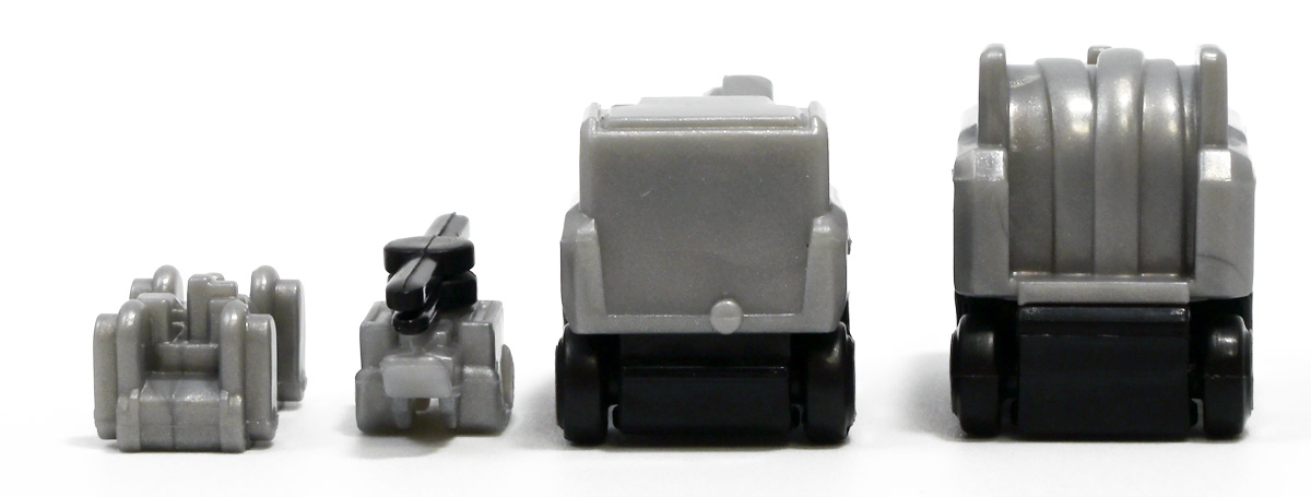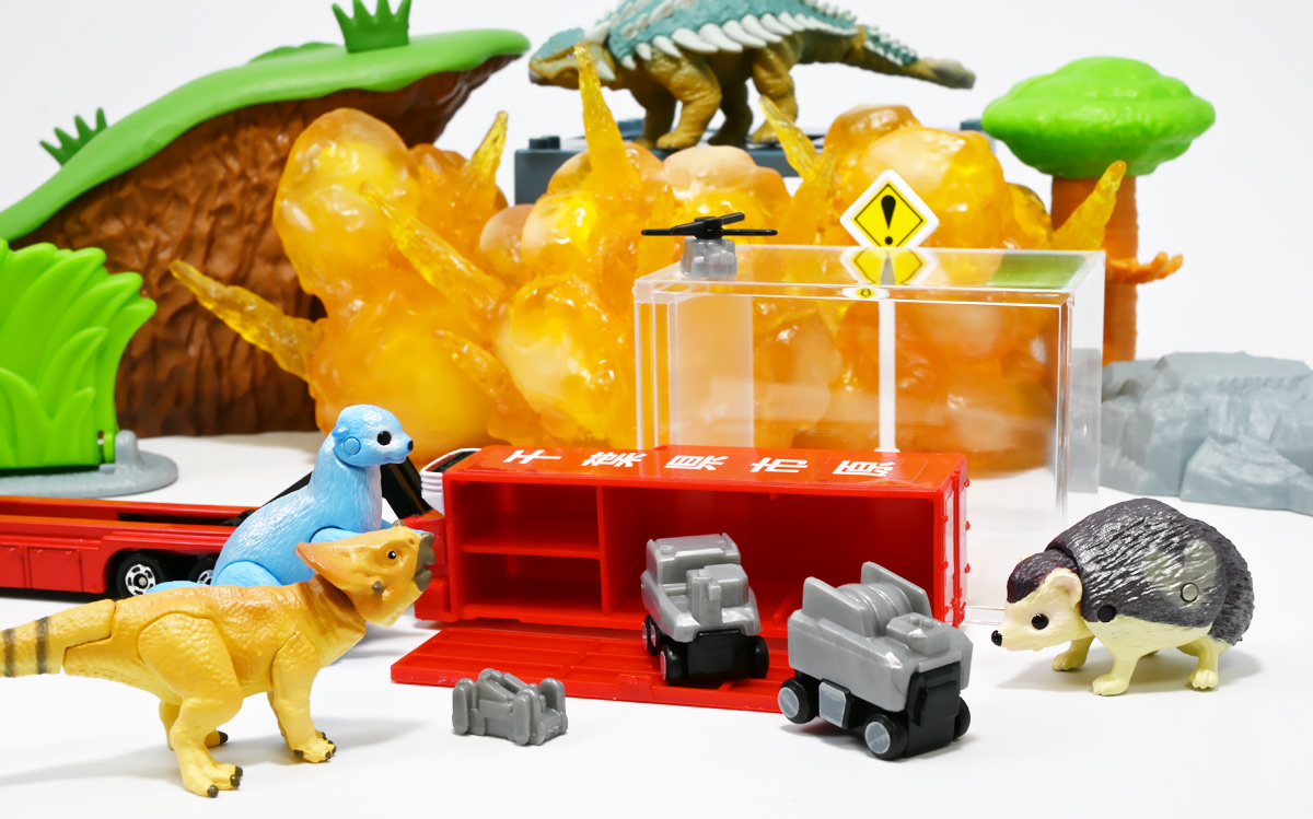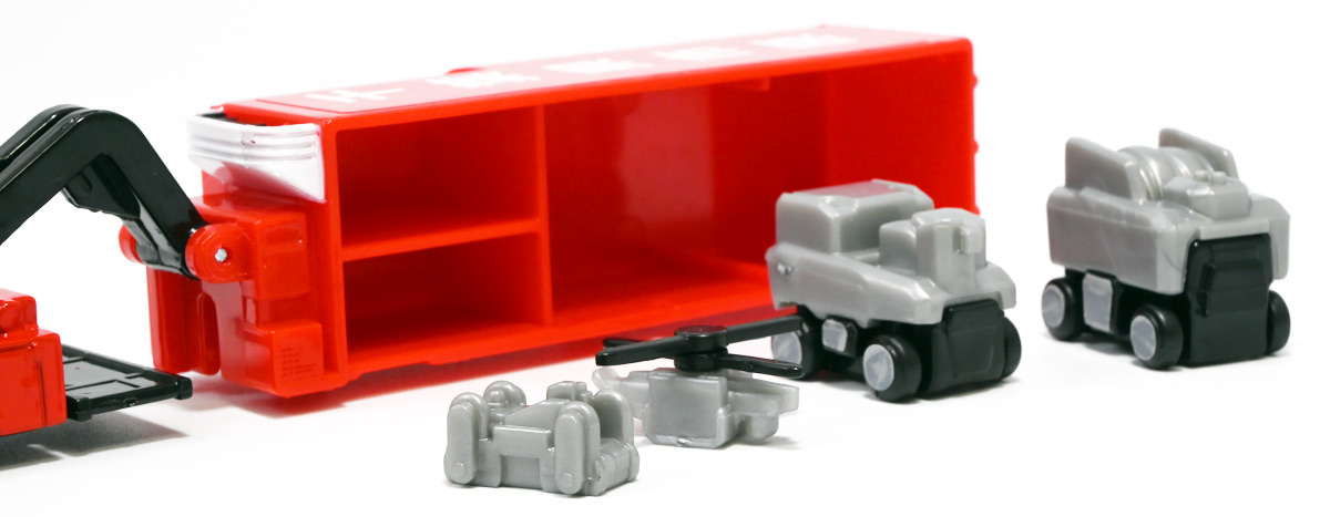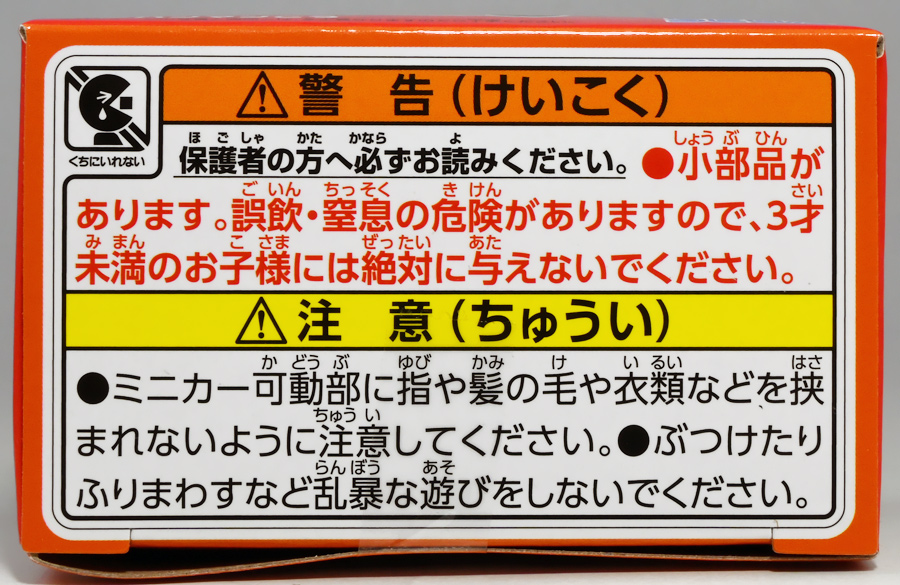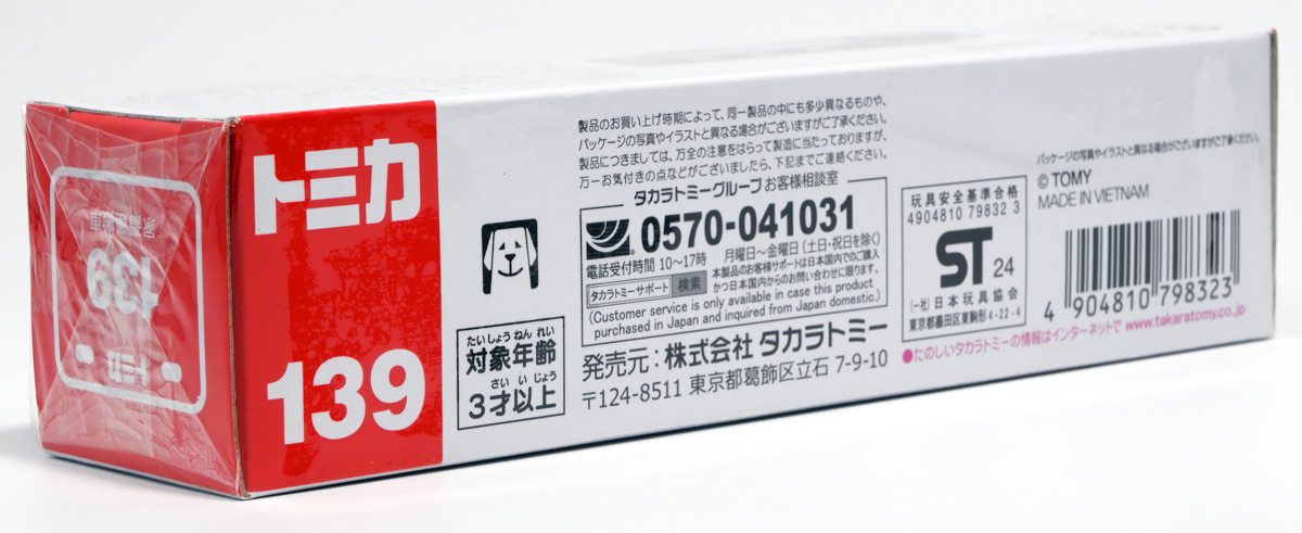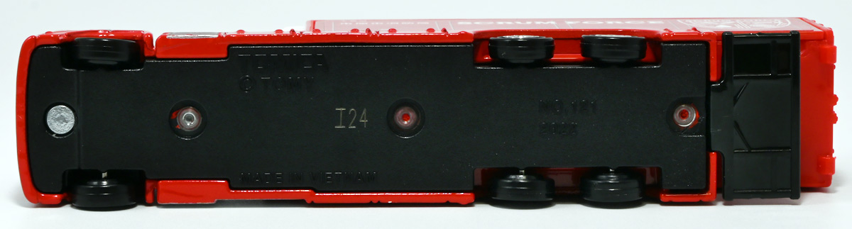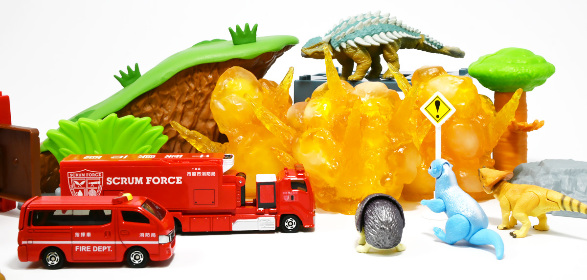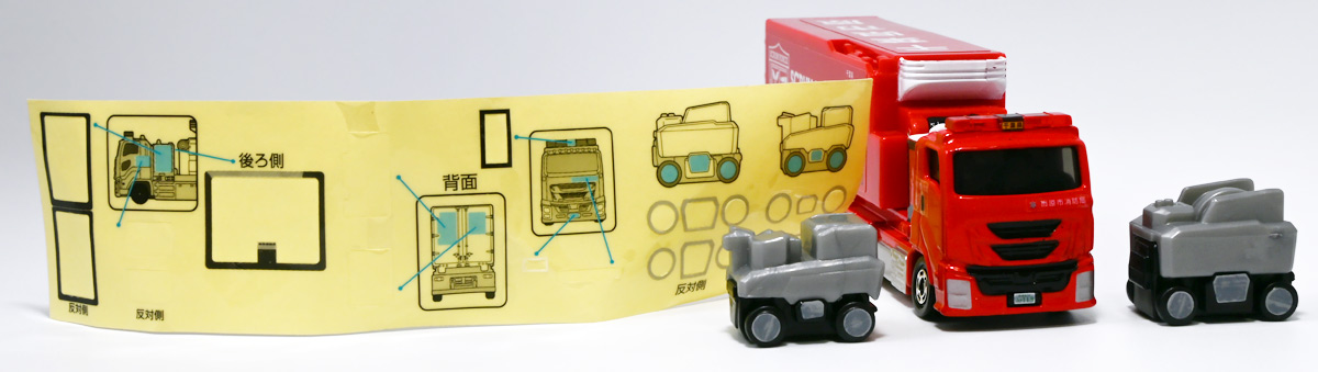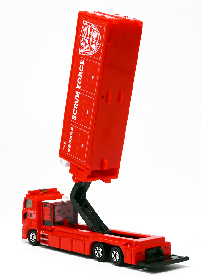 ■ロングタイプトミカ No.121 市原市消防局 スクラムフォース ![]() 2022年12月17日発売 / 1100円(税込) ロングタイプトミカとは、その名の通り普通のトミカよりちょっとロングなトミカである・・・! そんなロングタイプトミカに日本の技術力を結集した消防車両、市原市消防局スクラムフォースが登場ぞよ! ![]() スクラムフォースってなんのこっちゃ過ぎるので親切にもパケ裏に解説が書かれている。 これ普通のトミカにも書いといてくれぞよ〜! ![]() ちゃんと「いすゞ」のライセンス商品ぞよ。 ![]() 集めよう! 楽しさいっぱい! ミニカーの王様 ![]() それではパカっと開封。 ![]() トミカ本体とロボット軍団。 プラ製の頑丈なシールが付属します。 ![]() シールはマーキングと色分けを再現するもので、 ごく細かいのでちびっ子向けには貼らなくてもまぁいいでしょう! 警光灯の「千葉県」シールは折り込んで貼り付ける仕様だが、 シールが硬く圧着しても剥がれて来てしまいがちなのでカットした方が良いかもしれないぞよ。 ![]() 完成! 「市原市消防局スクラムフォース」! このでっかいコンテナ車両は消防ロボットシステムの搬送は勿論、 各機の発進後はロボットシステムの中心的な拠点としても機能する「搬送車両」ぞよ。 発動発電機を搭載し、外部給電なしにロボットシステムを稼働可能な基地車両だ! ![]() 細かい透明シールは自分で貼る必要があるが、コンテナ部分は予め貼り付け済み。 車両ギミックの肝であるコンテナハッチがシールの絵柄で再現されているのはやや物足りない気もするが・・・ 全体としては豪華で格好良い基地車両ぞよね! ![]() ![]() スクラムフォースの格好良いマークなどシールで再現されている。 ナンバープレートもごく小さなシールで再現されているが、多分ナンバーは実車に倣うのだろう! ![]() コンテナ側面のシールは予め貼り付け済み。 この辺上手い事モールドとプリントで再現できなかったんか!?と言う気もするが、 ロングタイプトミカと言えどほんの1000円なので難しかったのか。 ![]() でっかく掲げた「千葉県市原」の文字・・・! 市原市には「市原ぞうの国」と言う王国があり、そこに君臨するアジアゾウが実質的な権力を握っており、 おろかなにんげんどもは彼らの忠実なしもべとして頭を垂れていると言うぞよ・・・! ![]() タイヤが六輪もついていて豪華である。 シャーシにメカディテールは再現されていません。 ![]() スクラムフォース搬送車両は有事にはフックロールによるコンテナ展開により、 速やかに搭載ロボットたちを出撃させるぞよ! そのギミックはトミカでも勿論健在だ!! ![]() じゃきーん!! コンテナ設置完了ッ!! このフックロール、可動部がちょっと硬く最初はどこまで動くのか判然としない感触だが、 きちんと動かしてやるとコンテナがちゃんと接地するぞよ。 ![]() パカっと開封! コンテナハッチはシール再現の絵柄なので、側面の蓋がぱこっと丸ごと外れて展開します。 なんとも豪快なギミックだ! ![]() スクラムフォースメカ発進ッ!! ご覧の通り付属の各機はコンテナ内に収納可能で出撃遊びが楽しめるぞよ! これは嬉しいおまけぞよーっ!! ![]() 左が「走行型偵察・監視ロボット ランド・アイ」、 右が「飛行型偵察・監視ロボット スカイ・アイ」、 陸空を自律走行する偵察機で、ランド・アイは悪路でも走行できるようにタイヤとキャタピラの両方を備えている。 スカイ・アイは2022年に導入された際、トミカのような銀色のミニヘリコプターの姿をしていたが、 2024年6月にクワッドローターのドローンに更新され運用されているみたいぞよ。 という事でこれはやや古い姿と言う訳ぞよね! ローターは展開&回転が可能となっている。 ![]() そして「放水砲ロボット ウォーター・キャノン」と「ホース延長ロボット タフ・リーラー」の二機。 こちらは世界最高レベルの耐熱性を有する放水ロボットで、ランド&スカイアイが偵察した情報を元に自律走行し、 放水位置まで移動、風の状況を勘案の上で放水到達目標位置までノズルを最適設定する優れものぞよ! ![]() これらの四機を搬送車両の基地機能で総括制御し、 死角無しのコンビネーションで大災害に立ち向かうのがスクラムフォースの使命なのだ!! ![]() でっかい運送車にミニロボットが四つもついているとはお得なパッケージぞよね!! ![]() ゆくぞ、スクラムフォース! 出動ぞよっ!! ![]() 地上と空、両面からの情報収集で大火災に立ち向かえっ!! 千葉県の平和は、わたくし達が守るぞよっ!! ![]() ロボットフィギュアはごく小さいので、遊び終わったらきちんとコンテナに格納しましょう。 うっかり玩具箱に放り込むと絶対どっかいっちゃうので気を付けるぞよよ!! ![]() 通常の消防車両では手に負えない大火災が発生! バンピーが取り残されているぞ! スクラムフォース、出動だ!! ![]() よいしょ、よいしょっ! 急ぐぞよーっ!! ![]() のっぴきならない事態にこんなにえっちらおっちらコンテナを下ろして、 ロボットをもたもた発進