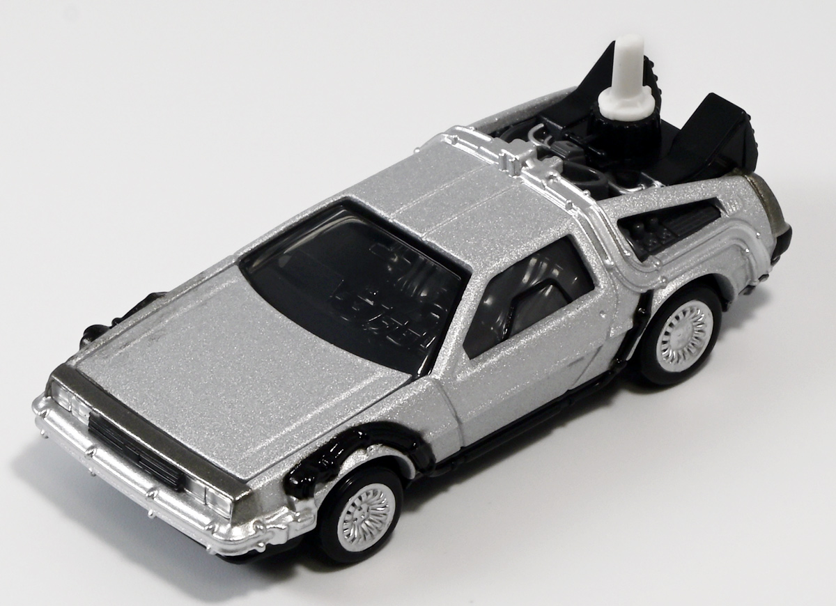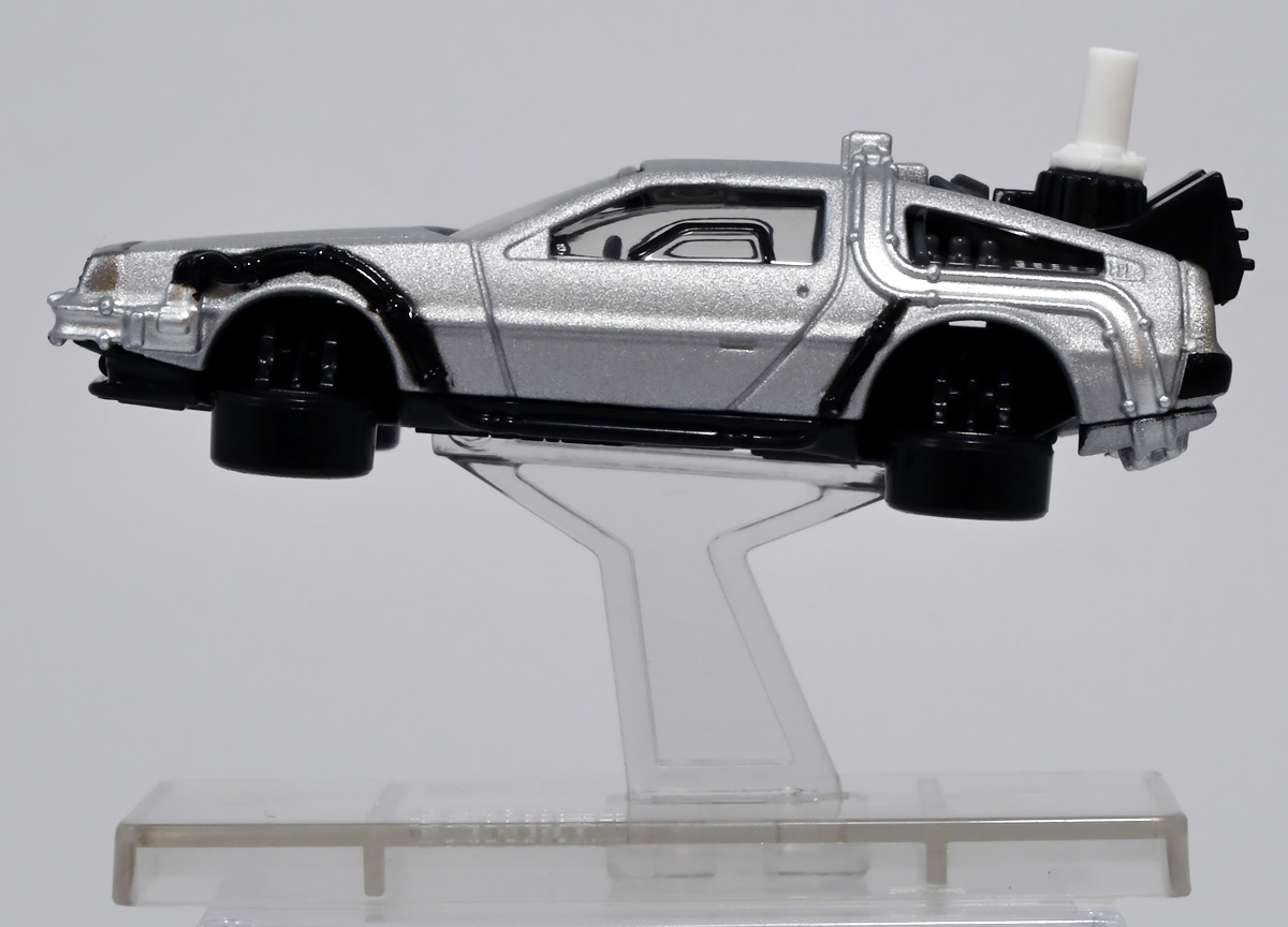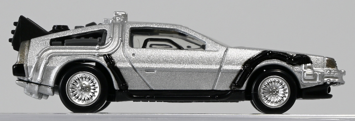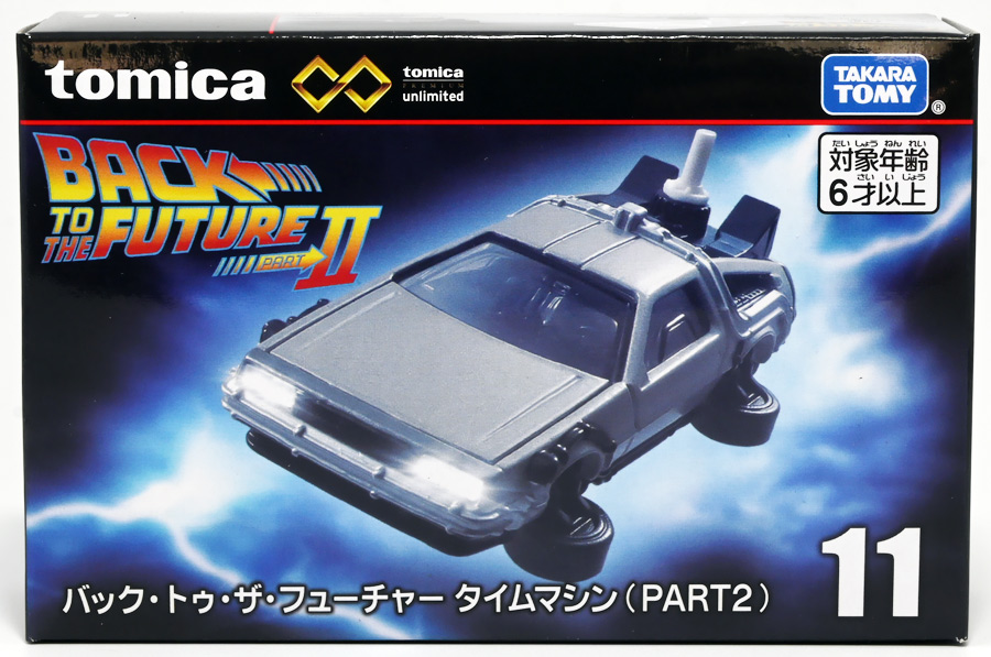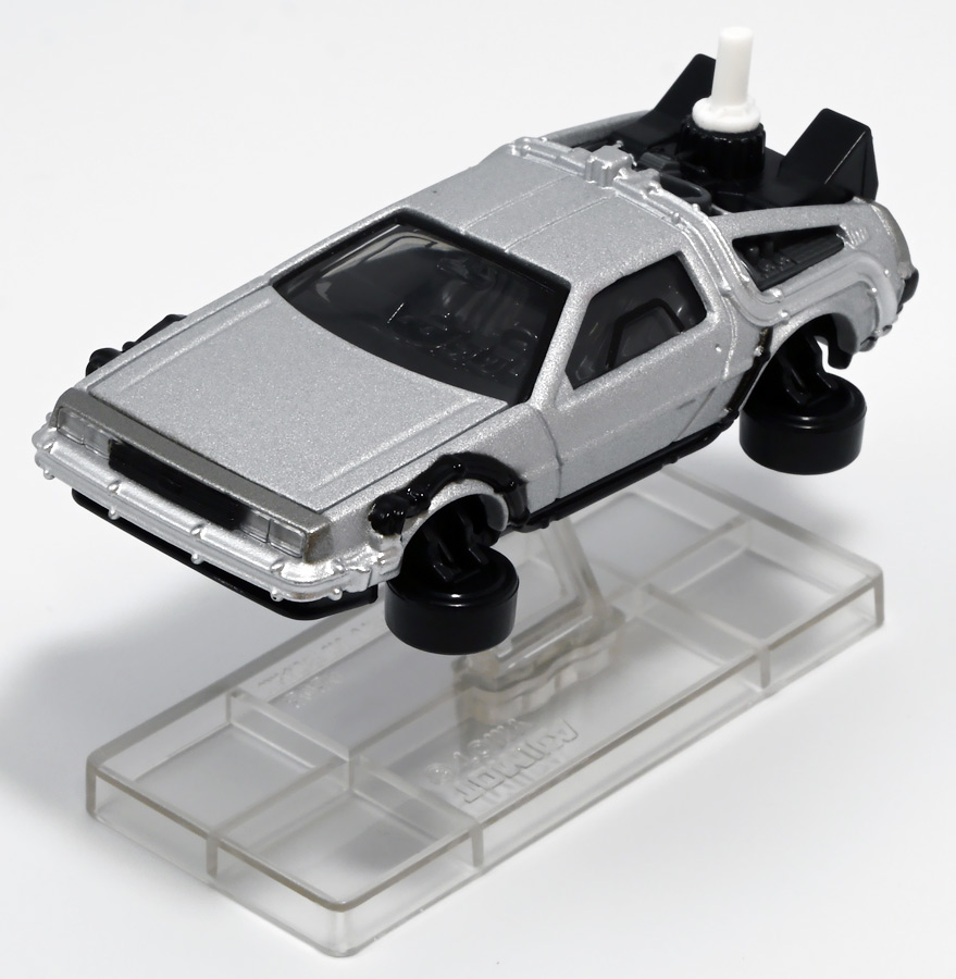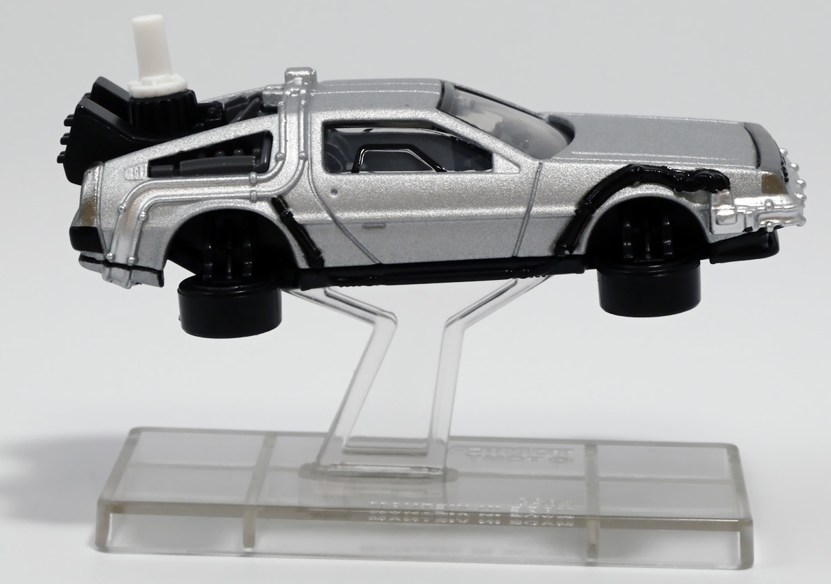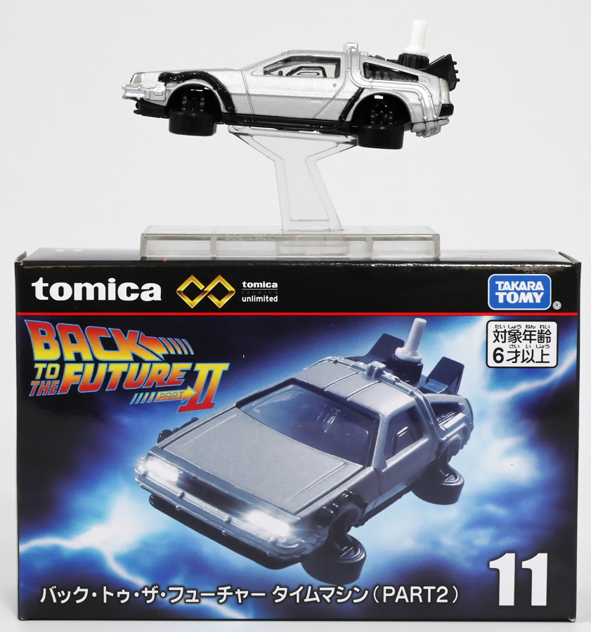 ■トミカプレミアムunlimited 11 バック・トゥ・ザ・フューチャー タイムマシン(PART2) ![]() 2025年8月16日発売 / 1320円(税込) 映画「バック・トゥ・ザ・フューチャー(1985)」より、「PART1」のラストで登場し、 「PART2(1989)」でメインに活躍したフライングホイール仕様のデロリアン・タイムマシンが 満を持してトミカプレミアムアンリミテッドに登場ぞよ! ![]() パッケージはいつもの大きめの紙箱。 映画登場メカとしてのトミカ化である為、実在車両である「DMC-12」の名義は使用されておらず、 パッケージの何処にも「デロリアン」の名前は入っていない。 検索する時も「デロリアン トミカ」ではなく「タイムマシン トミカ」で検索する必要があるぞよね! ![]() 「BTTF2」のロゴは入っていますよ。 一般販売版のタイムマシントミカもこれで出揃い、とりあえずはラストとなった。 ![]() 「トミカプレミアム unlimited」は映画やドラマ、 まんがなど、様々な創作物に登場する名車をラインナップするトミカの上位カテゴリ。 ナンバー付きの通年販売パッケージとナンバー無しの「SPECIAL」パッケージが存在し、 本商品はナンバー11として通年販売ラインナップとなっている。 最近だとドラマ「TOKYO MER」に登場する「ERカー」があまりにも人気過ぎて、 「SPECIAL」なのに緊急再販がかかったがそれもあっと言う間に売り切れてしまう程であった。 と言う事で超絶人気があったらSPも再販されるみたいぞよ。 ![]() パカっと開封! 箱は大きいけど中身はちっちゃいの。 今回はおまけで台座が入っています。 ![]() 満を持して登場! デロリアン・タイムマシン PART2仕様ぞよ!! もうこれでアンリミverも四つ目なので新鮮味は正直ないけど、 やっぱり空を飛ぶこれが欲しかったんですよ〜。 ボディは過去に発売された「PART1」、後部メカは「PART3」バージョンを踏襲しており、 シャーシが新規造形でフライングホイール形態を再現している。 ![]() 新規造形シャーシはおまけのクリア台座と合体可能! 本商品専用なので過去のタイムマシンに流用する事は出来ません。 ![]() 本体を乗せる事で飛行状態のデロリアン・タイムマシンを再現可能ぞよ! これは嬉しい仕様ですね!! ![]() 通称ドクことエメット・ブラウン博士が愛車のDMC-12を改造し作り出したタイムマシン。 初めは小型原子炉にプルトニウムを突っ込んで次元転移装置の燃料としていたが、 未来への転移に成功し、 超小型核融合炉「ミスター・フュージョン」を搭載する事であらゆるゴミを原子レベルまで分解させ 常温核融合によってエネルギーを取り出す事が出来るようにパワーアップ。 更には「ホバー・コンバージョン」を施し、 「フライングホイール」を装着した事で自在に飛行も可能となっているのがこの「PART2」仕様ぞよね! タイヤがぺたんと寝て空を飛ぶこの仕様、 劇中の2015年では一般に普及しており極めて普通の仕組みとは夢のある話だが・・・ 現実では2025年現在に至っても空を飛ぶ車と言うのは完成しなかった・・・。 なんか大阪の万博ではでっかいドローンの様な奴を「空飛ぶ車」と呼んでいるようだが・・・ あまりにも情けないぞ、おろかなにんげぇんっ!! 空飛ぶ車と言うならこのデロリアンみたいなやつをじゃーんと展示してみせないかっ!! ![]() 劇中では改変された未来を元に戻す為に大奮闘するデロリアン・タイムマシン! 今回は実車名義が使えない(?)為かフロントにある筈の「DMC」のプリントが「PART3」バージョンから引き続き再現されていない・・・。 シャーシは新規造形だが撮影用フックのディテールなど過去の造形が踏襲されている。 この辺は過去販売バージョンのレビューも参照の事(後述 ![]() 車体後部からはみ出したメカ部分は「PART3」バージョンと同じ。 引き続きミスター・フュージョンが造形され、パイプの一部がシルバー彩色されているぞよ。 ![]() そしてナンバープレートも未来仕様のバーコード。 ドクが2015年の未来で登録したもので 以後デロリアン・タイムマシンのチャームポイントとなったものぞよね。 ![]() と言う事でほぼほぼ過去に発売されたバージョンの流用なのだが、 「1」、「2」、「3」それぞれナンバー付きで通年販売とはデロリアンの人気の高さが窺えるものとなっている。 ![]() 新規造形されたシャーシ。 フライングホイールはきちんとシルバーで彩色されており、ディテールなどは過去のバージョンを踏襲。 トミカプレミアムアンリミテッドではシャーシがのっぺりとディテール無しである事が多いが、 本商品は煽り構図になる関係できちんとメカディテールが施されているぞよ。 コロタイヤは設けられておらず、トミカなのに転がし走行遊びは出来ない潔い仕様だ。 ![]() 運転席のメカディテールなども過去バージョンから引き続き、 劇中を再現したものが使用されている。 ![]() 一番人気の飛行形態デロリアン! これを最初に出しちゃうと他のバリエが売れなくなるから最後に出すとは・・・ タカトミ・・・なかなか鋭いぞよねっ!! ![]() 