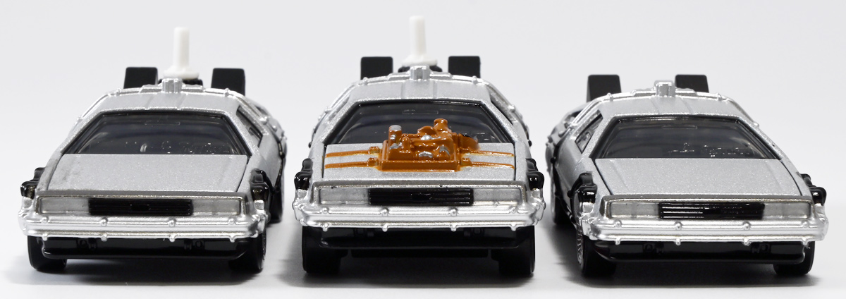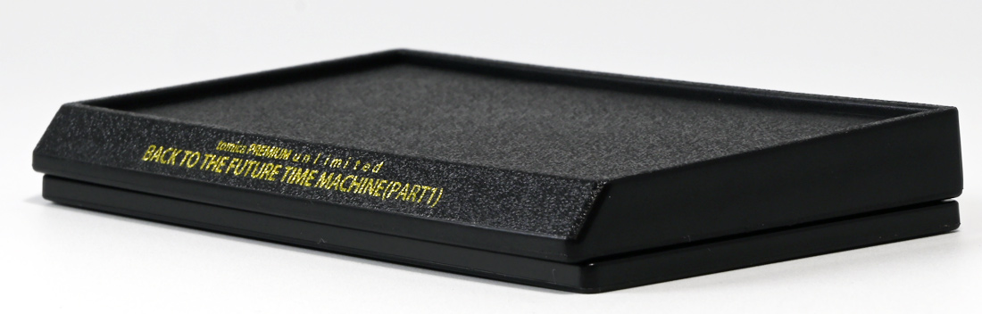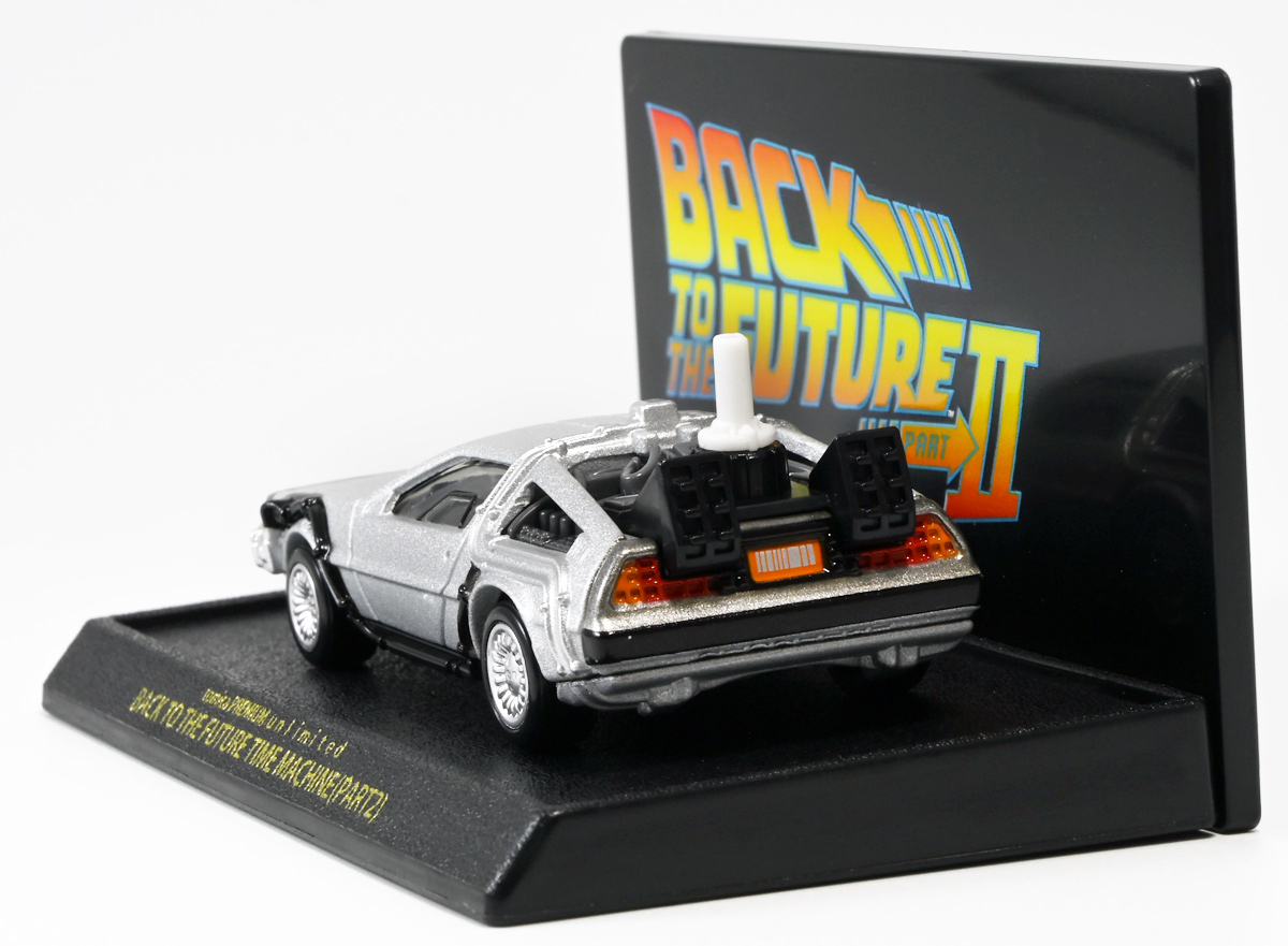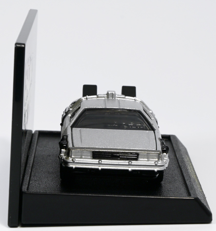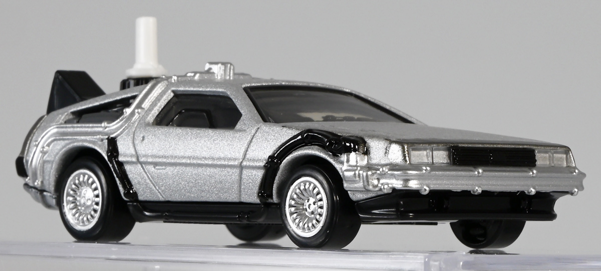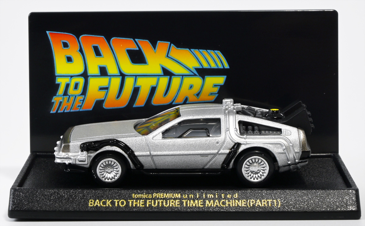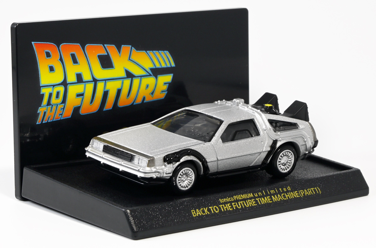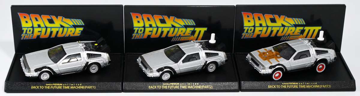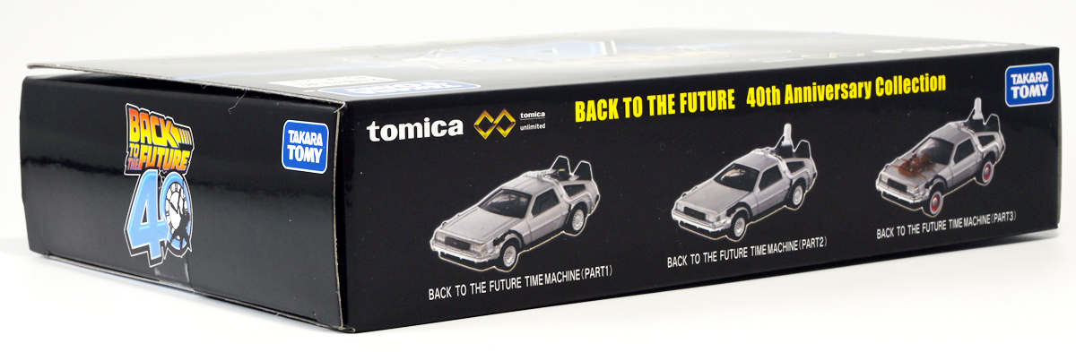 ■トミカプレミアムunlimited BACK TO THE FUTURE 40th Anniversary Collection ![]() 2025年10月25日発売 / 4620円(税込) トミカプレミアムアンリミテッドに、 映画史に残る名作「バック・トゥ・ザ・フューチャー」40周年記念パッケージが登場! 全国の「トミカショップ」及び「タカラトミーモール」通販限定で販売されたレアなパッケージぞよ! ![]() 映画シリーズ1〜3作目で活躍する「デロリアン・タイムマシン」の各形態が網羅されたパッケージ。 単品版とはボディの色が異なる限定版ぞよ! ![]() タカトミはわたくしにあと何台同じデロリアンを買わせるつもりなんだーっ!! ![]() とは申せ、一般販売の単品版を持ってる人はスルーしても良い絶妙な塩梅のバリエーションぞよね。 ![]() トミカプレミアムアンリミテッドのセットパケあるある。 そこブリスターの窓じゃないんかい! トミカからブリスターが廃されて久しいが、限定パケくらい覗けるようにしてくれても良いと思いますけどね。 ![]() パカっと開封! 中身も簡易梱包ぞよ。 環境にやさしいのだ! ![]() わたくしは今回のパッケージの着弾を楽しみにしていた。 アンリミにおけるデロリアン・タイムマシンは、PART1のみフロントの「DMC」ロゴが再現されており、 後の3、2では削られてしまった為、画竜点睛を欠く仕上がりだったのである。 しかし、この限定パケは三台全てDMCロゴが再現される上位互換・・・! まさに決定版ではないか〜っ! ・・・と開けてみたら、な、な、な、なんと・・・! 三台ともロゴが再現されていない!? 慌てて宣伝写真を見返すと、わたくしがロゴだと思ったものはフロントのロゴプレートの照り返しが白く映ったもので、 最初からロゴ無し仕様として宣伝されていたのだ・・・! まさかの空目・・・ッ!! わたくし、痛恨の勘違いであるぞよ・・・っ! ![]() いきなり出端を挫かれてしまったが、本パケにはここだけのおまけも封入されている。 それがこの専用台座だ。 ![]() 重なっているプレートを分離し、組み立てる事で・・・、 ![]() 映画ロゴがあしらわれた格好良い台座が完成! 何気に車体を乗せる部分が傾斜しており、立体的で格好良い展示が出来るような工夫があるぞよ。 ![]() 恐らく「タカラトミー100周年記念 トミカセット(2024年7月)」に入っていた台座と同仕様ぞよね。 台座部分にも金でネームが印字してあって、各デロリアン専用となっている。 ![]() 「PART1」〜「3」、各ロゴがあしらわれた台座3種が同梱! ここにデロリアンを置く事で・・・、 ![]() 40周年記念の豪華なデロリアン展示が完成するのだ! これは格好良いぞよね! ![]() それでは一台ずつ見ていこう! ・・・と言っても本商品は完全に一般販売版のバリエーションなのであまり語る事もないのであるが・・・。 まずは映画「バック・トゥ・ザ・フューチャー(1985)」で活躍したタイプの「デロリアン・タイムマシン」ぞよ。 最もスタンダードな装備で、次元転移装置の動力に小型原子炉を利用しており、 本セットにおいても車体後部のメカボックスの造形が唯一専用となっているぞよ。 ![]() 本セットに封入されているトミカは一般販売版とボディのカラーが違う限定カラバリ仕様。 比較は後述とするが、この「PART1」のみ一般販売版にあったフロントの「DMC」ロゴが削られており、 ややグレードダウン的ぞよ。 ![]() そも我らがドクことエメット・ブラウン博士が愛車のDMC-12、 通称「デロリアン」を改造して生み出したのが劇中で活躍する「タイムマシン」なのだ! DMCとはアメリカのポンコツスポーツカー会社「デロリアン・モーター・カンパニー」の略であり、 DMC社が唯一販売にこぎつけた車だからコードネーム「DMC-12」を指して「デロリアン」と呼ぶのである。 従って、フロントには「DMC」のロゴが刻まれていてしかるべきなのだが・・・ 何故かトミカでは途中から再現されなくなってしまったぞよよよよ・・・。 タカラトミーアーツのガチャガチャでは再現されているので、 トミカで削られた事には何か理由がある気もするが、謎であるぞよ・・・。 ![]() 一般販売版との細かい比較は後述とする! ![]() 「PART1」のみの仕様としては、ナンバープレートが「OUTATIME」となっている事も上げられる。 このナンバープレートはタイムマシンが初めてのタイムトラベル実験で時空を跳躍した時、 衝撃で外れ、象徴的に取り残されるぞよ。 ごくちいさな部分だがトミカでもばっちり再現されている! ![]() 続いて「バック・トゥ・ザ・フューチャー PART2(1989)」仕様! 本セットの目玉アイテムで、唯一一般販売版の無いモデルぞよ! ![]() 一般販売版の「PART2」仕様はフライングホイールを変形した飛行形態でのラインナップなので、 タイヤを接地した走行形態のバリエーショントミカは本セットでしか手に入らない! 従って全ての形態をトミカで網羅したいファンは、やはりこの限定セットも入手しなくてはならないのだ! ![]() くぅ〜・・・っ! タカトミ、ニクイ仕掛けをしてくるぞよね・・・! わたくしもまんまと買わ