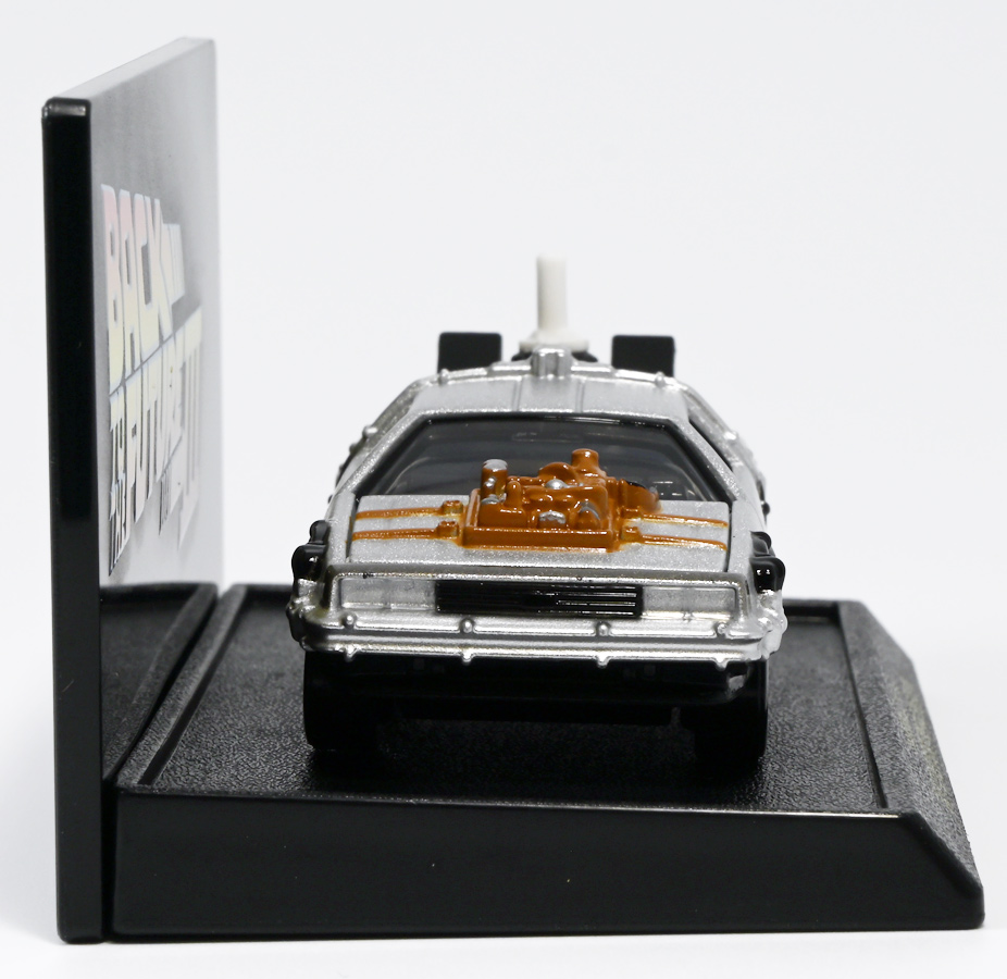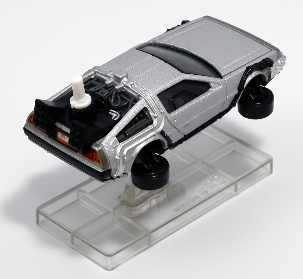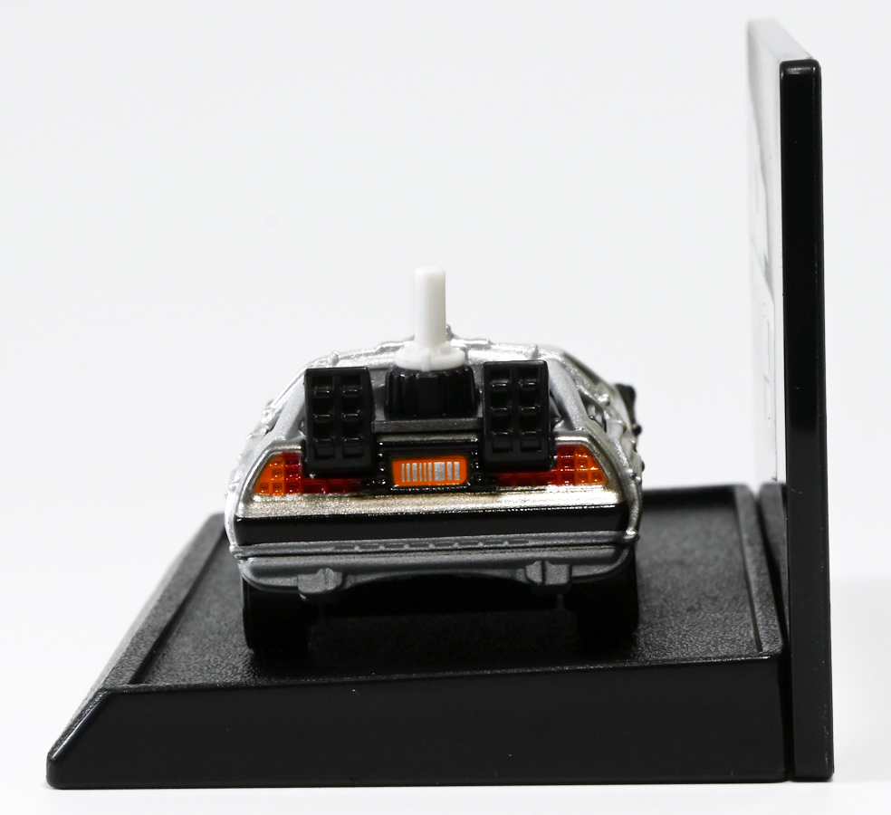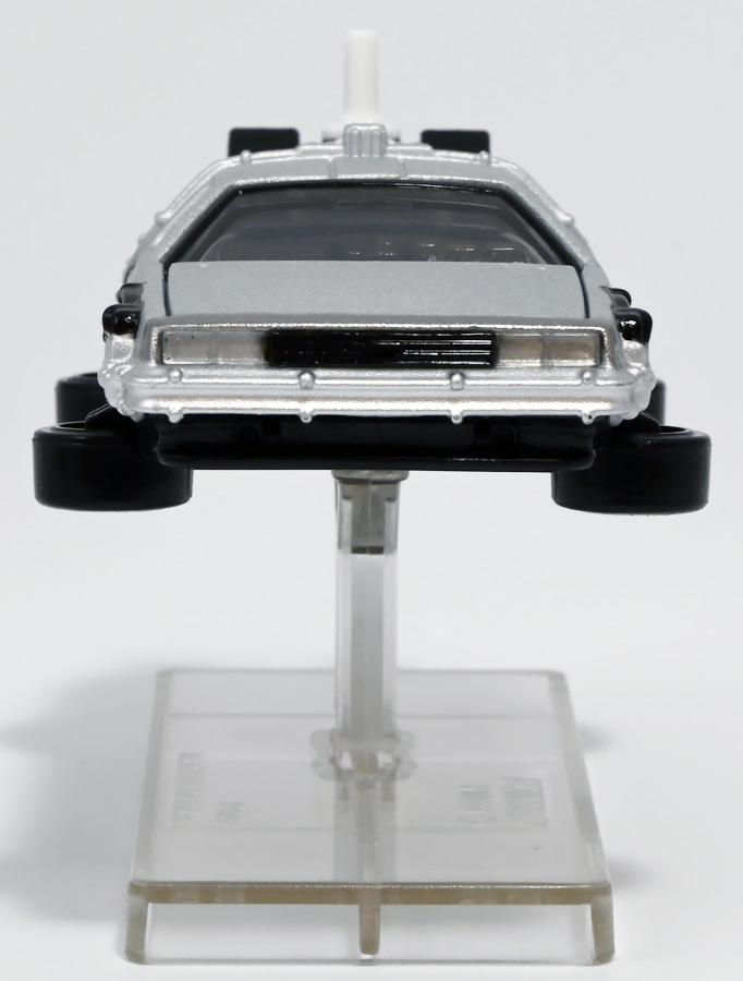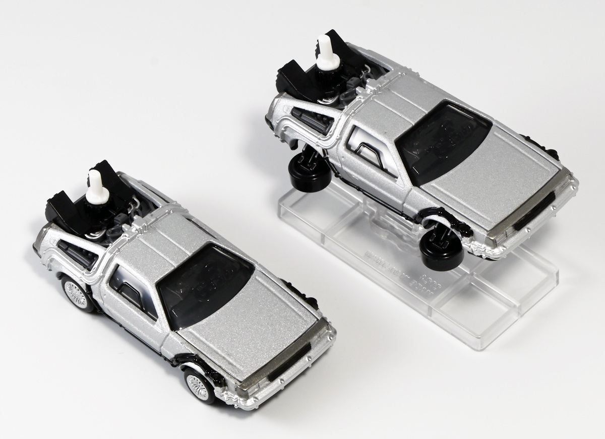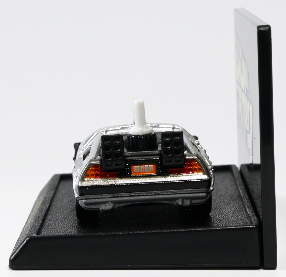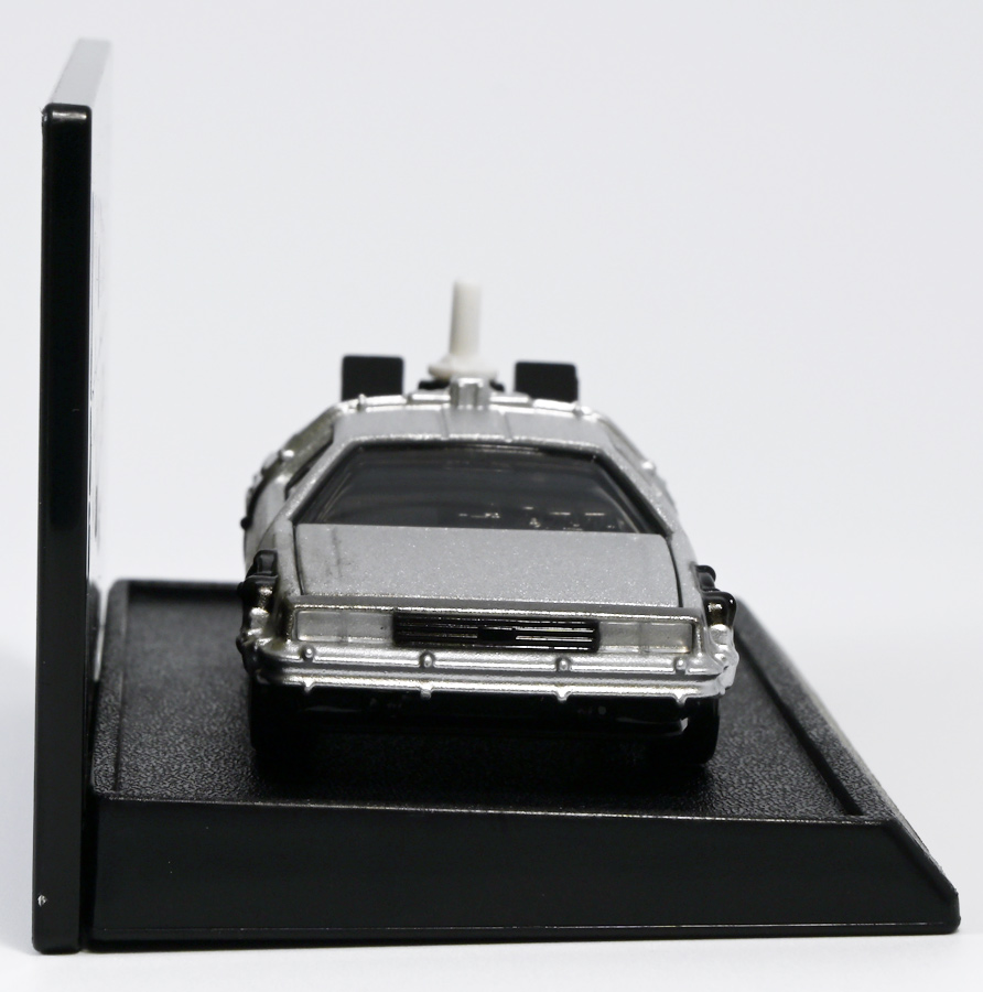 ■トミカプレミアムunlimited BACK TO THE FUTURE 40th Anniversary Collection ![]() 2025年10月25日発売 / 4620円(税込) トミカプレミアムアンリミテッドに、 映画史に残る名作「バック・トゥ・ザ・フューチャー」40周年記念パッケージが登場! 全国の「トミカショップ」及び「タカラトミーモール」通販限定で販売されたレアなパッケージぞよ! ![]() 映画シリーズ1〜3作目で活躍する「デロリアン・タイムマシン」の各形態が網羅されたパッケージ。 単品版とはボディの色が異なる限定版ぞよ! ![]() タカトミはわたくしにあと何台同じデロリアンを買わせるつもりなんだーっ!! ![]() とは申せ、一般販売の単品版を持ってる人はスルーしても良い絶妙な塩梅のバリエーションぞよね。 ![]() トミカプレミアムアンリミテッドのセットパケあるある。 そこブリスターの窓じゃないんかい! トミカからブリスターが廃されて久しいが、限定パケくらい覗けるようにしてくれても良いと思いますけどね。 ![]() パカっと開封! 中身も簡易梱包ぞよ。 環境にやさしいのだ! ![]() わたくしは今回のパッケージの着弾を楽しみにしていた。 アンリミにおけるデロリアン・タイムマシンは、PART1のみフロントの「DMC」ロゴが再現されており、 後の3、2では削られてしまった為、画竜点睛を欠く仕上がりだったのである。 しかし、この限定パケは三台全てDMCロゴが再現される上位互換・・・! まさに決定版ではないか〜っ! ・・・と開けてみたら、な、な、な、なんと・・・! 三台ともロゴが再現されていない!? 慌てて宣伝写真を見返すと、わたくしがロゴだと思ったものはフロントのロゴプレートの照り返しが白く映ったもので、 最初からロゴ無し仕様として宣伝されていたのだ・・・! まさかの空目・・・ッ!! わたくし、痛恨の勘違いであるぞよ・・・っ! ![]() いきなり出端を挫かれてしまったが、本パケにはここだけのおまけも封入されている。 それがこの専用台座だ。 ![]() 重なっているプレートを分離し、組み立てる事で・・・、 ![]() 映画ロゴがあしらわれた格好良い台座が完成! 何気に車体を乗せる部分が傾斜しており、立体的で格好良い展示が出来るような工夫があるぞよ。 ![]() 恐らく「タカラトミー100周年記念 トミカセット(2024年7月)」に入っていた台座と同仕様ぞよね。 台座部分にも金でネームが印字してあって、各デロリアン専用となっている。 ![]() 「PART1」〜「3」、各ロゴがあしらわれた台座3種が同梱! ここにデロリアンを置く事で・・・、 ![]() 40周年記念の豪華なデロリアン展示が完成するのだ! これは格好良いぞよね! ![]() それでは一台ずつ見ていこう! ・・・と言っても本商品は完全に一般販売版のバリエーションなのであまり語る事もないのであるが・・・。 まずは映画「バック・トゥ・ザ・フューチャー(1985)」で活躍したタイプの「デロリアン・タイムマシン」ぞよ。 最もスタンダードな装備で、次元転移装置の動力に小型原子炉を利用しており、 本セットにおいても車体後部のメカボックスの造形が唯一専用となっているぞよ。 ![]() 本セットに封入されているトミカは一般販売版とボディのカラーが違う限定カラバリ仕様。 比較は後述とするが、この「PART1」のみ一般販売版にあったフロントの「DMC」ロゴが削られており、 ややグレードダウン的ぞよ。 ![]() そも我らがドクことエメット・ブラウン博士が愛車のDMC-12、 通称「デロリアン」を改造して生み出したのが劇中で活躍する「タイムマシン」なのだ! DMCとはアメリカのポンコツスポーツカー会社「デロリアン・モーター・カンパニー」の略であり、 DMC社が唯一販売にこぎつけた車だからコードネーム「DMC-12」を指して「デロリアン」と呼ぶのである。 従って、フロントには「DMC」のロゴが刻まれていてしかるべきなのだが・・・ 何故かトミカでは途中から再現されなくなってしまったぞよよよよ・・・。 タカラトミーアーツのガチャガチャでは再現されているので、 トミカで削られた事には何か理由がある気もするが、謎であるぞよ・・・。 ![]() 一般販売版との細かい比較は後述とする! ![]() 「PART1」のみの仕様としては、ナンバープレートが「OUTATIME」となっている事も上げられる。 このナンバープレートはタイムマシンが初めてのタイムトラベル実験で時空を跳躍した時、 衝撃で外れ、象徴的に取り残されるぞよ。 ごくちいさな部分だがトミカでもばっちり再現されている! ![]() 続いて「バック・トゥ・ザ・フューチャー PART2(1989)」仕様! 本セットの目玉アイテムで、唯一一般販売版の無いモデルぞよ! ![]() 一般販売版の「PART2」仕様はフライングホイールを変形した飛行形態でのラインナップなので、 タイヤを接地した走行形態のバリエーショントミカは本セットでしか手に入らない! 従って全ての形態をトミカで網羅したいファンは、やはりこの限定セットも入手しなくてはならないのだ! ![]() くぅ〜・・・っ! タカトミ、ニクイ仕掛けをしてくるぞよね・・・! わたくしもまんまと買わ