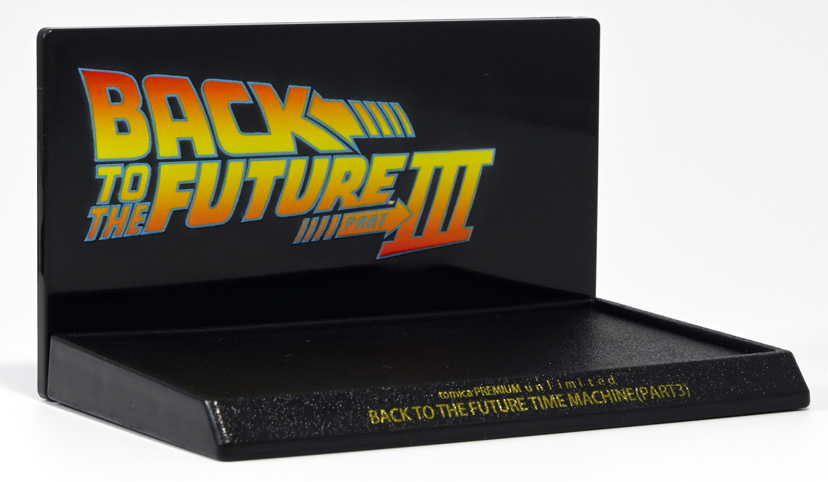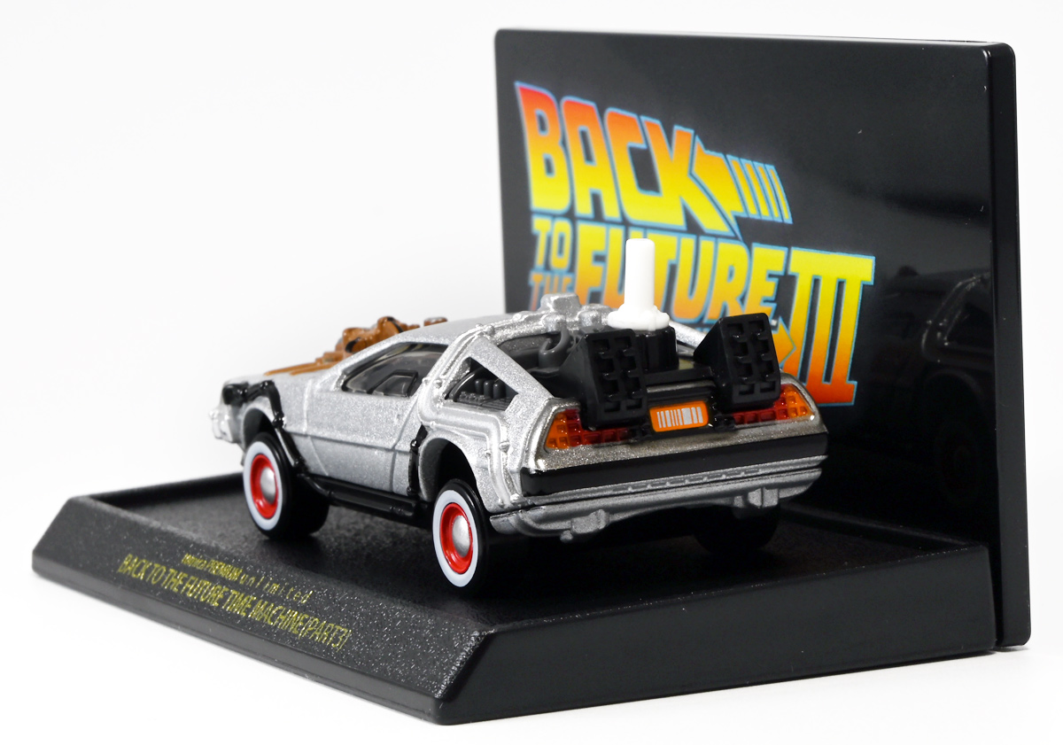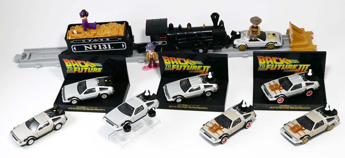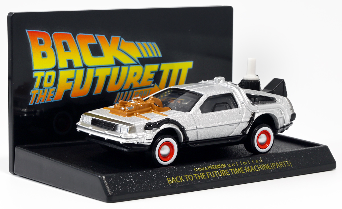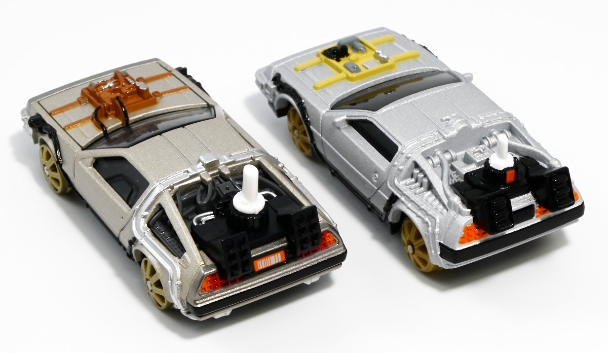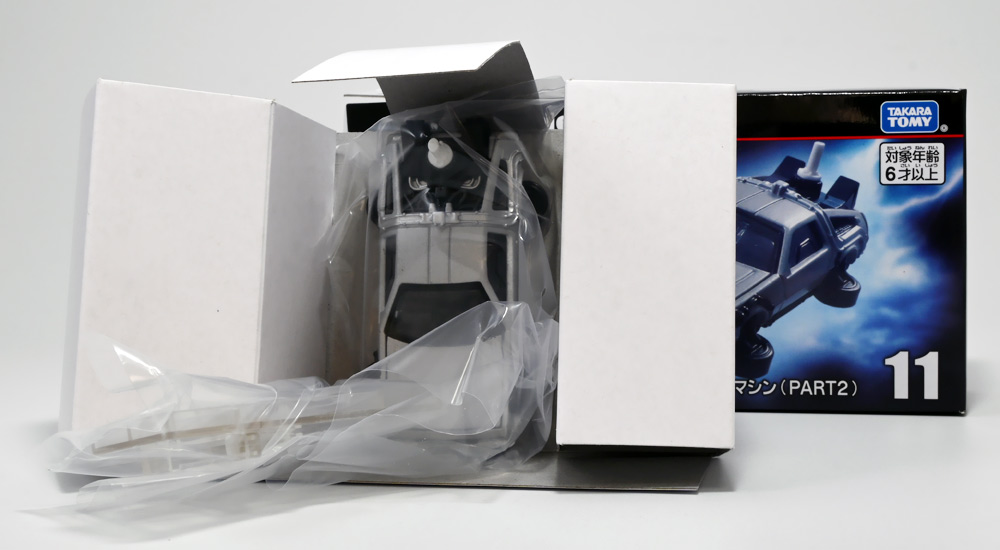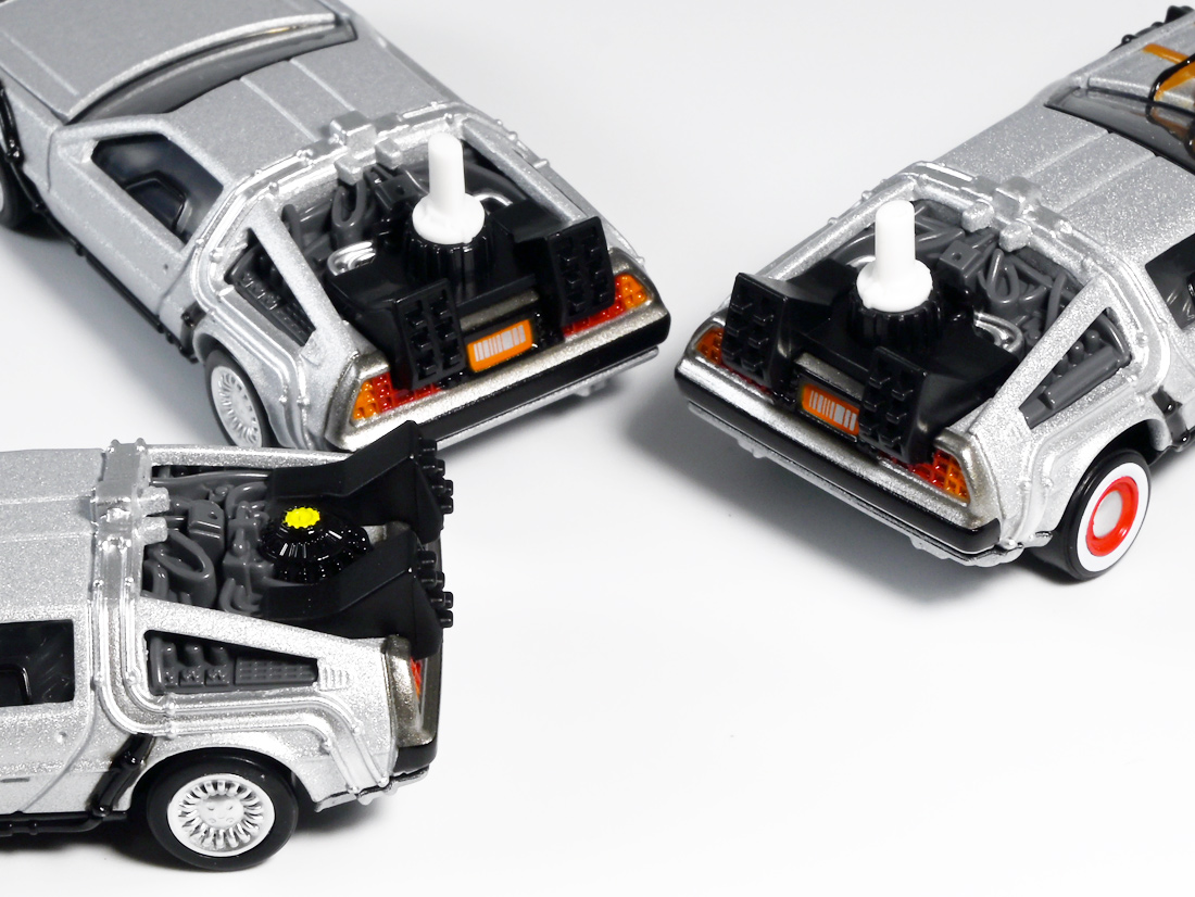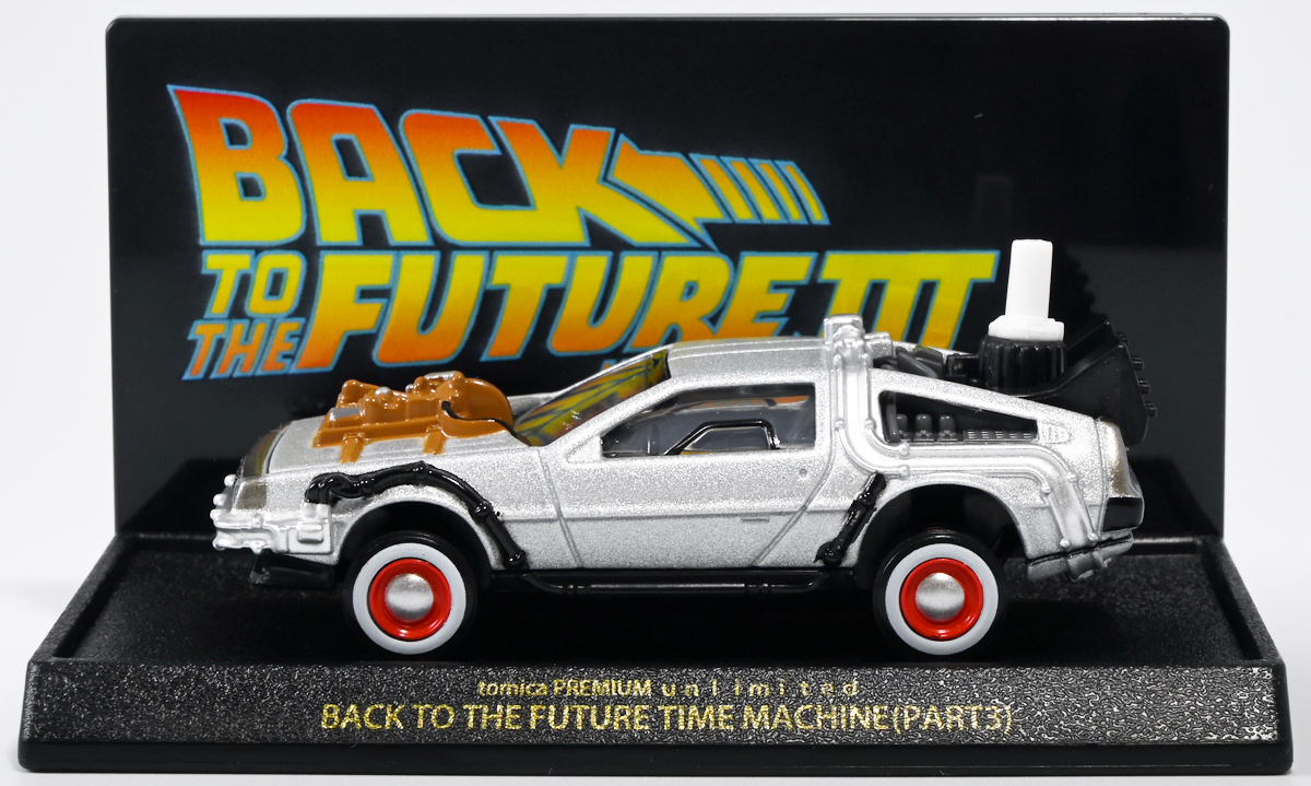 ■トミカプレミアムunlimited BACK TO THE FUTURE 40th Anniversary Collection ![]() 2025年10月25日発売 / 4620円(税込) トミカプレミアムアンリミテッドに、 映画史に残る名作「バック・トゥ・ザ・フューチャー」40周年記念パッケージが登場! 全国の「トミカショップ」及び「タカラトミーモール」通販限定で販売されたレアなパッケージぞよ! ![]() 映画シリーズ1〜3作目で活躍する「デロリアン・タイムマシン」の各形態が網羅されたパッケージ。 単品版とはボディの色が異なる限定版ぞよ! ![]() タカトミはわたくしにあと何台同じデロリアンを買わせるつもりなんだーっ!! ![]() とは申せ、一般販売の単品版を持ってる人はスルーしても良い絶妙な塩梅のバリエーションぞよね。 ![]() トミカプレミアムアンリミテッドのセットパケあるある。 そこブリスターの窓じゃないんかい! トミカからブリスターが廃されて久しいが、限定パケくらい覗けるようにしてくれても良いと思いますけどね。 ![]() パカっと開封! 中身も簡易梱包ぞよ。 環境にやさしいのだ! ![]() わたくしは今回のパッケージの着弾を楽しみにしていた。 アンリミにおけるデロリアン・タイムマシンは、PART1のみフロントの「DMC」ロゴが再現されており、 後の3、2では削られてしまった為、画竜点睛を欠く仕上がりだったのである。 しかし、この限定パケは三台全てDMCロゴが再現される上位互換・・・! まさに決定版ではないか〜っ! ・・・と開けてみたら、な、な、な、なんと・・・! 三台ともロゴが再現されていない!? 慌てて宣伝写真を見返すと、わたくしがロゴだと思ったものはフロントのロゴプレートの照り返しが白く映ったもので、 最初からロゴ無し仕様として宣伝されていたのだ・・・! まさかの空目・・・ッ!! わたくし、痛恨の勘違いであるぞよ・・・っ! ![]() いきなり出端を挫かれてしまったが、本パケにはここだけのおまけも封入されている。 それがこの専用台座だ。 ![]() 重なっているプレートを分離し、組み立てる事で・・・、 ![]() 映画ロゴがあしらわれた格好良い台座が完成! 何気に車体を乗せる部分が傾斜しており、立体的で格好良い展示が出来るような工夫があるぞよ。 ![]() 恐らく「タカラトミー100周年記念 トミカセット(2024年7月)」に入っていた台座と同仕様ぞよね。 台座部分にも金でネームが印字してあって、各デロリアン専用となっている。 ![]() 「PART1」〜「3」、各ロゴがあしらわれた台座3種が同梱! ここにデロリアンを置く事で・・・、 ![]() 40周年記念の豪華なデロリアン展示が完成するのだ! これは格好良いぞよね! ![]() それでは一台ずつ見ていこう! ・・・と言っても本商品は完全に一般販売版のバリエーションなのであまり語る事もないのであるが・・・。 まずは映画「バック・トゥ・ザ・フューチャー(1985)」で活躍したタイプの「デロリアン・タイムマシン」ぞよ。 最もスタンダードな装備で、次元転移装置の動力に小型原子炉を利用しており、 本セットにおいても車体後部のメカボックスの造形が唯一専用となっているぞよ。 ![]() 本セットに封入されているトミカは一般販売版とボディのカラーが違う限定カラバリ仕様。 比較は後述とするが、この「PART1」のみ一般販売版にあったフロントの「DMC」ロゴが削られており、 ややグレードダウン的ぞよ。 ![]() そも我らがドクことエメット・ブラウン博士が愛車のDMC-12、 通称「デロリアン」を改造して生み出したのが劇中で活躍する「タイムマシン」なのだ! DMCとはアメリカのポンコツスポーツカー会社「デロリアン・モーター・カンパニー」の略であり、 DMC社が唯一販売にこぎつけた車だからコードネーム「DMC-12」を指して「デロリアン」と呼ぶのである。 従って、フロントには「DMC」のロゴが刻まれていてしかるべきなのだが・・・ 何故かトミカでは途中から再現されなくなってしまったぞよよよよ・・・。 タカラトミーアーツのガチャガチャでは再現されているので、 トミカで削られた事には何か理由がある気もするが、謎であるぞよ・・・。 ![]() 一般販売版との細かい比較は後述とする! ![]() 「PART1」のみの仕様としては、ナンバープレートが「OUTATIME」となっている事も上げられる。 このナンバープレートはタイムマシンが初めてのタイムトラベル実験で時空を跳躍した時、 衝撃で外れ、象徴的に取り残されるぞよ。 ごくちいさな部分だがトミカでもばっちり再現されている! ![]() 続いて「バック・トゥ・ザ・フューチャー PART2(1989)」仕様! 本セットの目玉アイテムで、唯一一般販売版の無いモデルぞよ! ![]() 一般販売版の「PART2」仕様はフライングホイールを変形した飛行形態でのラインナップなので、 タイヤを接地した走行形態のバリエーショントミカは本セットでしか手に入らない! 従って全ての形態をトミカで網羅したいファンは、やはりこの限定セットも入手しなくてはならないのだ! ![]() くぅ〜・・・っ! タカトミ、ニクイ仕掛けをしてくるぞよね・・・! わたくしもまんまと買わ