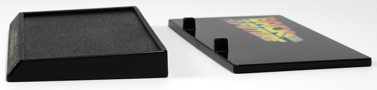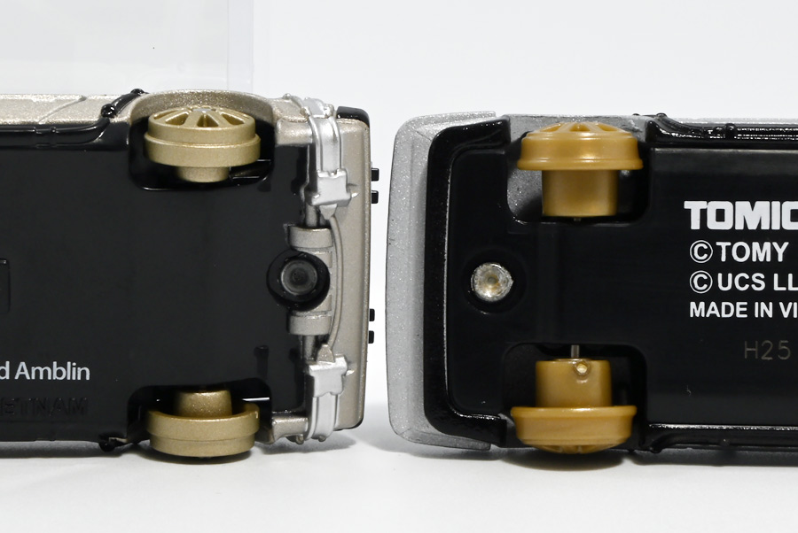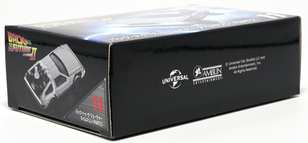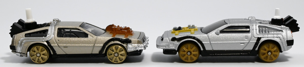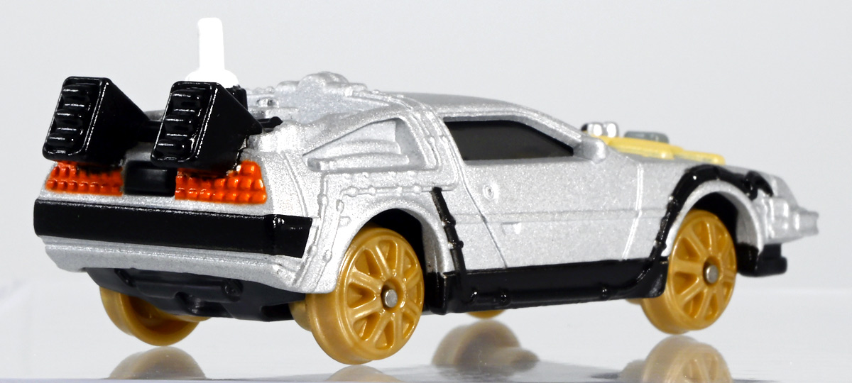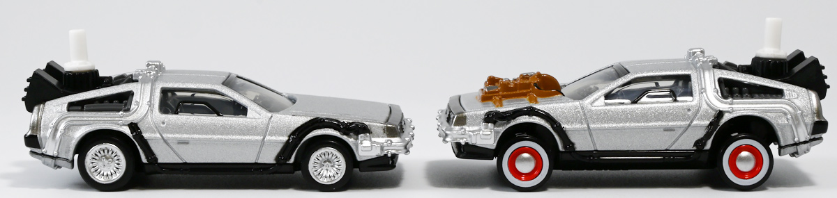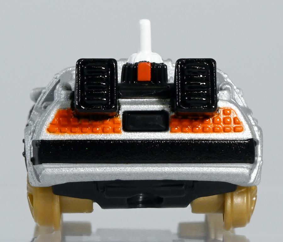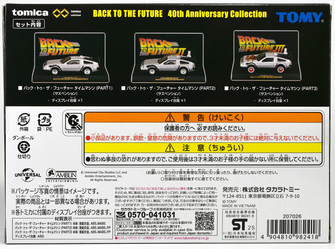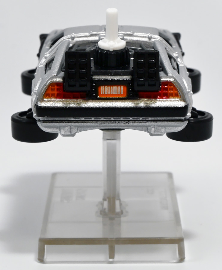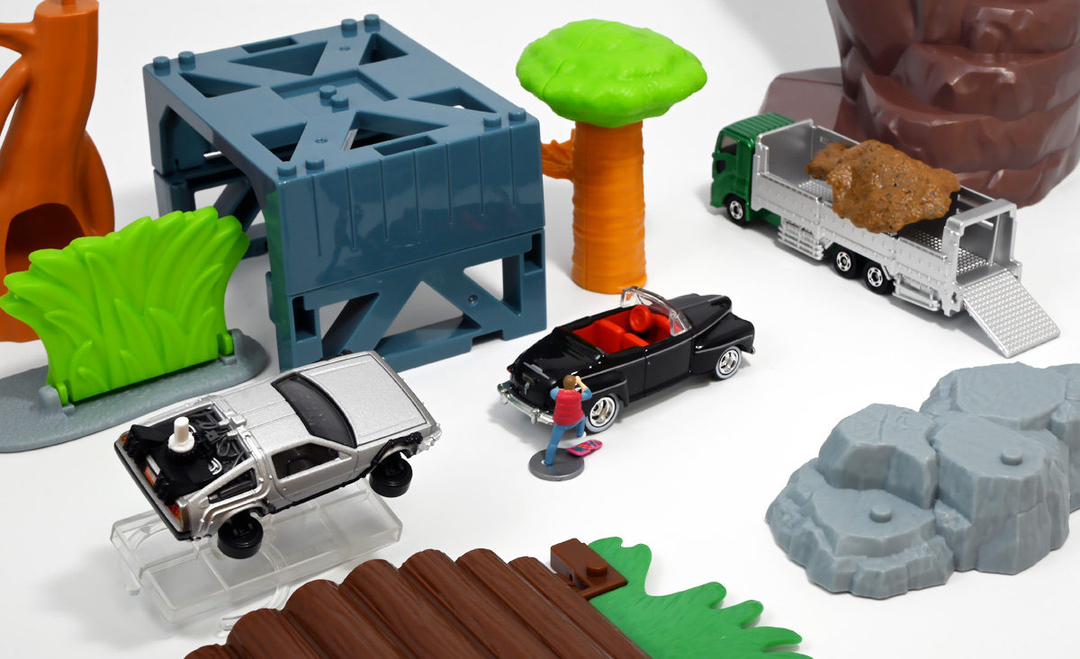 ■トミカプレミアムunlimited BACK TO THE FUTURE 40th Anniversary Collection ![]() 2025年10月25日発売 / 4620円(税込) トミカプレミアムアンリミテッドに、 映画史に残る名作「バック・トゥ・ザ・フューチャー」40周年記念パッケージが登場! 全国の「トミカショップ」及び「タカラトミーモール」通販限定で販売されたレアなパッケージぞよ! ![]() 映画シリーズ1〜3作目で活躍する「デロリアン・タイムマシン」の各形態が網羅されたパッケージ。 単品版とはボディの色が異なる限定版ぞよ! ![]() タカトミはわたくしにあと何台同じデロリアンを買わせるつもりなんだーっ!! ![]() とは申せ、一般販売の単品版を持ってる人はスルーしても良い絶妙な塩梅のバリエーションぞよね。 ![]() トミカプレミアムアンリミテッドのセットパケあるある。 そこブリスターの窓じゃないんかい! トミカからブリスターが廃されて久しいが、限定パケくらい覗けるようにしてくれても良いと思いますけどね。 ![]() パカっと開封! 中身も簡易梱包ぞよ。 環境にやさしいのだ! ![]() わたくしは今回のパッケージの着弾を楽しみにしていた。 アンリミにおけるデロリアン・タイムマシンは、PART1のみフロントの「DMC」ロゴが再現されており、 後の3、2では削られてしまった為、画竜点睛を欠く仕上がりだったのである。 しかし、この限定パケは三台全てDMCロゴが再現される上位互換・・・! まさに決定版ではないか〜っ! ・・・と開けてみたら、な、な、な、なんと・・・! 三台ともロゴが再現されていない!? 慌てて宣伝写真を見返すと、わたくしがロゴだと思ったものはフロントのロゴプレートの照り返しが白く映ったもので、 最初からロゴ無し仕様として宣伝されていたのだ・・・! まさかの空目・・・ッ!! わたくし、痛恨の勘違いであるぞよ・・・っ! ![]() いきなり出端を挫かれてしまったが、本パケにはここだけのおまけも封入されている。 それがこの専用台座だ。 ![]() 重なっているプレートを分離し、組み立てる事で・・・、 ![]() 映画ロゴがあしらわれた格好良い台座が完成! 何気に車体を乗せる部分が傾斜しており、立体的で格好良い展示が出来るような工夫があるぞよ。 ![]() 恐らく「タカラトミー100周年記念 トミカセット(2024年7月)」に入っていた台座と同仕様ぞよね。 台座部分にも金でネームが印字してあって、各デロリアン専用となっている。 ![]() 「PART1」〜「3」、各ロゴがあしらわれた台座3種が同梱! ここにデロリアンを置く事で・・・、 ![]() 40周年記念の豪華なデロリアン展示が完成するのだ! これは格好良いぞよね! ![]() それでは一台ずつ見ていこう! ・・・と言っても本商品は完全に一般販売版のバリエーションなのであまり語る事もないのであるが・・・。 まずは映画「バック・トゥ・ザ・フューチャー(1985)」で活躍したタイプの「デロリアン・タイムマシン」ぞよ。 最もスタンダードな装備で、次元転移装置の動力に小型原子炉を利用しており、 本セットにおいても車体後部のメカボックスの造形が唯一専用となっているぞよ。 ![]() 本セットに封入されているトミカは一般販売版とボディのカラーが違う限定カラバリ仕様。 比較は後述とするが、この「PART1」のみ一般販売版にあったフロントの「DMC」ロゴが削られており、 ややグレードダウン的ぞよ。 ![]() そも我らがドクことエメット・ブラウン博士が愛車のDMC-12、 通称「デロリアン」を改造して生み出したのが劇中で活躍する「タイムマシン」なのだ! DMCとはアメリカのポンコツスポーツカー会社「デロリアン・モーター・カンパニー」の略であり、 DMC社が唯一販売にこぎつけた車だからコードネーム「DMC-12」を指して「デロリアン」と呼ぶのである。 従って、フロントには「DMC」のロゴが刻まれていてしかるべきなのだが・・・ 何故かトミカでは途中から再現されなくなってしまったぞよよよよ・・・。 タカラトミーアーツのガチャガチャでは再現されているので、 トミカで削られた事には何か理由がある気もするが、謎であるぞよ・・・。 ![]() 一般販売版との細かい比較は後述とする! ![]() 「PART1」のみの仕様としては、ナンバープレートが「OUTATIME」となっている事も上げられる。 このナンバープレートはタイムマシンが初めてのタイムトラベル実験で時空を跳躍した時、 衝撃で外れ、象徴的に取り残されるぞよ。 ごくちいさな部分だがトミカでもばっちり再現されている! ![]() 続いて「バック・トゥ・ザ・フューチャー PART2(1989)」仕様! 本セットの目玉アイテムで、唯一一般販売版の無いモデルぞよ! ![]() 一般販売版の「PART2」仕様はフライングホイールを変形した飛行形態でのラインナップなので、 タイヤを接地した走行形態のバリエーショントミカは本セットでしか手に入らない! 従って全ての形態をトミカで網羅したいファンは、やはりこの限定セットも入手しなくてはならないのだ! ![]() くぅ〜・・・っ! タカトミ、ニクイ仕掛けをしてくるぞよね・・・! わたくしもまんまと買わ