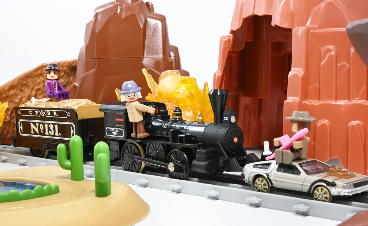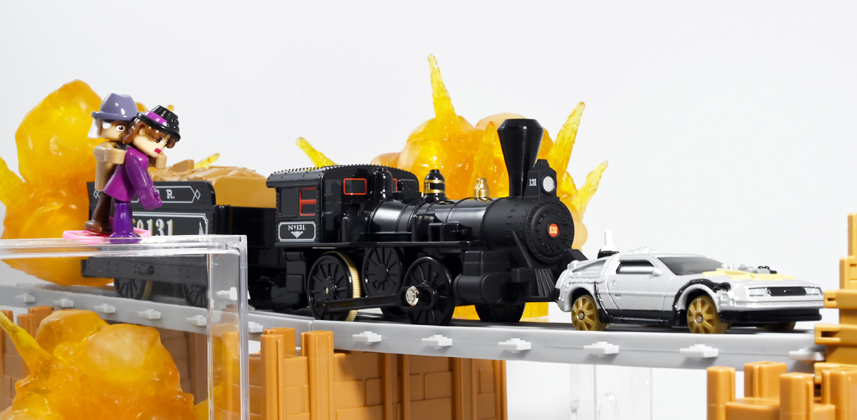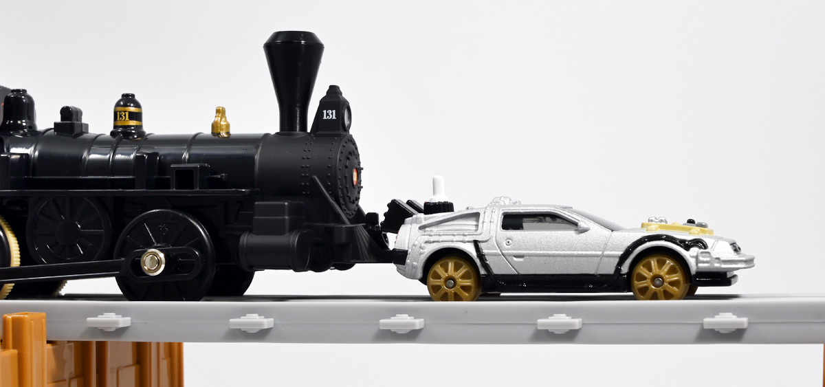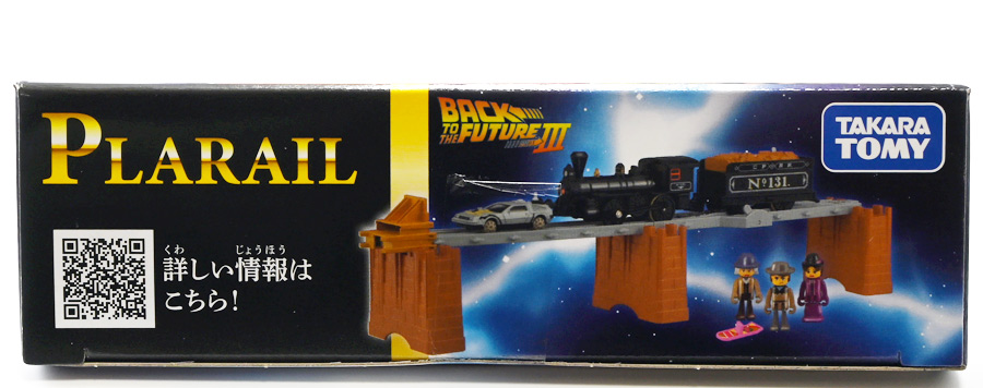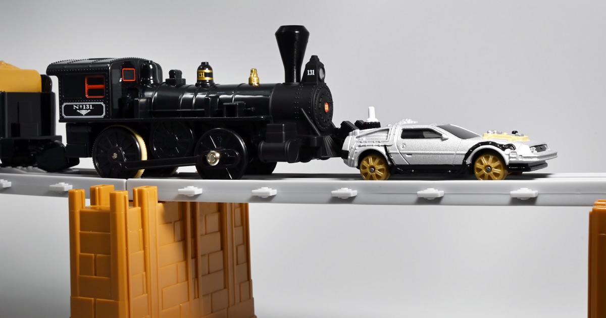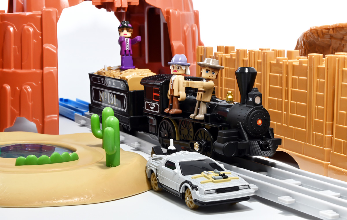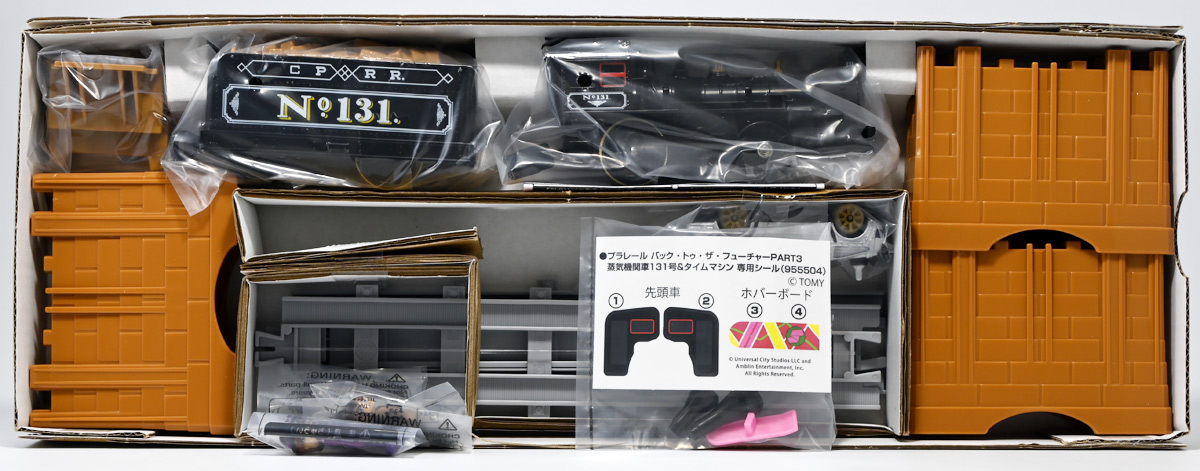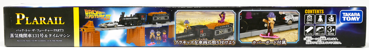 ■プラレール バック・トゥ・ザ・フューチャーPART3 蒸気機関車131号&タイムマシン ![]() 2025年10月18日発売 / 7700円(税込) 名作映画「バック・トゥ・ザ・フューチャー PART3(1990)」より、 手に汗握る劇中終盤シーンを再現したプラレールセットが登場! 遂にシエラ3号機関車がプラレールになったぞよーっ!! ![]() プラレールに情景、更にプラキッズミニフィギュアやデロリアントミカも入った豪華パッケージぞよ! ![]() こちらは大人も楽しめるプラレールの上位シリーズ、 「プラレール リアルクラス」のラインナップなのでロゴがちょっとリッチな雰囲気ぞよ。 ![]() 7700円もするのでちびっ子は買えません・・・! 実はわたくし、おきつねネットワークを通じてこのセットが出る事を予め知っており、 予約開始を待っていたのだが、月末と予想していたら20日ごろにこっそり出ており見逃してしまった! 起きたらタカトミモールで売り切れていて超焦ったぞよ!! それから一週間くらい張り付いてひょっこり復活した所を拾えてひと安心でしたぞよ〜。 ![]() 燦然と輝く「Back to the Future Part III」のロゴ。 ちゃんとライセンス商品なのだ! ![]() それではパカっと開封! 横長の箱にみっちりつまっています。 梱包材はダンボールなので簡単に分解して捨てやすい仕様。 ![]() ほぼほぼ組み立て済み・完成品なので箱を開けてすぐに遊べる仕様だが、 一部シールを貼る箇所があり、ここだけ工作が発生するぞよ。 シールで補完する色分けは全部で4箇所! ![]() 先頭車両の運転室正面の窓部分と、 ![]() ホバーボードの色分けぞよ。 ま〜ちょっとした部分なのでシールが嫌だと言う人は貼らないで遊んでも良いでしょう! ![]() 早速中身を見てゆくぞ! まずは「蒸気機関車131号」ぞよ! 先頭車両と炭水車を連結して完成する。 ![]() お〜っ! なんと豪華で格好良い蒸気機関車なのだーっ! 運転室の正面窓はシール再現だが、他の部分は全てプリントと塗装で再現されており、 黒いボディにゴールドとホワイトの差し色が格好良い仕上がり! 「リアルクラス」相当だけあってリッチな雰囲気出てるぞよね! ![]() カウキャッチャーから煙室にかけては艶消し彩色、 ボイラーや運転室は艶アリ仕上げで黒だけでも2つ使われており雰囲気抜群の仕上がりだ! 正面の「131」マークなどは予めプリント済み、リベットなども細かく造形されていて、 プラレールのデフォルメ感の中にもリアルさを感じさせる。 ![]() 炭水車はナンバーなどプリント済みなのが嬉しい仕様。 実はこっちが動力車で、先頭車両はまるっとダミーであるぞよ。 プラレールなので勿論ほかの車両と連結も可能だが、 2両目動力車用連結器を装備している先頭車両と合体する事が望ましい。 ![]() こちらもリベットや梯子の表現など細かいこだわりが見られる。 劇中ではこの後ろにも車両が連結していたが、ドクによって切り離されてばいばいしちゃうぞよ。 ![]() トップ。 動力スイッチは炭水車上部にあり。 ![]() ボトム。 ゴムタイヤが切れちゃったら別売り「プラレール ゴムタイヤ」で修理可能ぞよ。 ![]() 劇中では1885年、西部開拓時代のヒルバレー駅で働くセントラル・パシフィック鉄道「131号」として登場する蒸気機関車。 モチーフは数々の映画やテレビ番組で活躍した「シエラ鉄道3号機(Sierra No. 3)」であるぞよ! この機関車が建造されたのは1891年の事なので、実は1885年には存在しないはずだがご愛敬。 ![]() 映画劇中に登場した実在車両は 現在アメリカ・カリフォルニア州のレイルタウン 1897州立歴史公園に保存されており、 本商品はそれに基づく立体化となっているぞよ。 本商品の原型を製作している頃、丁度シエラ3号は復元作業中で解体された状態にあり、 バラバラの車体やパーツ細部の写真がプラレール設計の参考になったと言う。 ![]() 運転室には空間が設けられておりプラキッズを搭乗可能。 この辺のギミックは後述するぞよ。 ![]() そして! 本商品は煙突が長いので一部のプラレール情景では引っかかって通過できない仕様なのだが・・・、 ![]() 遊びやすいように短い小煙突も付属するので安心ぞよね! どっちかお好みで装着しましょう。 ![]() 動輪は前と後ろが主連棒で繋がっており、 走行中ちゃんと連動してしゅぽしゅぽ動く仕様で動きも蒸気機関車っぽいのだ。 しかし真ん中はダミーで接地していない。 ![]() トップ。 鐘や砂箱は金の差し色で彩色されておりアクセントとなっている。 ![]() そして本商品、左右非対称で右サイドにはプラキッズを乗せる為の突起がついている。 後から何かに流用出来そうな蒸気機関車だが、ちゃんとBTTF専用造形と言う訳ぞよ! ![]() 炭水車は反対側もナンバーがプリント済み。 ![]() SLと言えば石炭で動いているイメージだが、 別に燃料を燃やして水を温め蒸気を作る事ができればなんでもよいワケで、 劇中では炭水車に薪をいっぱい積んでいる。 本商品でもちゃんと茶色い薪がいっぱい乗っているぞよ。 ![]() そしてこの薪が蓋になっており、ぱかっと開ける