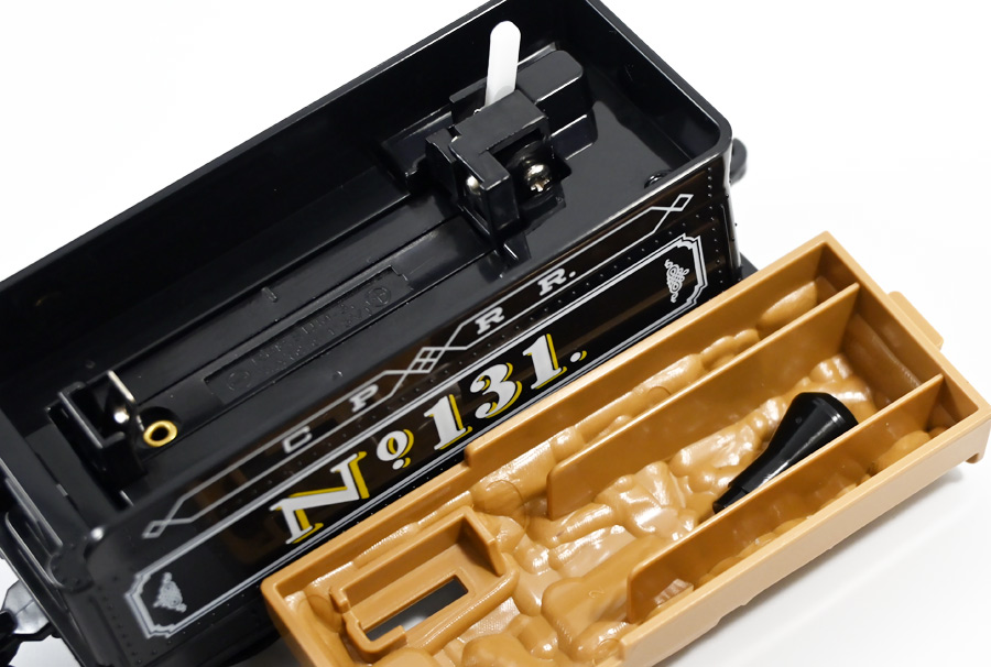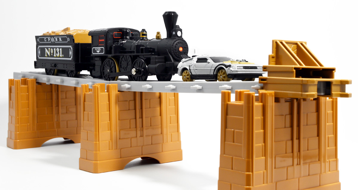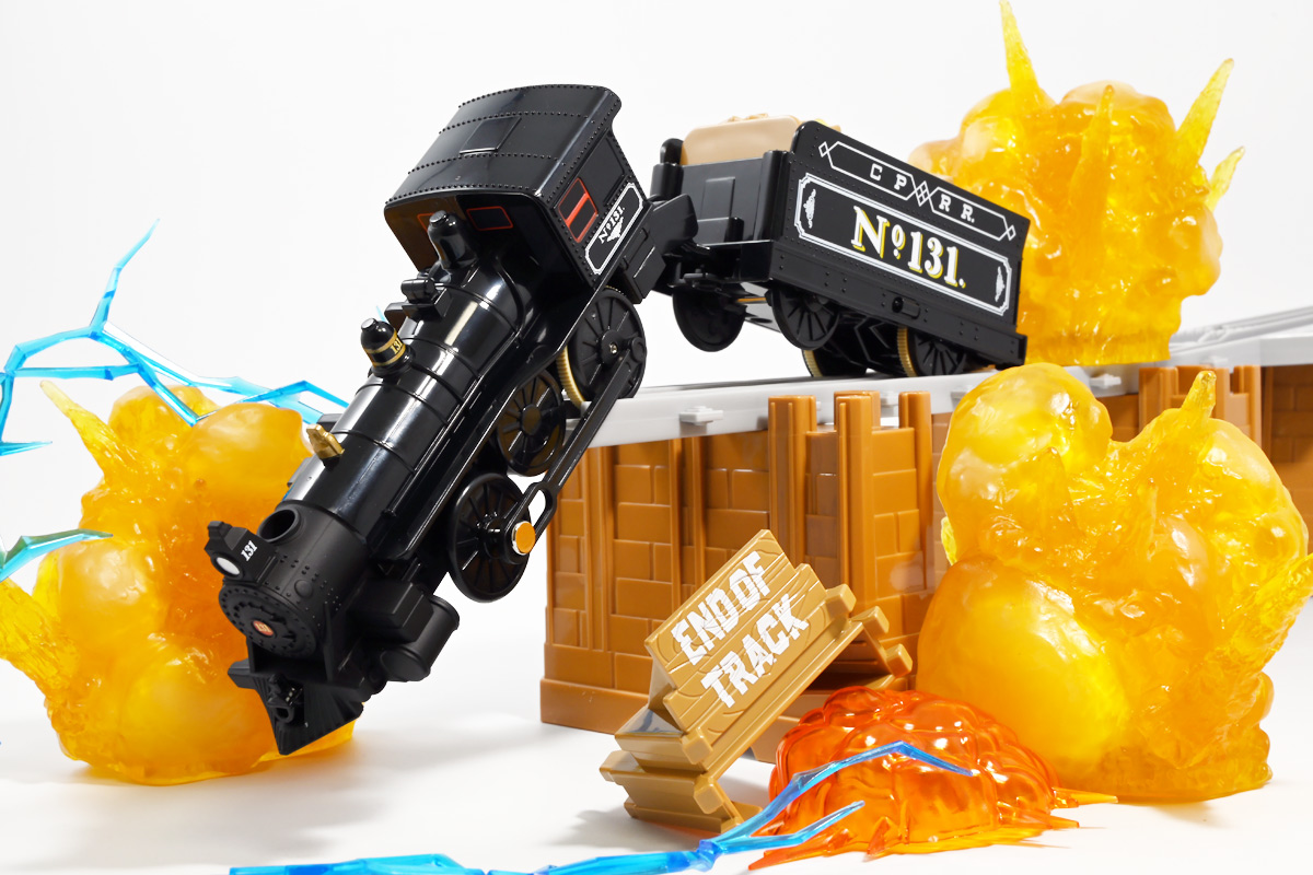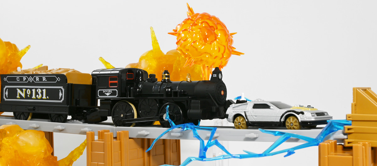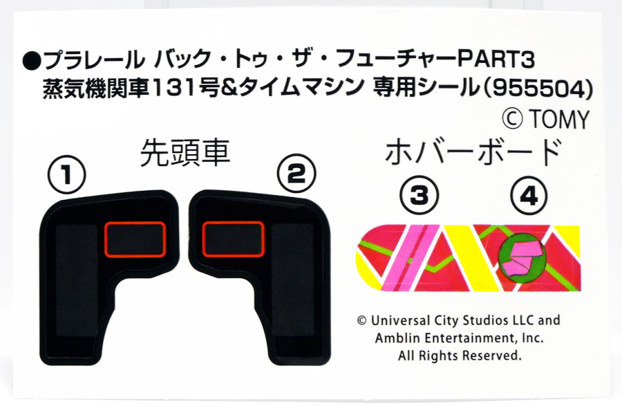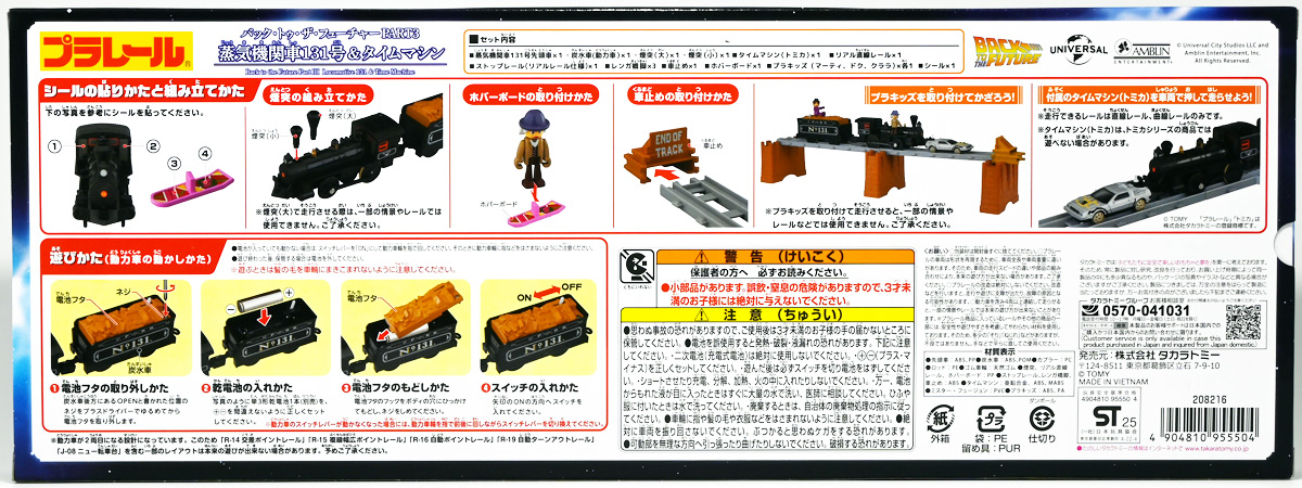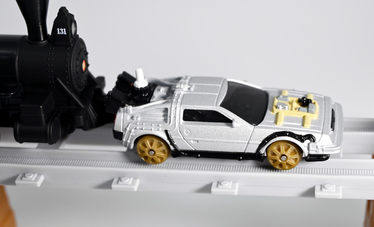 ■プラレール バック・トゥ・ザ・フューチャーPART3 蒸気機関車131号&タイムマシン ![]() 2025年10月18日発売 / 7700円(税込) 名作映画「バック・トゥ・ザ・フューチャー PART3(1990)」より、 手に汗握る劇中終盤シーンを再現したプラレールセットが登場! 遂にシエラ3号機関車がプラレールになったぞよーっ!! ![]() プラレールに情景、更にプラキッズミニフィギュアやデロリアントミカも入った豪華パッケージぞよ! ![]() こちらは大人も楽しめるプラレールの上位シリーズ、 「プラレール リアルクラス」のラインナップなのでロゴがちょっとリッチな雰囲気ぞよ。 ![]() 7700円もするのでちびっ子は買えません・・・! 実はわたくし、おきつねネットワークを通じてこのセットが出る事を予め知っており、 予約開始を待っていたのだが、月末と予想していたら20日ごろにこっそり出ており見逃してしまった! 起きたらタカトミモールで売り切れていて超焦ったぞよ!! それから一週間くらい張り付いてひょっこり復活した所を拾えてひと安心でしたぞよ〜。 ![]() 燦然と輝く「Back to the Future Part III」のロゴ。 ちゃんとライセンス商品なのだ! ![]() それではパカっと開封! 横長の箱にみっちりつまっています。 梱包材はダンボールなので簡単に分解して捨てやすい仕様。 ![]() ほぼほぼ組み立て済み・完成品なので箱を開けてすぐに遊べる仕様だが、 一部シールを貼る箇所があり、ここだけ工作が発生するぞよ。 シールで補完する色分けは全部で4箇所! ![]() 先頭車両の運転室正面の窓部分と、 ![]() ホバーボードの色分けぞよ。 ま〜ちょっとした部分なのでシールが嫌だと言う人は貼らないで遊んでも良いでしょう! ![]() 早速中身を見てゆくぞ! まずは「蒸気機関車131号」ぞよ! 先頭車両と炭水車を連結して完成する。 ![]() お〜っ! なんと豪華で格好良い蒸気機関車なのだーっ! 運転室の正面窓はシール再現だが、他の部分は全てプリントと塗装で再現されており、 黒いボディにゴールドとホワイトの差し色が格好良い仕上がり! 「リアルクラス」相当だけあってリッチな雰囲気出てるぞよね! ![]() カウキャッチャーから煙室にかけては艶消し彩色、 ボイラーや運転室は艶アリ仕上げで黒だけでも2つ使われており雰囲気抜群の仕上がりだ! 正面の「131」マークなどは予めプリント済み、リベットなども細かく造形されていて、 プラレールのデフォルメ感の中にもリアルさを感じさせる。 ![]() 炭水車はナンバーなどプリント済みなのが嬉しい仕様。 実はこっちが動力車で、先頭車両はまるっとダミーであるぞよ。 プラレールなので勿論ほかの車両と連結も可能だが、 2両目動力車用連結器を装備している先頭車両と合体する事が望ましい。 ![]() こちらもリベットや梯子の表現など細かいこだわりが見られる。 劇中ではこの後ろにも車両が連結していたが、ドクによって切り離されてばいばいしちゃうぞよ。 ![]() トップ。 動力スイッチは炭水車上部にあり。 ![]() ボトム。 ゴムタイヤが切れちゃったら別売り「プラレール ゴムタイヤ」で修理可能ぞよ。 ![]() 劇中では1885年、西部開拓時代のヒルバレー駅で働くセントラル・パシフィック鉄道「131号」として登場する蒸気機関車。 モチーフは数々の映画やテレビ番組で活躍した「シエラ鉄道3号機(Sierra No. 3)」であるぞよ! この機関車が建造されたのは1891年の事なので、実は1885年には存在しないはずだがご愛敬。 ![]() 映画劇中に登場した実在車両は 現在アメリカ・カリフォルニア州のレイルタウン 1897州立歴史公園に保存されており、 本商品はそれに基づく立体化となっているぞよ。 本商品の原型を製作している頃、丁度シエラ3号は復元作業中で解体された状態にあり、 バラバラの車体やパーツ細部の写真がプラレール設計の参考になったと言う。 ![]() 運転室には空間が設けられておりプラキッズを搭乗可能。 この辺のギミックは後述するぞよ。 ![]() そして! 本商品は煙突が長いので一部のプラレール情景では引っかかって通過できない仕様なのだが・・・、 ![]() 遊びやすいように短い小煙突も付属するので安心ぞよね! どっちかお好みで装着しましょう。 ![]() 動輪は前と後ろが主連棒で繋がっており、 走行中ちゃんと連動してしゅぽしゅぽ動く仕様で動きも蒸気機関車っぽいのだ。 しかし真ん中はダミーで接地していない。 ![]() トップ。 鐘や砂箱は金の差し色で彩色されておりアクセントとなっている。 ![]() そして本商品、左右非対称で右サイドにはプラキッズを乗せる為の突起がついている。 後から何かに流用出来そうな蒸気機関車だが、ちゃんとBTTF専用造形と言う訳ぞよ! ![]() 炭水車は反対側もナンバーがプリント済み。 ![]() SLと言えば石炭で動いているイメージだが、 別に燃料を燃やして水を温め蒸気を作る事ができればなんでもよいワケで、 劇中では炭水車に薪をいっぱい積んでいる。 本商品でもちゃんと茶色い薪がいっぱい乗っているぞよ。 ![]() そしてこの薪が蓋になっており、ぱかっと開ける