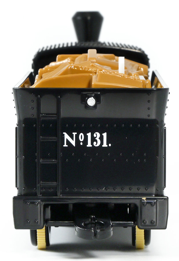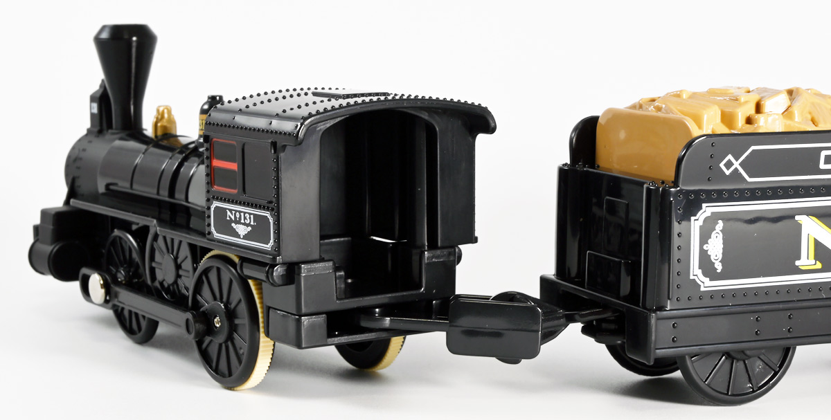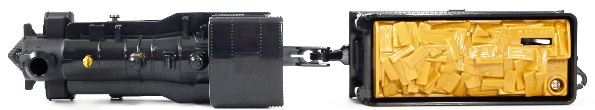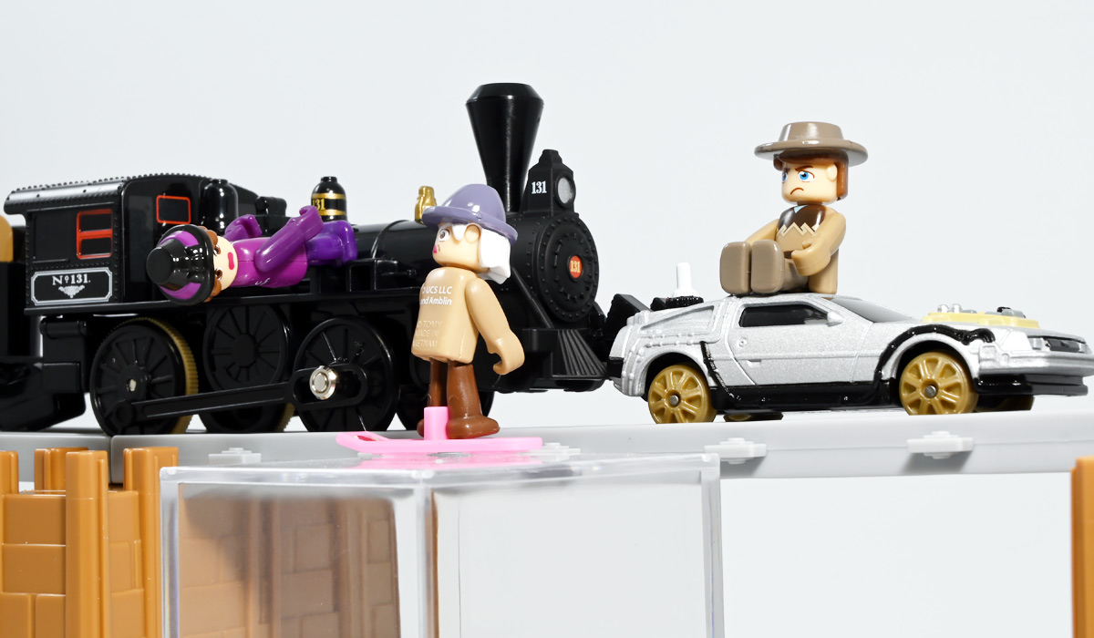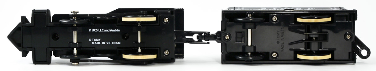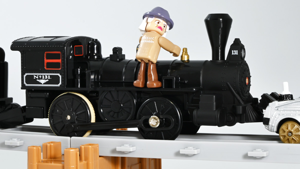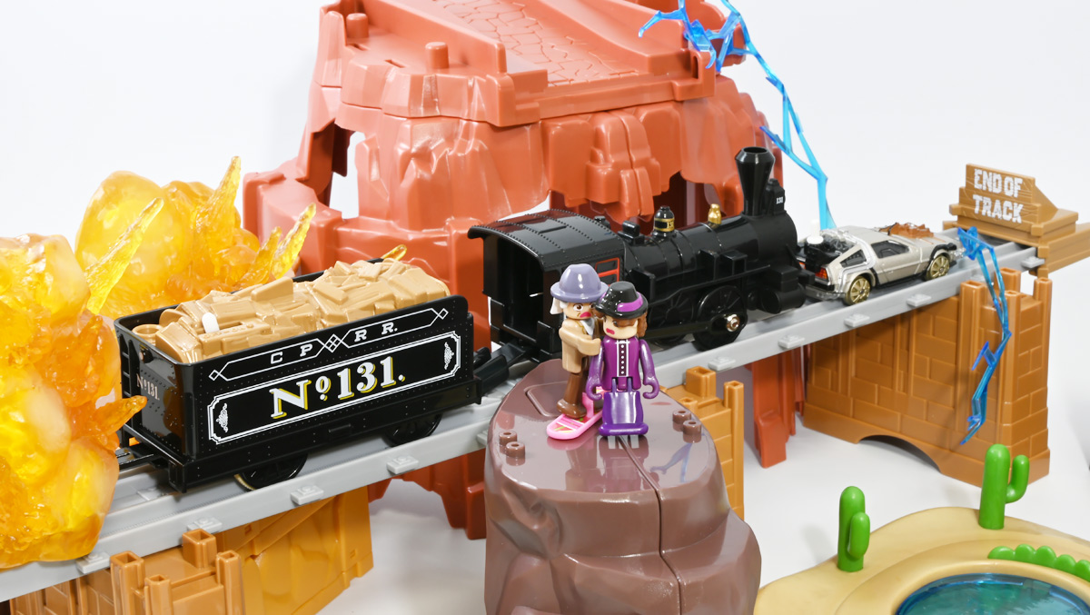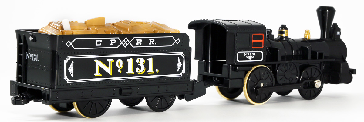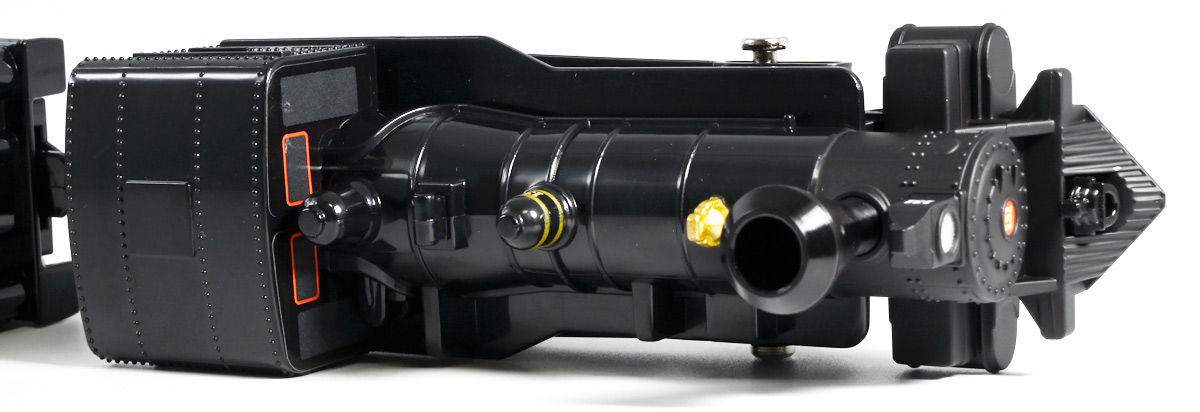 ■プラレール バック・トゥ・ザ・フューチャーPART3 蒸気機関車131号&タイムマシン ![]() 2025年10月18日発売 / 7700円(税込) 名作映画「バック・トゥ・ザ・フューチャー PART3(1990)」より、 手に汗握る劇中終盤シーンを再現したプラレールセットが登場! 遂にシエラ3号機関車がプラレールになったぞよーっ!! ![]() プラレールに情景、更にプラキッズミニフィギュアやデロリアントミカも入った豪華パッケージぞよ! ![]() こちらは大人も楽しめるプラレールの上位シリーズ、 「プラレール リアルクラス」のラインナップなのでロゴがちょっとリッチな雰囲気ぞよ。 ![]() 7700円もするのでちびっ子は買えません・・・! 実はわたくし、おきつねネットワークを通じてこのセットが出る事を予め知っており、 予約開始を待っていたのだが、月末と予想していたら20日ごろにこっそり出ており見逃してしまった! 起きたらタカトミモールで売り切れていて超焦ったぞよ!! それから一週間くらい張り付いてひょっこり復活した所を拾えてひと安心でしたぞよ〜。 ![]() 燦然と輝く「Back to the Future Part III」のロゴ。 ちゃんとライセンス商品なのだ! ![]() それではパカっと開封! 横長の箱にみっちりつまっています。 梱包材はダンボールなので簡単に分解して捨てやすい仕様。 ![]() ほぼほぼ組み立て済み・完成品なので箱を開けてすぐに遊べる仕様だが、 一部シールを貼る箇所があり、ここだけ工作が発生するぞよ。 シールで補完する色分けは全部で4箇所! ![]() 先頭車両の運転室正面の窓部分と、 ![]() ホバーボードの色分けぞよ。 ま〜ちょっとした部分なのでシールが嫌だと言う人は貼らないで遊んでも良いでしょう! ![]() 早速中身を見てゆくぞ! まずは「蒸気機関車131号」ぞよ! 先頭車両と炭水車を連結して完成する。 ![]() お〜っ! なんと豪華で格好良い蒸気機関車なのだーっ! 運転室の正面窓はシール再現だが、他の部分は全てプリントと塗装で再現されており、 黒いボディにゴールドとホワイトの差し色が格好良い仕上がり! 「リアルクラス」相当だけあってリッチな雰囲気出てるぞよね! ![]() カウキャッチャーから煙室にかけては艶消し彩色、 ボイラーや運転室は艶アリ仕上げで黒だけでも2つ使われており雰囲気抜群の仕上がりだ! 正面の「131」マークなどは予めプリント済み、リベットなども細かく造形されていて、 プラレールのデフォルメ感の中にもリアルさを感じさせる。 ![]() 炭水車はナンバーなどプリント済みなのが嬉しい仕様。 実はこっちが動力車で、先頭車両はまるっとダミーであるぞよ。 プラレールなので勿論ほかの車両と連結も可能だが、 2両目動力車用連結器を装備している先頭車両と合体する事が望ましい。 ![]() こちらもリベットや梯子の表現など細かいこだわりが見られる。 劇中ではこの後ろにも車両が連結していたが、ドクによって切り離されてばいばいしちゃうぞよ。 ![]() トップ。 動力スイッチは炭水車上部にあり。 ![]() ボトム。 ゴムタイヤが切れちゃったら別売り「プラレール ゴムタイヤ」で修理可能ぞよ。 ![]() 劇中では1885年、西部開拓時代のヒルバレー駅で働くセントラル・パシフィック鉄道「131号」として登場する蒸気機関車。 モチーフは数々の映画やテレビ番組で活躍した「シエラ鉄道3号機(Sierra No. 3)」であるぞよ! この機関車が建造されたのは1891年の事なので、実は1885年には存在しないはずだがご愛敬。 ![]() 映画劇中に登場した実在車両は 現在アメリカ・カリフォルニア州のレイルタウン 1897州立歴史公園に保存されており、 本商品はそれに基づく立体化となっているぞよ。 本商品の原型を製作している頃、丁度シエラ3号は復元作業中で解体された状態にあり、 バラバラの車体やパーツ細部の写真がプラレール設計の参考になったと言う。 ![]() 運転室には空間が設けられておりプラキッズを搭乗可能。 この辺のギミックは後述するぞよ。 ![]() そして! 本商品は煙突が長いので一部のプラレール情景では引っかかって通過できない仕様なのだが・・・、 ![]() 遊びやすいように短い小煙突も付属するので安心ぞよね! どっちかお好みで装着しましょう。 ![]() 動輪は前と後ろが主連棒で繋がっており、 走行中ちゃんと連動してしゅぽしゅぽ動く仕様で動きも蒸気機関車っぽいのだ。 しかし真ん中はダミーで接地していない。 ![]() トップ。 鐘や砂箱は金の差し色で彩色されておりアクセントとなっている。 ![]() そして本商品、左右非対称で右サイドにはプラキッズを乗せる為の突起がついている。 後から何かに流用出来そうな蒸気機関車だが、ちゃんとBTTF専用造形と言う訳ぞよ! ![]() 炭水車は反対側もナンバーがプリント済み。 ![]() SLと言えば石炭で動いているイメージだが、 別に燃料を燃やして水を温め蒸気を作る事ができればなんでもよいワケで、 劇中では炭水車に薪をいっぱい積んでいる。 本商品でもちゃんと茶色い薪がいっぱい乗っているぞよ。 ![]() そしてこの薪が蓋になっており、ぱかっと開ける