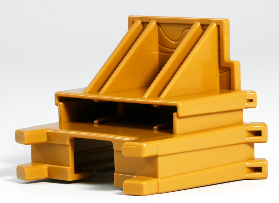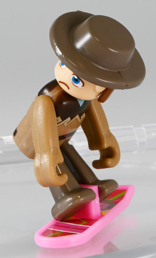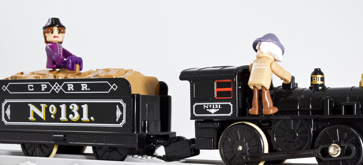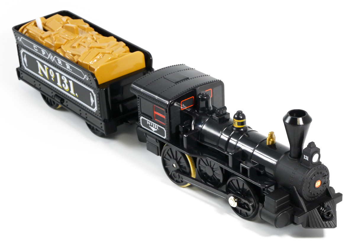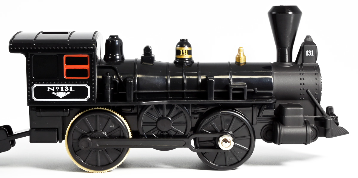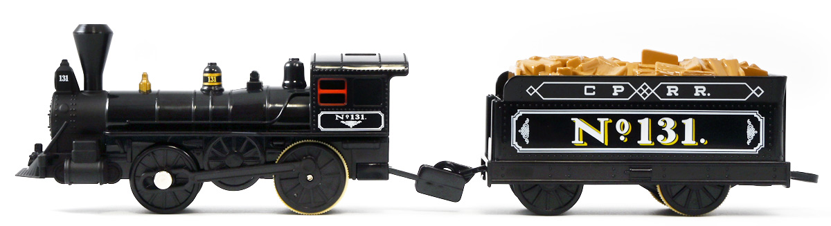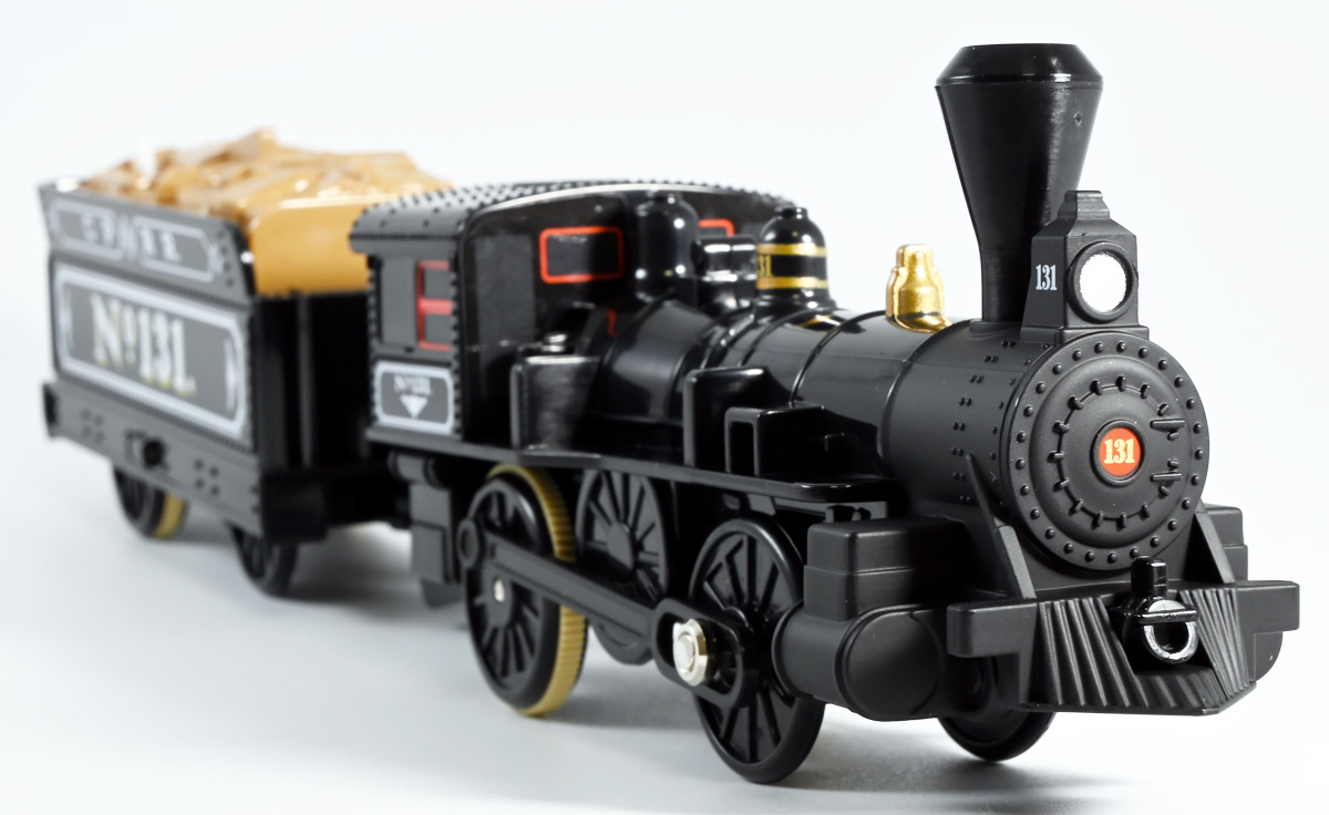 ■プラレール バック・トゥ・ザ・フューチャーPART3 蒸気機関車131号&タイムマシン ![]() 2025年10月18日発売 / 7700円(税込) 名作映画「バック・トゥ・ザ・フューチャー PART3(1990)」より、 手に汗握る劇中終盤シーンを再現したプラレールセットが登場! 遂にシエラ3号機関車がプラレールになったぞよーっ!! ![]() プラレールに情景、更にプラキッズミニフィギュアやデロリアントミカも入った豪華パッケージぞよ! ![]() こちらは大人も楽しめるプラレールの上位シリーズ、 「プラレール リアルクラス」のラインナップなのでロゴがちょっとリッチな雰囲気ぞよ。 ![]() 7700円もするのでちびっ子は買えません・・・! 実はわたくし、おきつねネットワークを通じてこのセットが出る事を予め知っており、 予約開始を待っていたのだが、月末と予想していたら20日ごろにこっそり出ており見逃してしまった! 起きたらタカトミモールで売り切れていて超焦ったぞよ!! それから一週間くらい張り付いてひょっこり復活した所を拾えてひと安心でしたぞよ〜。 ![]() 燦然と輝く「Back to the Future Part III」のロゴ。 ちゃんとライセンス商品なのだ! ![]() それではパカっと開封! 横長の箱にみっちりつまっています。 梱包材はダンボールなので簡単に分解して捨てやすい仕様。 ![]() ほぼほぼ組み立て済み・完成品なので箱を開けてすぐに遊べる仕様だが、 一部シールを貼る箇所があり、ここだけ工作が発生するぞよ。 シールで補完する色分けは全部で4箇所! ![]() 先頭車両の運転室正面の窓部分と、 ![]() ホバーボードの色分けぞよ。 ま〜ちょっとした部分なのでシールが嫌だと言う人は貼らないで遊んでも良いでしょう! ![]() 早速中身を見てゆくぞ! まずは「蒸気機関車131号」ぞよ! 先頭車両と炭水車を連結して完成する。 ![]() お〜っ! なんと豪華で格好良い蒸気機関車なのだーっ! 運転室の正面窓はシール再現だが、他の部分は全てプリントと塗装で再現されており、 黒いボディにゴールドとホワイトの差し色が格好良い仕上がり! 「リアルクラス」相当だけあってリッチな雰囲気出てるぞよね! ![]() カウキャッチャーから煙室にかけては艶消し彩色、 ボイラーや運転室は艶アリ仕上げで黒だけでも2つ使われており雰囲気抜群の仕上がりだ! 正面の「131」マークなどは予めプリント済み、リベットなども細かく造形されていて、 プラレールのデフォルメ感の中にもリアルさを感じさせる。 ![]() 炭水車はナンバーなどプリント済みなのが嬉しい仕様。 実はこっちが動力車で、先頭車両はまるっとダミーであるぞよ。 プラレールなので勿論ほかの車両と連結も可能だが、 2両目動力車用連結器を装備している先頭車両と合体する事が望ましい。 ![]() こちらもリベットや梯子の表現など細かいこだわりが見られる。 劇中ではこの後ろにも車両が連結していたが、ドクによって切り離されてばいばいしちゃうぞよ。 ![]() トップ。 動力スイッチは炭水車上部にあり。 ![]() ボトム。 ゴムタイヤが切れちゃったら別売り「プラレール ゴムタイヤ」で修理可能ぞよ。 ![]() 劇中では1885年、西部開拓時代のヒルバレー駅で働くセントラル・パシフィック鉄道「131号」として登場する蒸気機関車。 モチーフは数々の映画やテレビ番組で活躍した「シエラ鉄道3号機(Sierra No. 3)」であるぞよ! この機関車が建造されたのは1891年の事なので、実は1885年には存在しないはずだがご愛敬。 ![]() 映画劇中に登場した実在車両は 現在アメリカ・カリフォルニア州のレイルタウン 1897州立歴史公園に保存されており、 本商品はそれに基づく立体化となっているぞよ。 本商品の原型を製作している頃、丁度シエラ3号は復元作業中で解体された状態にあり、 バラバラの車体やパーツ細部の写真がプラレール設計の参考になったと言う。 ![]() 運転室には空間が設けられておりプラキッズを搭乗可能。 この辺のギミックは後述するぞよ。 ![]() そして! 本商品は煙突が長いので一部のプラレール情景では引っかかって通過できない仕様なのだが・・・、 ![]() 遊びやすいように短い小煙突も付属するので安心ぞよね! どっちかお好みで装着しましょう。 ![]() 動輪は前と後ろが主連棒で繋がっており、 走行中ちゃんと連動してしゅぽしゅぽ動く仕様で動きも蒸気機関車っぽいのだ。 しかし真ん中はダミーで接地していない。 ![]() トップ。 鐘や砂箱は金の差し色で彩色されておりアクセントとなっている。 ![]() そして本商品、左右非対称で右サイドにはプラキッズを乗せる為の突起がついている。 後から何かに流用出来そうな蒸気機関車だが、ちゃんとBTTF専用造形と言う訳ぞよ! ![]() 炭水車は反対側もナンバーがプリント済み。 ![]() SLと言えば石炭で動いているイメージだが、 別に燃料を燃やして水を温め蒸気を作る事ができればなんでもよいワケで、 劇中では炭水車に薪をいっぱい積んでいる。 本商品でもちゃんと茶色い薪がいっぱい乗っているぞよ。 ![]() そしてこの薪が蓋になっており、ぱかっと開ける