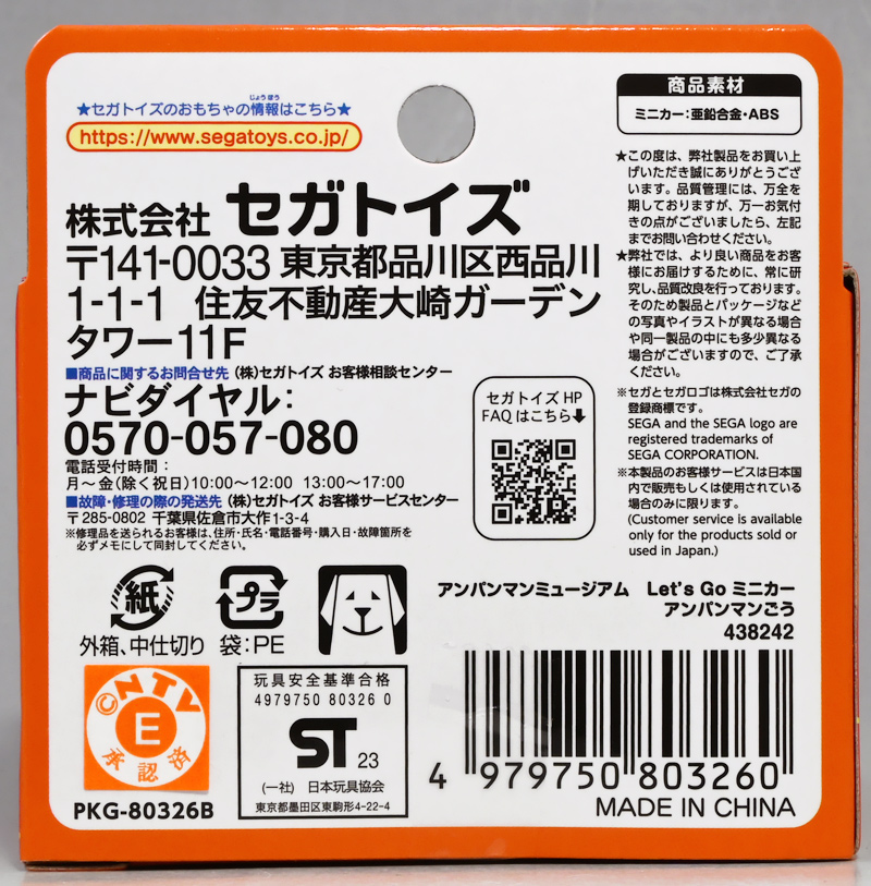 ■セガフェイブ (SEGA FAVE) アンパンマン ミュージアム Let's Go ミニカー アンパンマンごう ![]() 2020年8月6日発売 / 880円(税込) セガから出ている「アンパンマン」の本格ミニカー、 「アンパンマンミュージアムシリーズ GOGOミニカー」のリニューアル第一弾として登場したアンパンマン号。 「アンパンマンミュージアム」シリーズのジオラマやフィギュアと組み合わせて遊べる仕様ぞよ! ![]() アンパンマンの玩具ってセガから出ているぞよね〜。 なんでもちびっ子向けコンテンツとして「アンパンマン」は群を抜いた人気を誇り、 「ポケモン」や「ハローキティ」、「スーパーマリオ」らと共に上位にランクインしていると言う・・・ その総収益は9兆円を超えると言うぞよ・・・!! ![]() やはりちびっ子にはシンプルなキャラデザがウケると言う事なのか・・・ アンパンマン・・・侮りがたし・・・ッ!! ![]() アンパンだけどくちにいれない! ![]() 「香北町立やなせたかし記念館」も「アンパンマンミュージアム」なら、 国内に6つあるアンパンマンテーマのアミューズメント施設も「アンパンマンミュージアム」 更に本商品も「アンパンマンミュージアム」シリーズと題されており、実にややこしいぞよよよよ・・・。 「アンパンマンミュージアム」と冠されているが、本商品は一般販売でその辺の玩具屋さんでも普通に売っているのだ。 ![]() それではパカっと開封! ダンボールの簡易梱包です。 ![]() ミニカーになった「アンパンマン号」! アニメ「それいけ!アンパンマン」 第12話「消えたサンタクロース(1988年12月放送)」より登場したジャムおじさんの愛車(?)で、 移動パン工場にして秘密基地も兼ねた特殊車両ぞよね! 車内にはアンパンマンの新しい顔を焼く竈を備え、アンパンマンの窮地に活躍する他、 様々な秘密兵器も隠されており、時には大胆な改造を受けて海中から宇宙まで活動可能というハイパーメカぞよ! ![]() という事で「アンパンマン」における主役メカ的なポジションにいるアンパンマン号。 必殺技にはフロントから鼻を打ち出す「ノーズパンチ」がある他、 映画「それいけ!アンパンマン キラキラ星の涙(1989)」では竈から火炎放射を放つ「かまど放射器」も披露。 ややライン越えの攻撃性能を備えているぞよ! ![]() ばいきんまんのバイキンメカ、地底戦車「もぐりん」とはライバル関係にあり、 二台は後に原作絵本「アンパンマンと もぐりん(2019)」にも逆輸入されているぞよ。 ![]() そんなアンパンマン号のお手頃な決定版的ミニカーがこちらと言う訳ぞよね! アンパンマン号は結構色々玩具も出ており、変形ギミックを備えたDX玩具なども登場しているが、 玩具では大体飛行形態に変形する事が多い。 ![]() アンパンマン号おしり。 ![]() トップ。 何やらハッチがついているが・・・ギミックは後述ぞよ! ![]() ボトム。 シャーシがダイキャストになっており程よい重量感だ。 ![]() 勿論サスペンションギミックも備えているぞよ!! ![]() メインギミックはシンプルにハッチ展開! ここに同シリーズのキャラクターフィギュアを搭乗可能となっているが・・・、 ![]() 勿論他のフィギュアを乗せて遊んでもOKぞよ! ![]() シルバニアの小赤ちゃんなどはすぽっと収まる。 世界観が広がるぞよね!! ![]() 爆走、アンパンマン号ッ!! アンパンマンの窮地に駆けつけろッ!! ![]() あのアンパンマン号がミニカーになった! 組み合わせ遊びも楽しめる決定版ぞよ!! ![]() おまけ。 実は本商品、横浜の「アンパンマンミュージアム」のおみやげに貰ったぞよ。 ![]() 限定ステッカーや可愛いショッパーなどもおみやげに貰っちゃった〜。 ![]() アンパンマンミュージアムもちびっ子に大人気のアトラクションらしいぞよね! 一体アンパンマンの何が赤ちゃんを惹き付けるのか・・・不思議であるぞよ・・・。 ![]() おまけのおまけ。 アンパンマンモチーフの入浴剤ぞよ。 ![]() 2005年から登場している「コキンちゃん」は大人気キャラとして定着。 絶大な人気を誇ると言う・・・。 ![]() アンパンマン顔の入浴剤だ! ちなみにこの「FOODY ANPANMAN びっくらたまご(2024年10月)」はアンパンマンミュージアム限定で、 ミュージアム限定フードをモチーフにしたフィギュアが入っている。 ![]() お風呂に入浴剤を入れると、中からフィギュアが出現! 中身はアンパンマンの「オレンジフロート」でした! ![]() フィギュア小物としても使えそうだが、クリア台座が接着されており分離できない仕様ぞよ。 ![]() ま、コースターって事にしても良いだろう! アンパンマンミュージアムに行ったら限定グッズも絶対ゲットぞよよ〜! :このリンクを踏んで何かポチるとわたくしにささやかな報酬が入りサイトの運営費となるのでよろしくぞ! ・「セガフェイブ (SEGA FAVE) アンパンマン ミュージアム Let's Go ミニカー アンパンマンごう」 ・「チキチキ大変身! ひこうけいにもなる! アンパンマンごうとSLマン」 ▲TOP |
